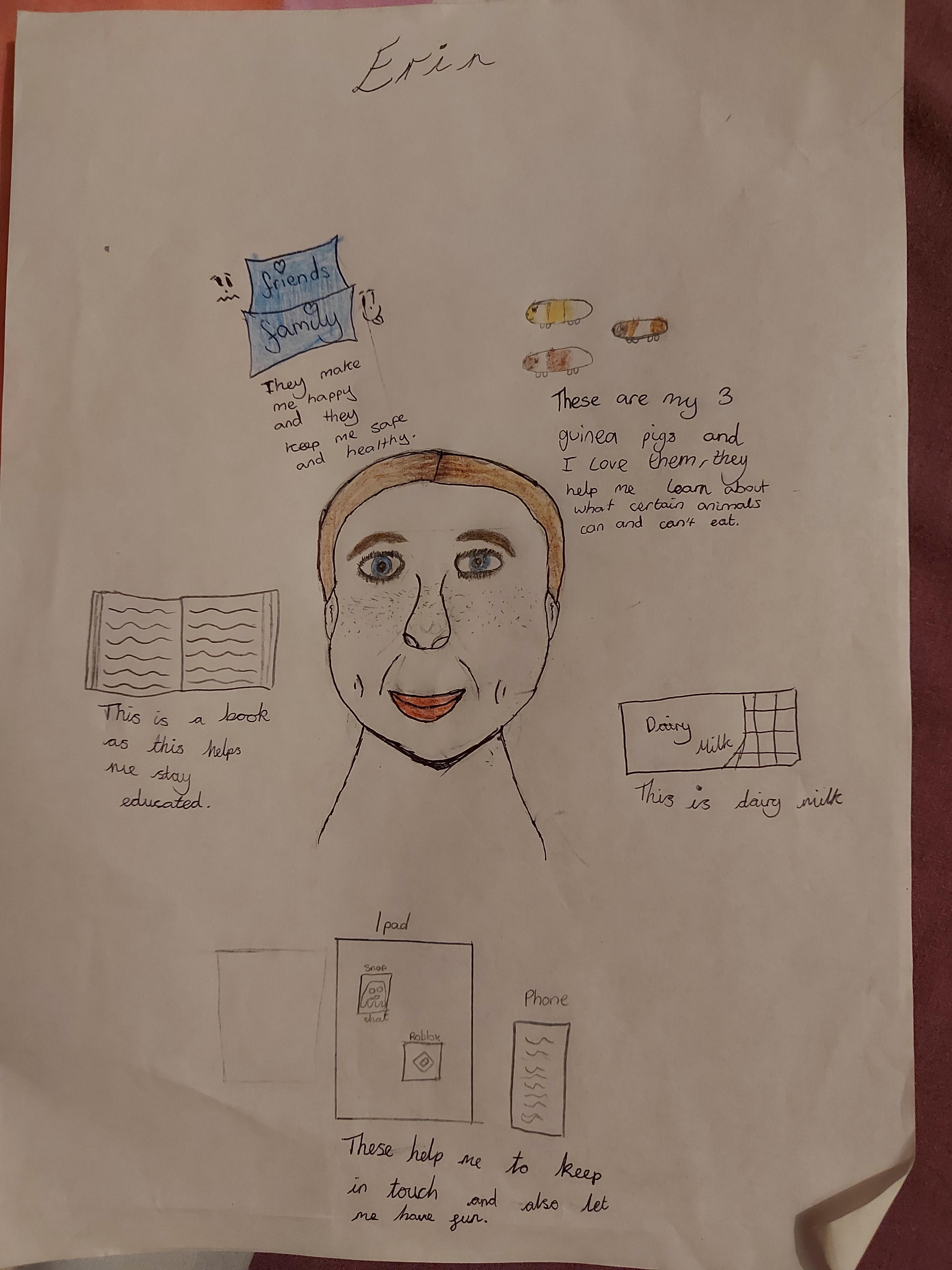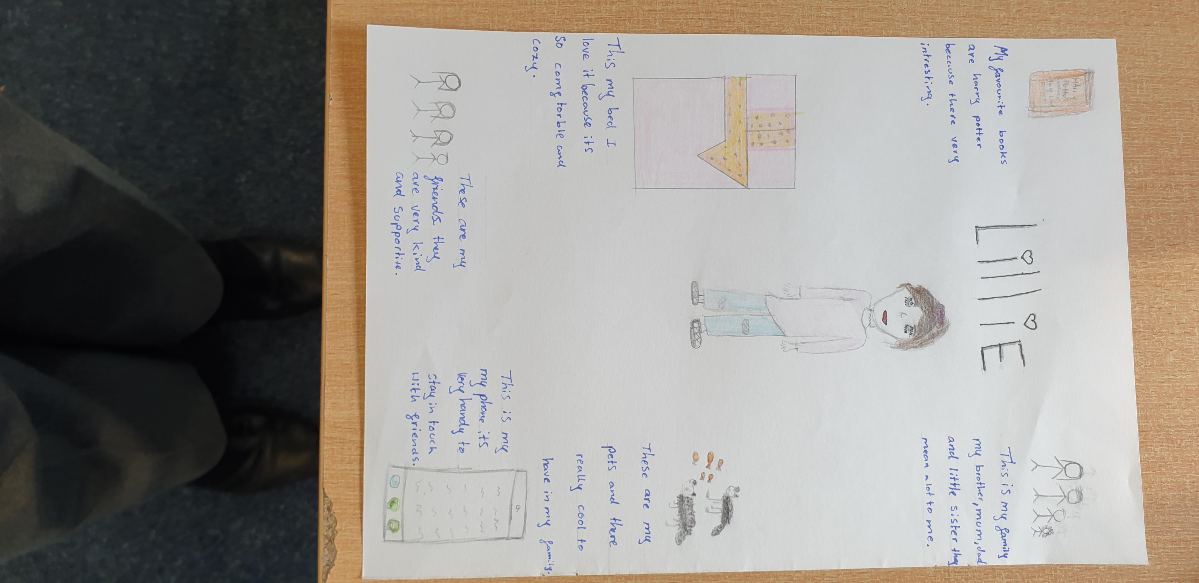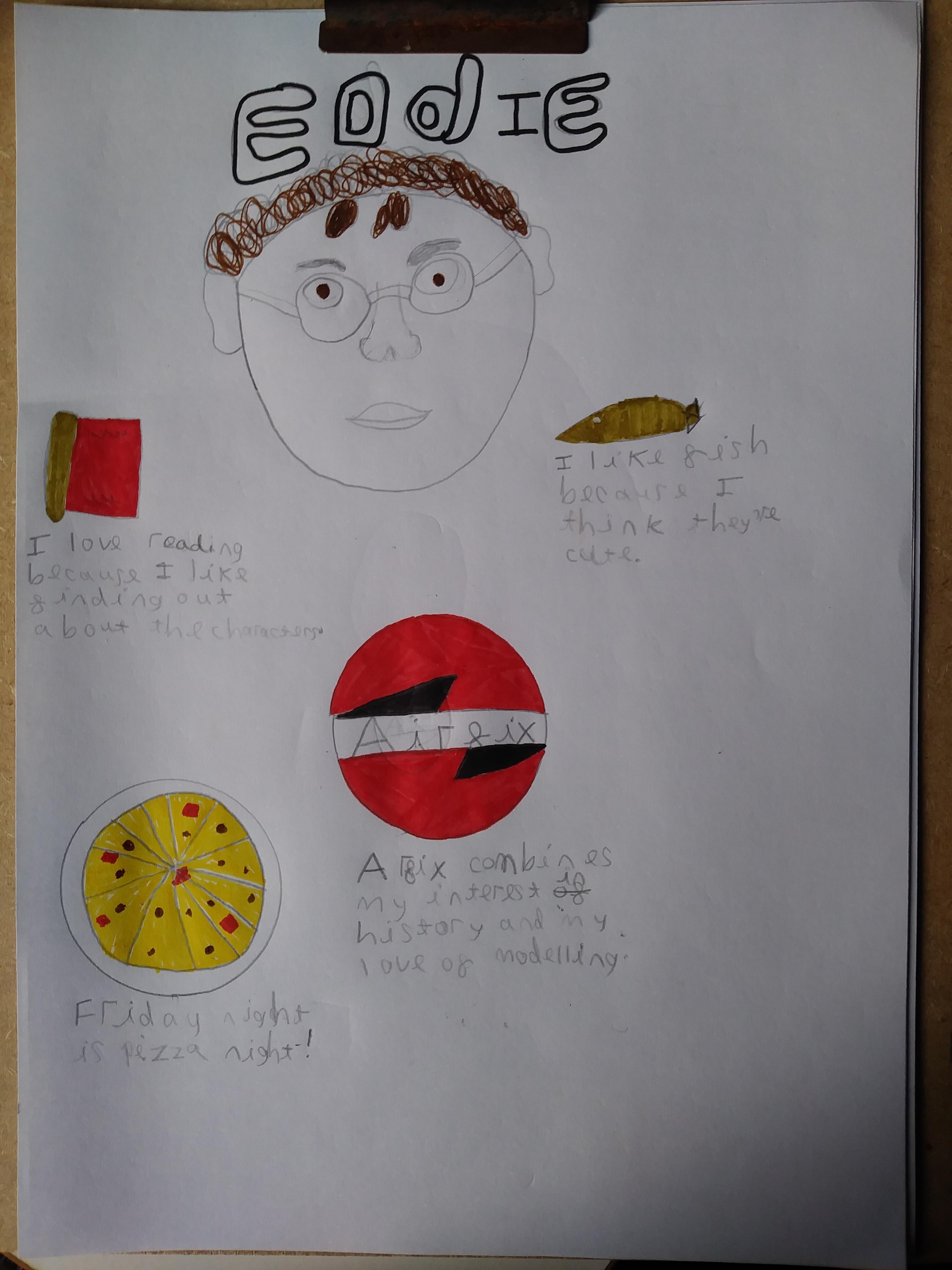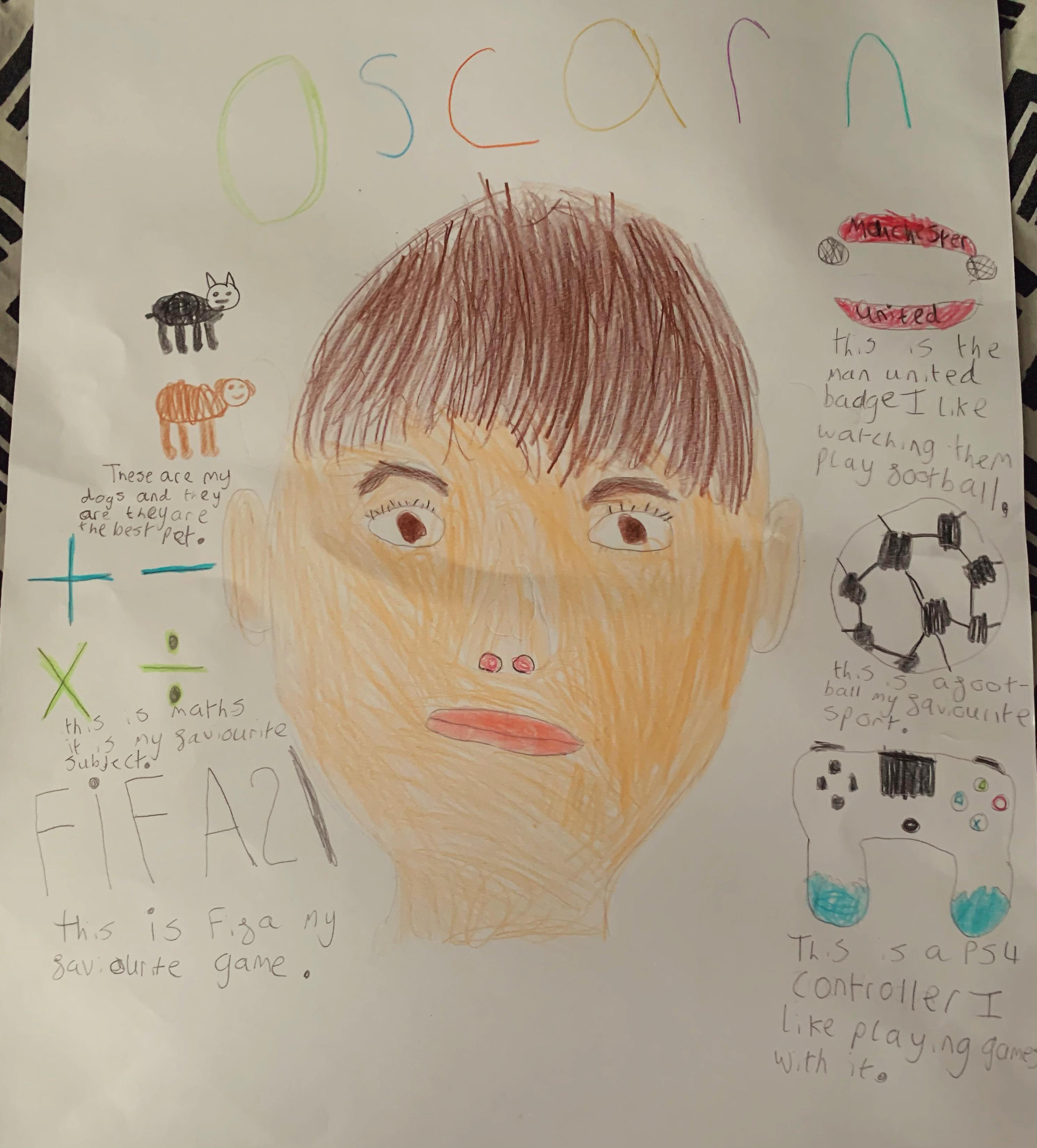 Think about which objects say most about you as a person. On a blank piece of paper, draw a large picture of yourself (use a mirror to help if you want to) – no stick figures please, a proper picture! Around the outside of your portrait, draw five or six objects which say the most about you (for example – your hobbies, likes and dislikes, pets, friends, favourite books or games, etc.) Under each picture write a short sentence explaining what the item is and what it says about you as a person. Don’t forget to put your name on your work and to colour it in to make it look attractive!