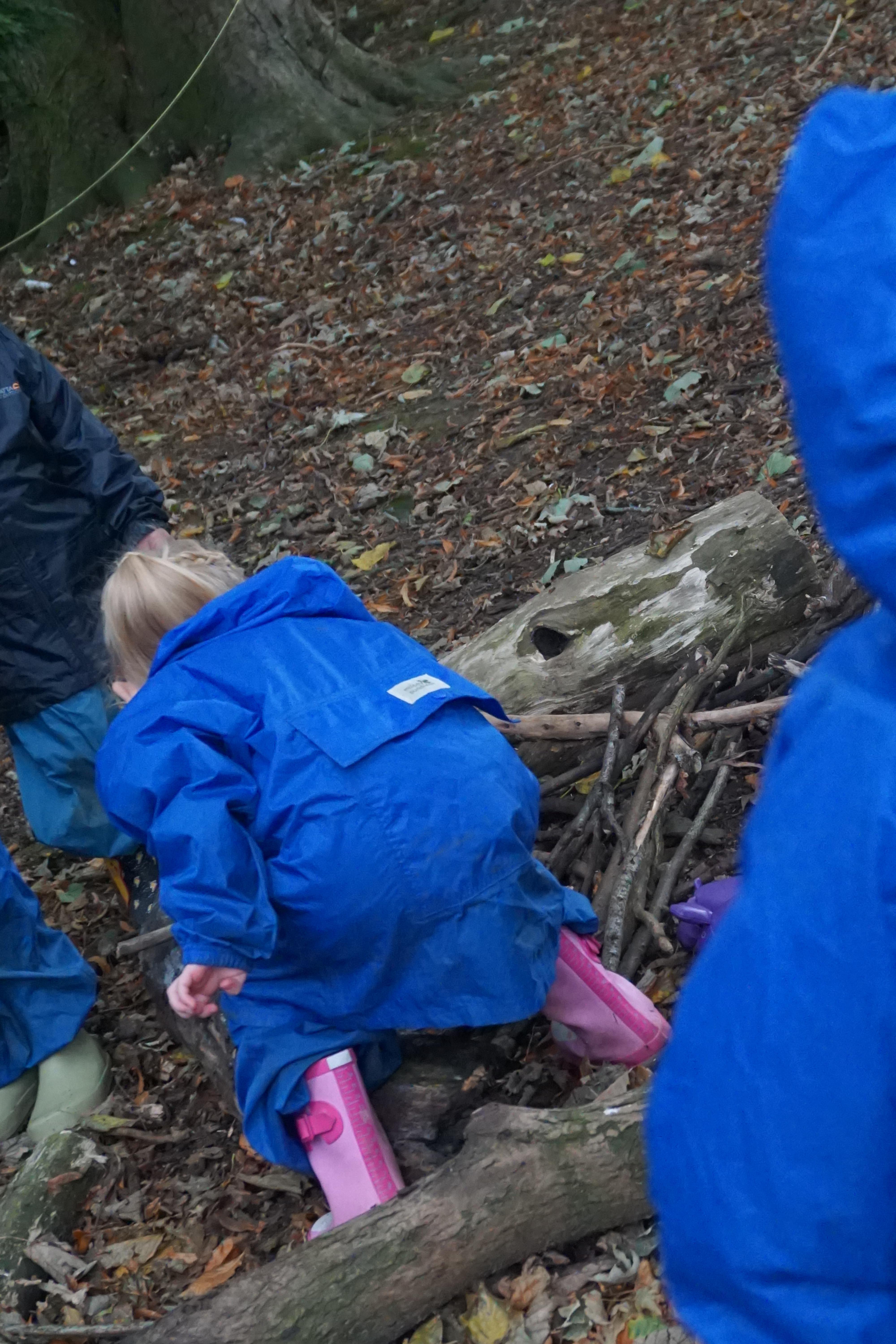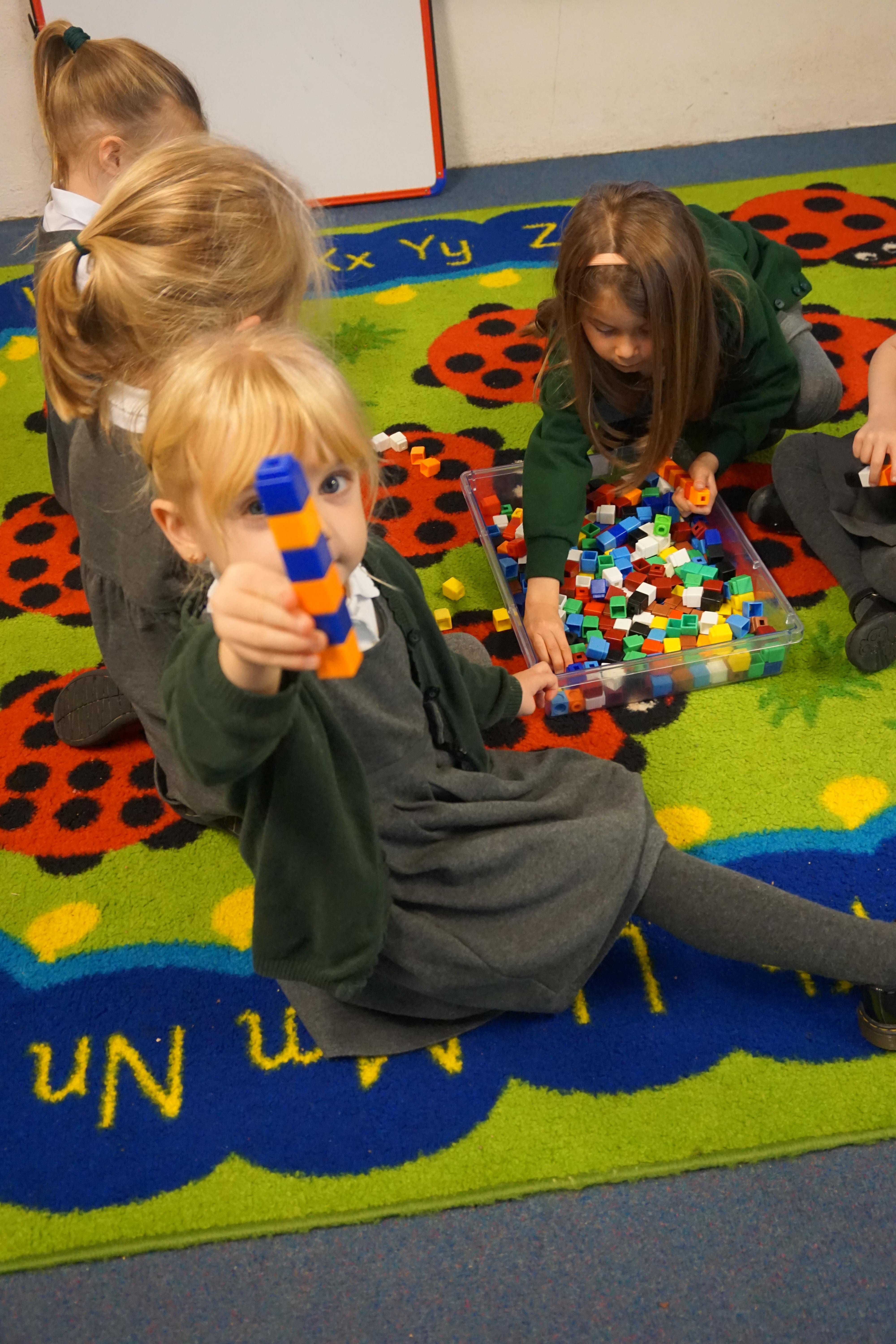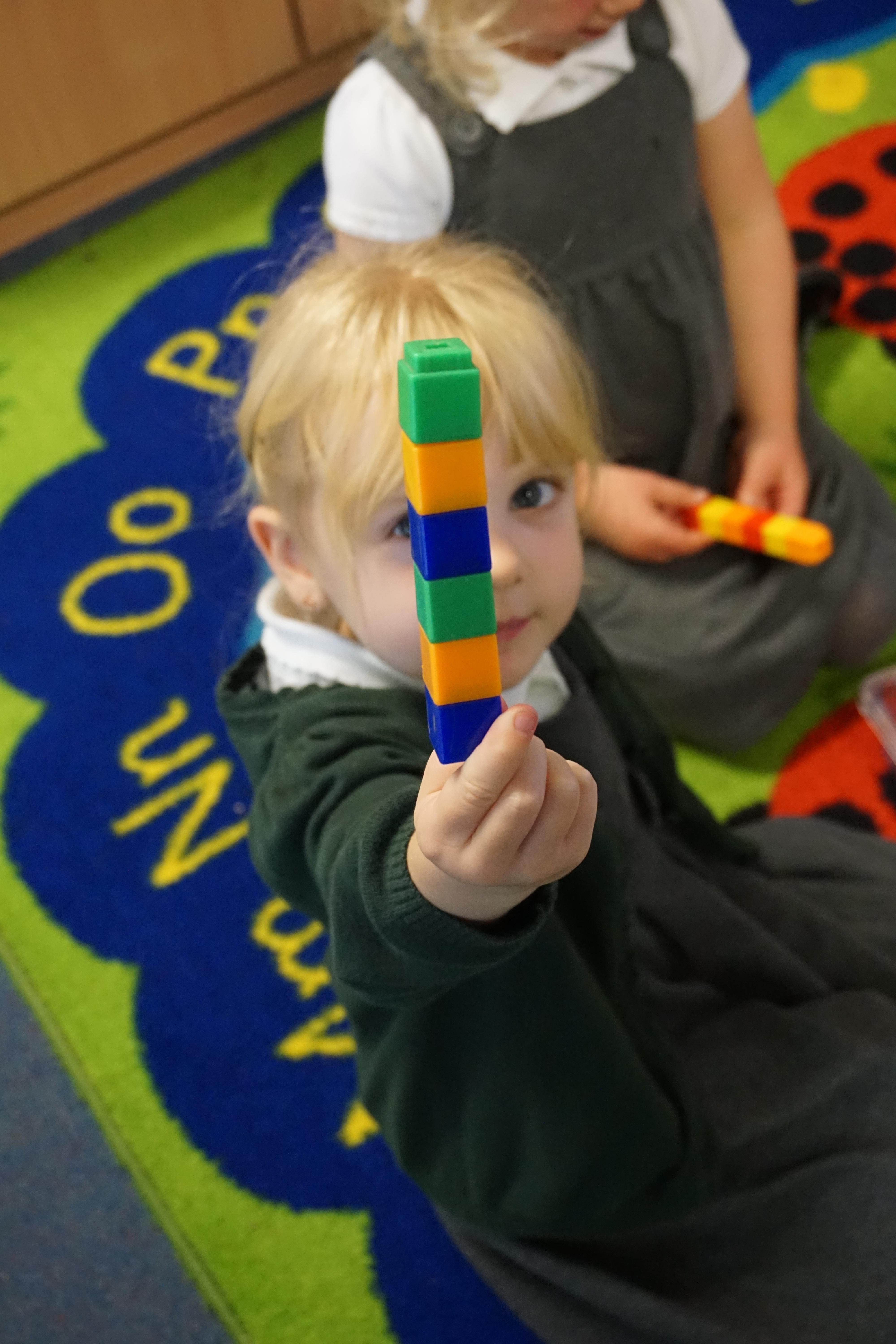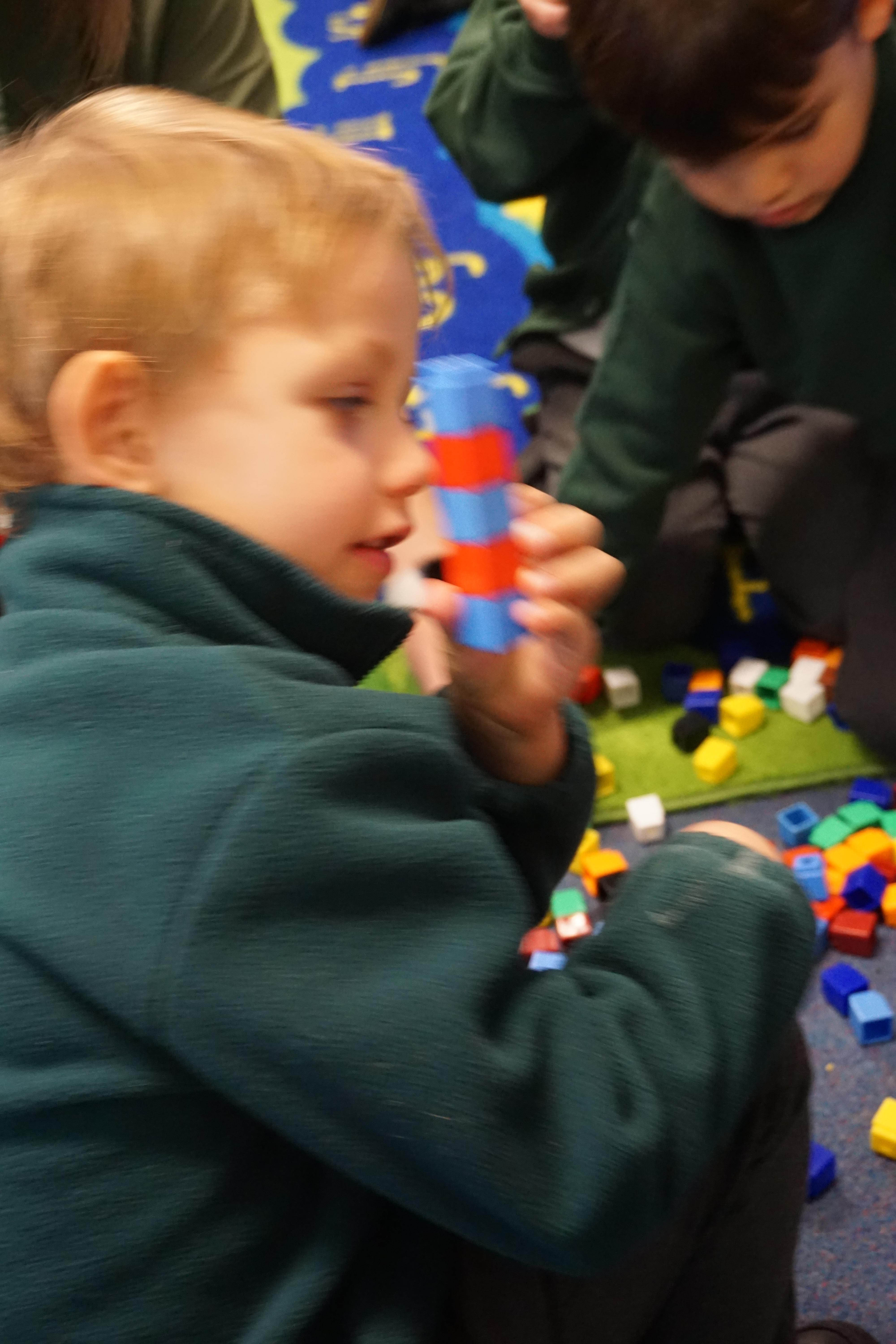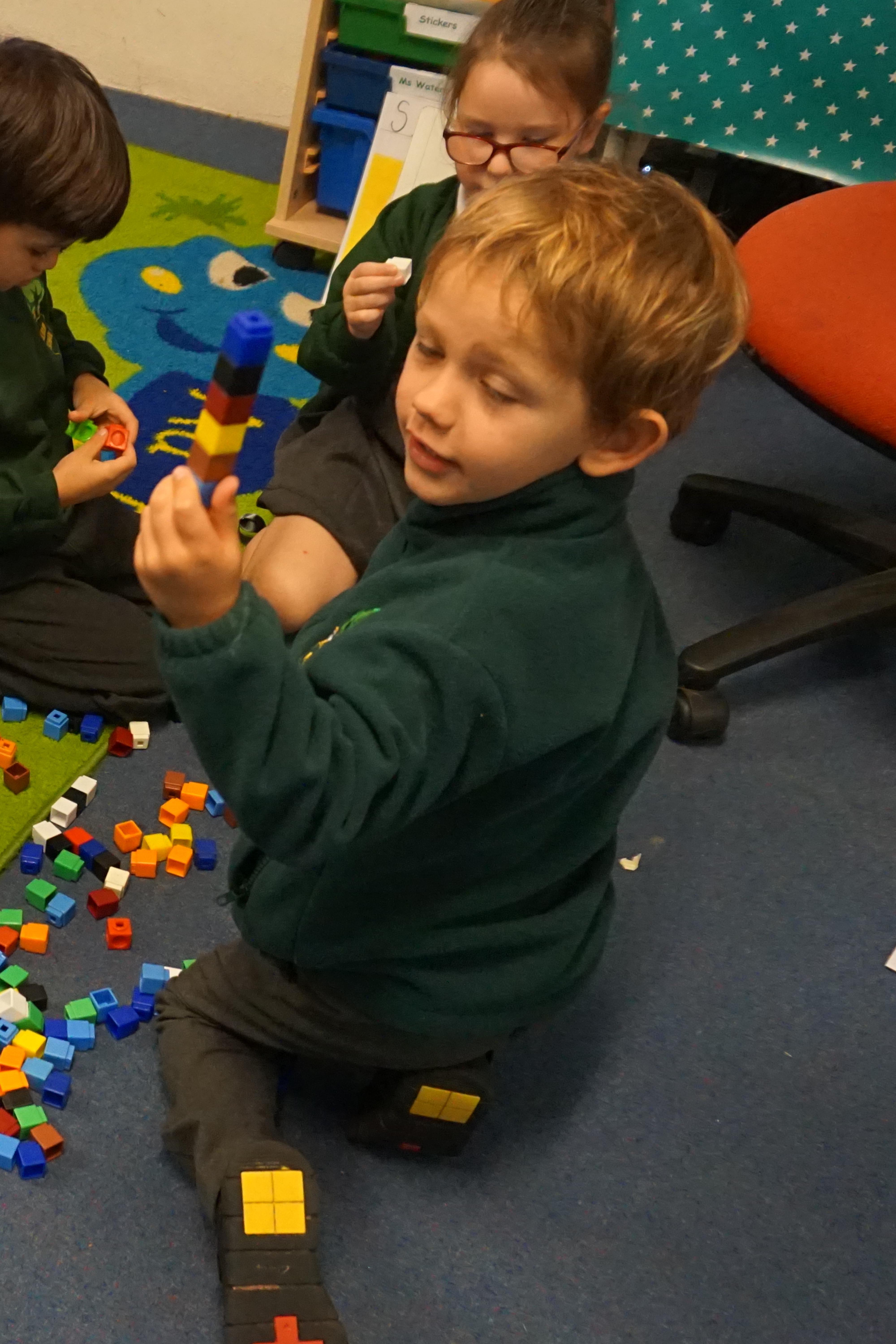We have made repeating patterns in maths using the coloured cubes and have learnt three more sounds, p i n. The children also had great fun at forest school today.
