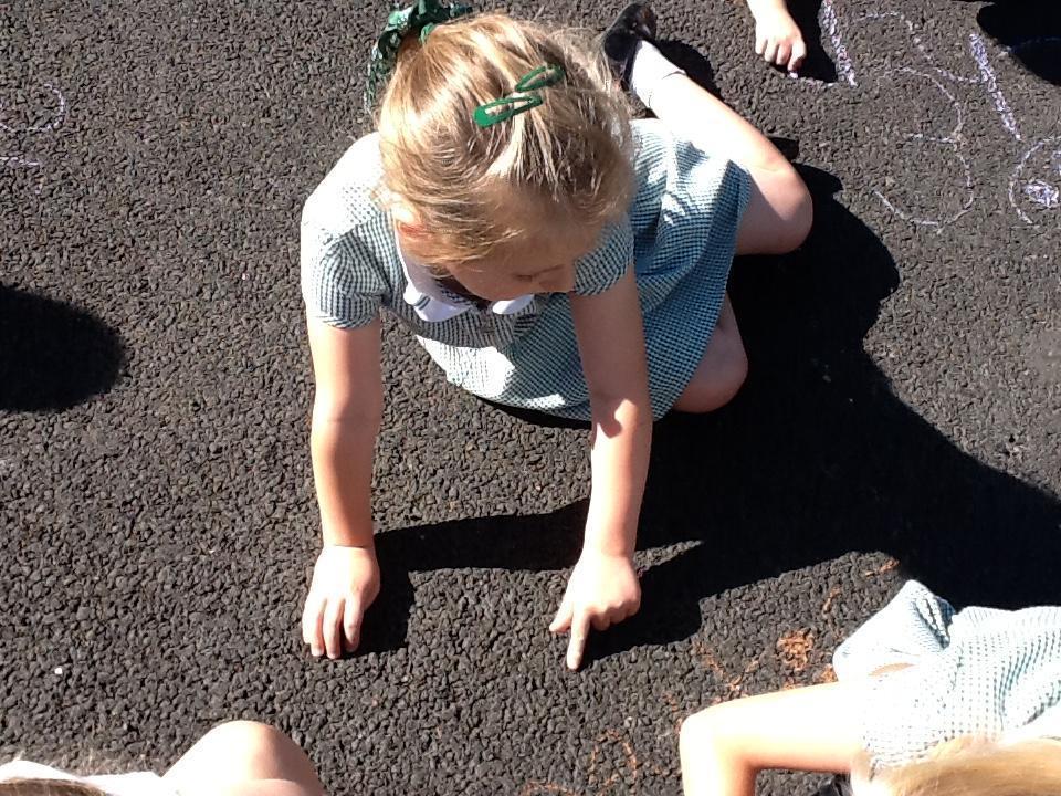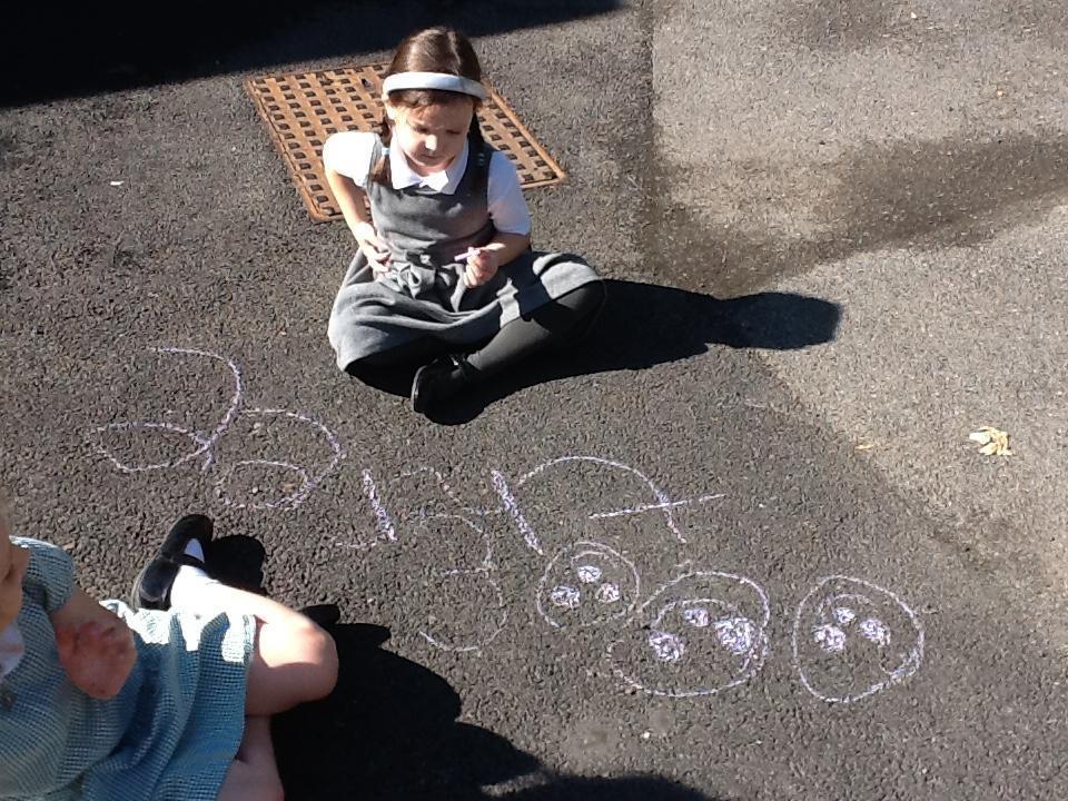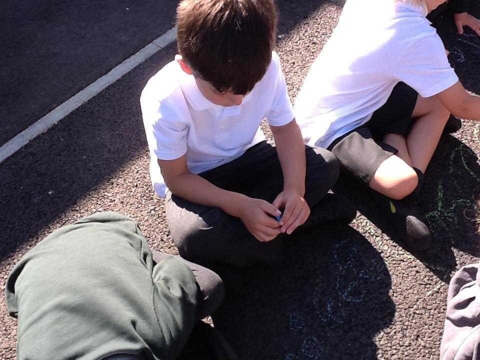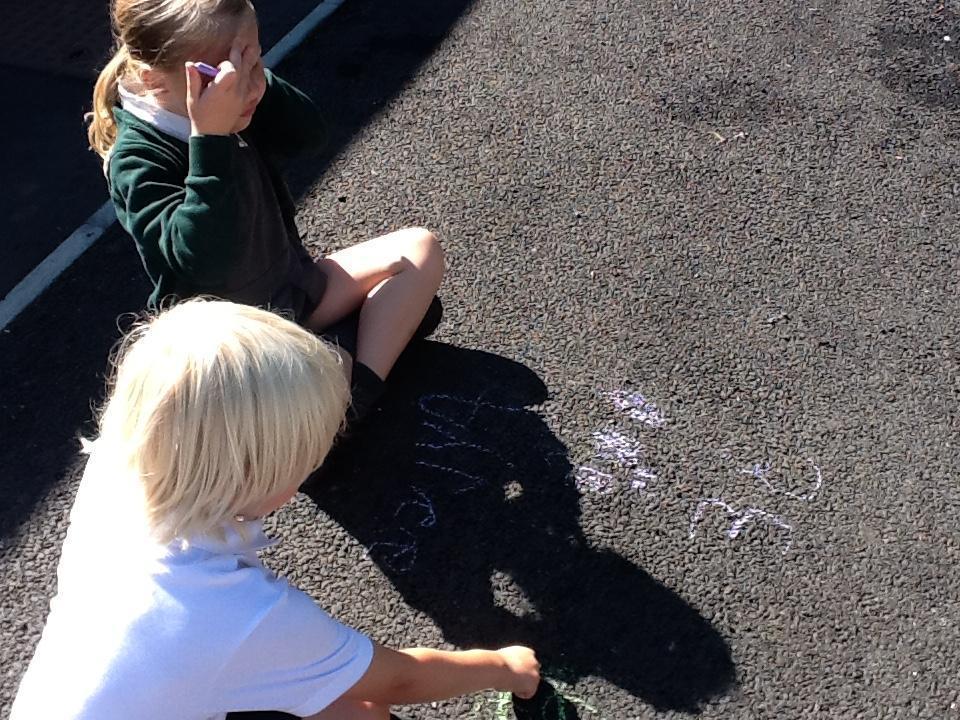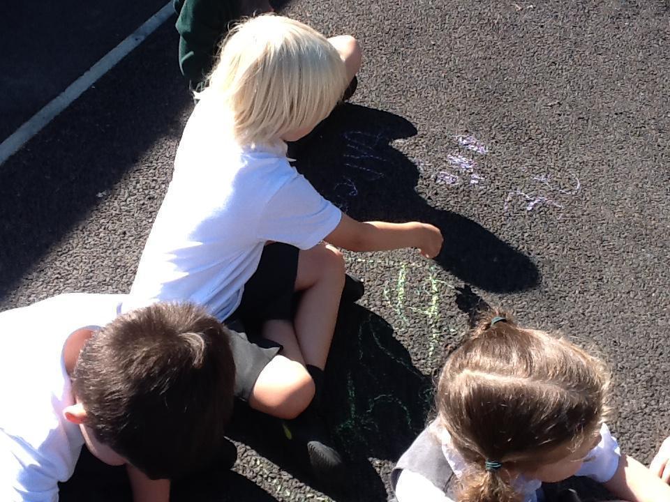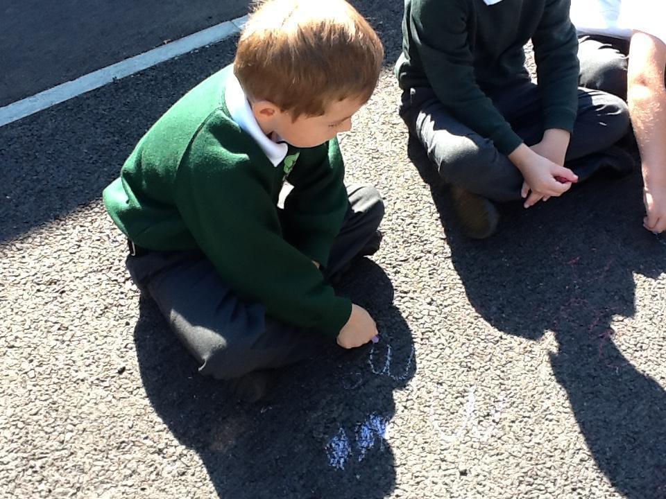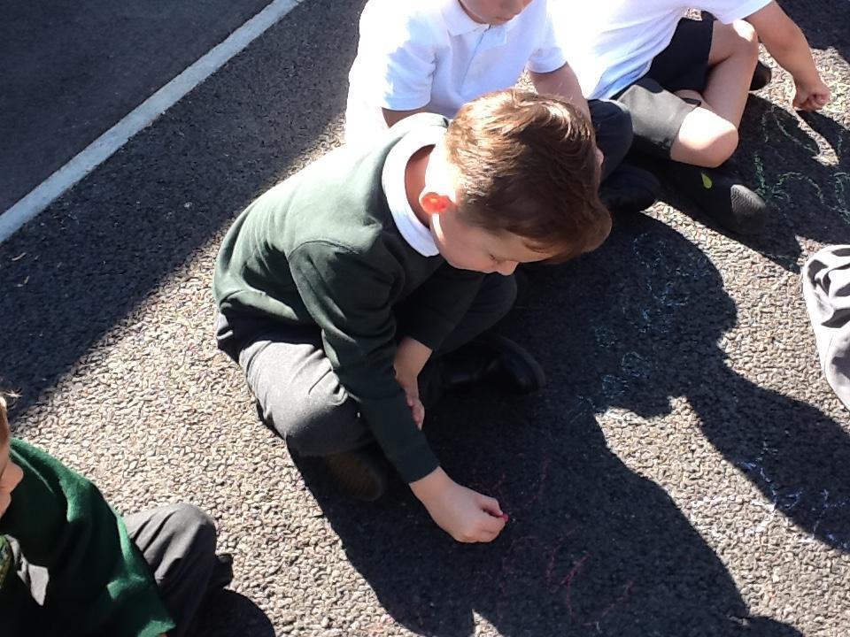 In Maths today we have been continuing to identify numbers. The children used chalk to represent numbers to 20 in different ways (for example as a numeral, a word or by drawing objects).