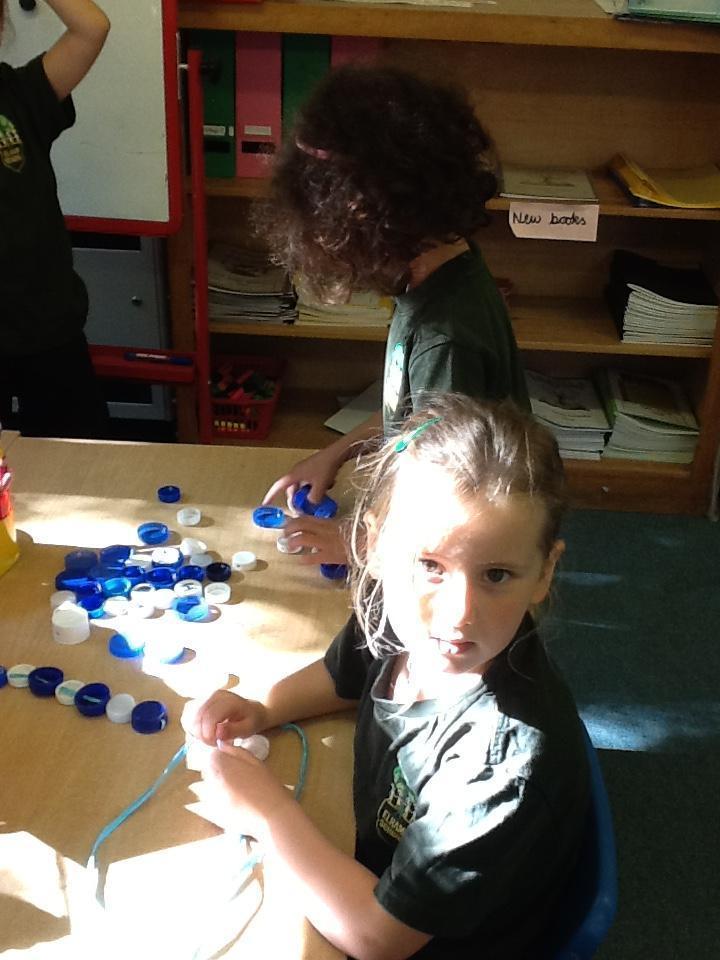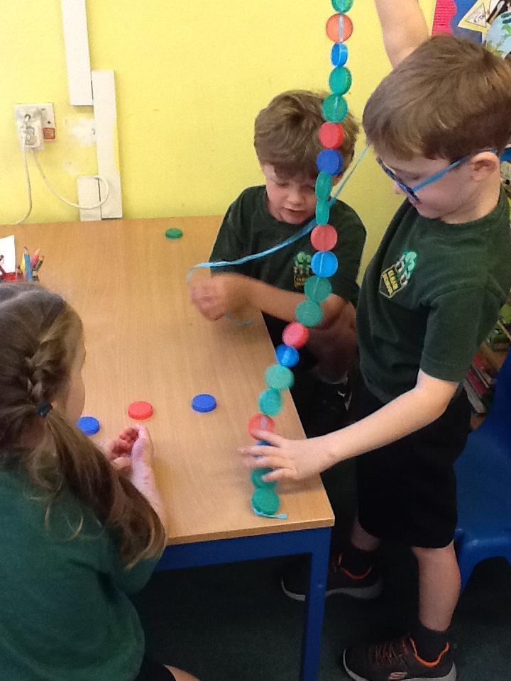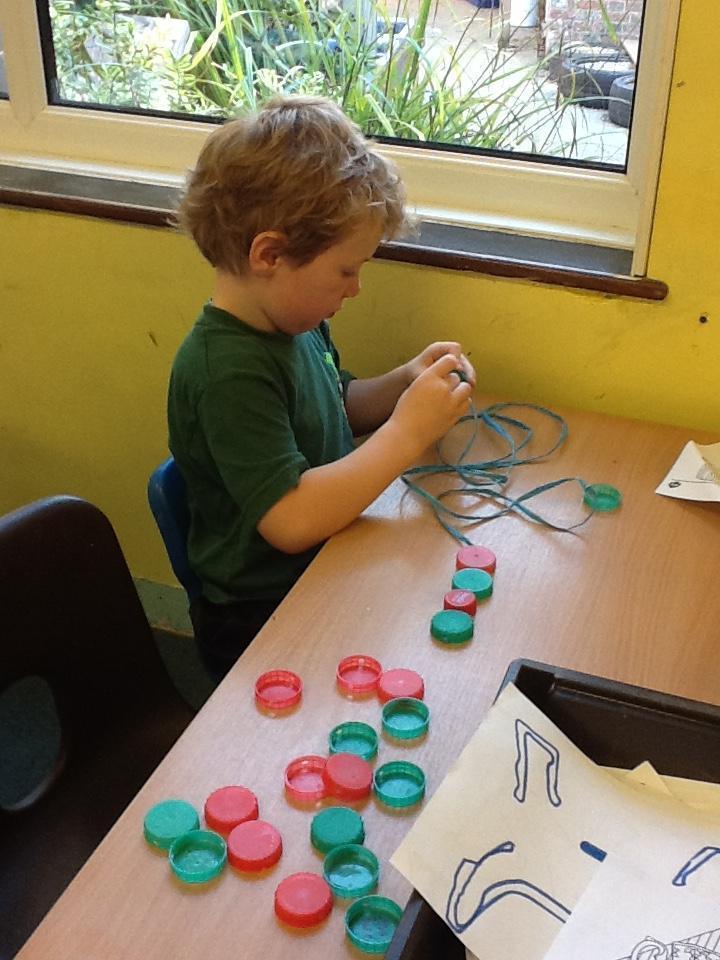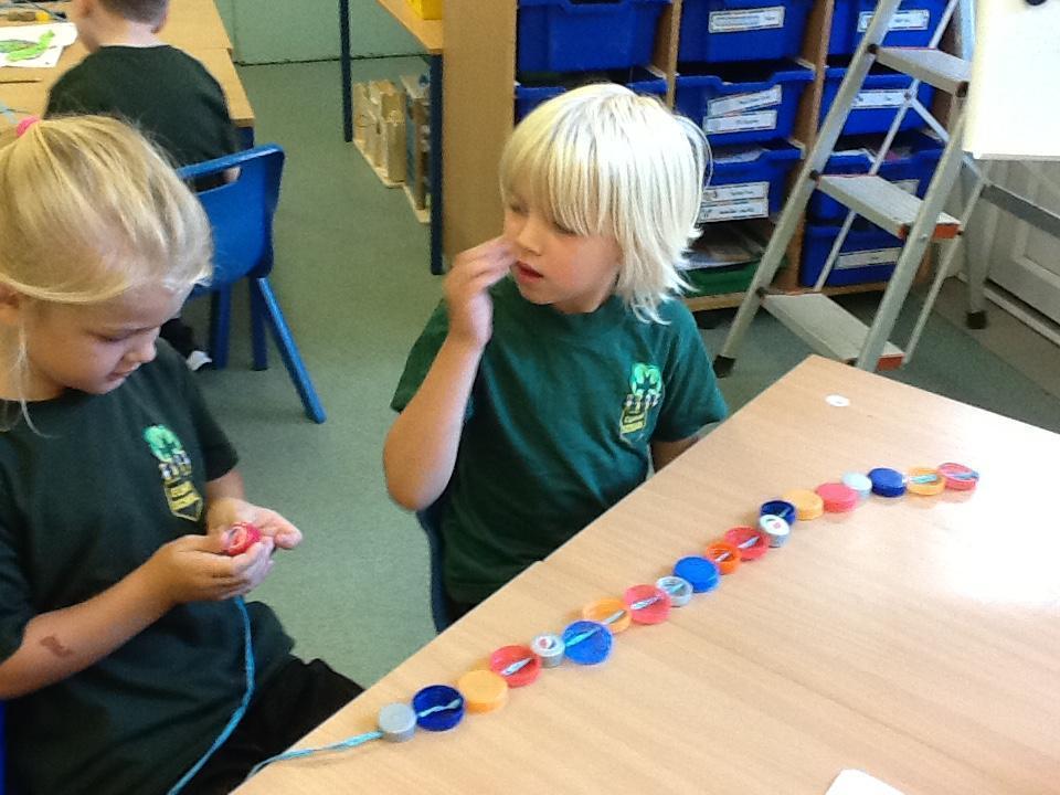The children are also learning about repeating patterns.  We are using bottle tops to make a door curtain with repeating patterns!  We are also practising threading.