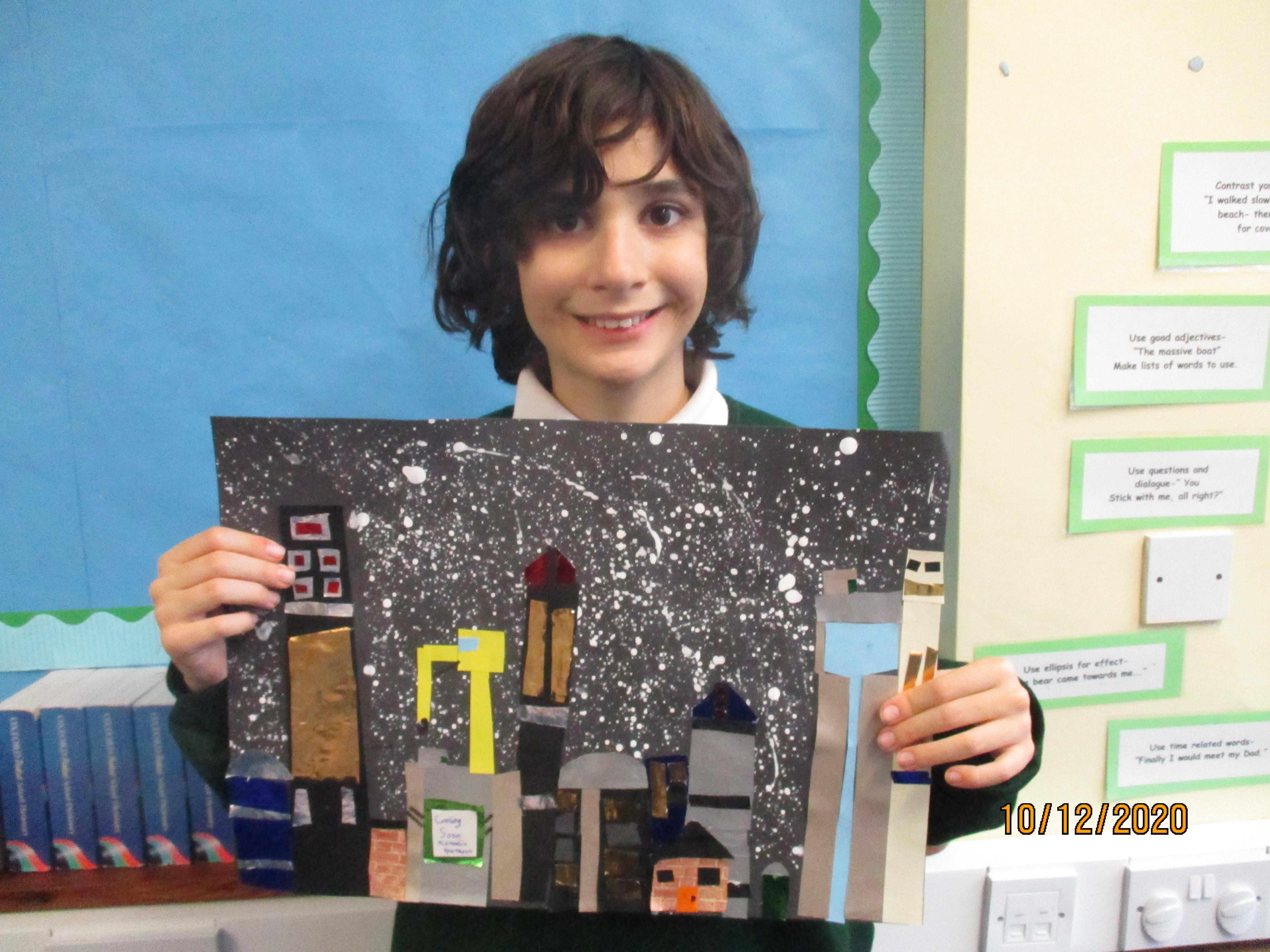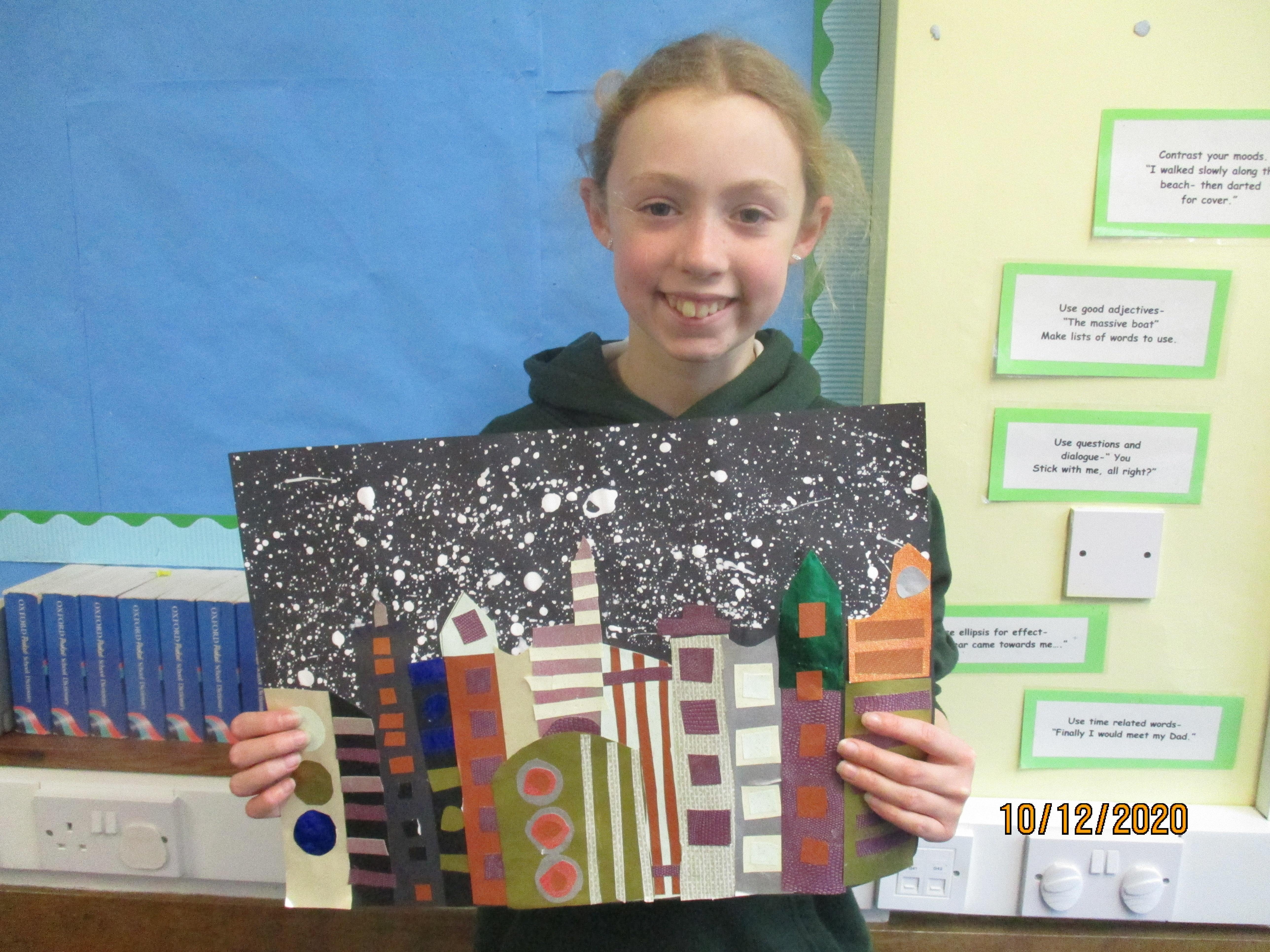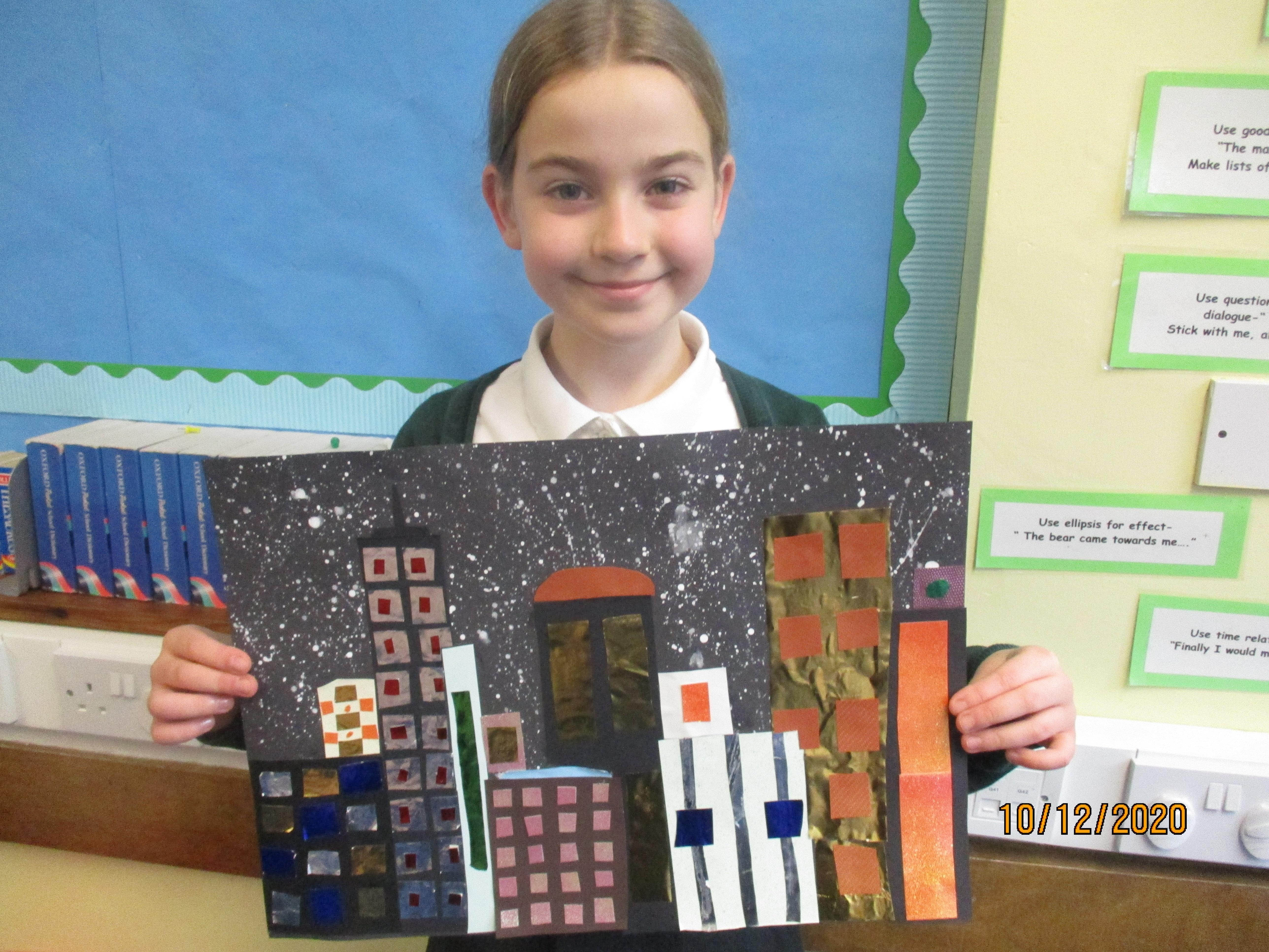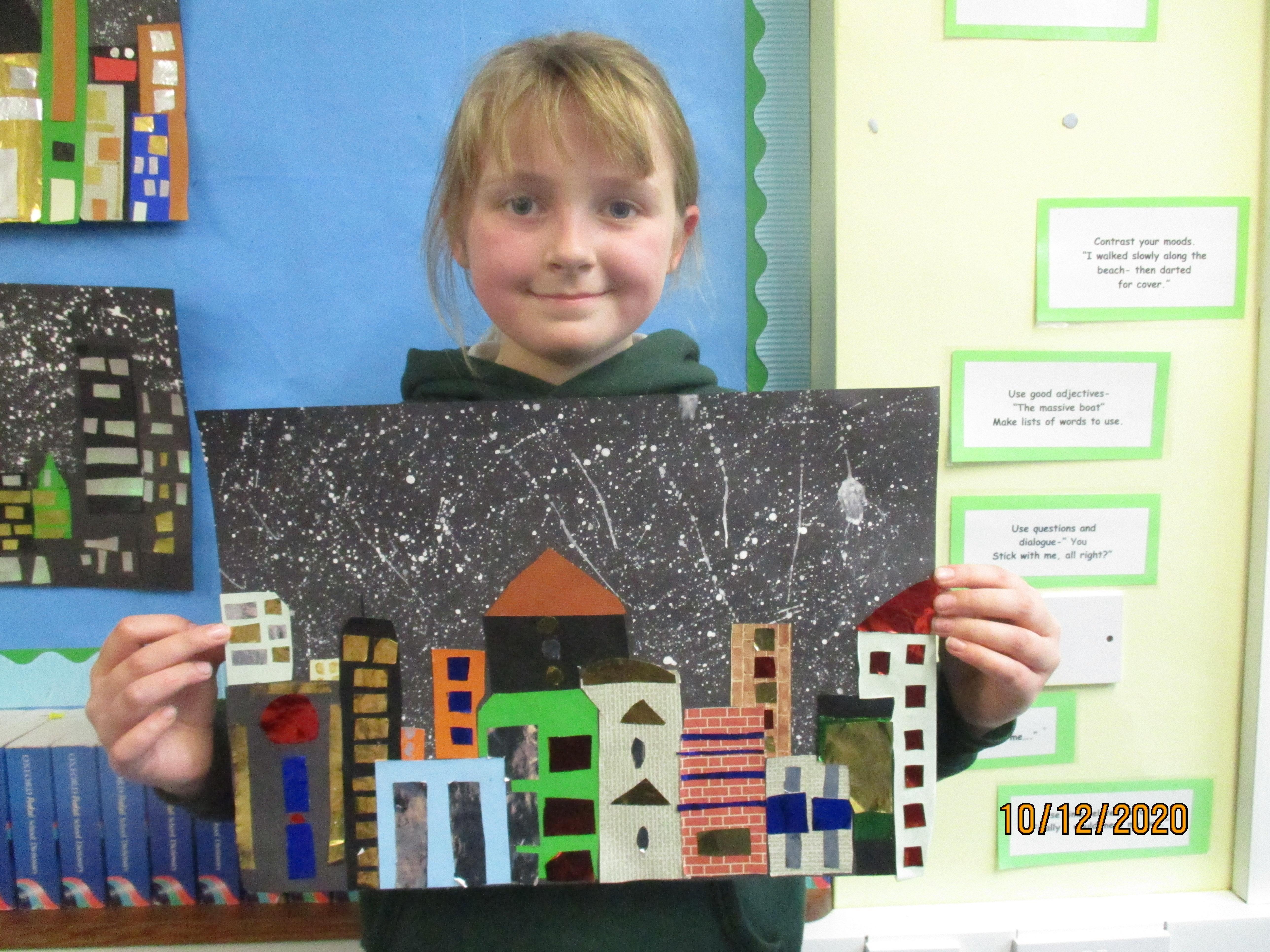 We have created some amazing artwork for Mrs Short. Our pictures are of winter cityscapes with snowy backgrounds. It's the first time we have tried these and they have turned out really well. Below you will see some photos of us at work, as well as our completed artworks which are now up on display in class.