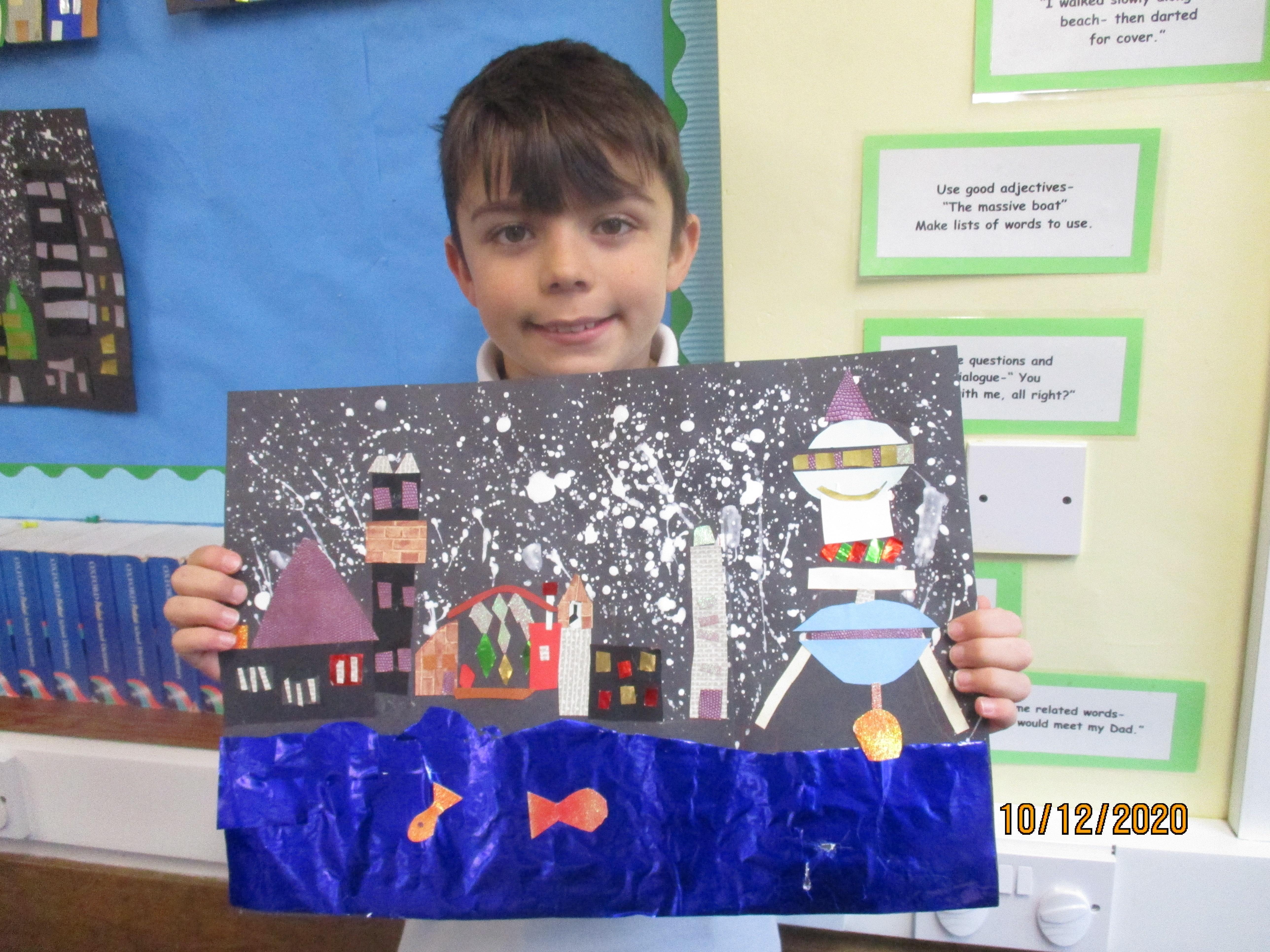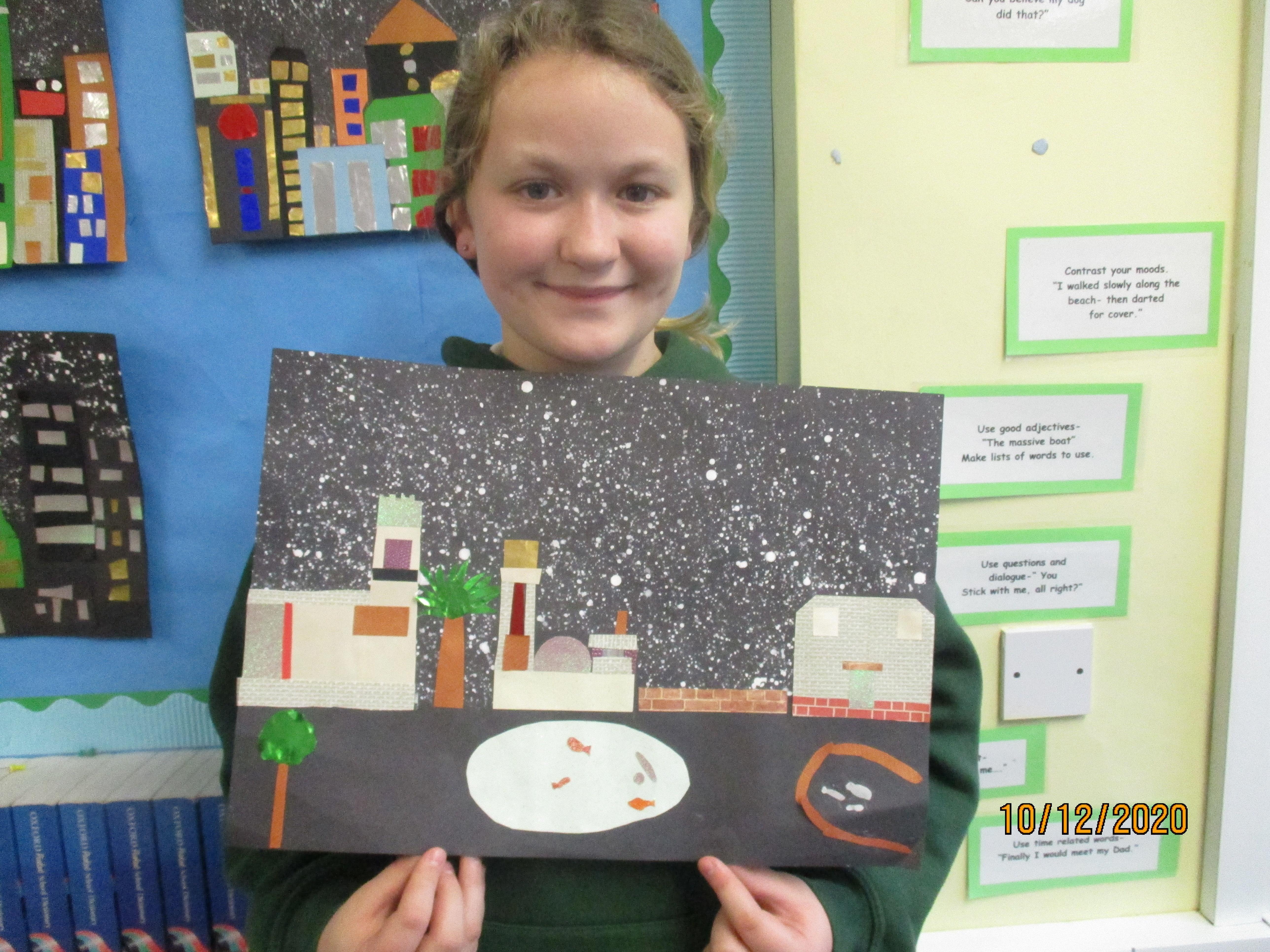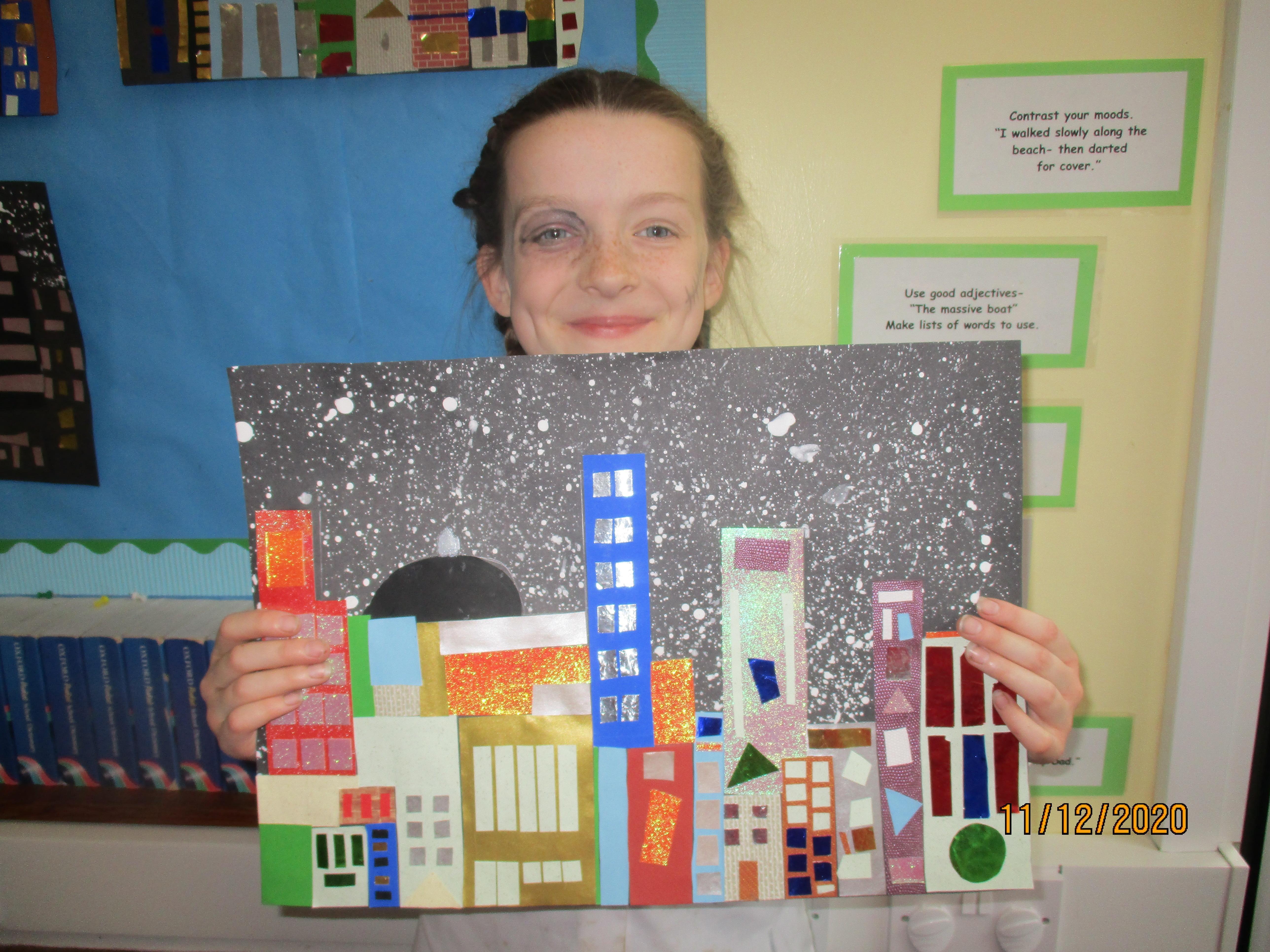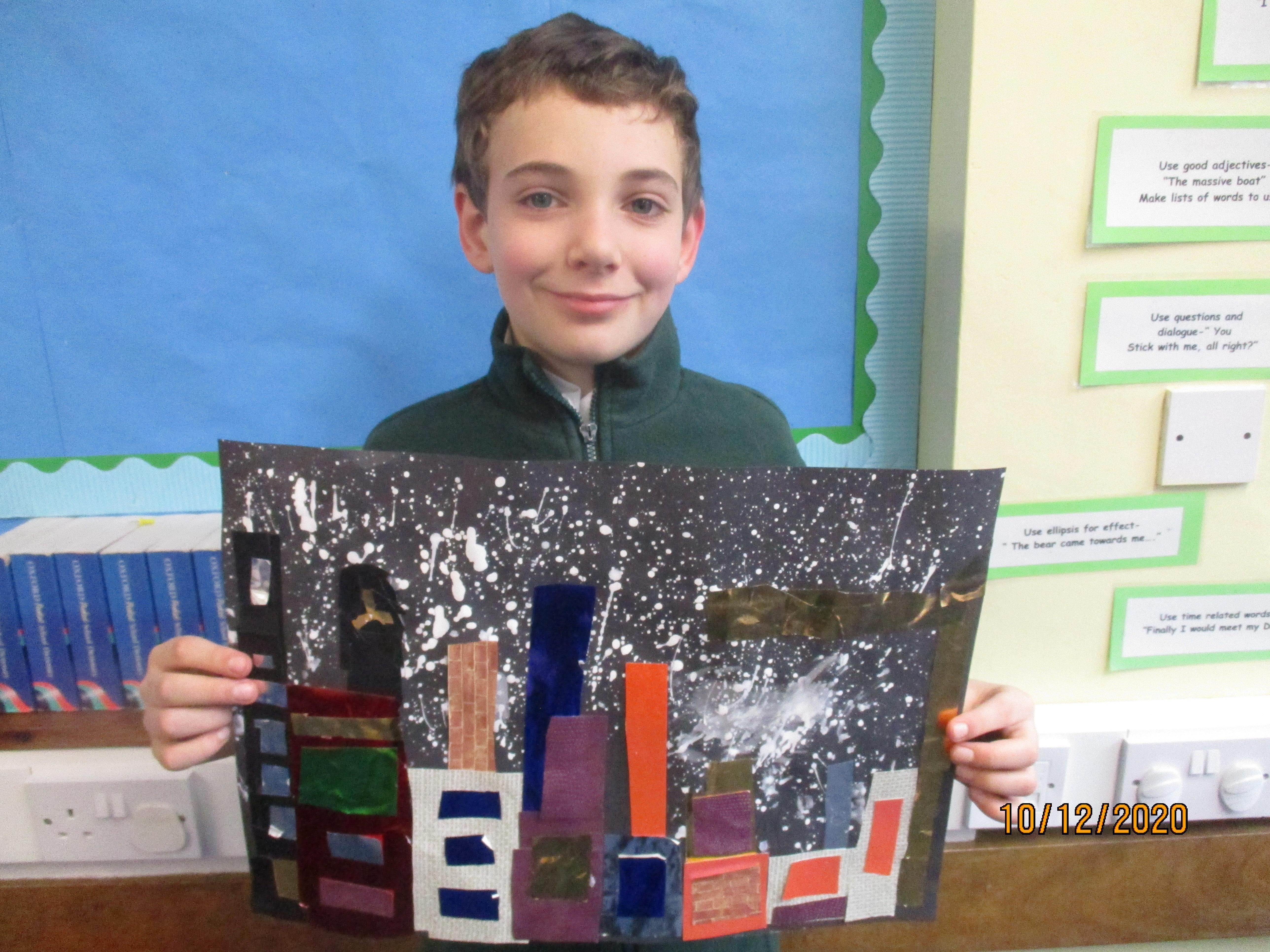 We have created some amazing artwork for Mrs Short. Our pictures are of winter cityscapes with snowy backgrounds. It's the first time we have tried these and they have turned out really well. Below you will see some photos of us at work, as well as our completed artworks which are now up on display in class.