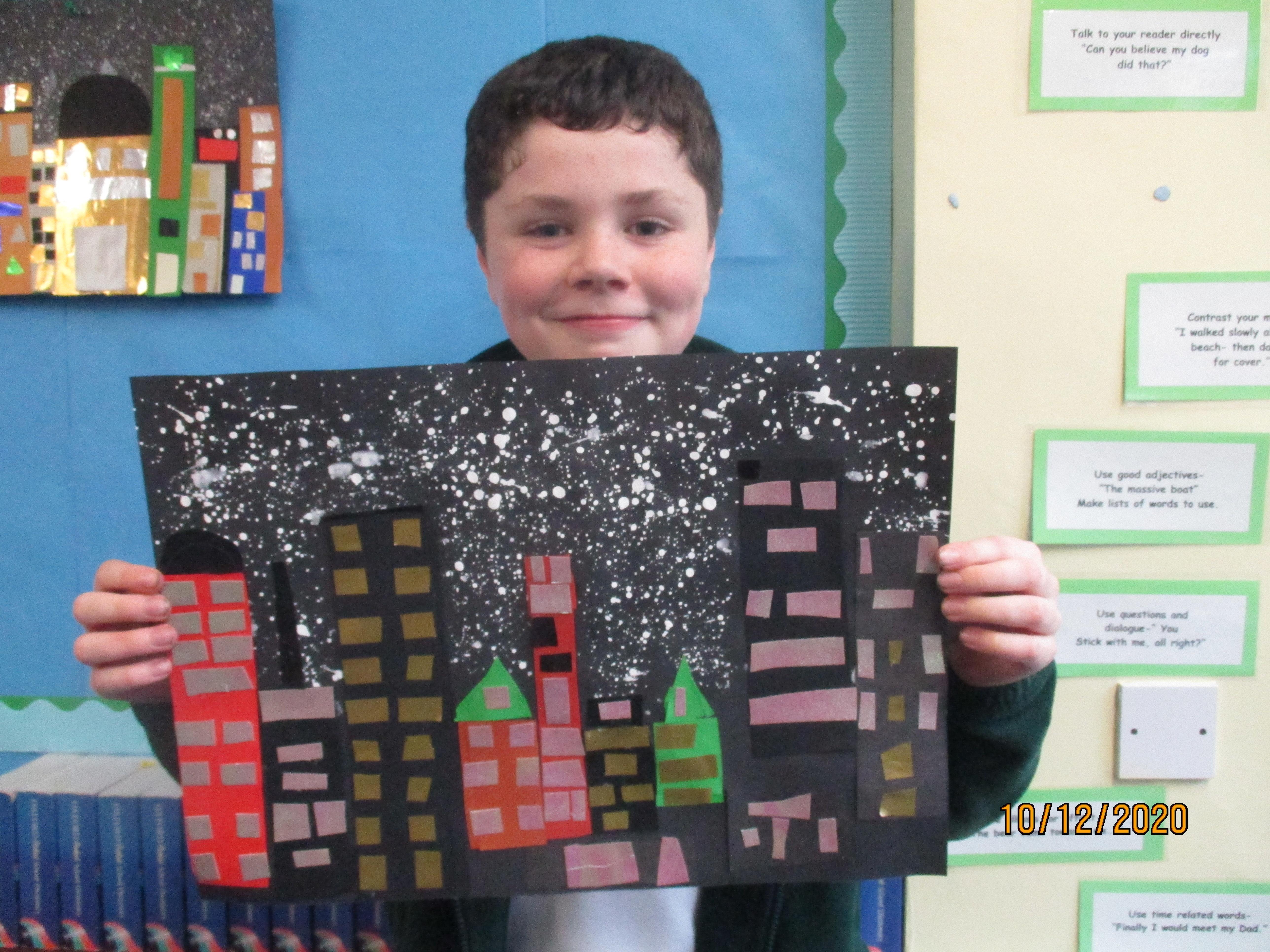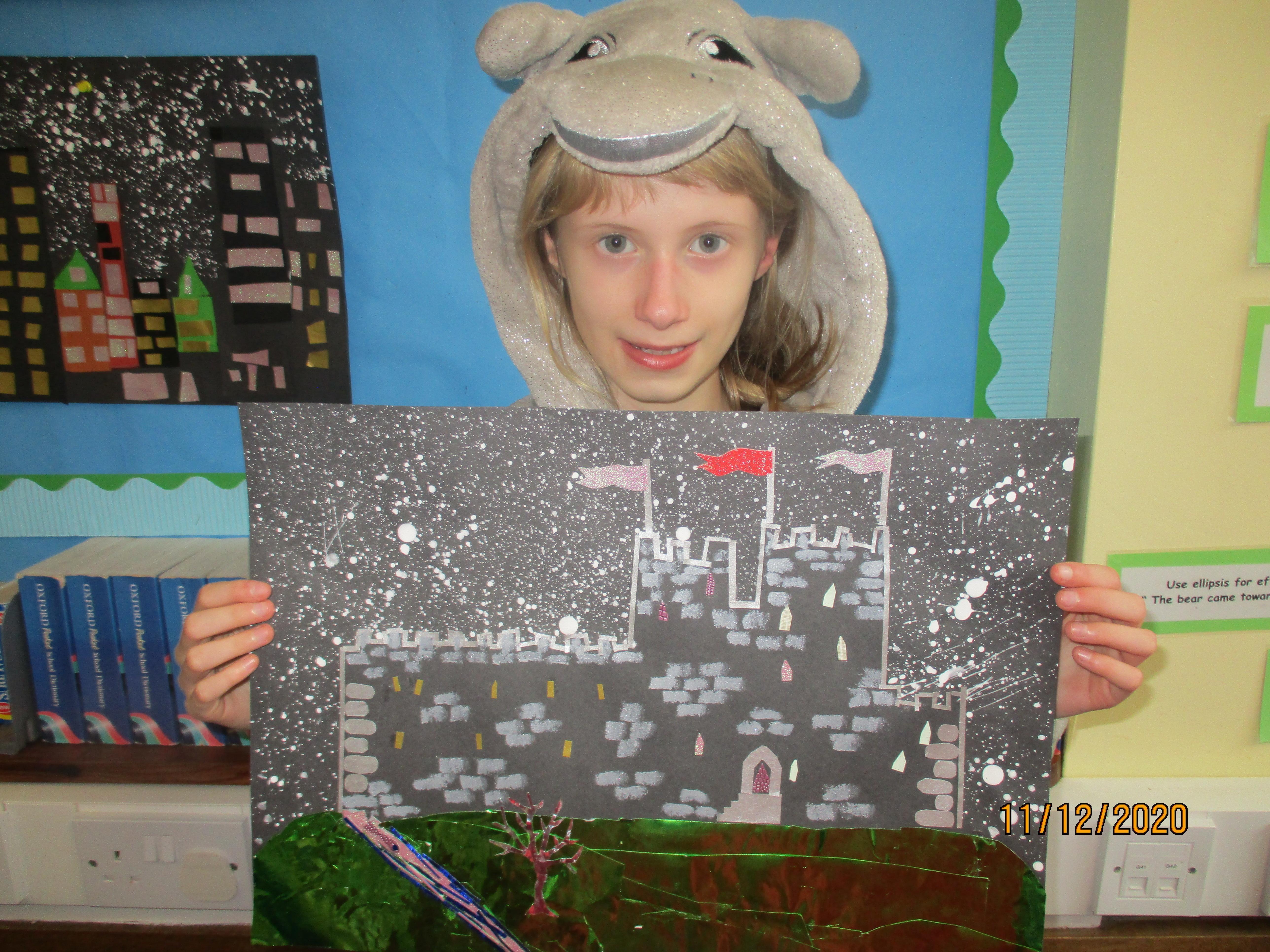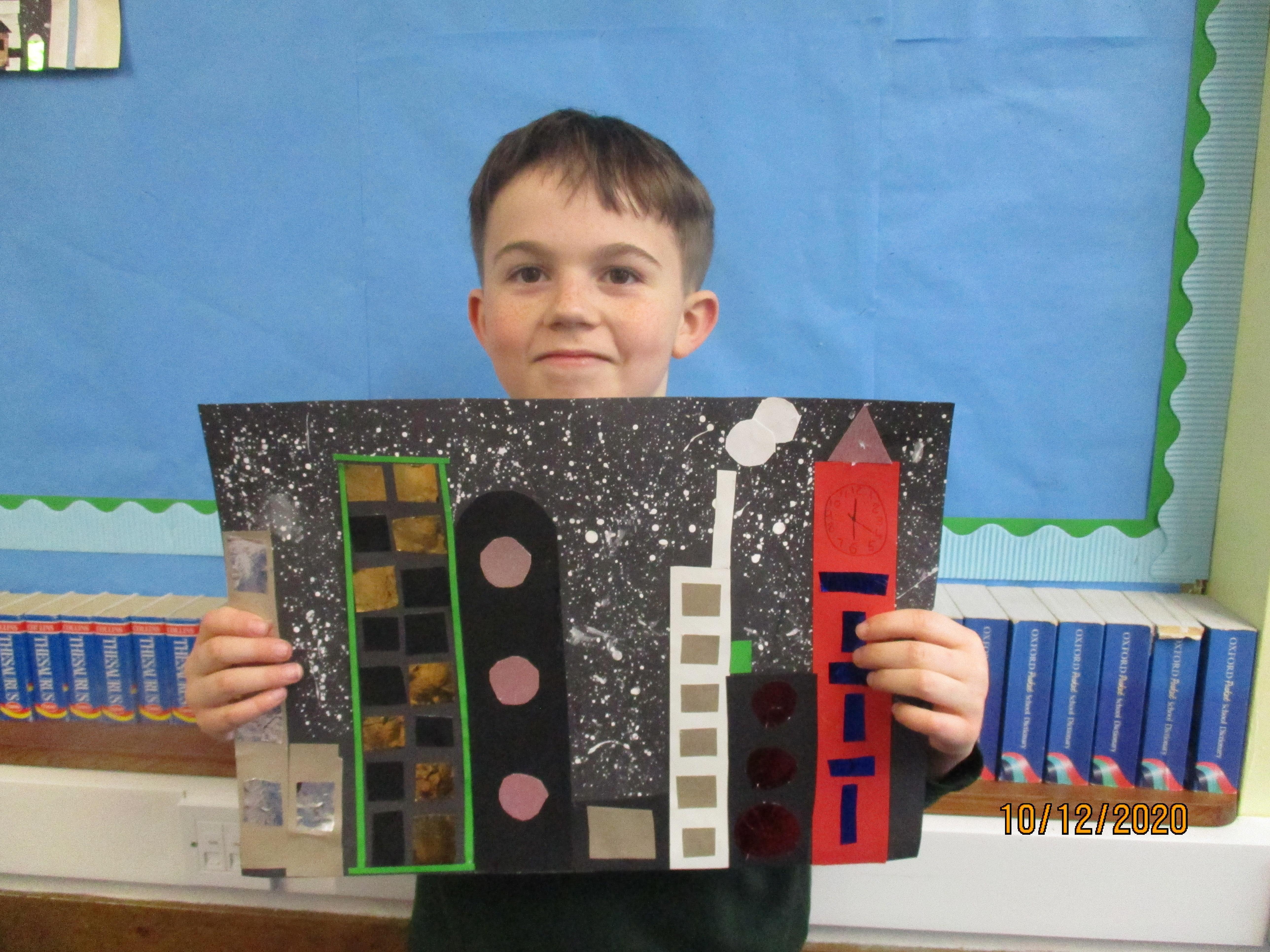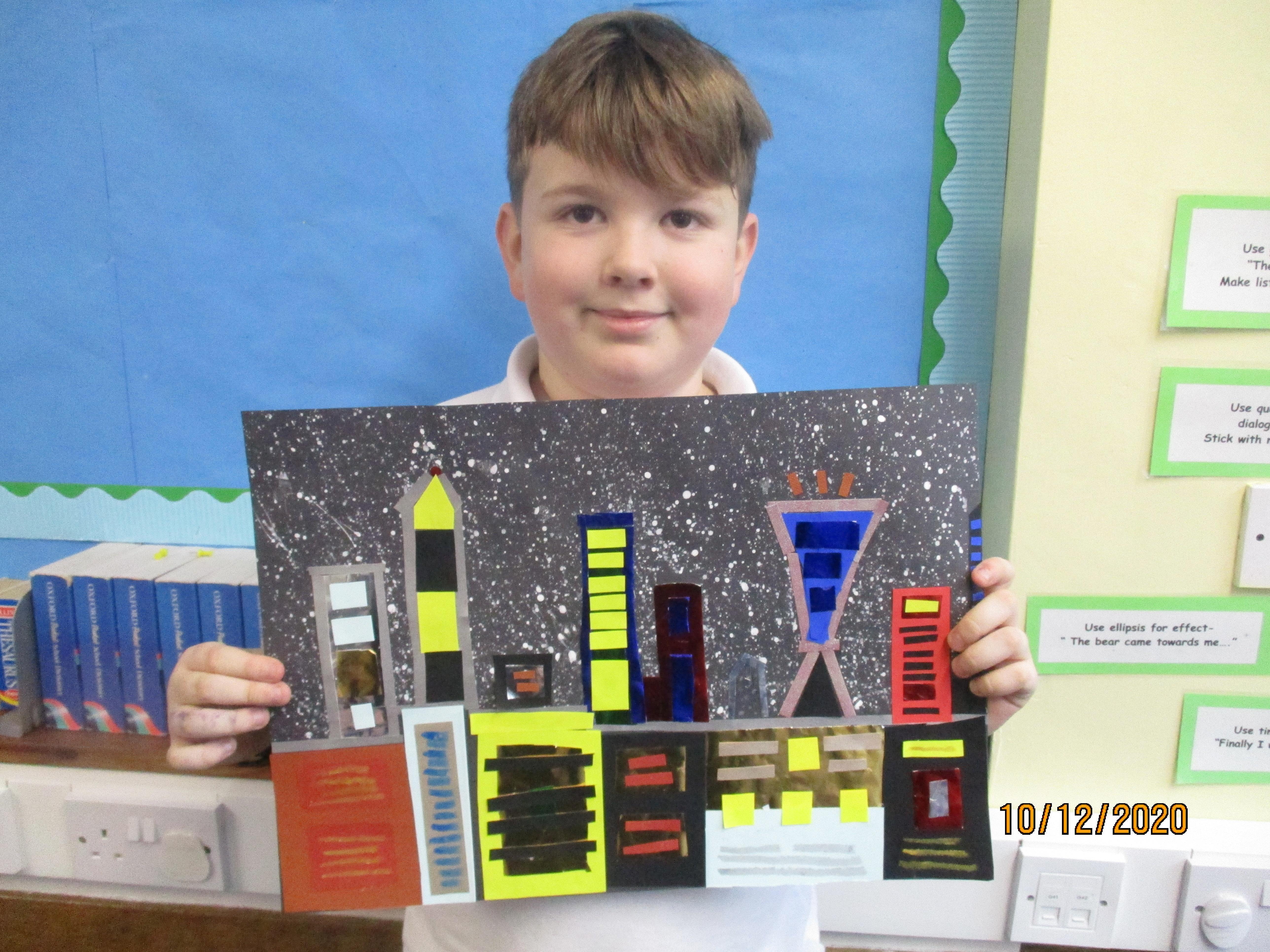We have created some amazing artwork for Mrs Short. Our pictures are of winter cityscapes with snowy backgrounds. It's the first time we have tried these and they have turned out really well. Below you will see some photos of us at work, as well as our completed artworks which are now up on display in class.