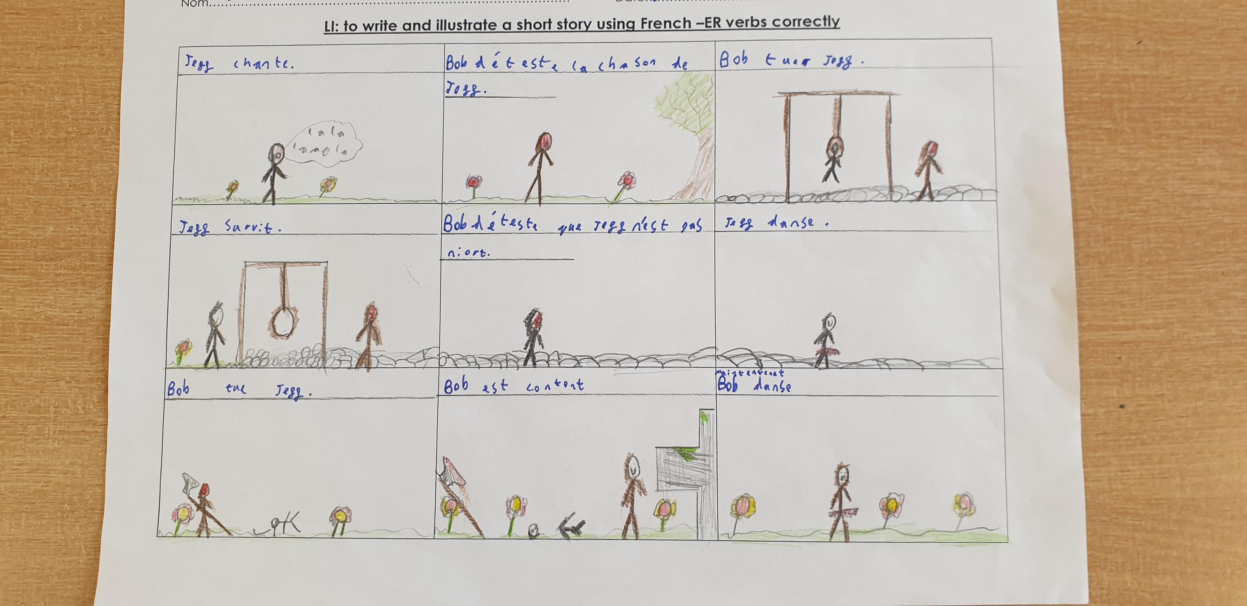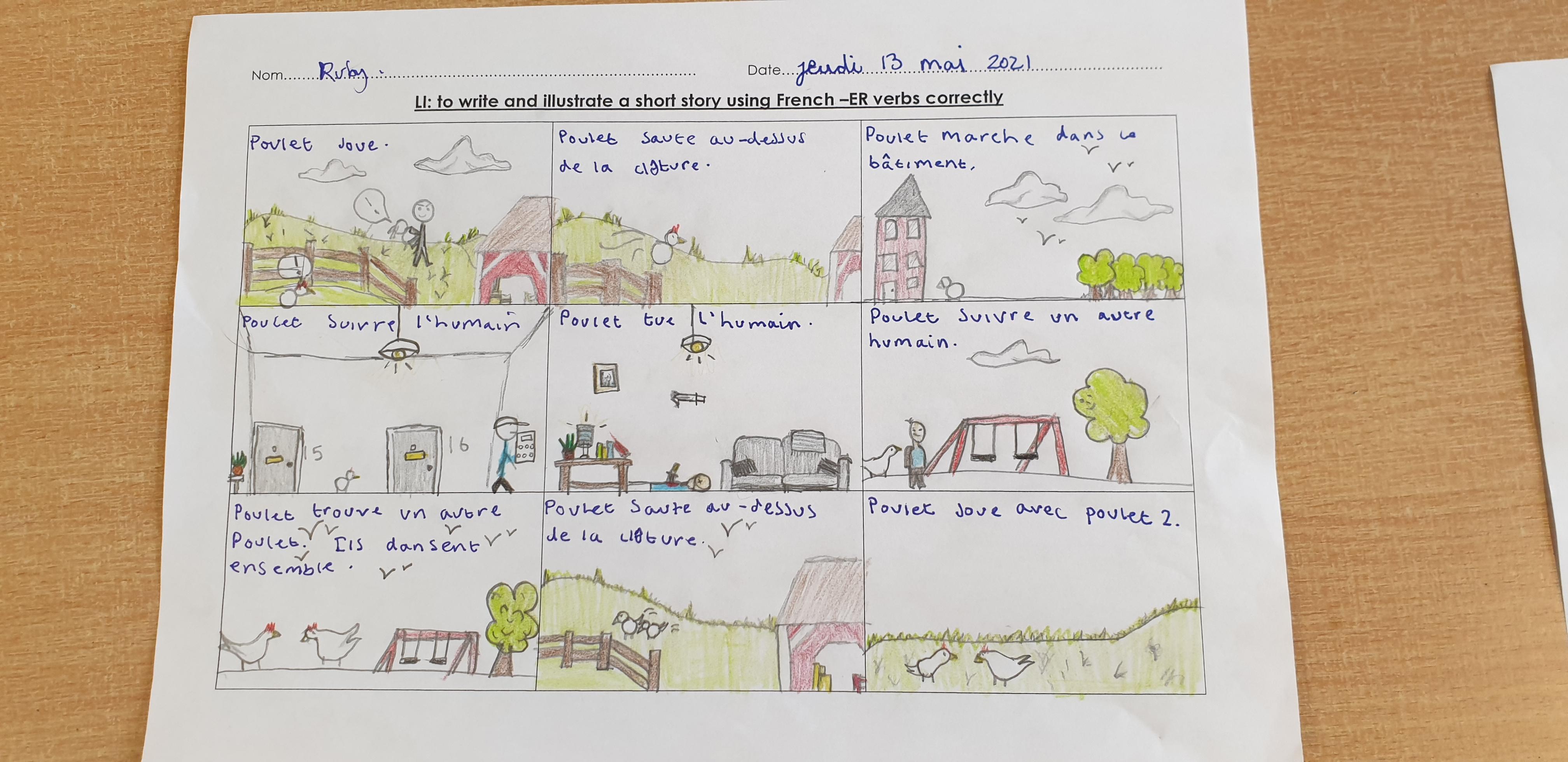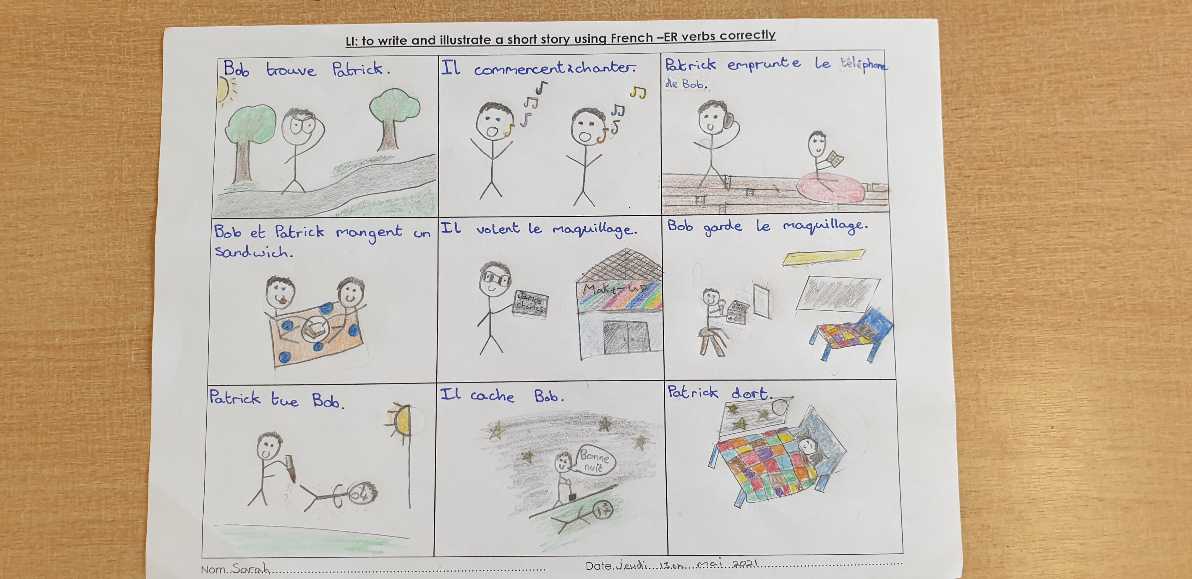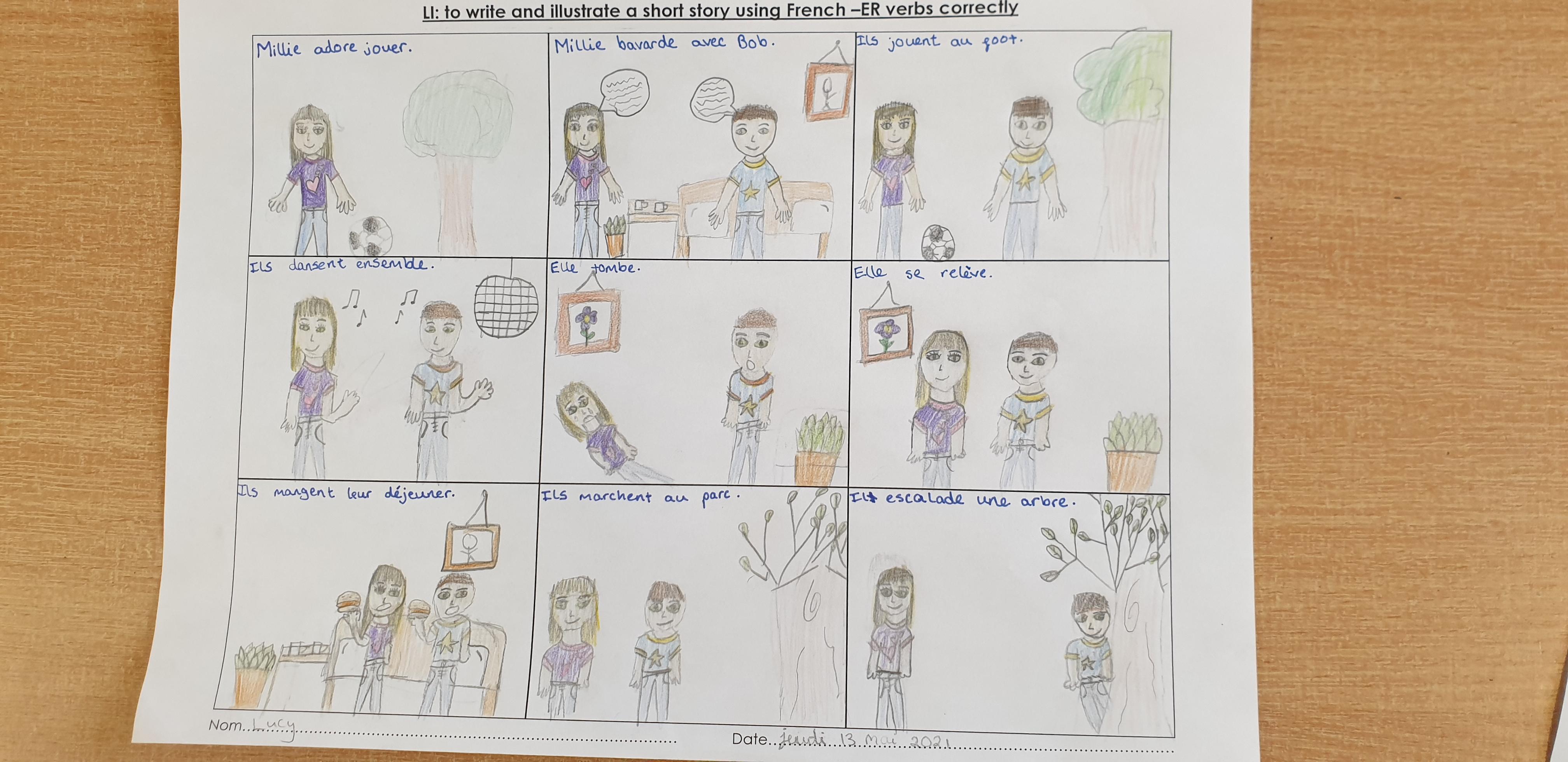 - In French, we completed our short stories using the present tense of -ER verbs. Some of our stories were quite dark, whilst others were very funny and they are all beautifully illustrated. See below for some examples. Again, all our work will be going on display in school. We also did some practice at using a bi-lingual dictionary correctly - especially finding the correct class of word and not using a noun in place of a verb and vice versa.