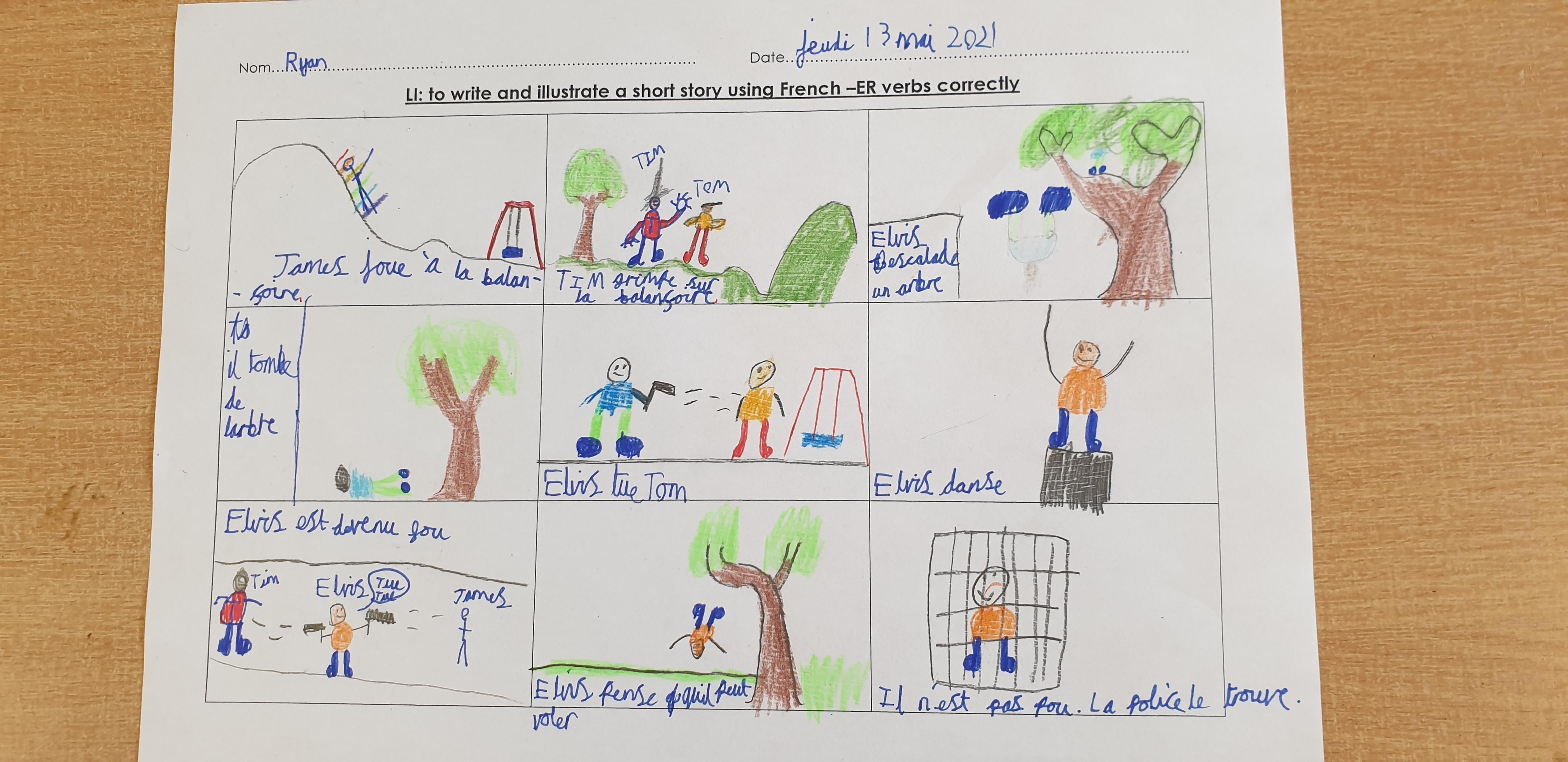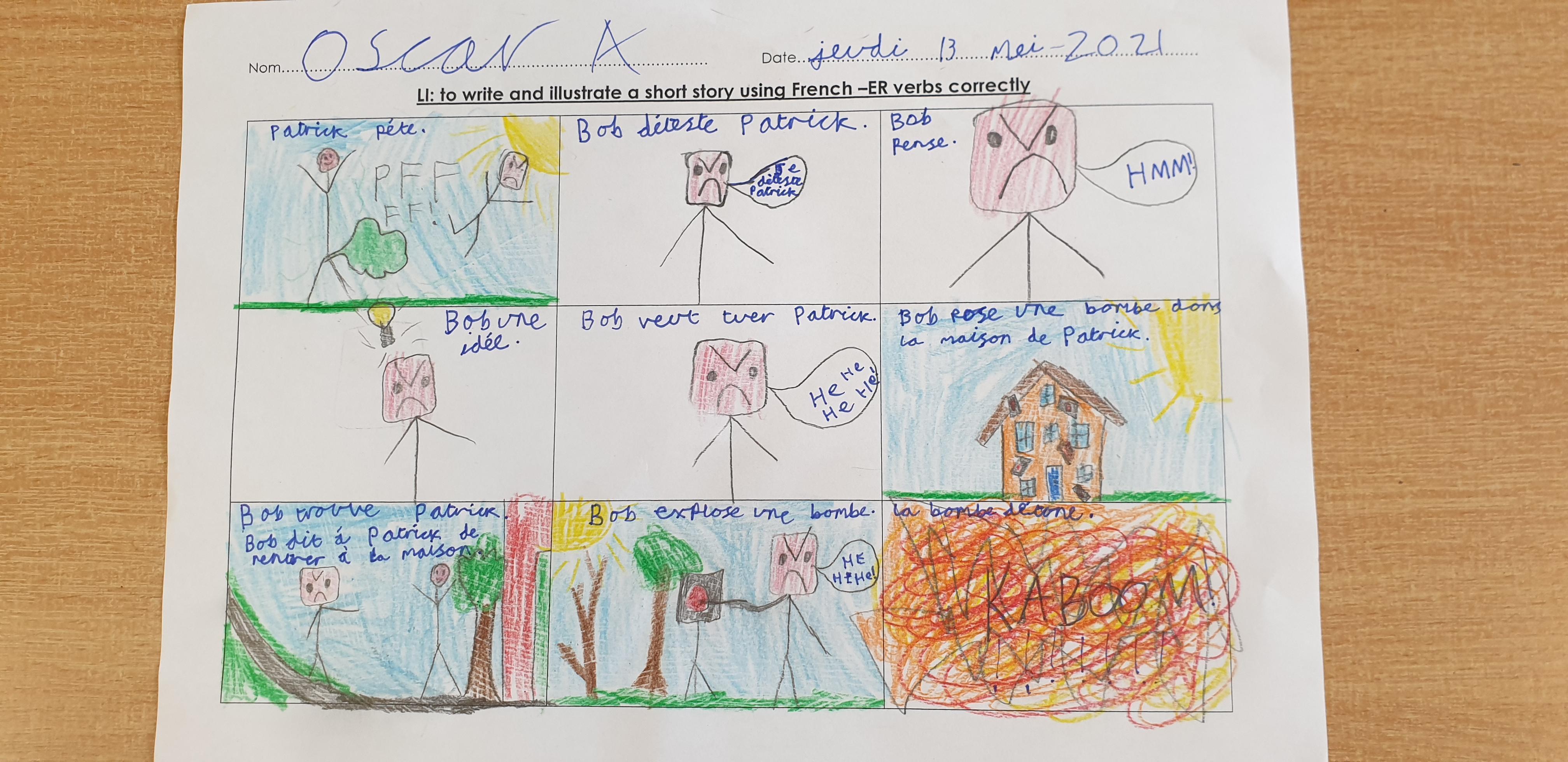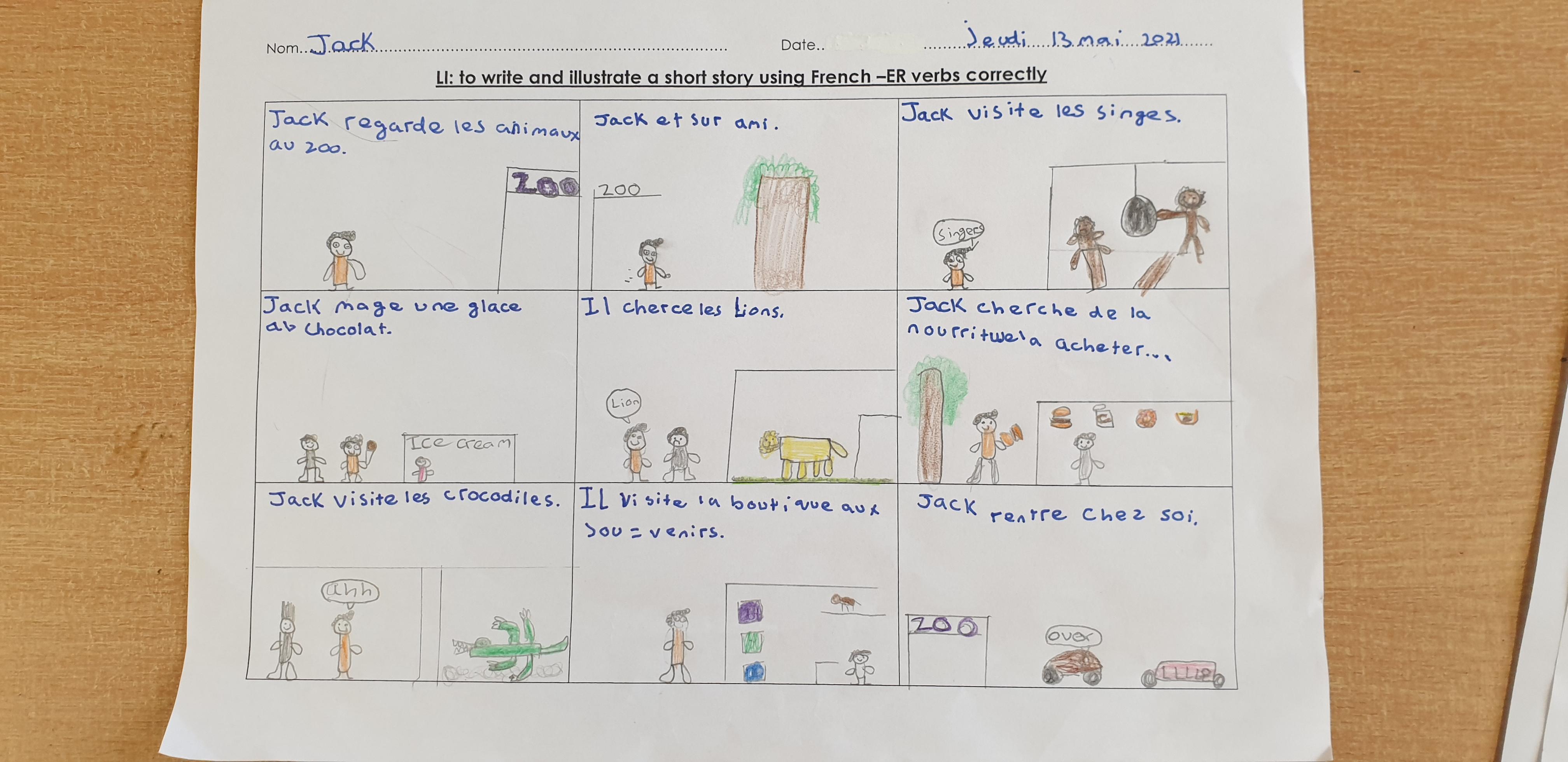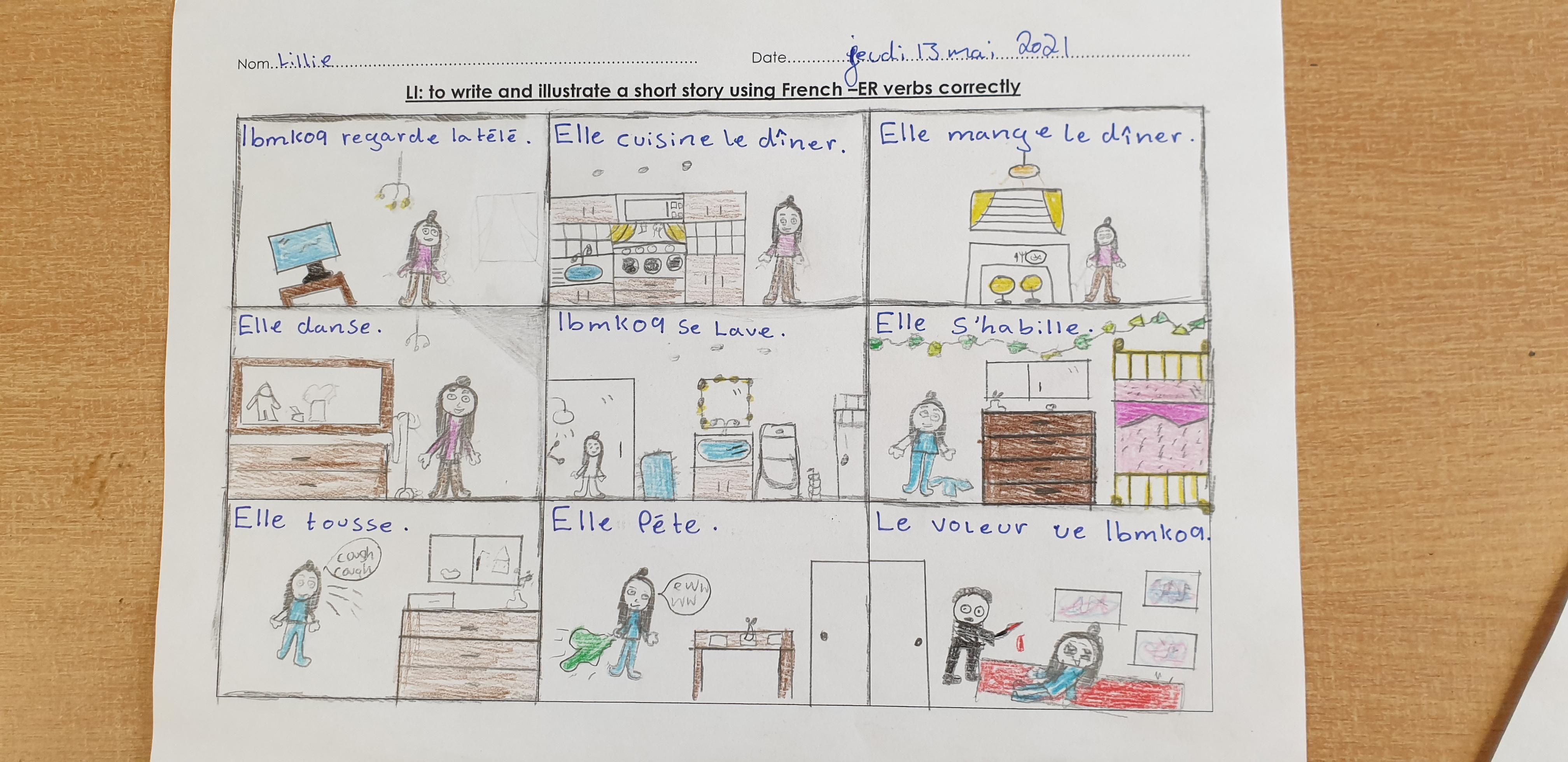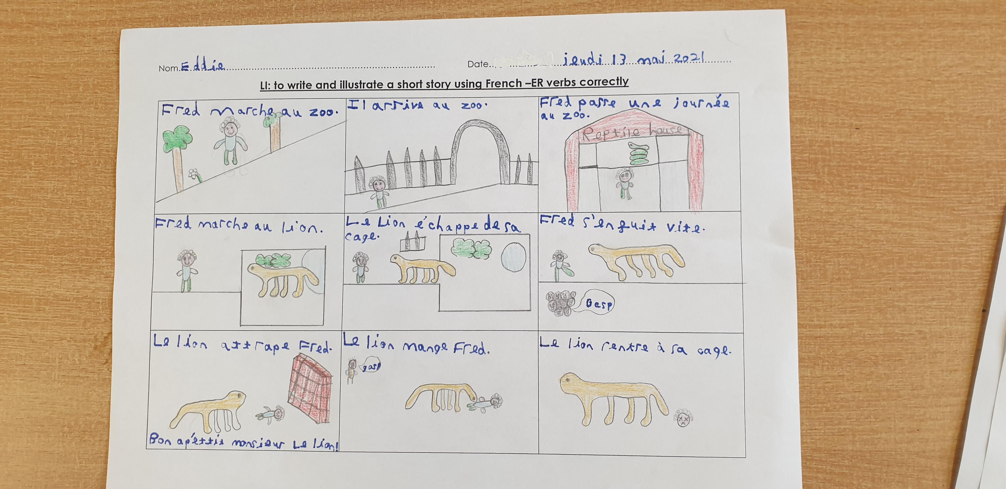 - In French, we completed our short stories using the present tense of -ER verbs. Some of our stories were quite dark, whilst others were very funny and they are all beautifully illustrated. See below for some examples. Again, all our work will be going on display in school. We also did some practice at using a bi-lingual dictionary correctly - especially finding the correct class of word and not using a noun in place of a verb and vice versa.