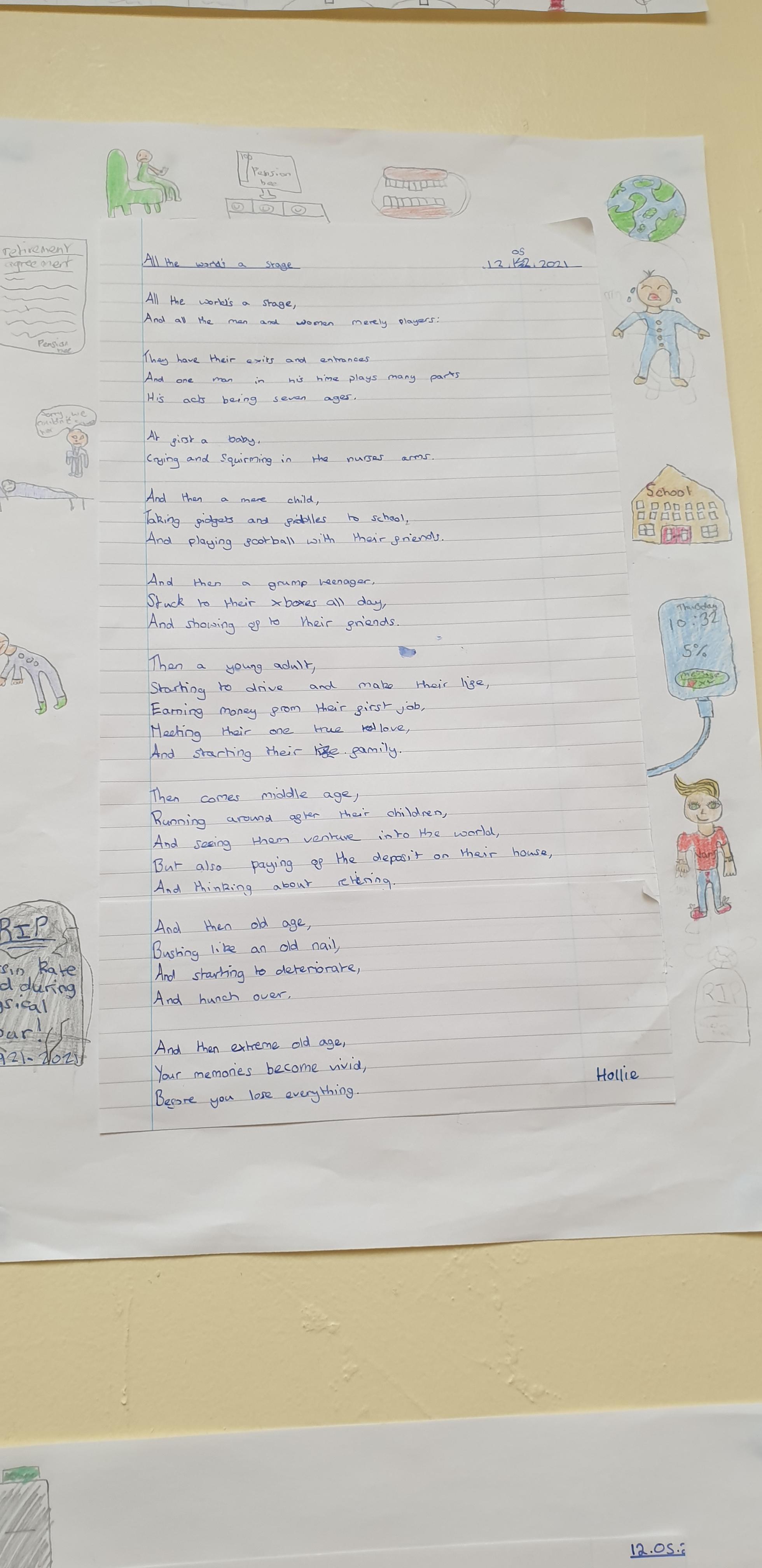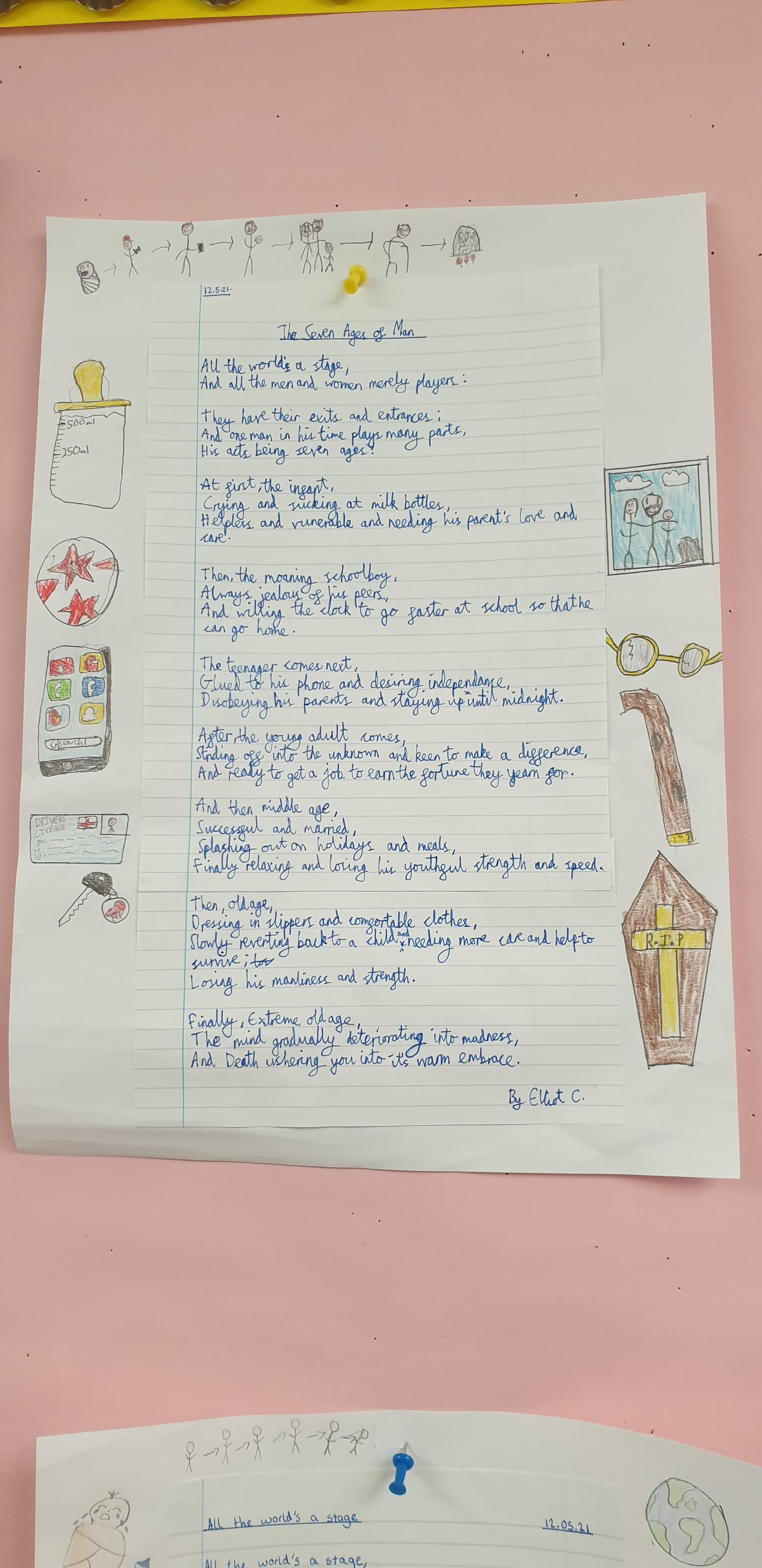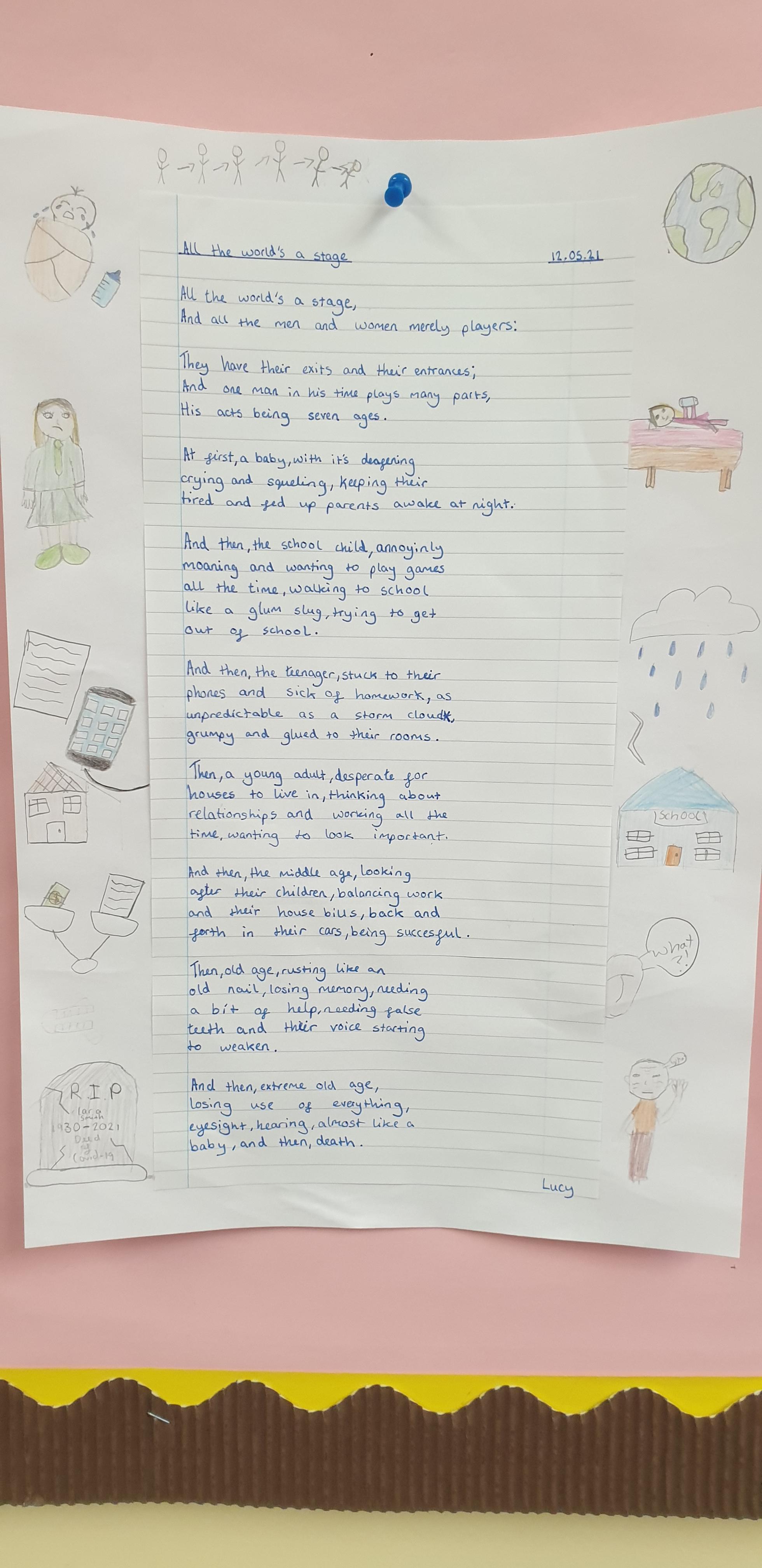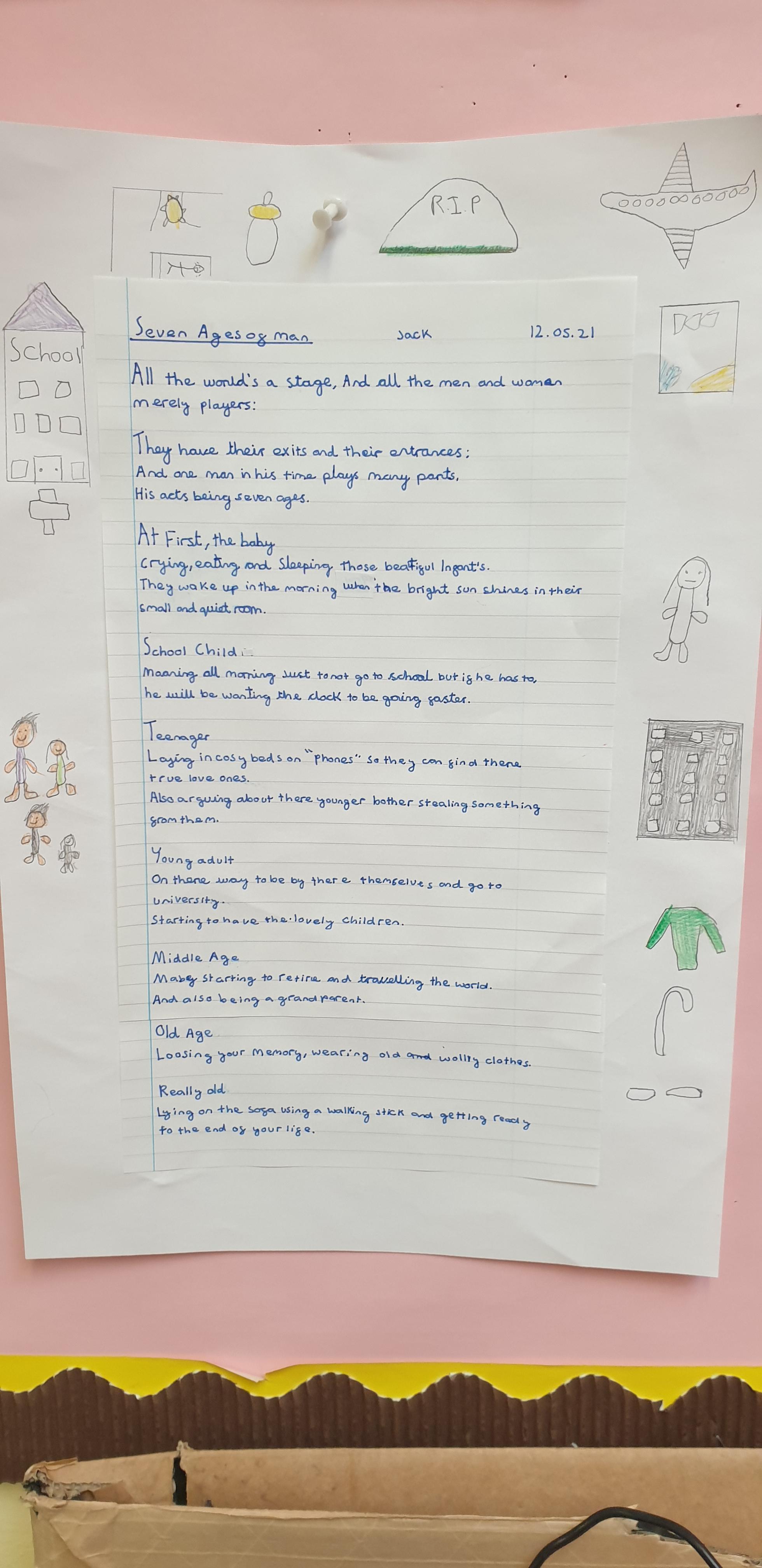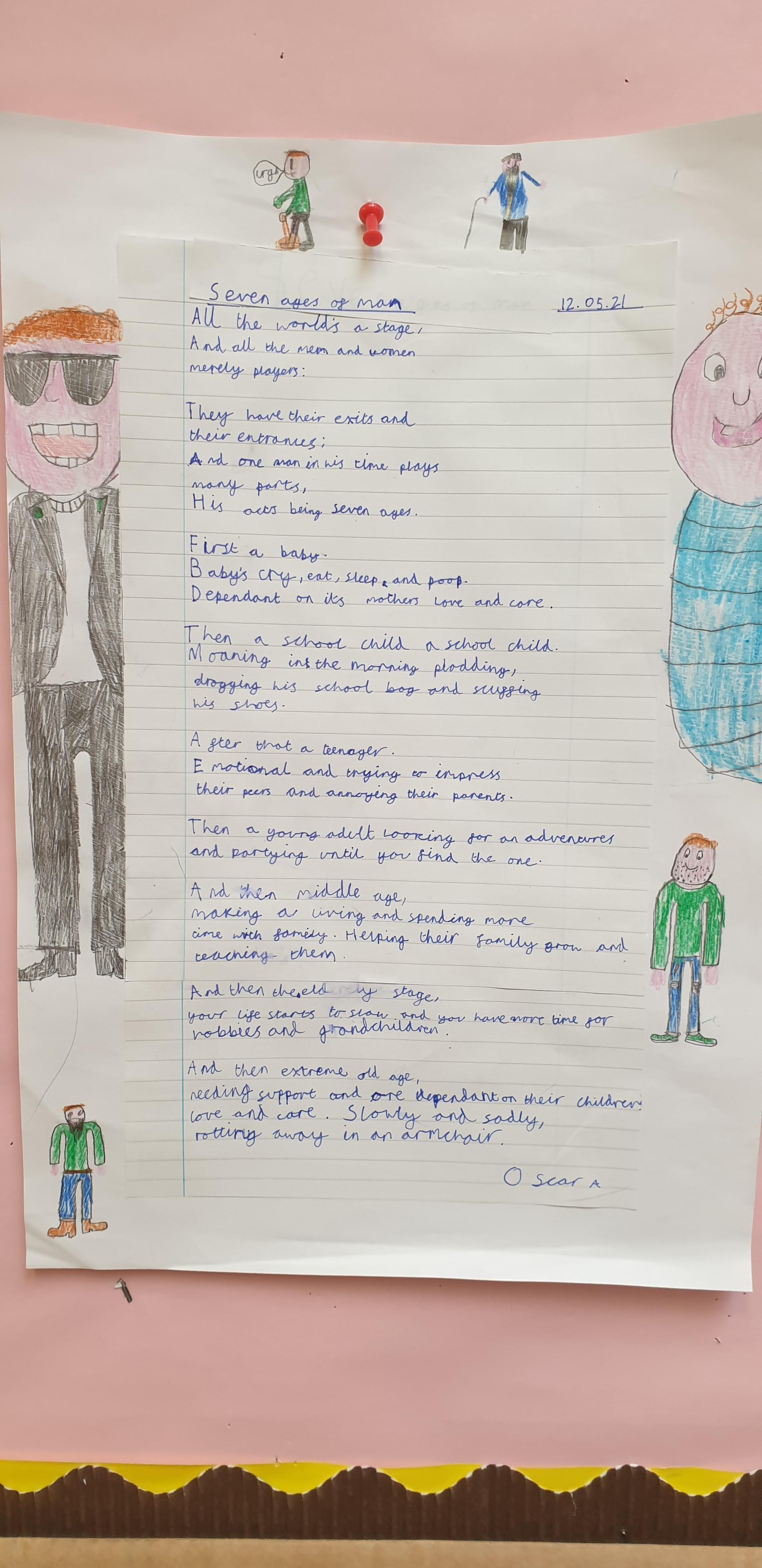- In Literacy, Mrs Short introduced us to Shakespeare's famous narrative poem, 'The seven Ages of Man (also known as 'All The World's a Stage'), delivered as a monologue by Jaques in the play 'As You Like it'. After discussing the meaning of each part, we then wrote and illustrated our own modern versions of this poem. There were some really super pieces of work produced and everyone's poem is now on display in class. A selection can also be seen below.
