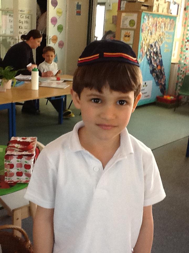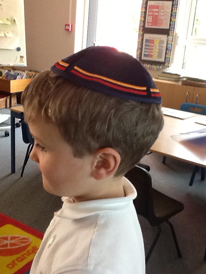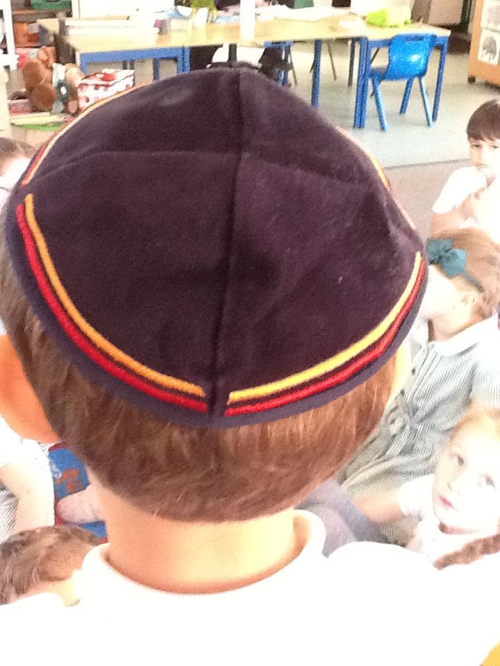 The boys tried wearing the Jewish skullcap, called a Kippah.
