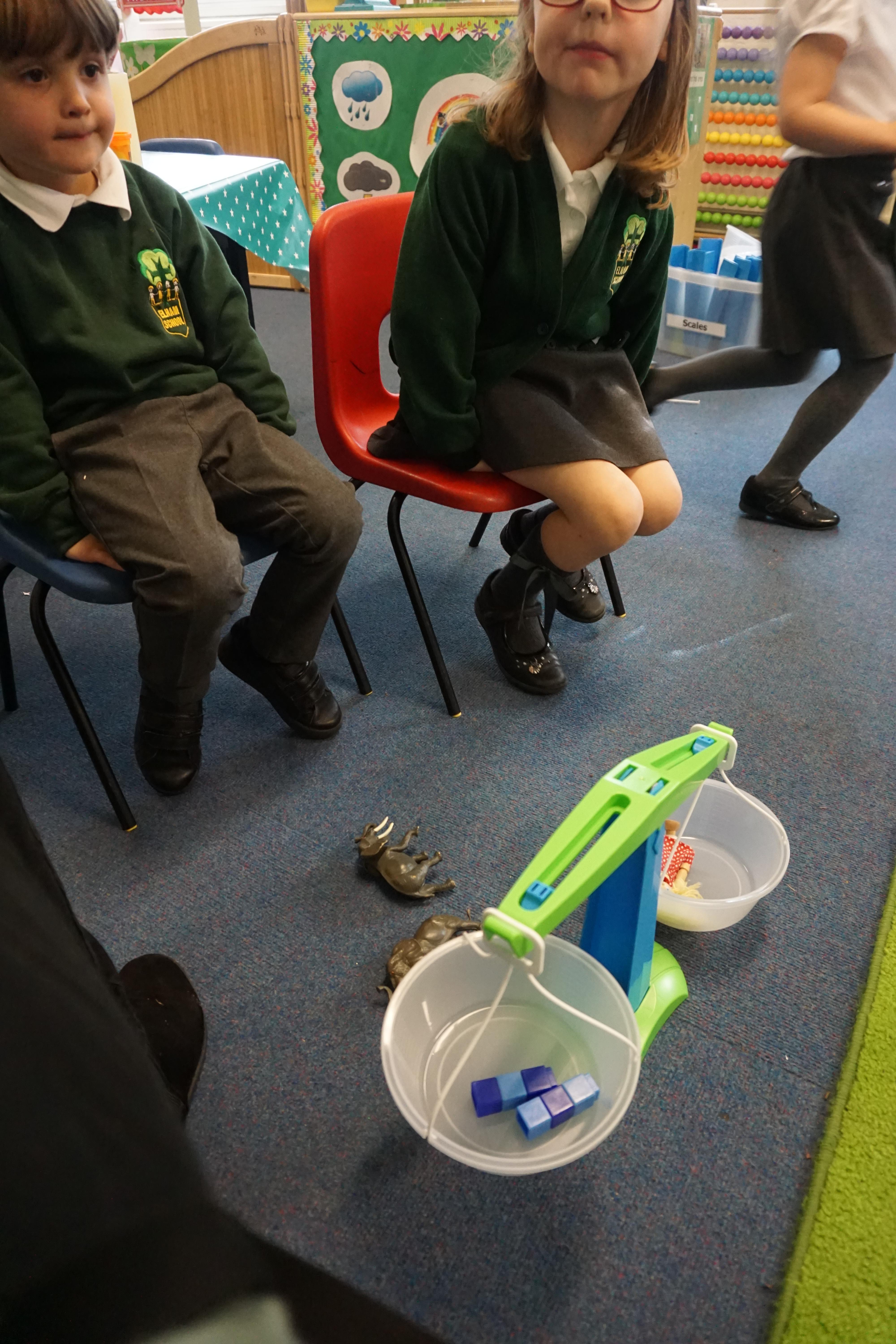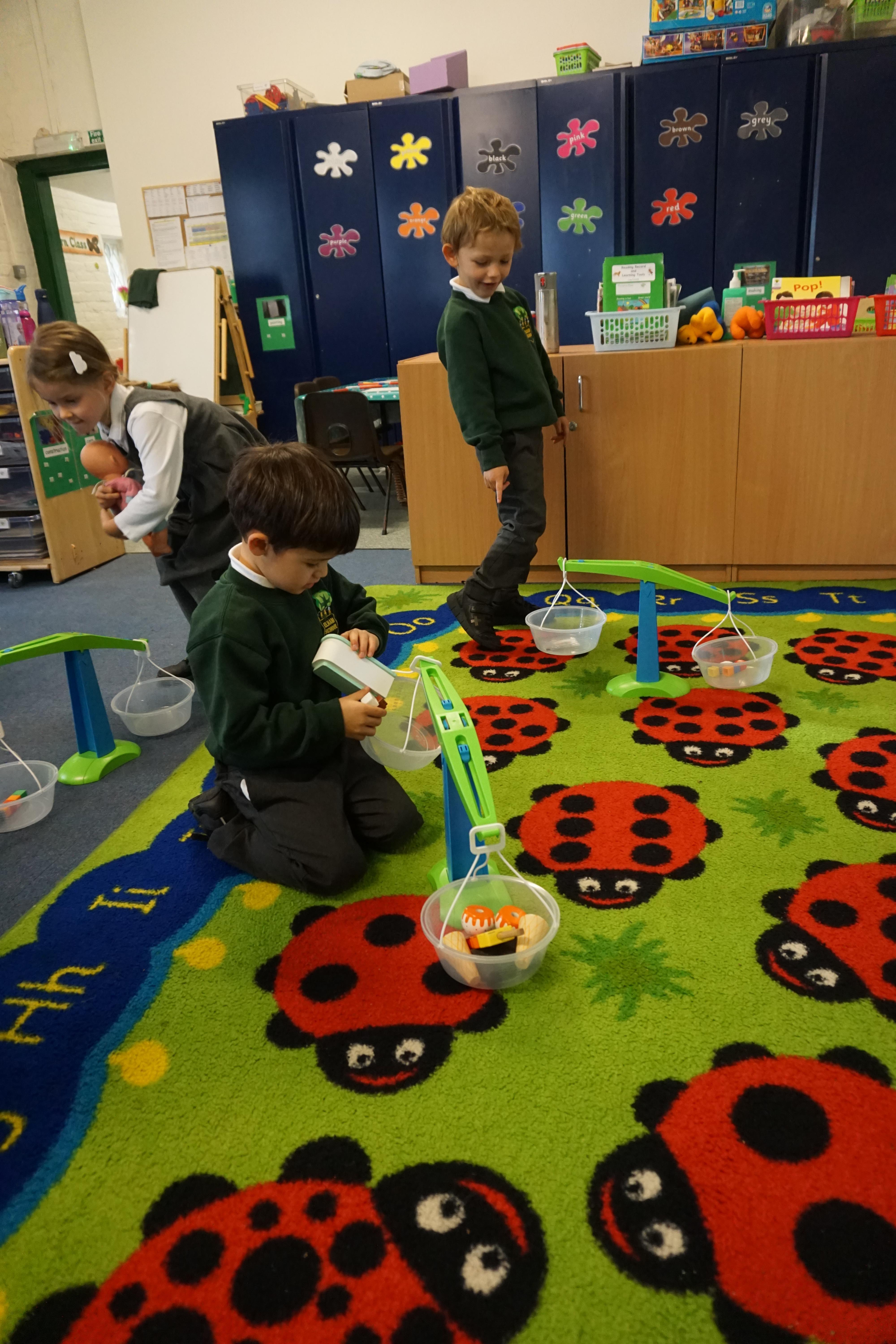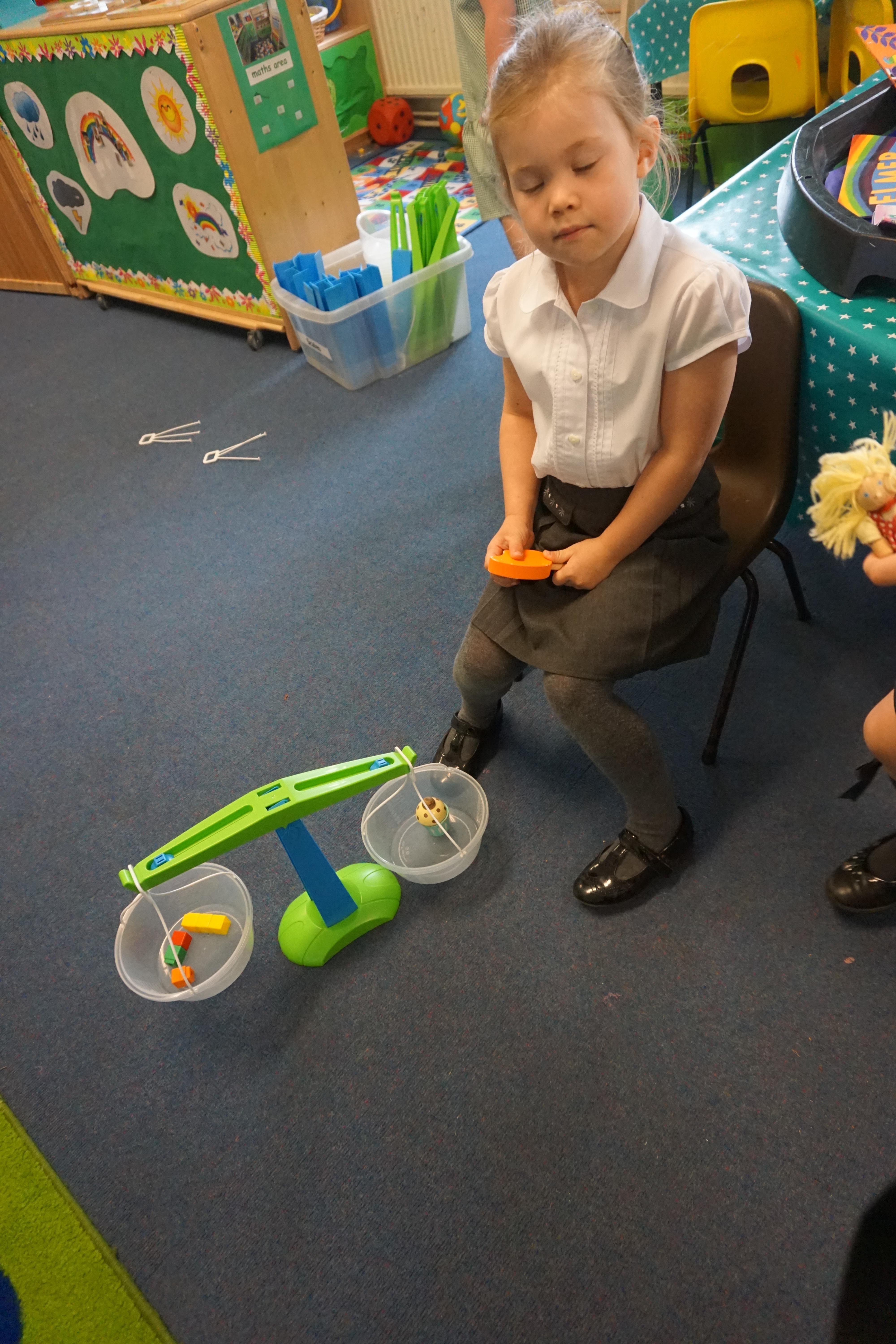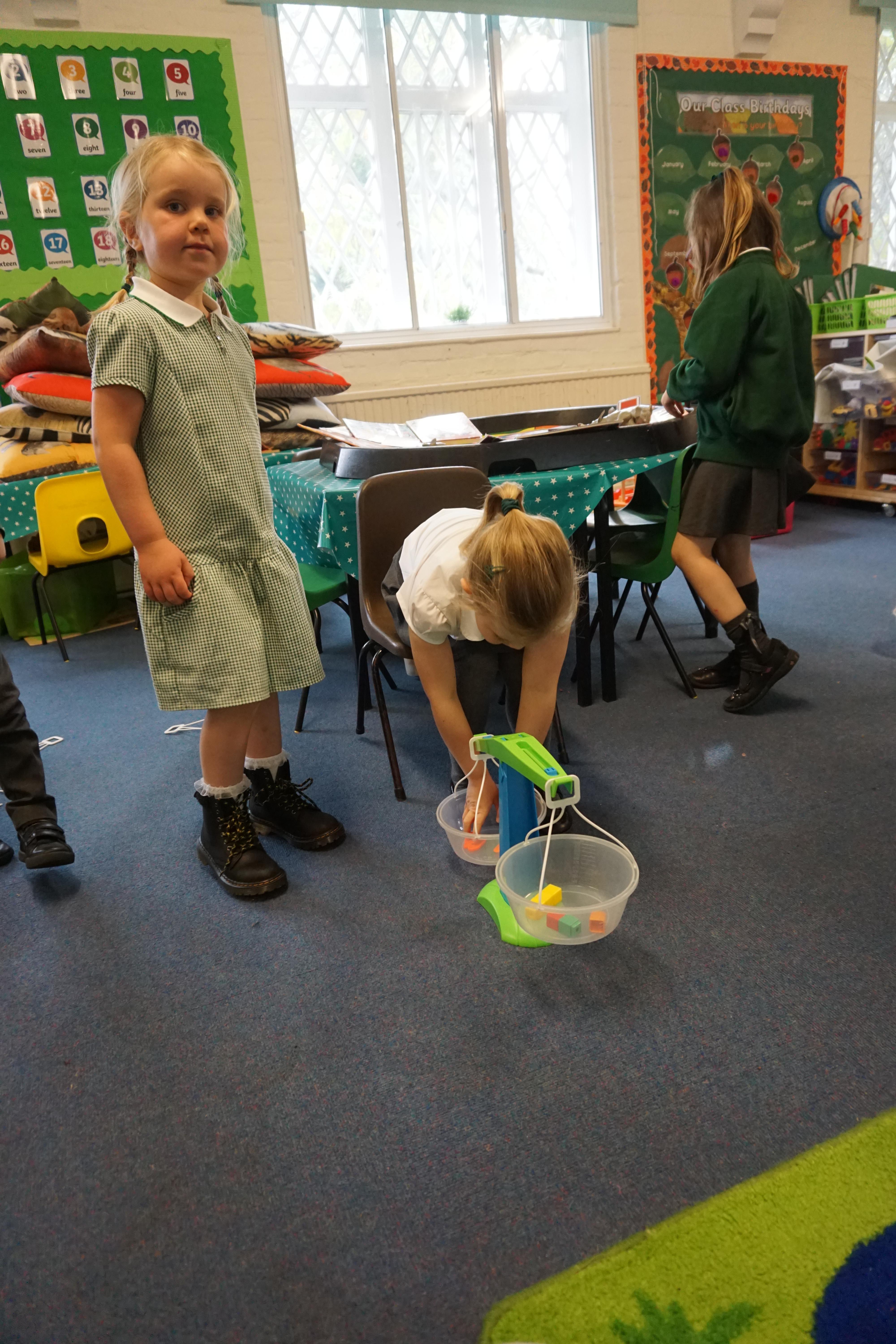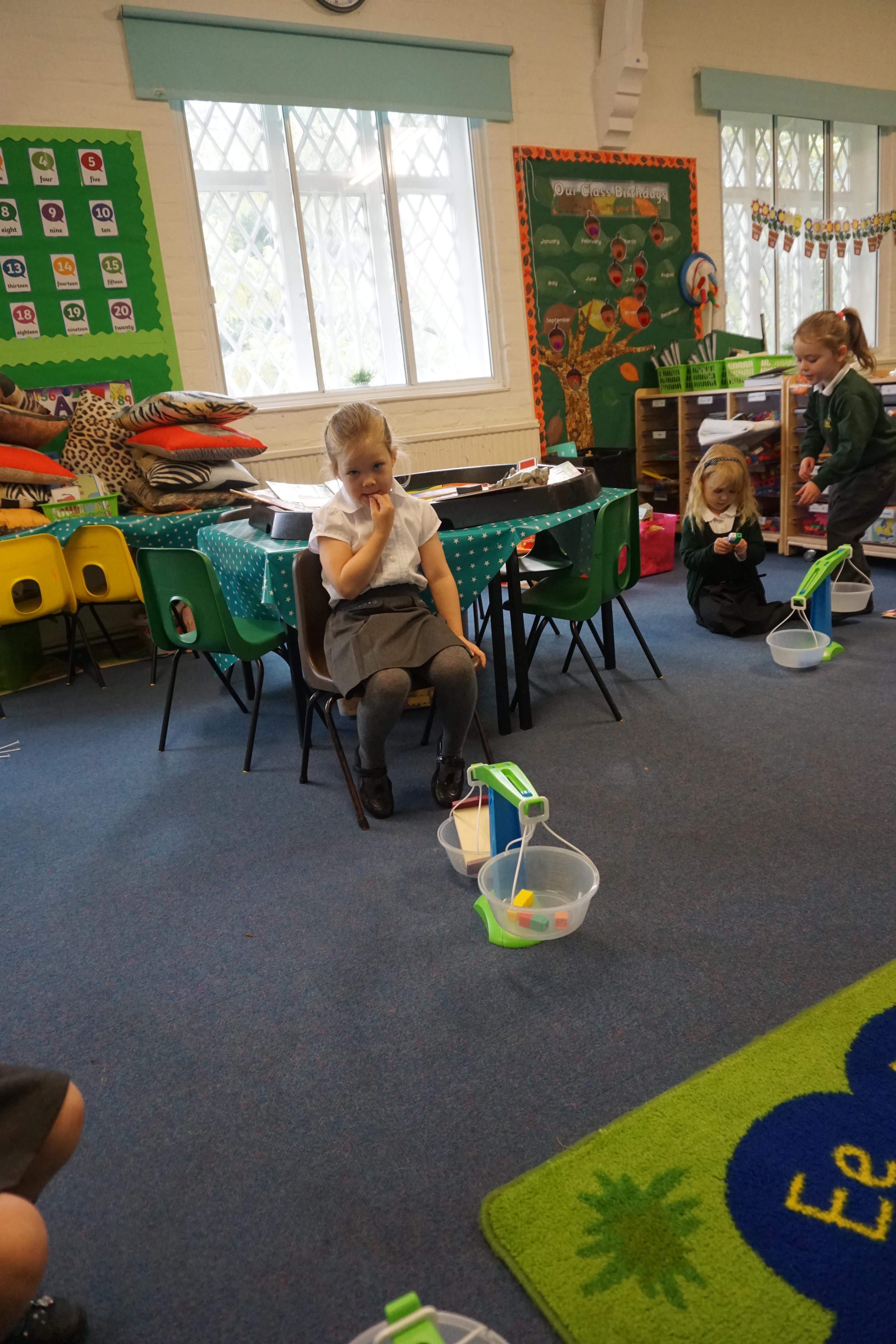 In our maths we looked for objects longer and shorter and got the scales out and did some weighing thinking about the language we should use.