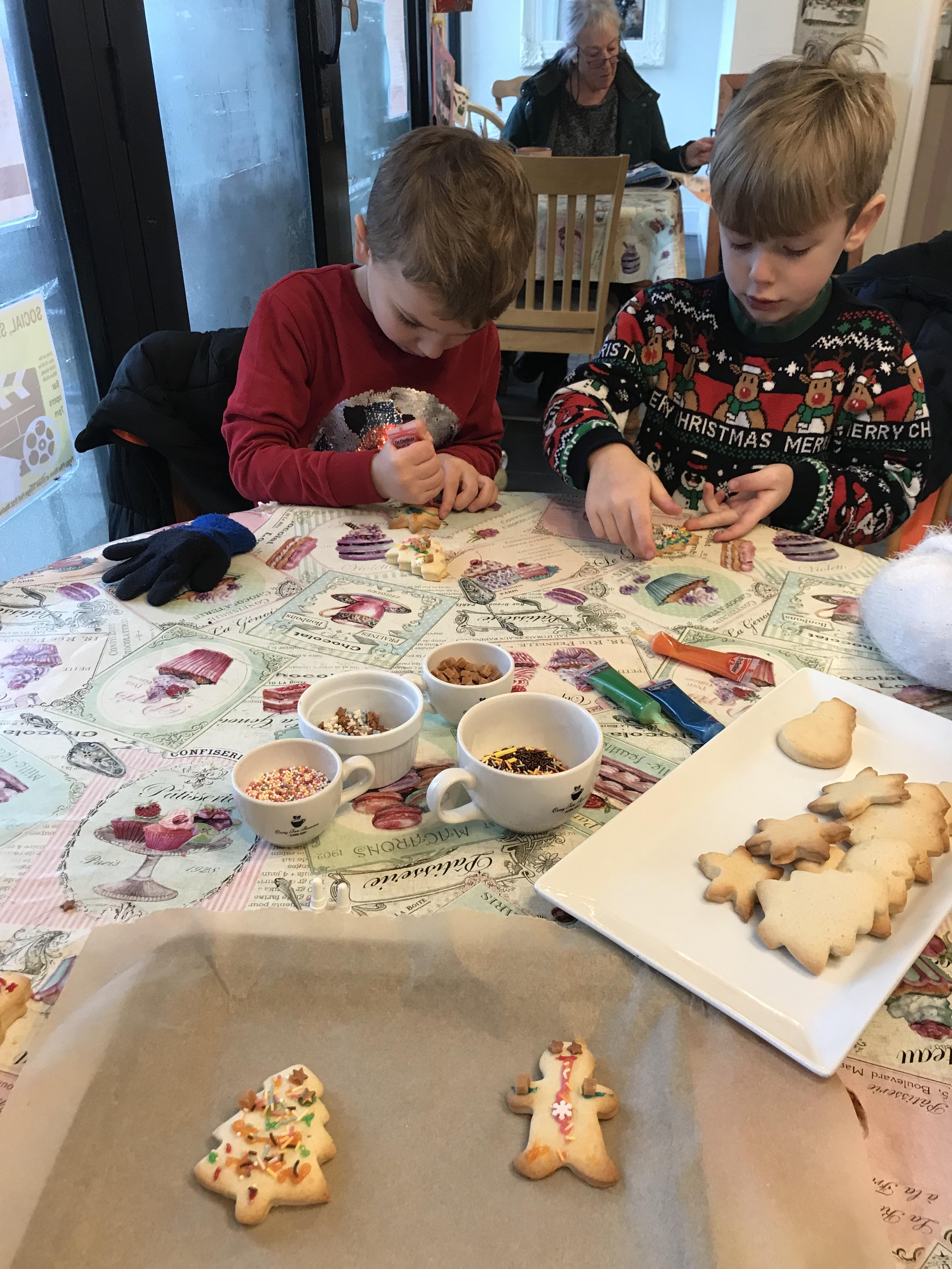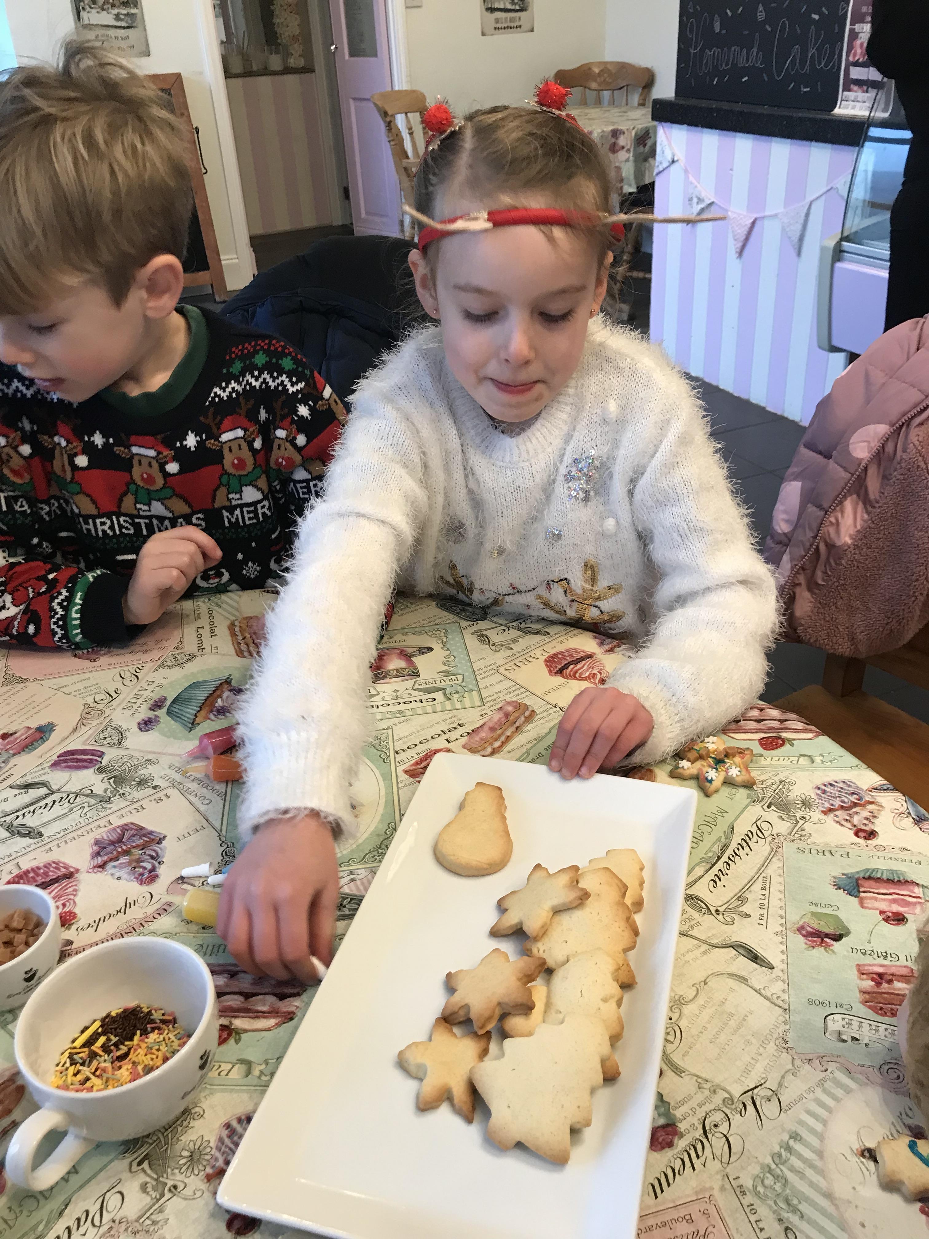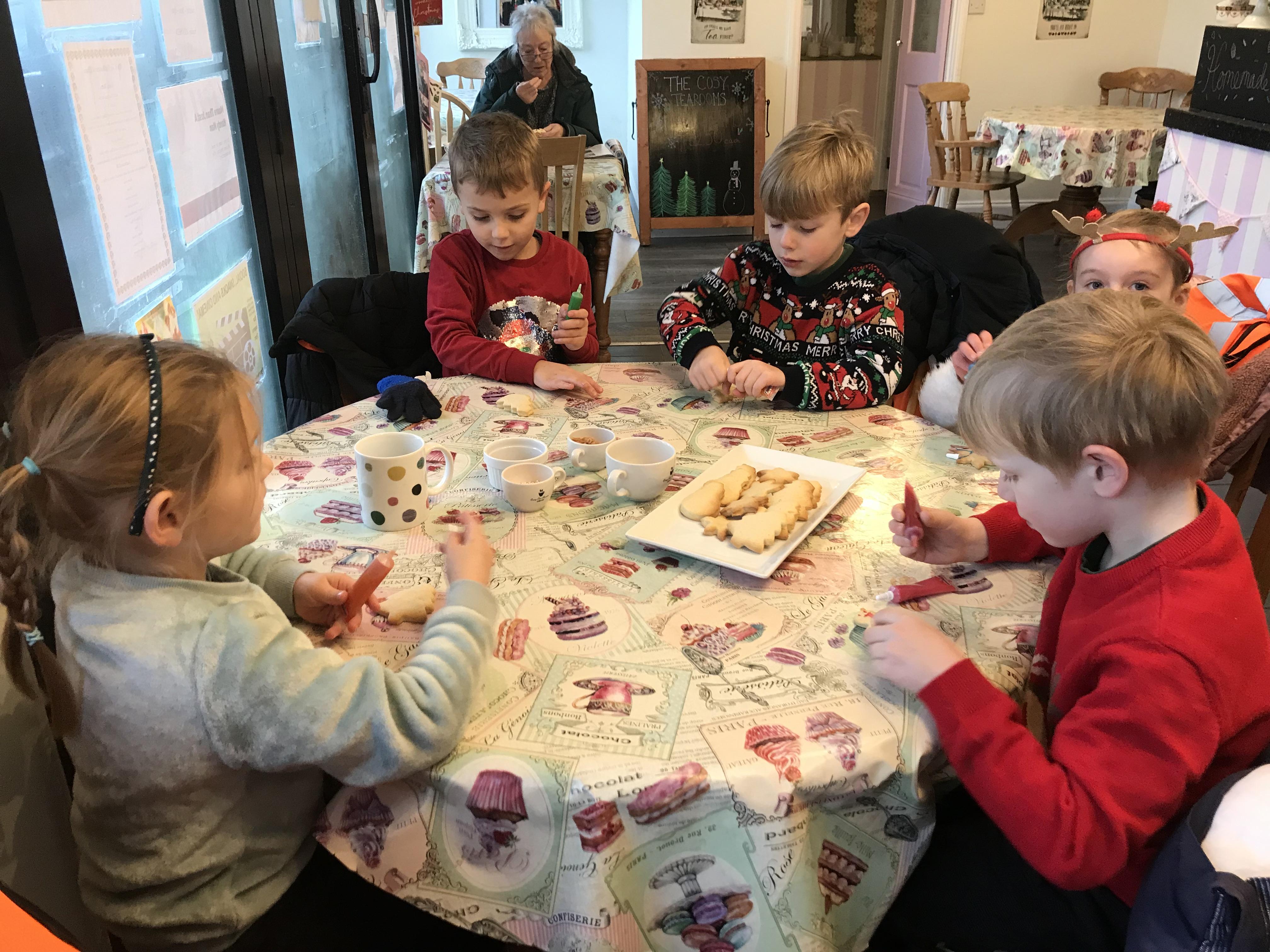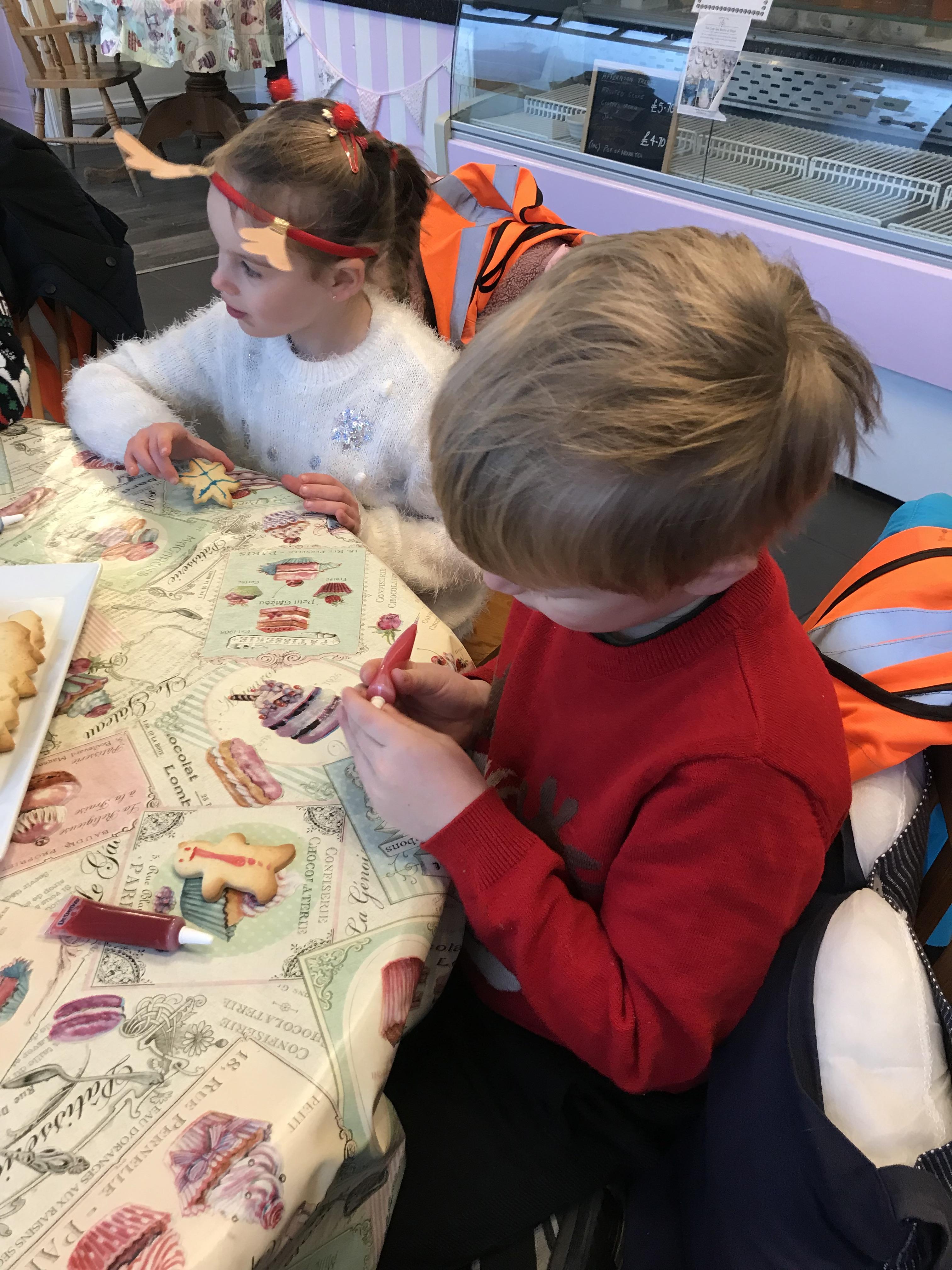 We went around the village after our Christmas lunch looking for 'signs of Christmas, (part of our RE programme). Surprise, surprise we ended up in the Cosy Tea Rooms and had a lovely time icing and decorating biscuits and drinking hot chocolate.