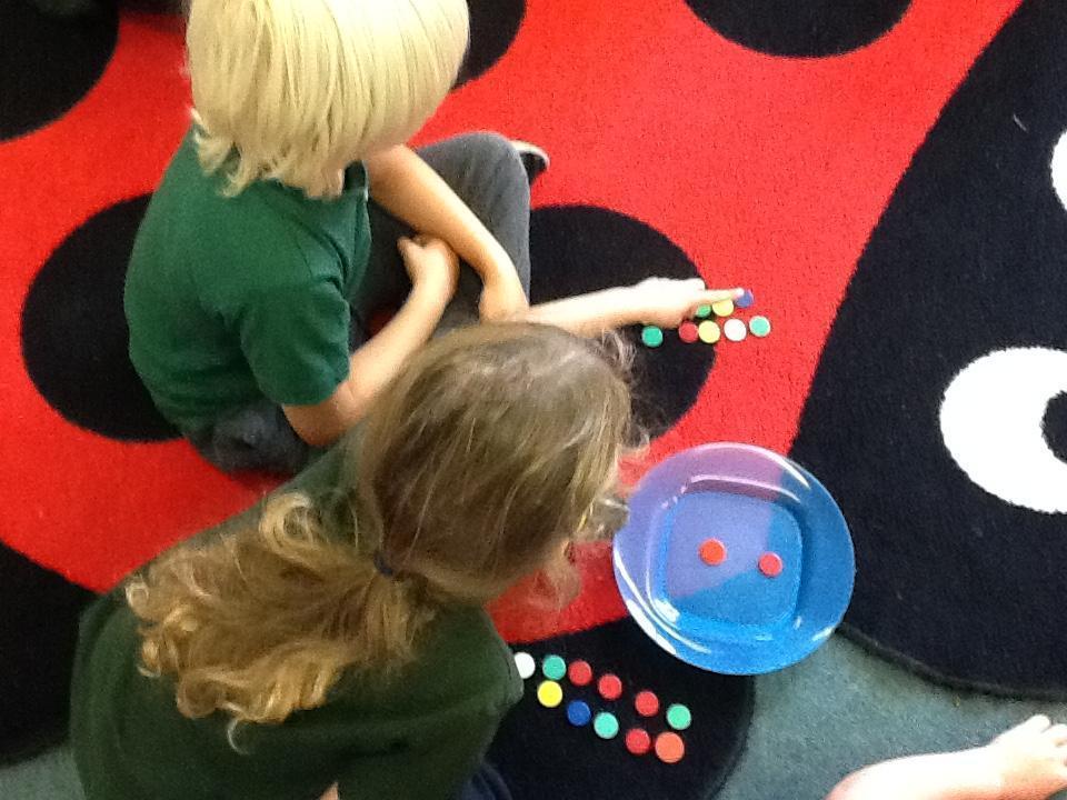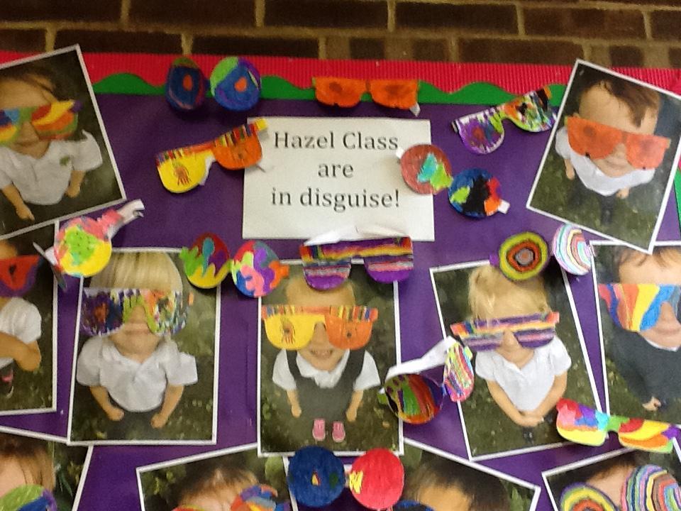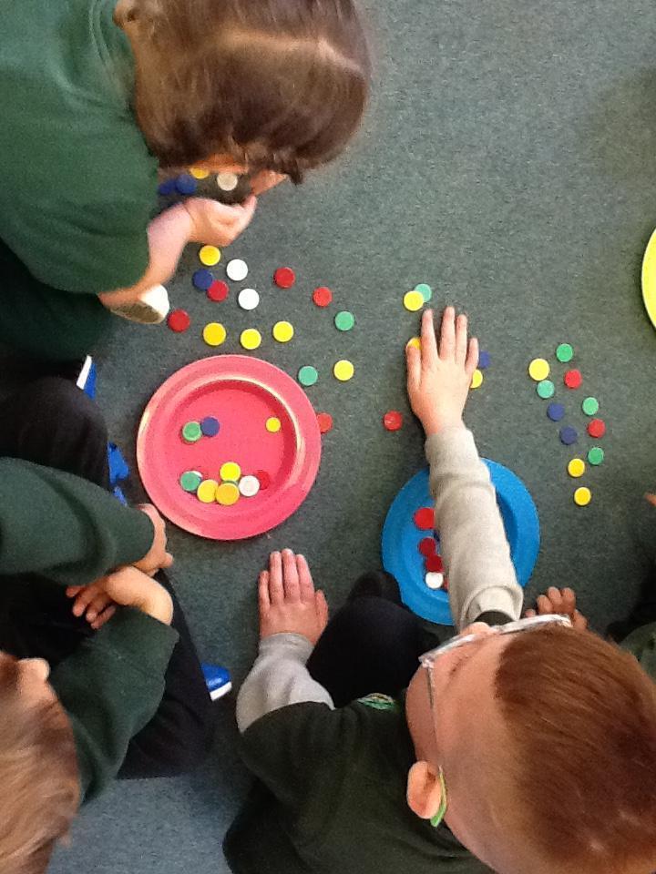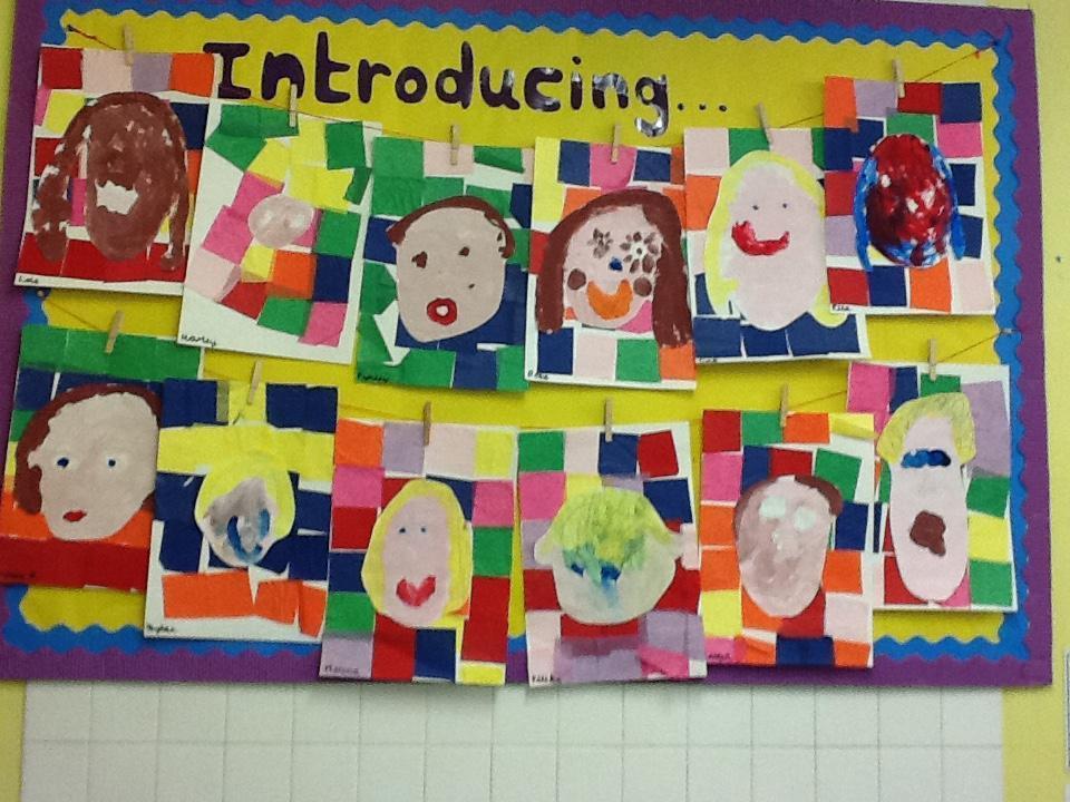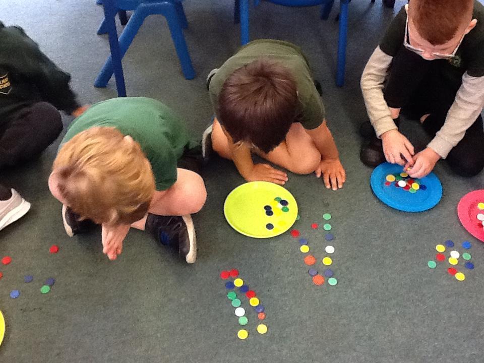 The children are continuing to make repeating patterns by threading bottle tops for our bottle top door curtain. We already have 6 completed threads! Also take a look at some of the displays we have up in class of your children and their art work.