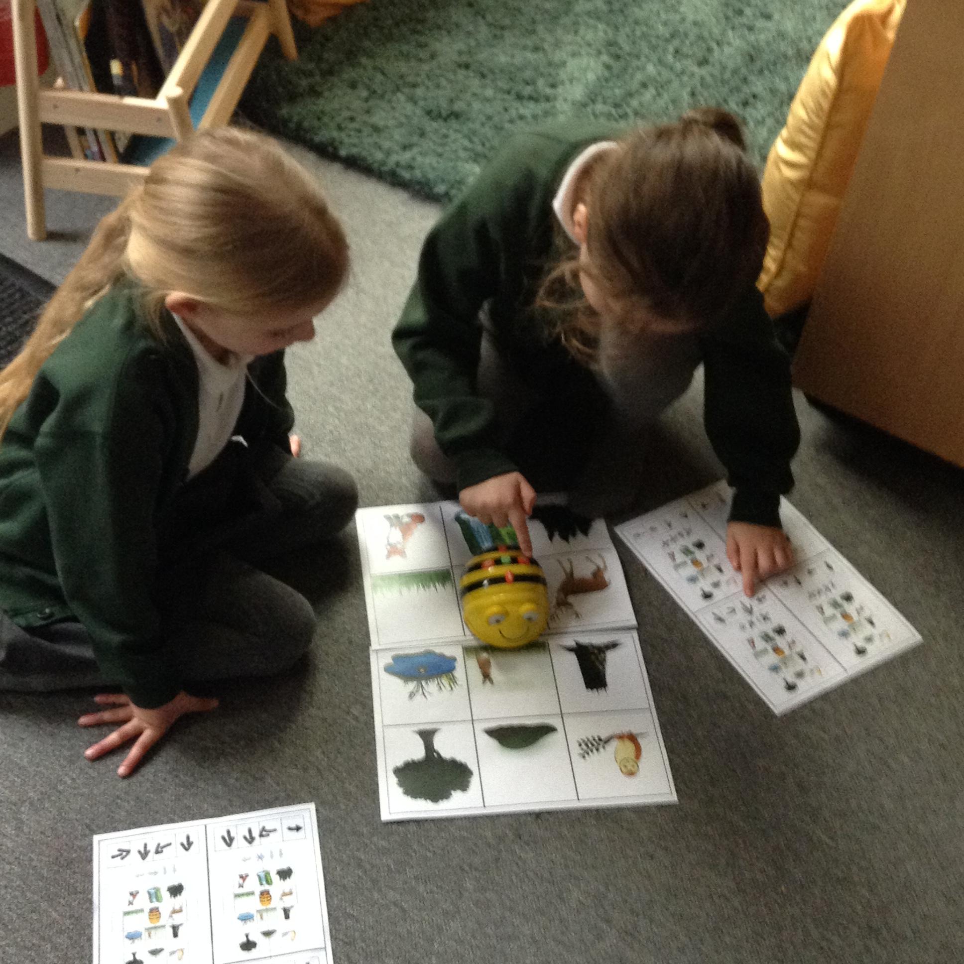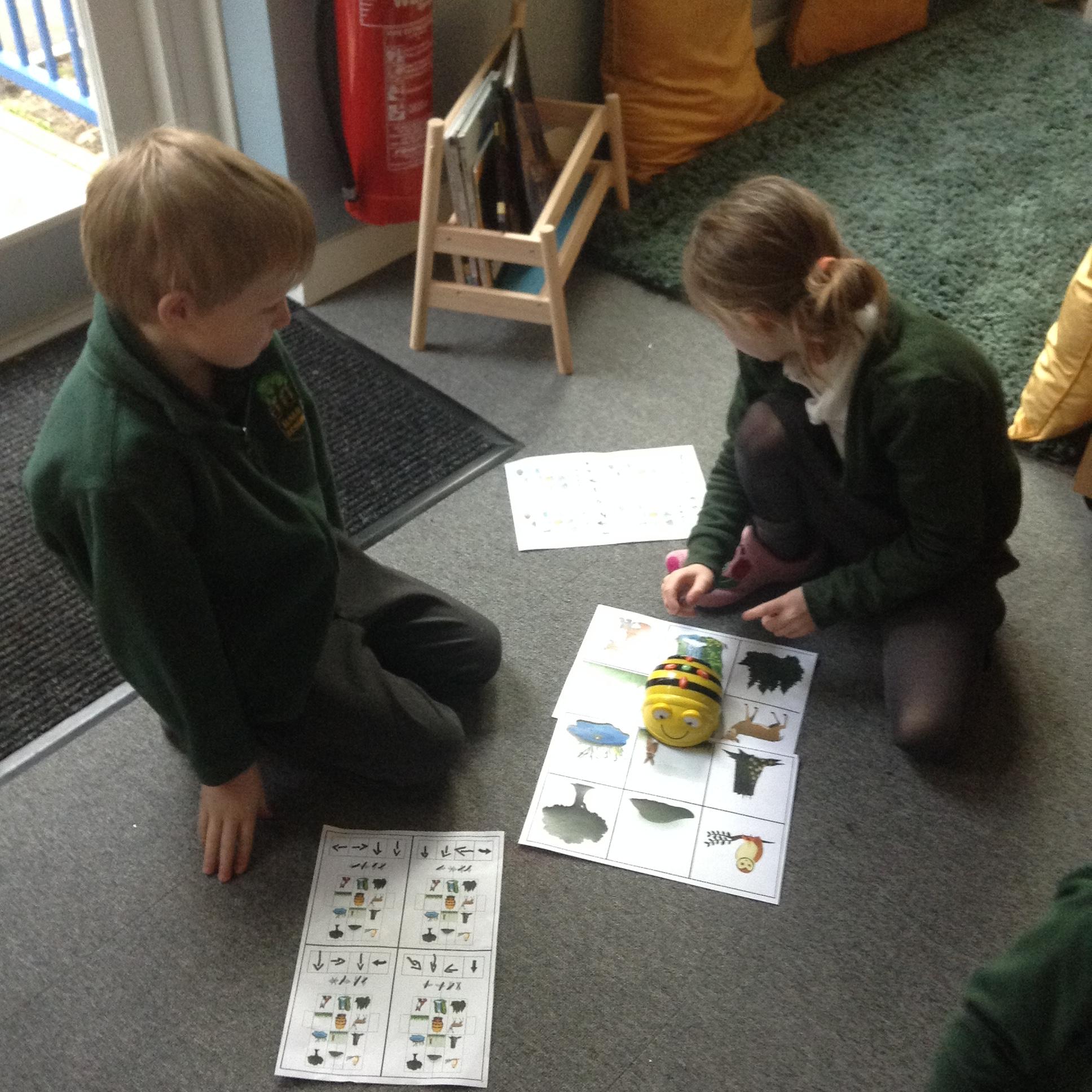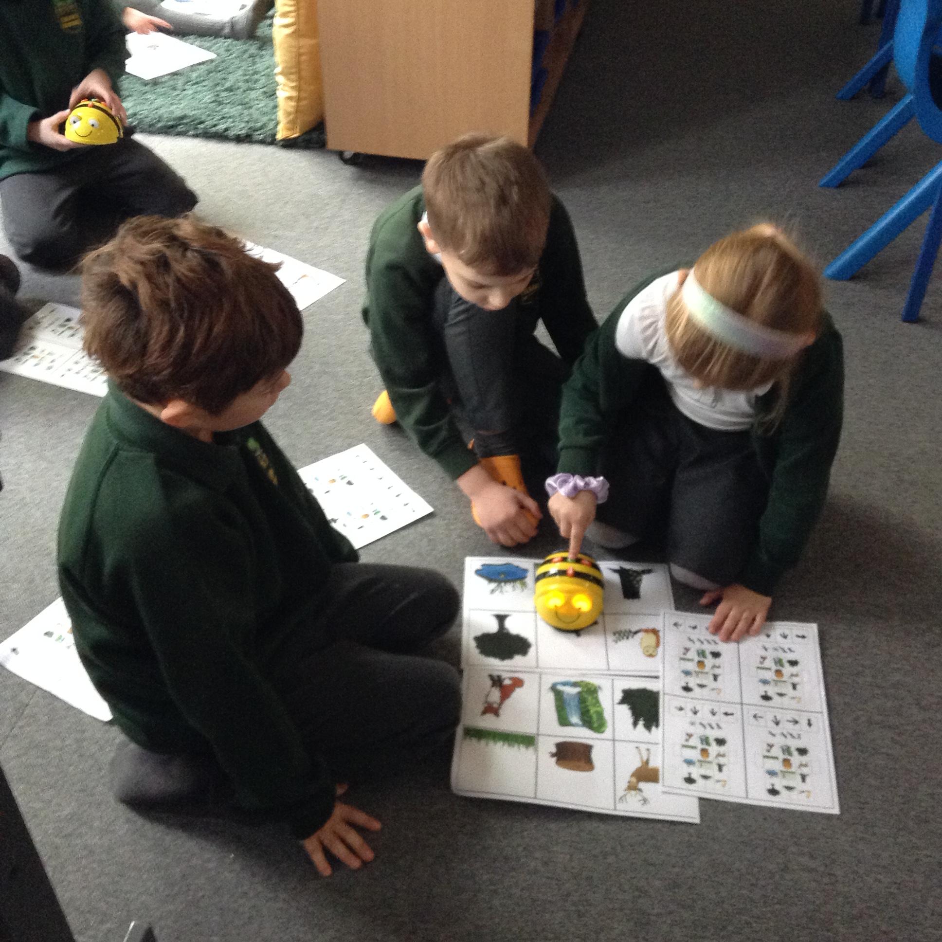 The children have been using an algorithm to program a sequence on a floor robot.
