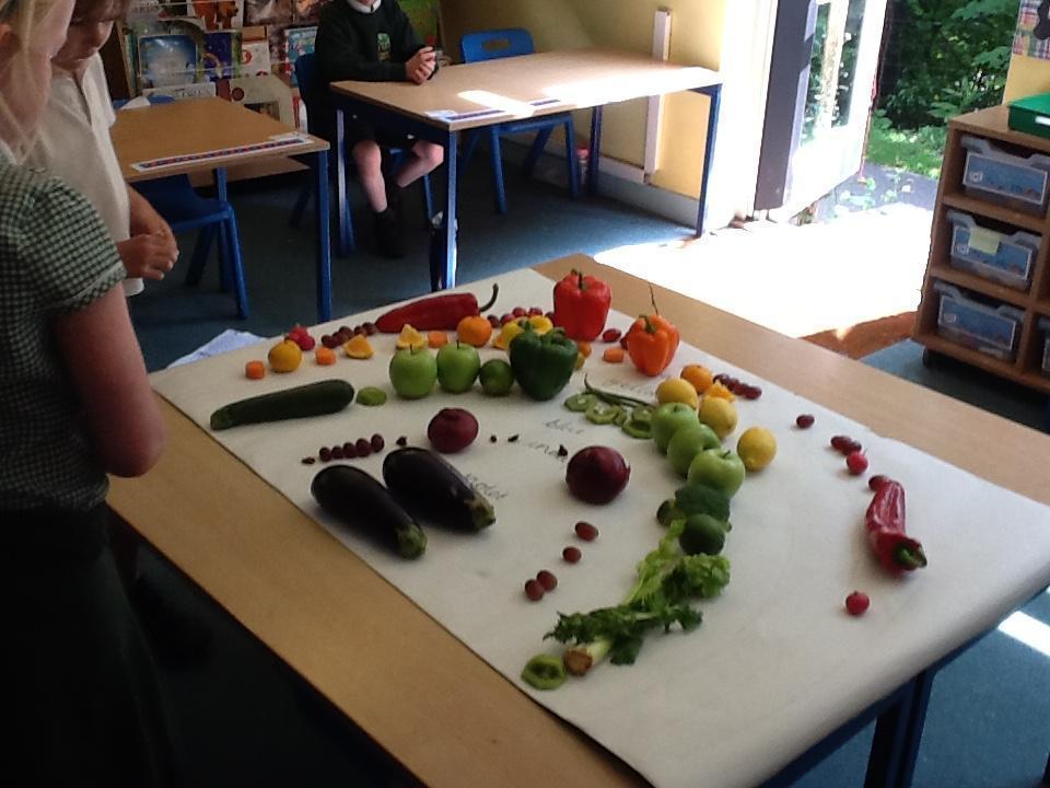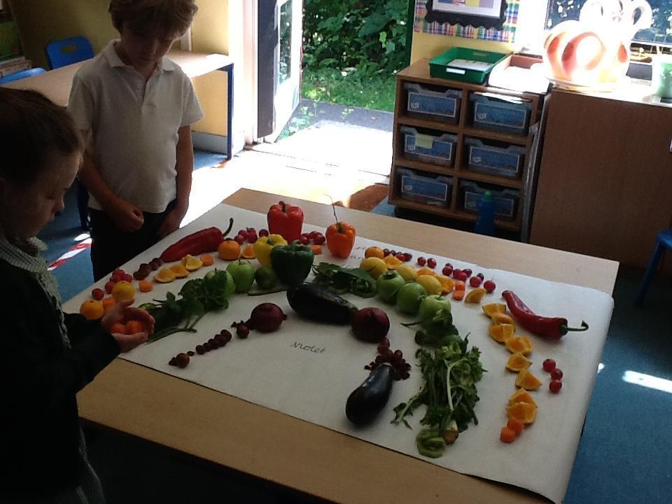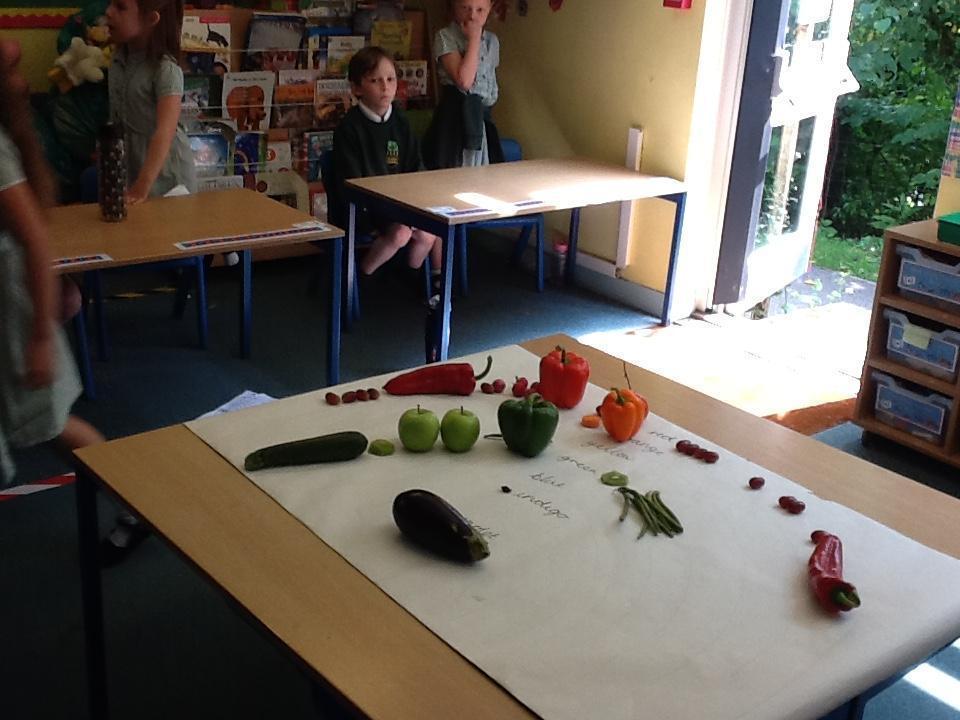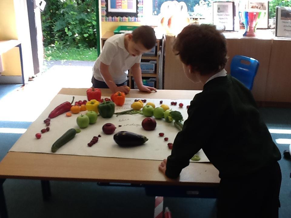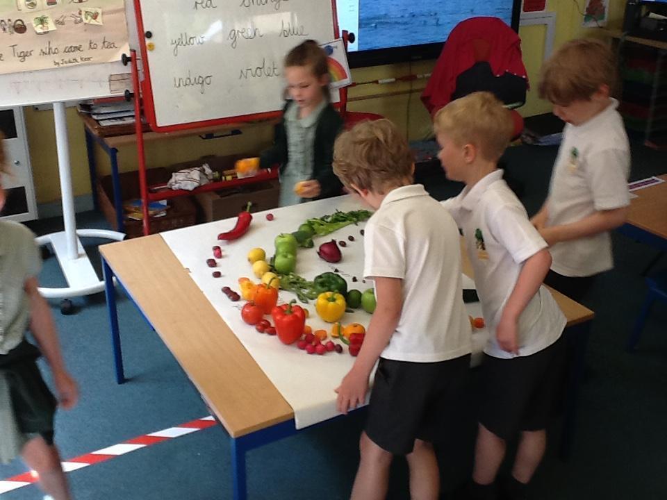 Today, in preparation for our literacy, we have had a rainbow themed day. The children painted their own, using fine brushes with great precision, then we made a rainbow from healthy fruit and veg and talked about the number of ingredients less healthy foods have. There was no blue fruit or veg. We looked at some blue sweets and did a tally of the number of ingredients they had in them...15 in total! We decided healthy food has fewer ingredients and that usually we recognise the names of the ingredients.