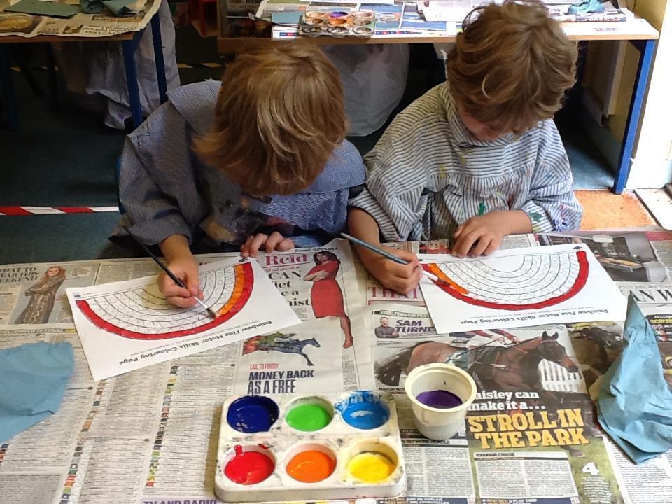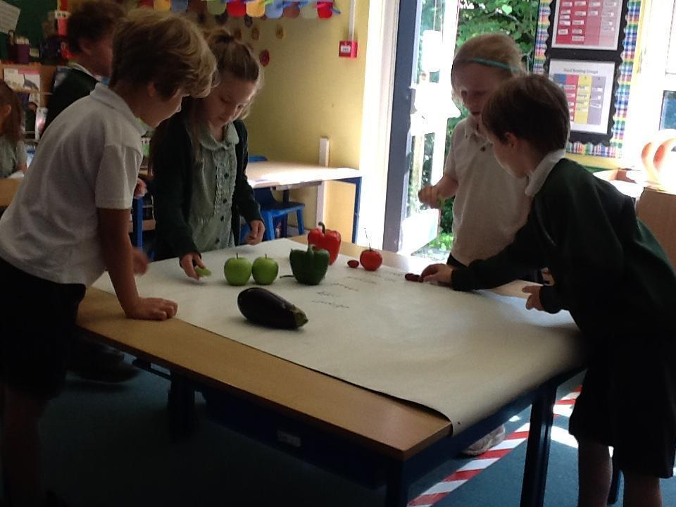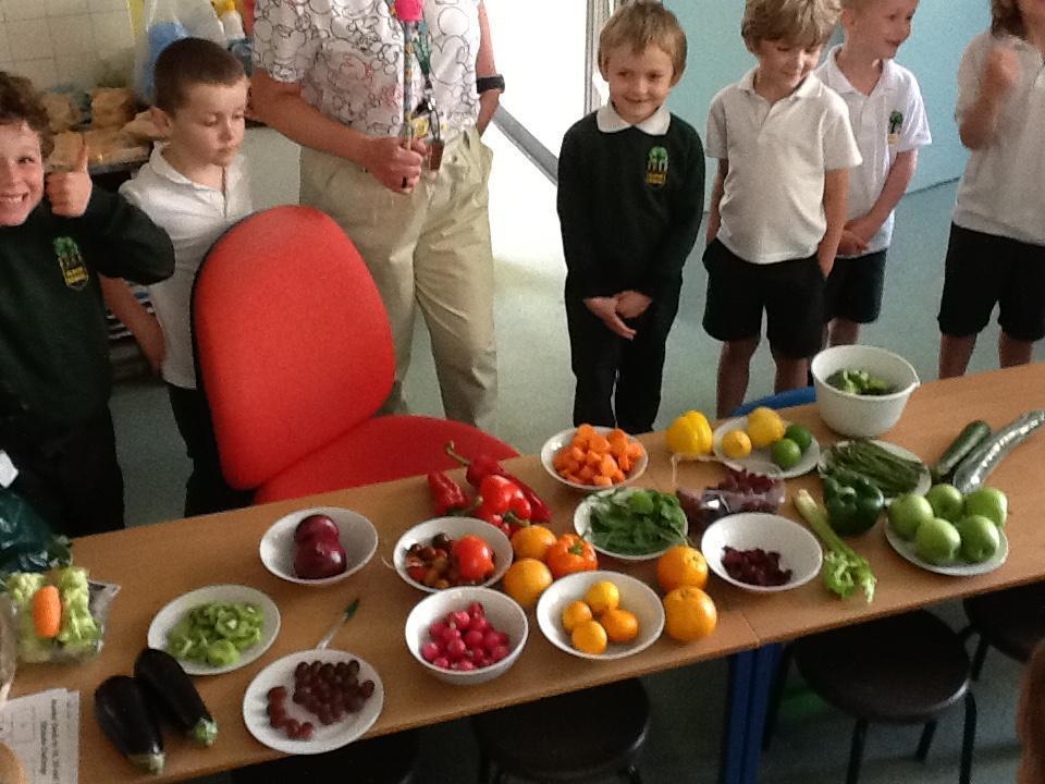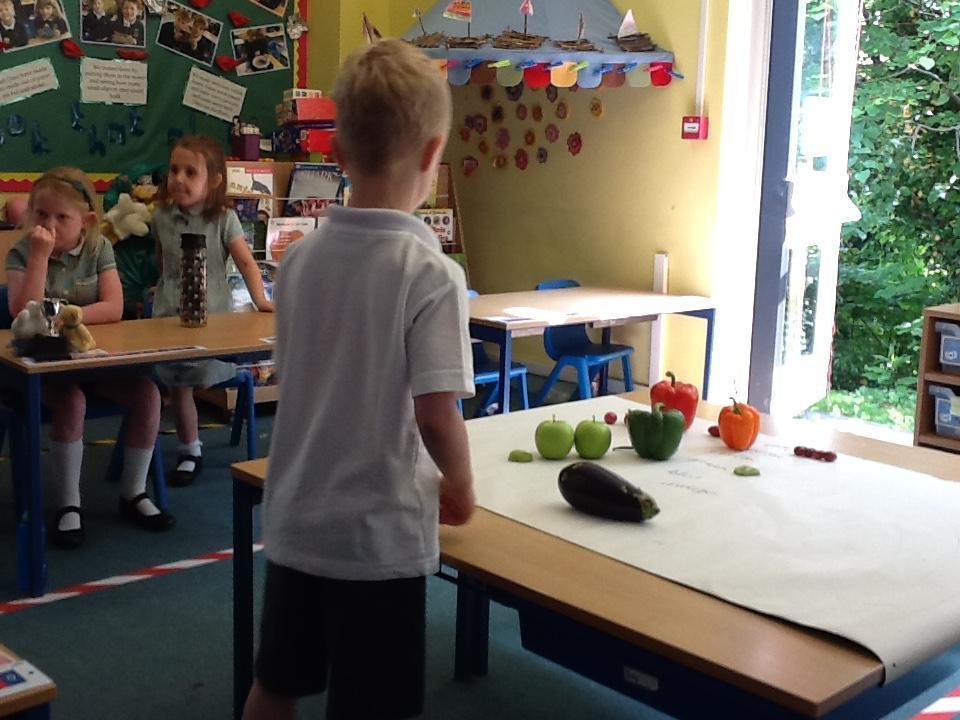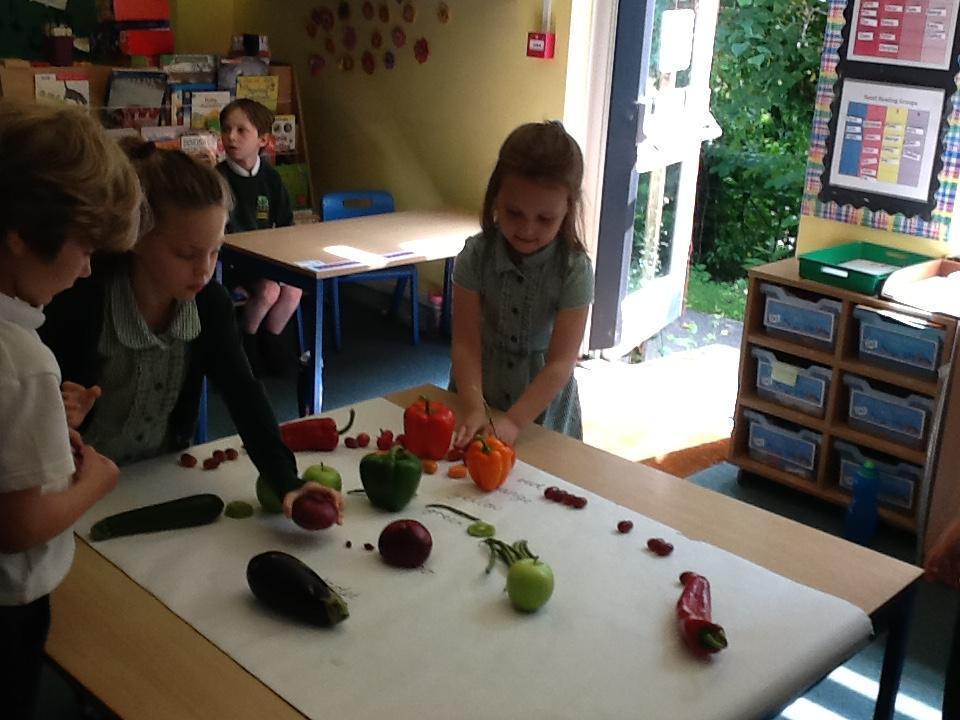 Today, in preparation for our literacy, we have had a rainbow themed day. The children painted their own, using fine brushes with great precision, then we made a rainbow from healthy fruit and veg and talked about the number of ingredients less healthy foods have. There was no blue fruit or veg. We looked at some blue sweets and did a tally of the number of ingredients they had in them...15 in total! We decided healthy food has fewer ingredients and that usually we recognise the names of the ingredients.