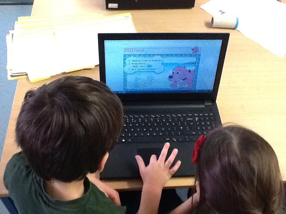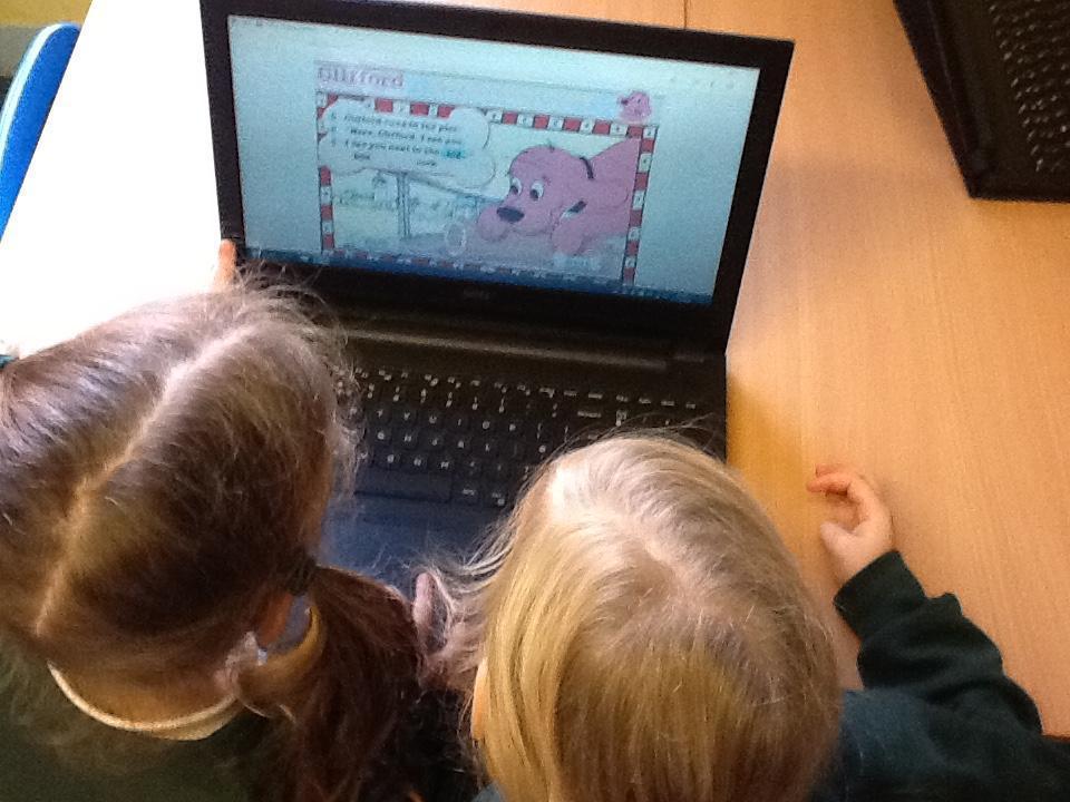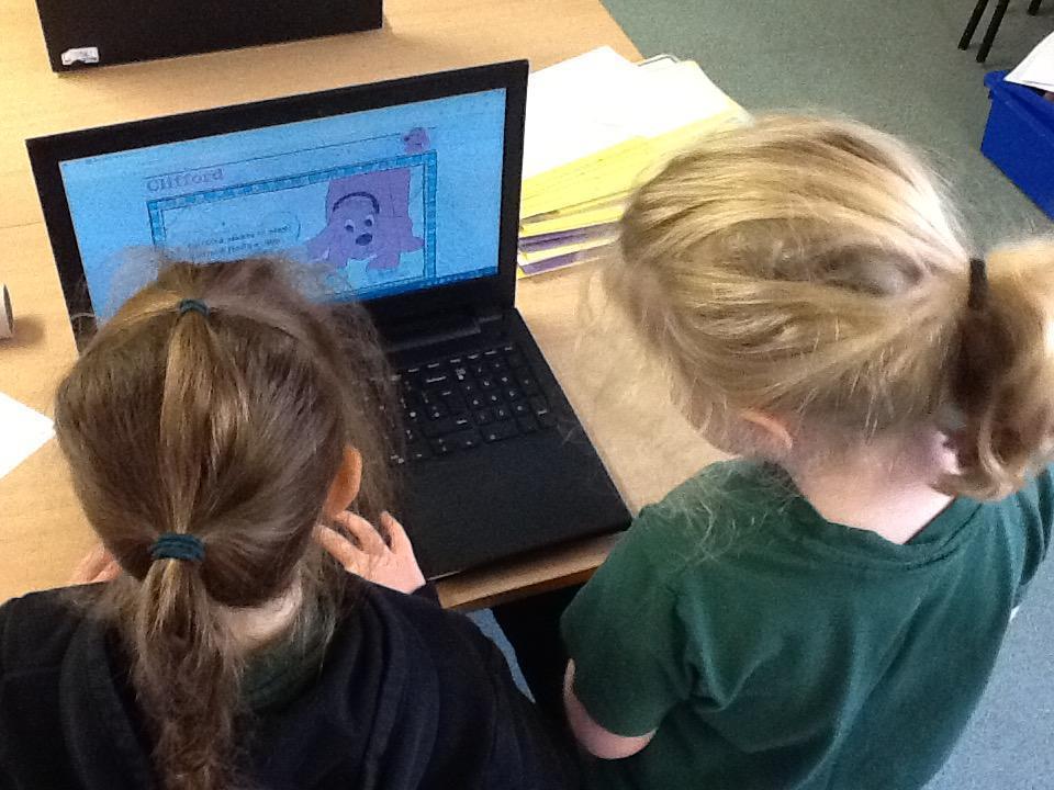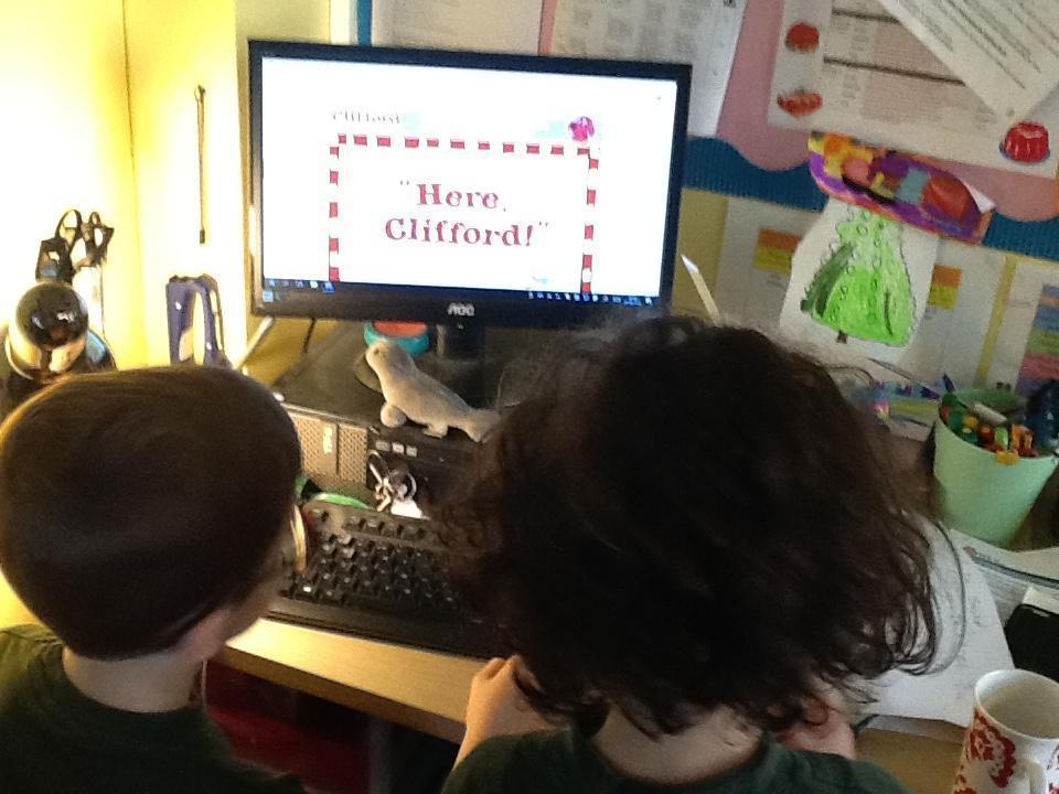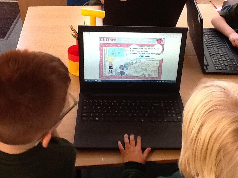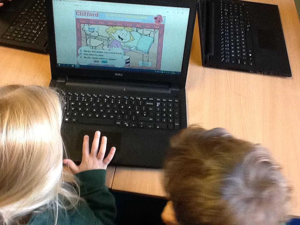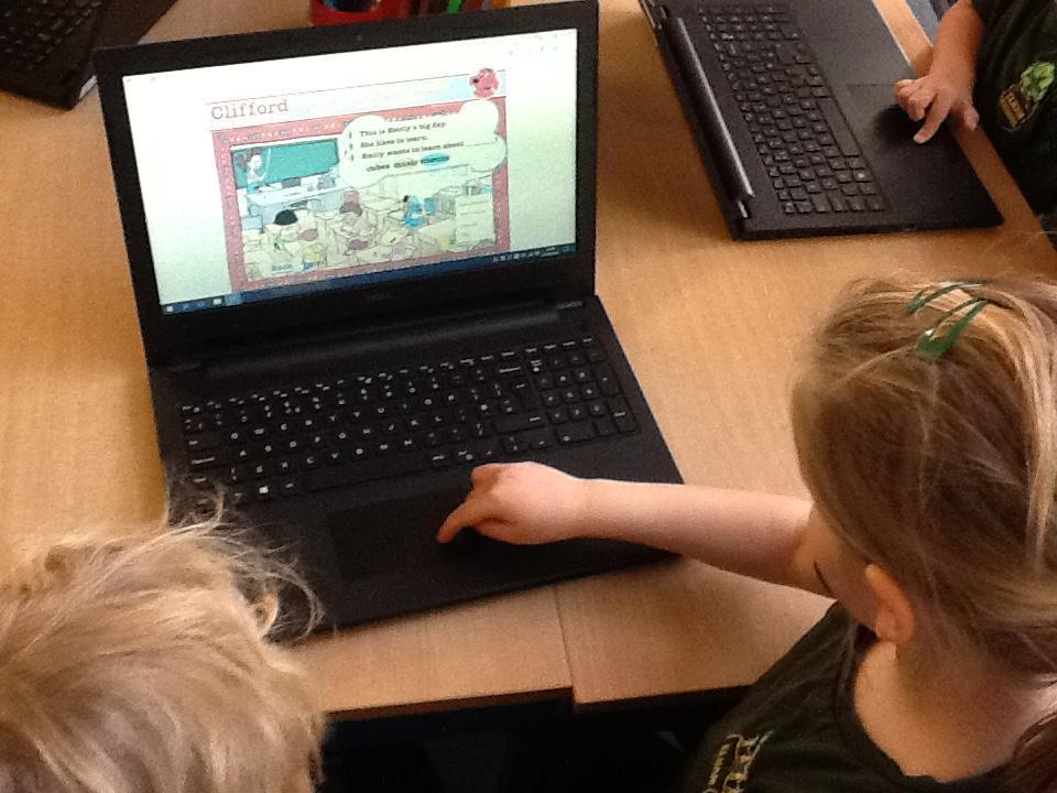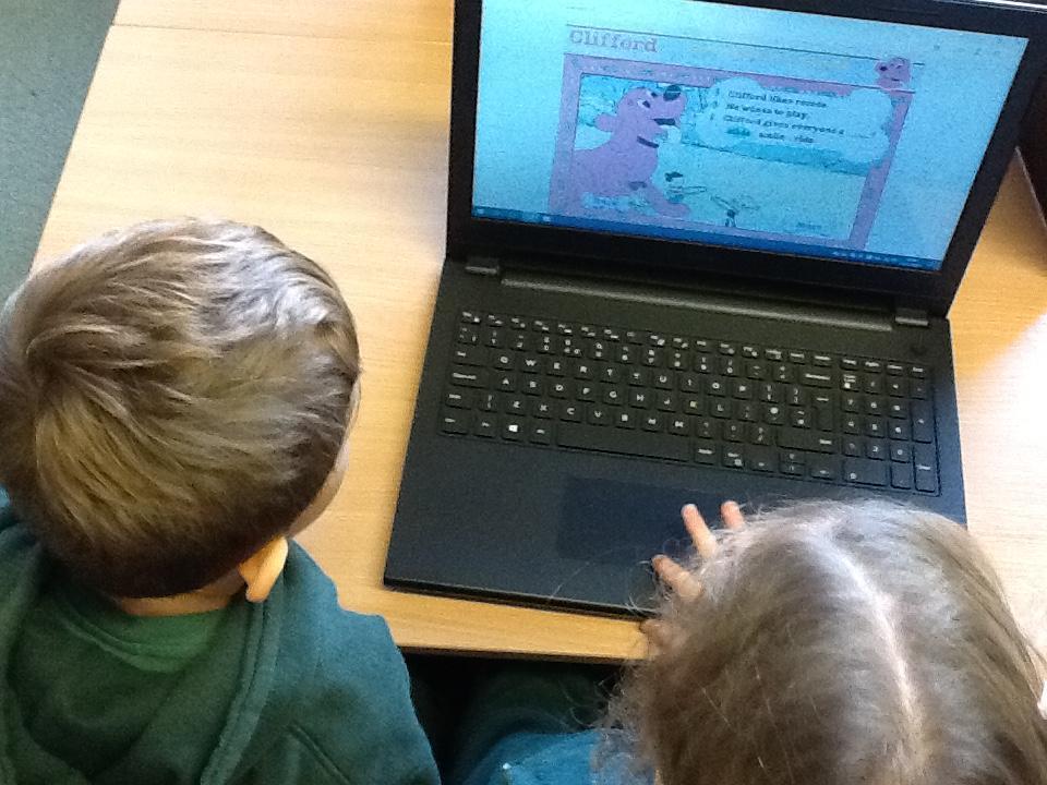 The focus in computing is now learning how to use e-books.  The children spent a happy half hour browsing through Clifford the Big Red Dog books, reading and listening to the stories.