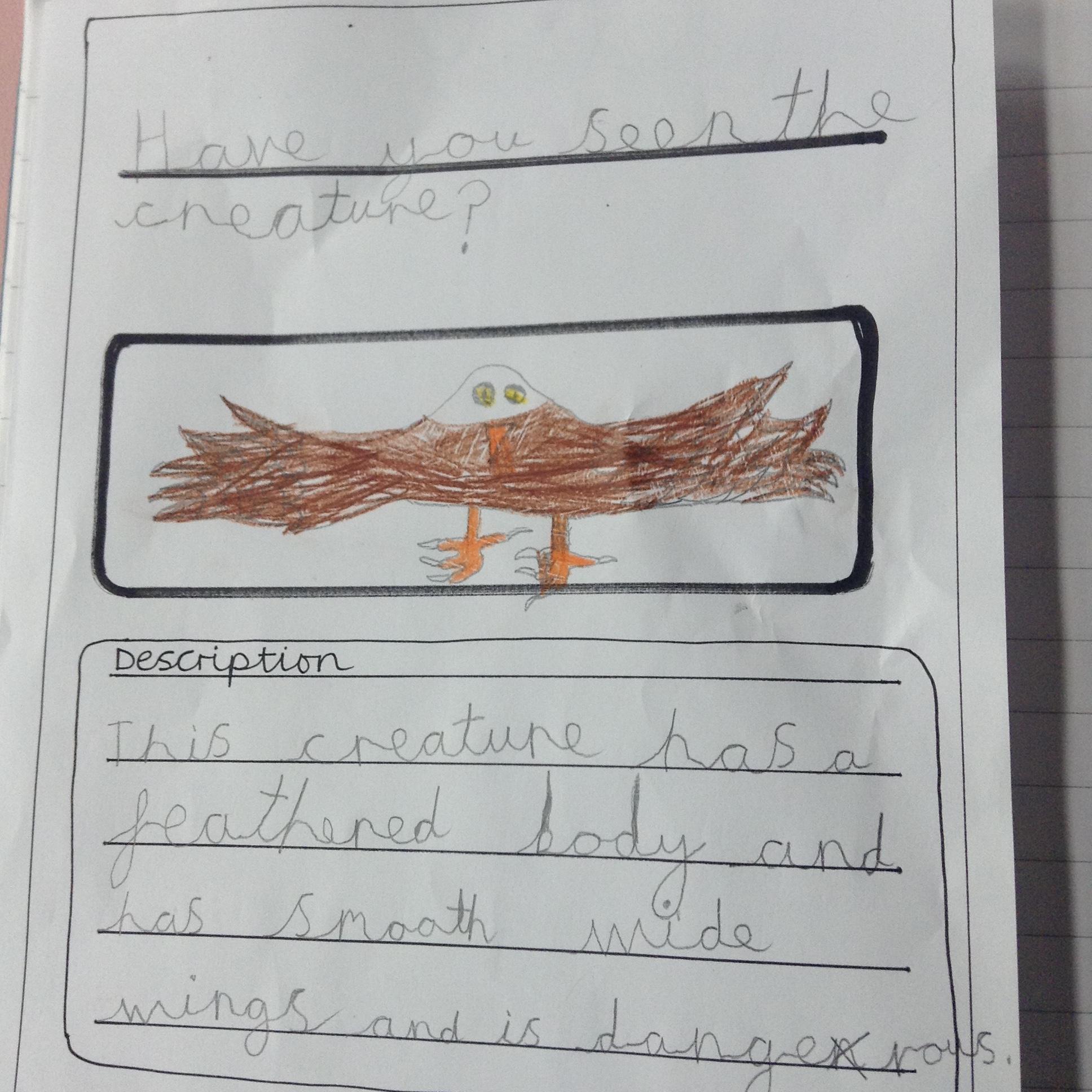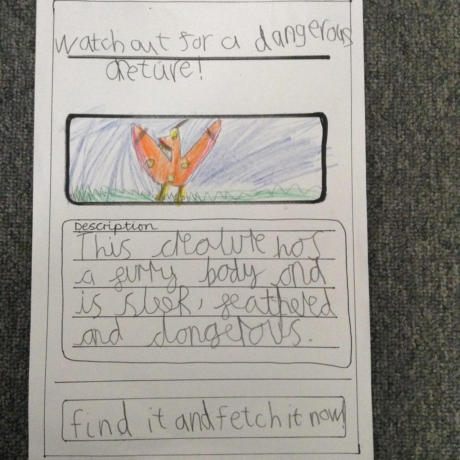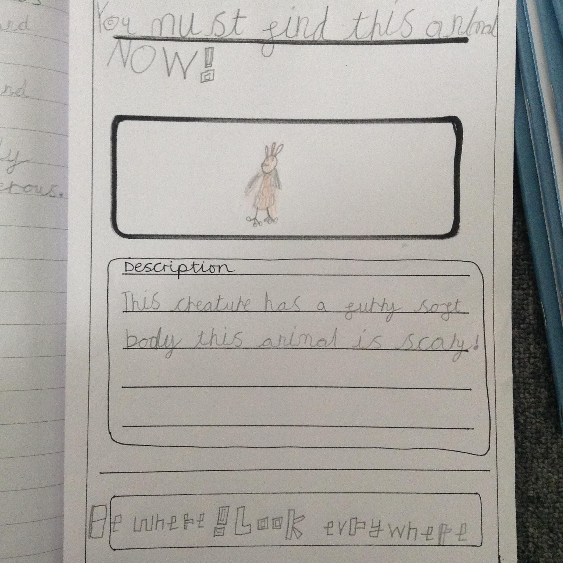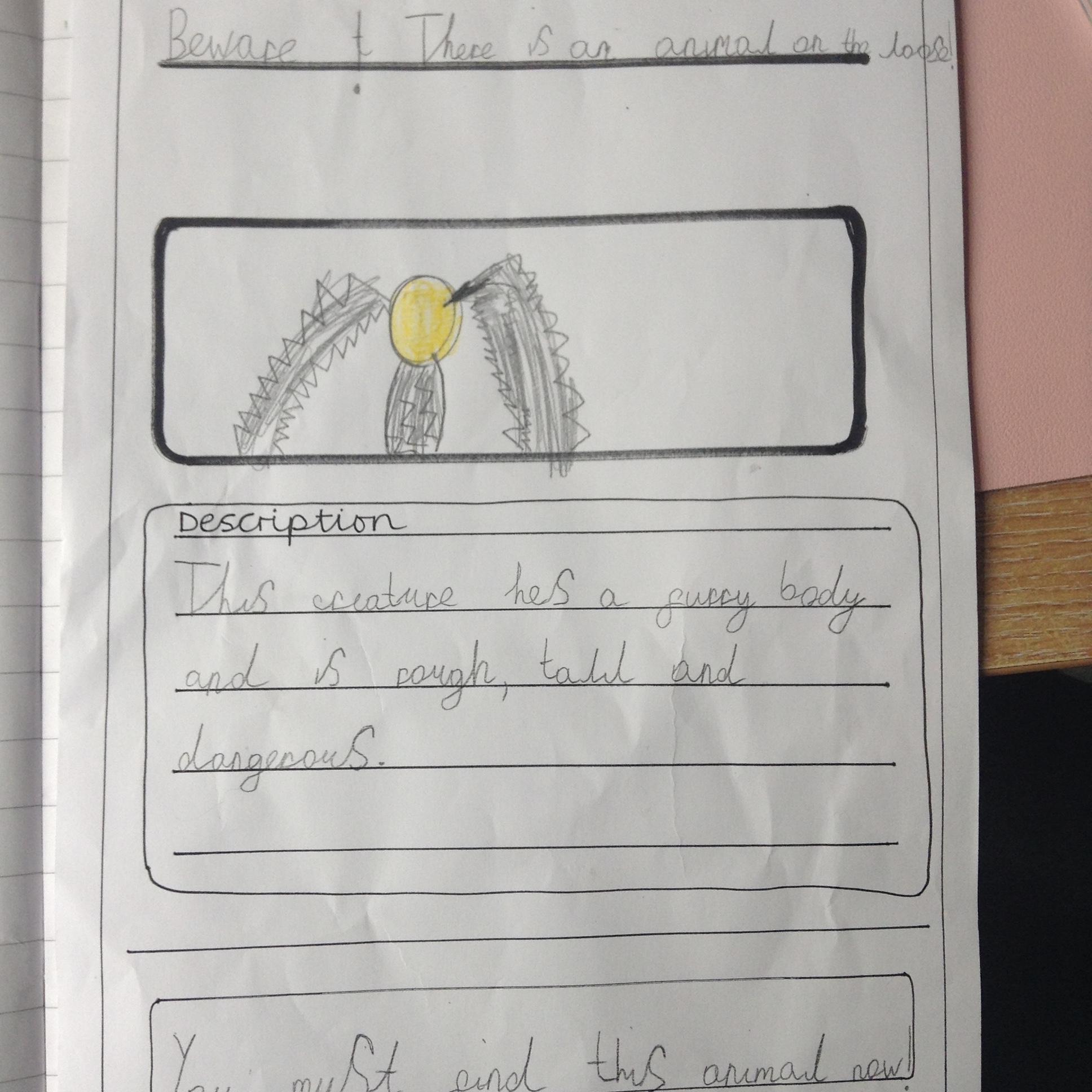 More mystery footprints have been spotted around the school which suggests the mystery creature is on the loose! The children used the descriptions from yesterdays lesson to create missing posters.