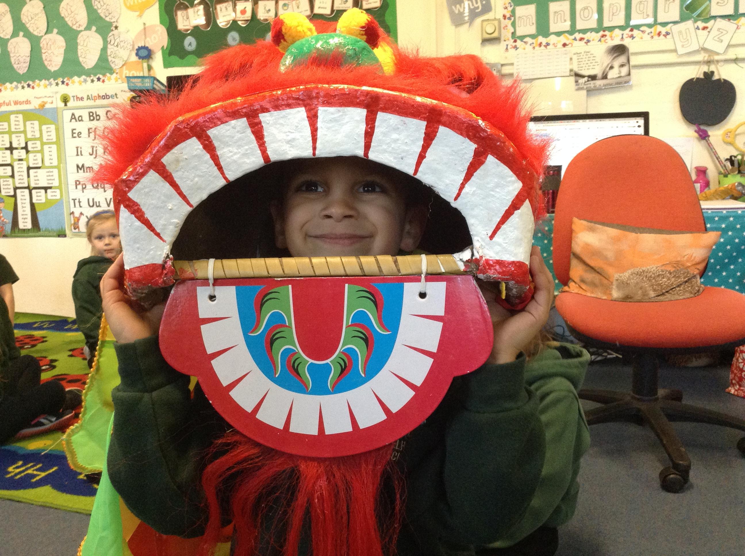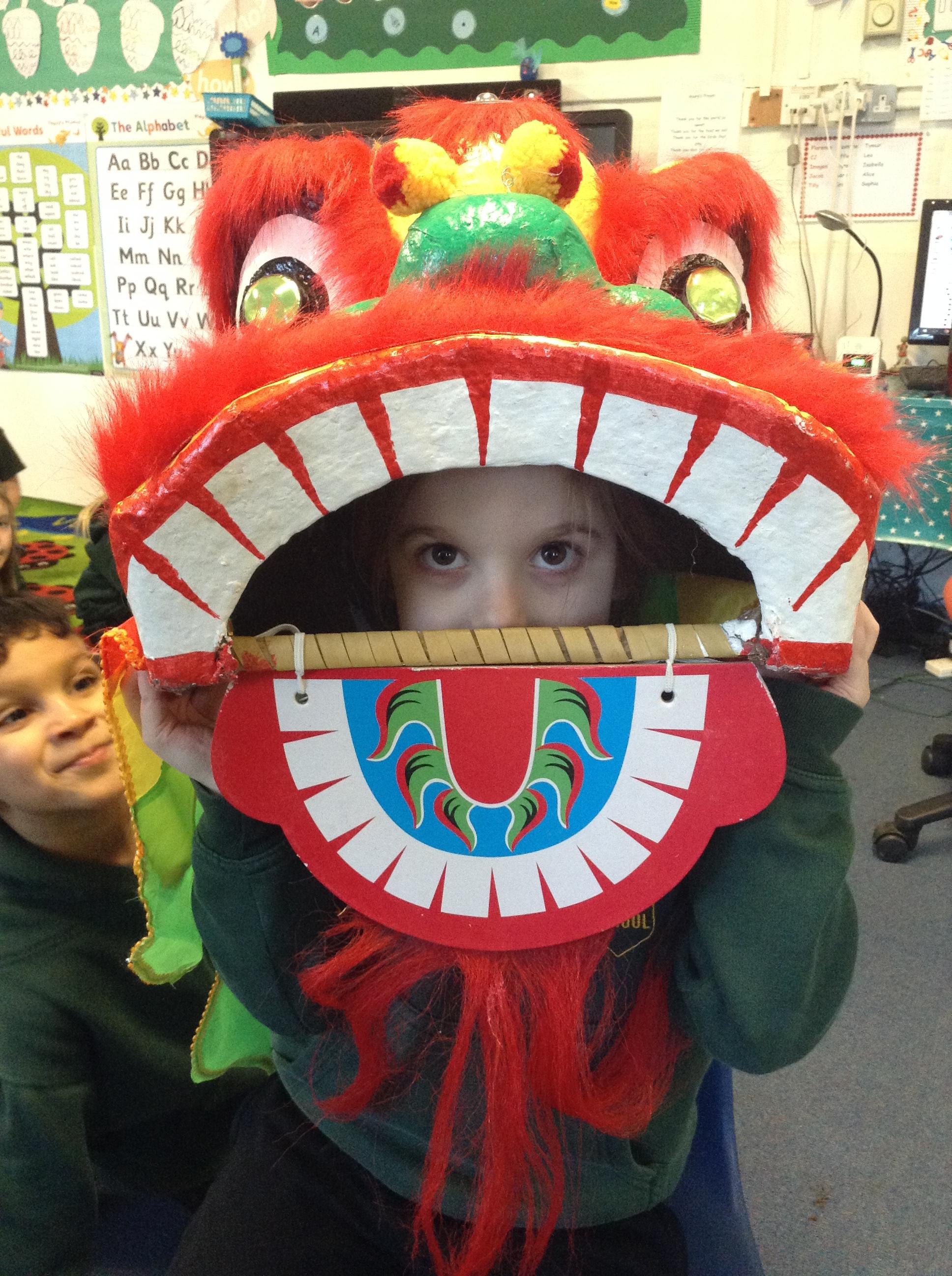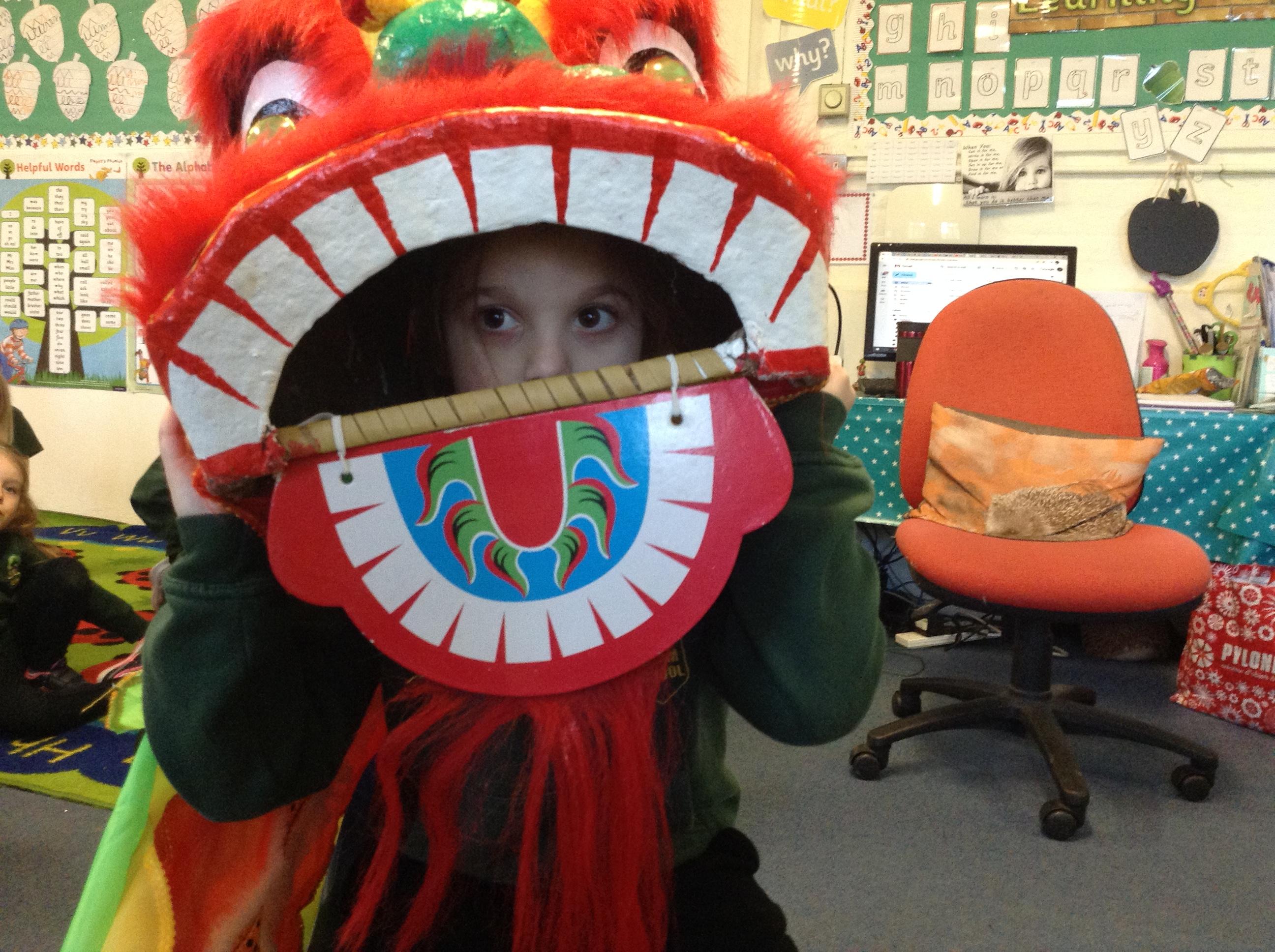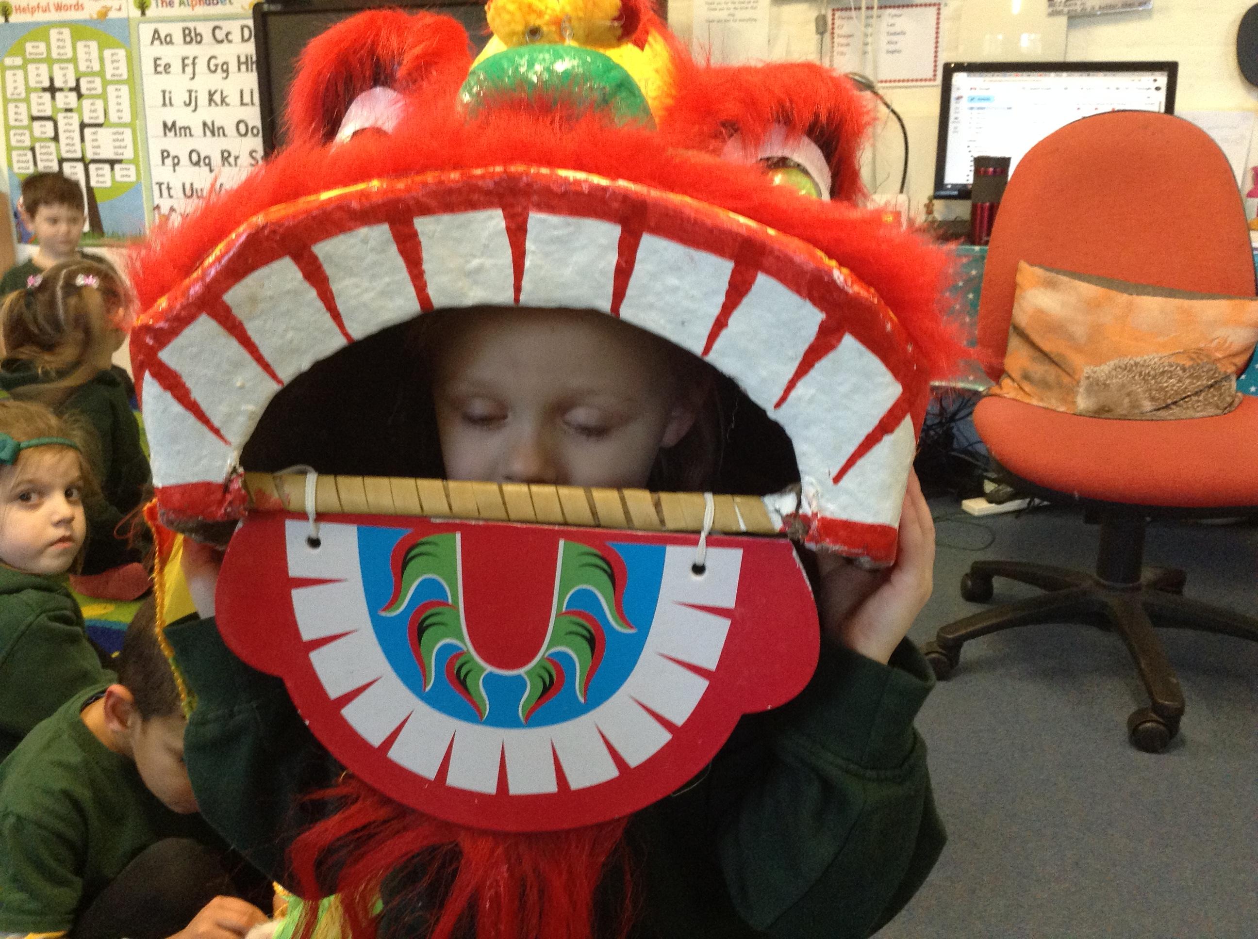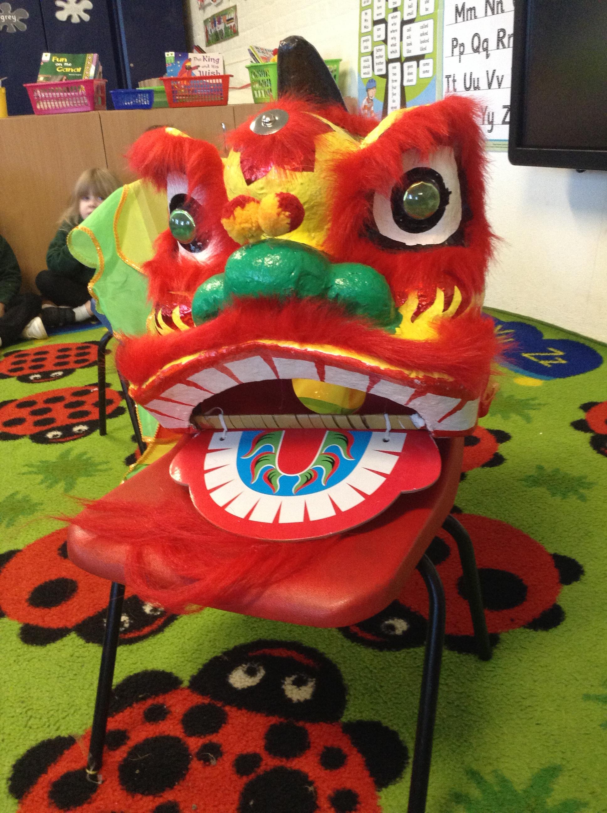 Wow! What a Friday afternoon treat. David who serves our lunches brought in a Chinese lion/dragon head for us to look at in the classroom.