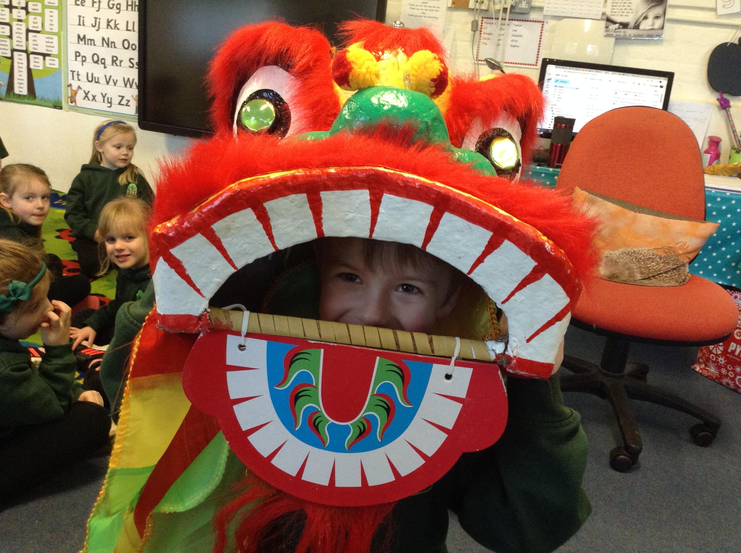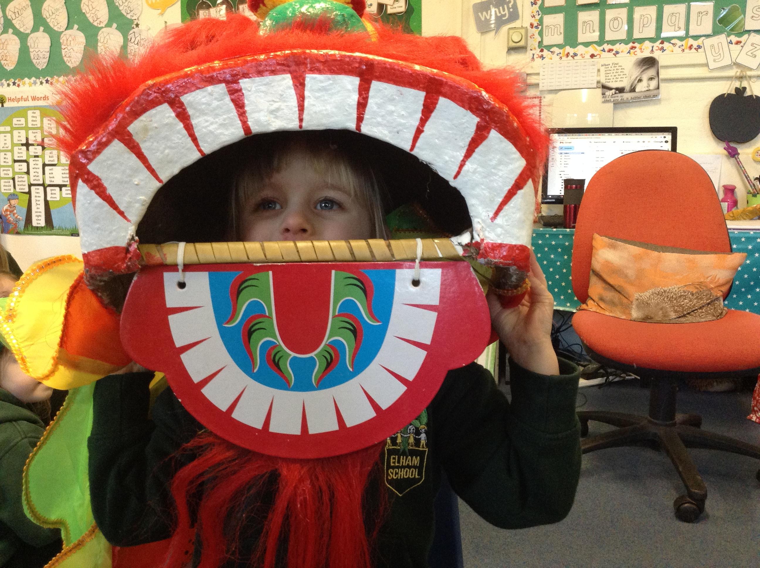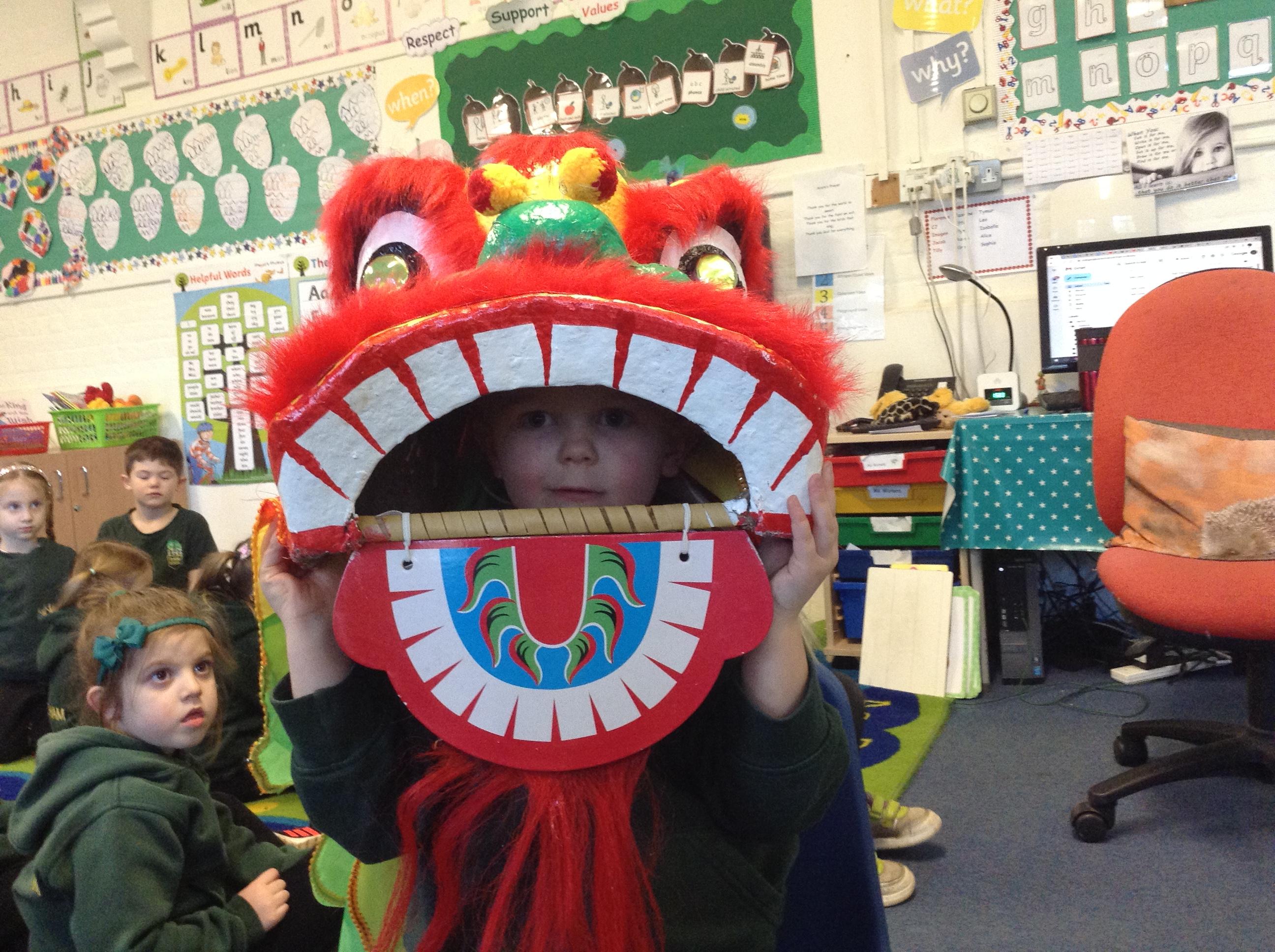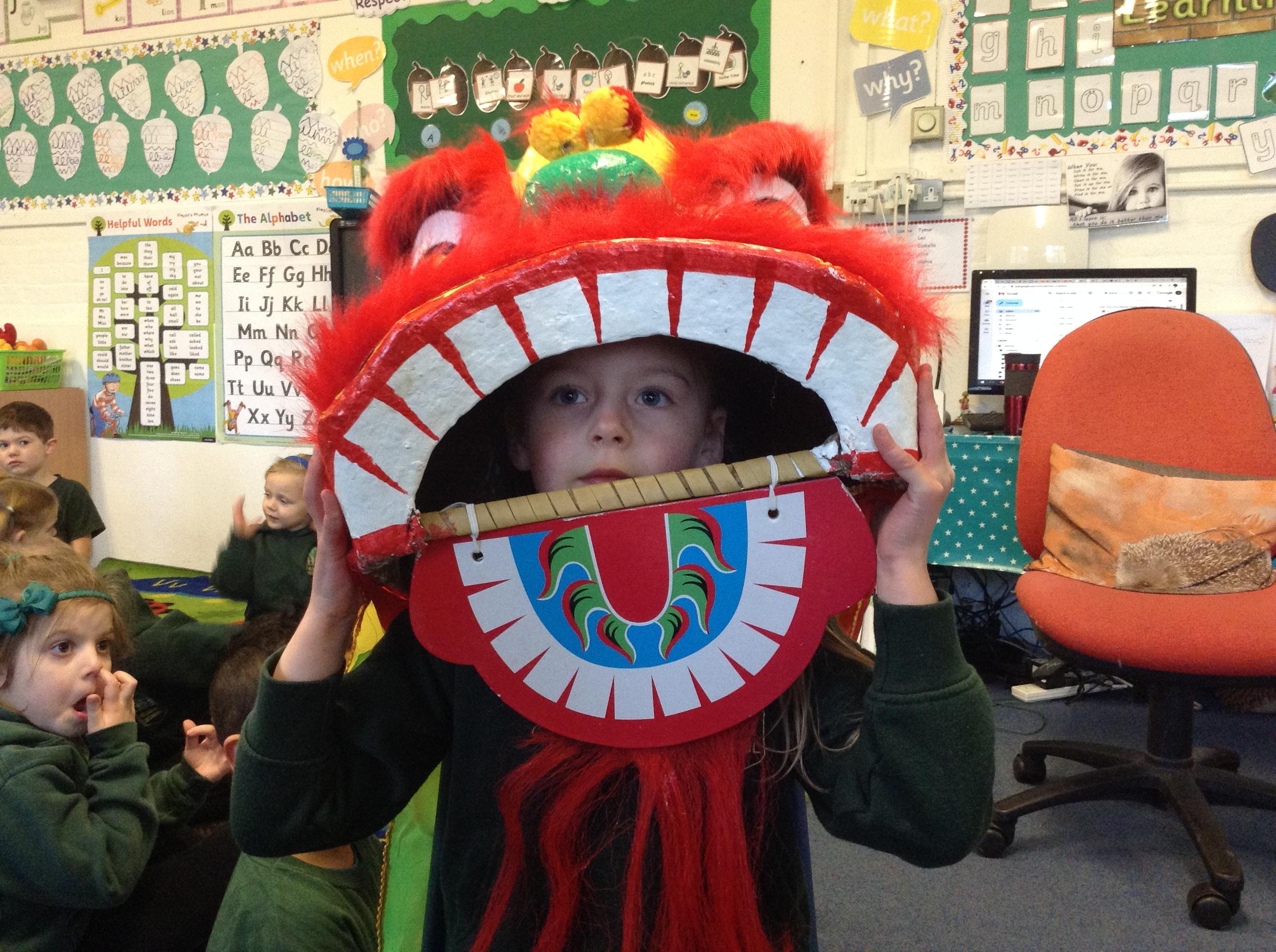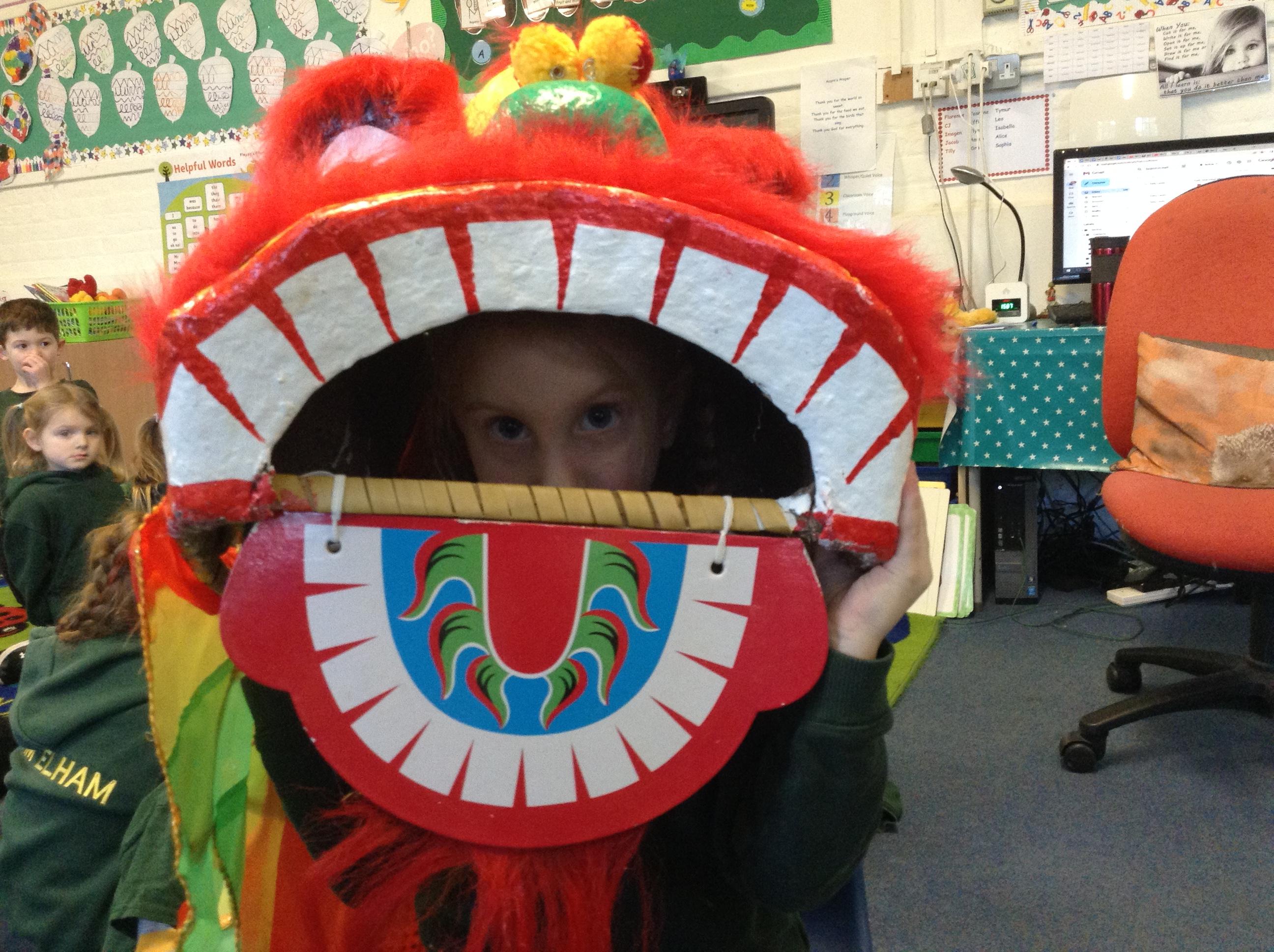 Wow! What a Friday afternoon treat. David who serves our lunches brought in a Chinese lion/dragon head for us to look at in the classroom.