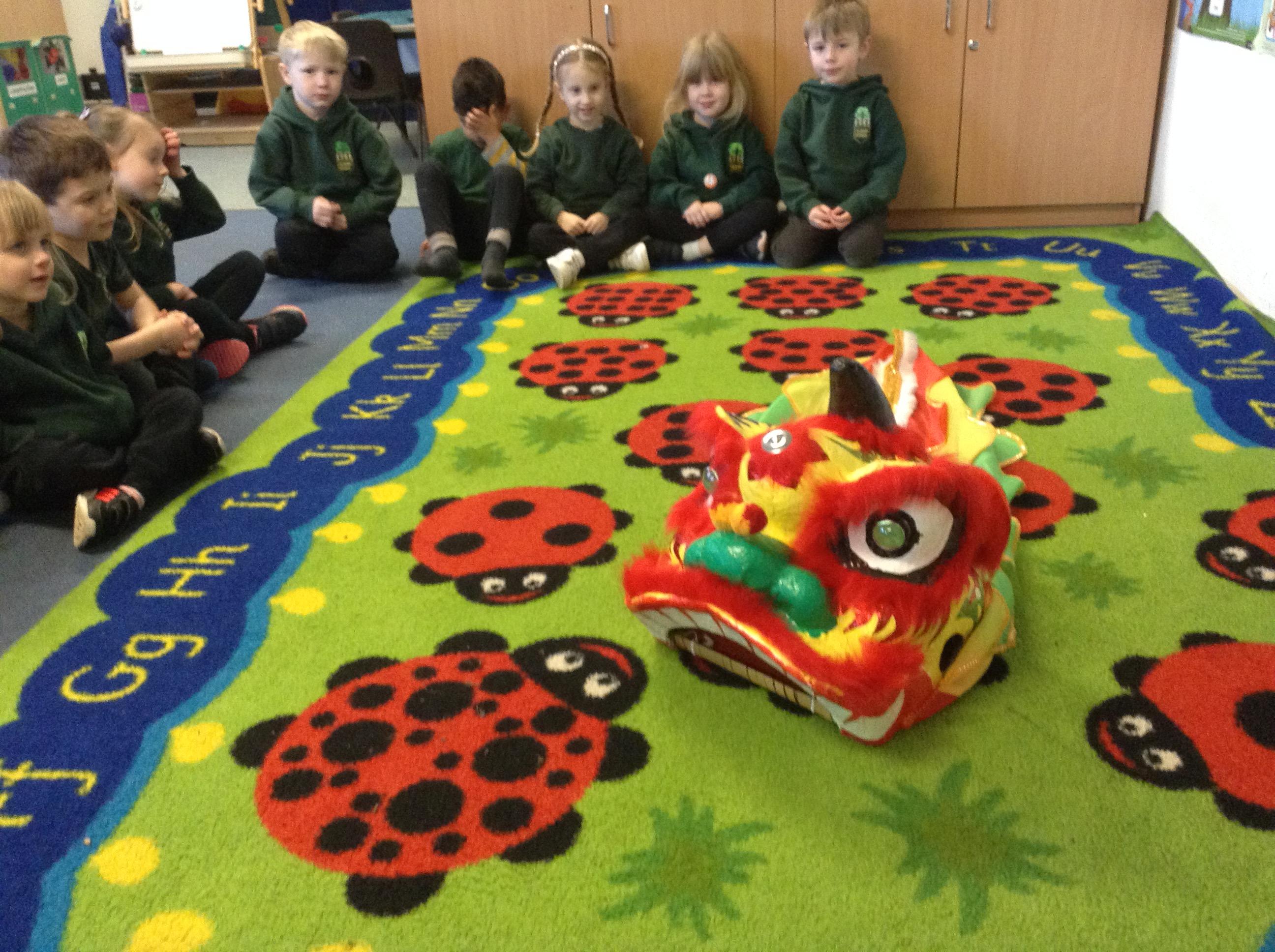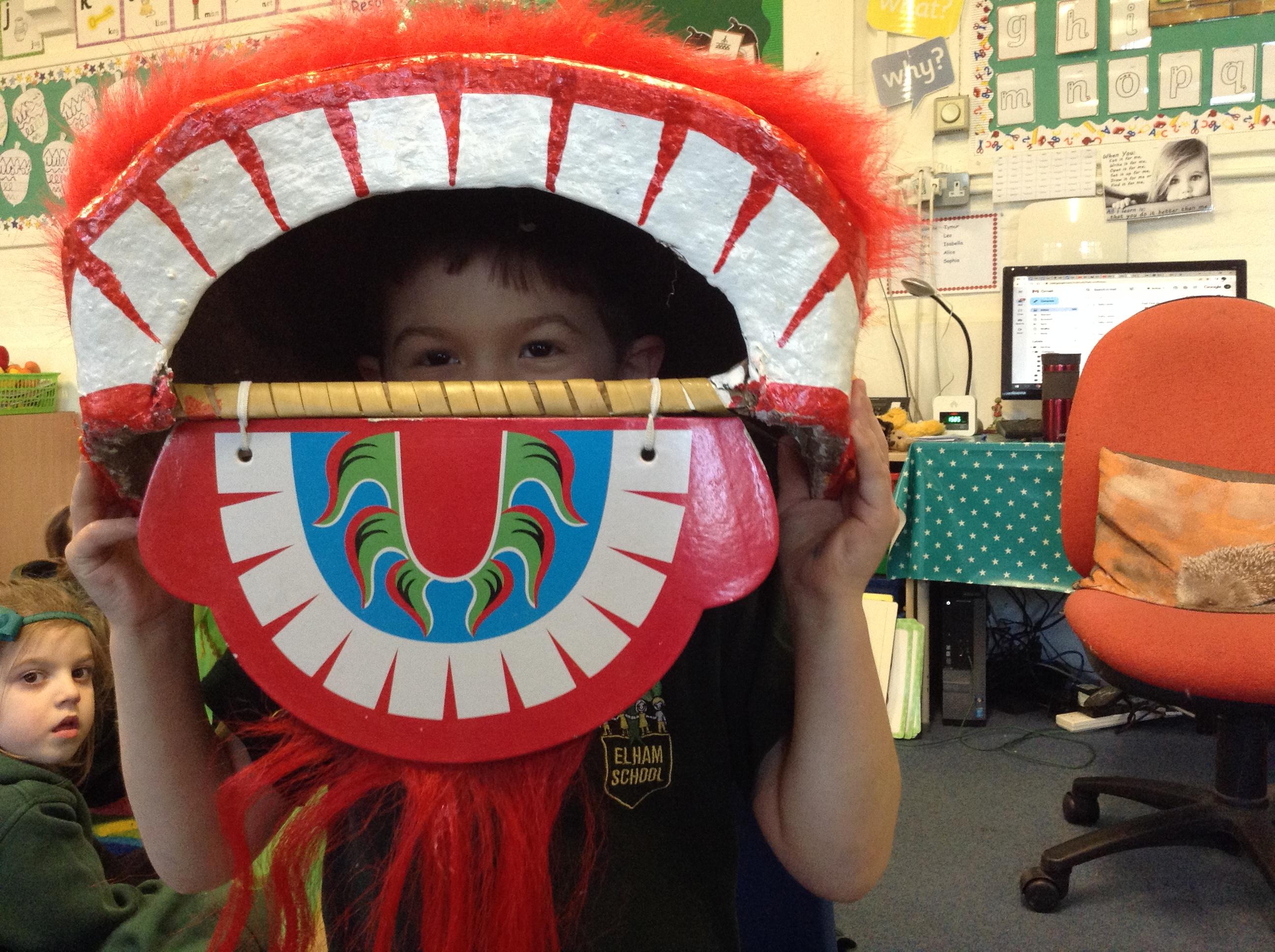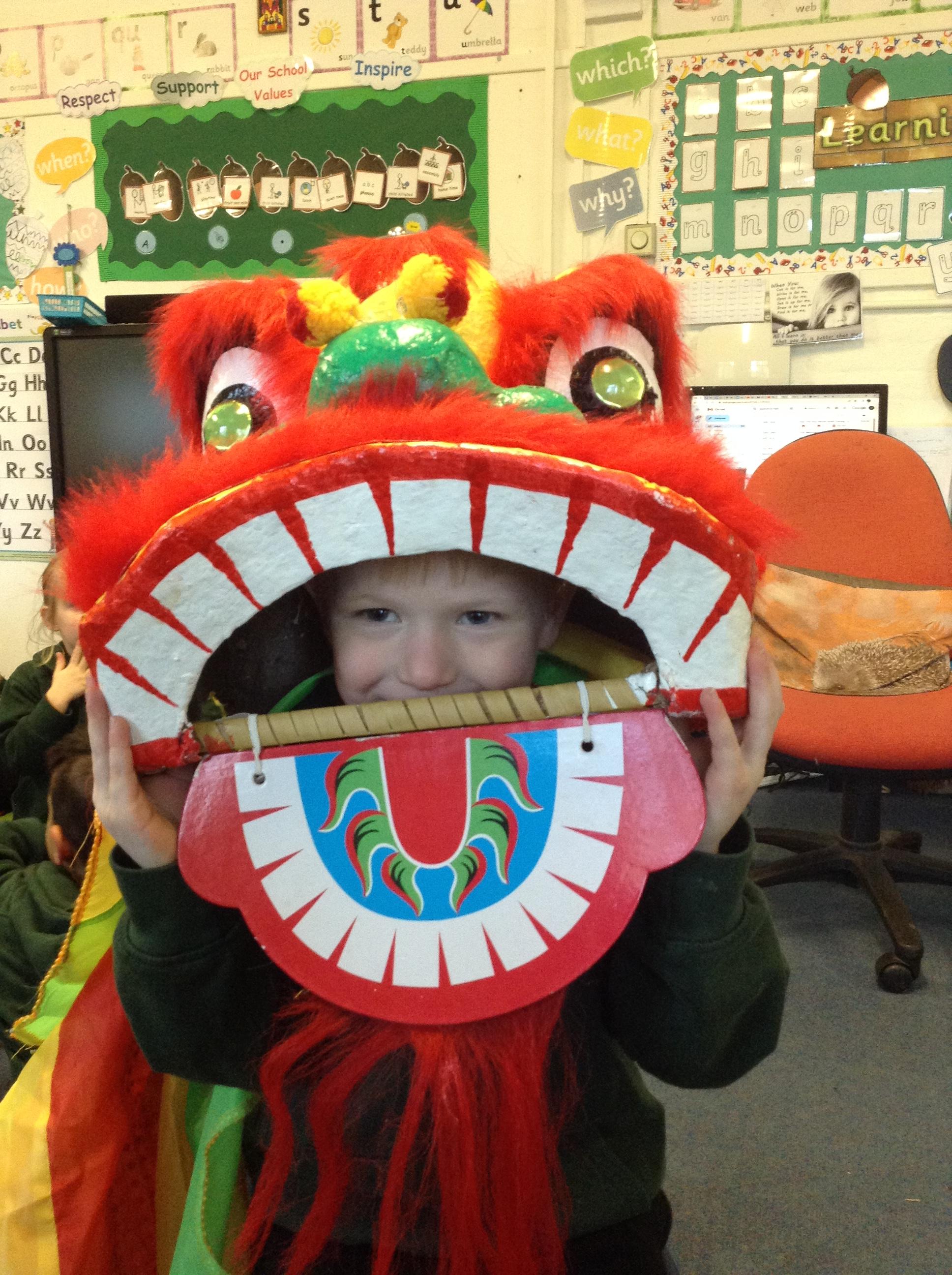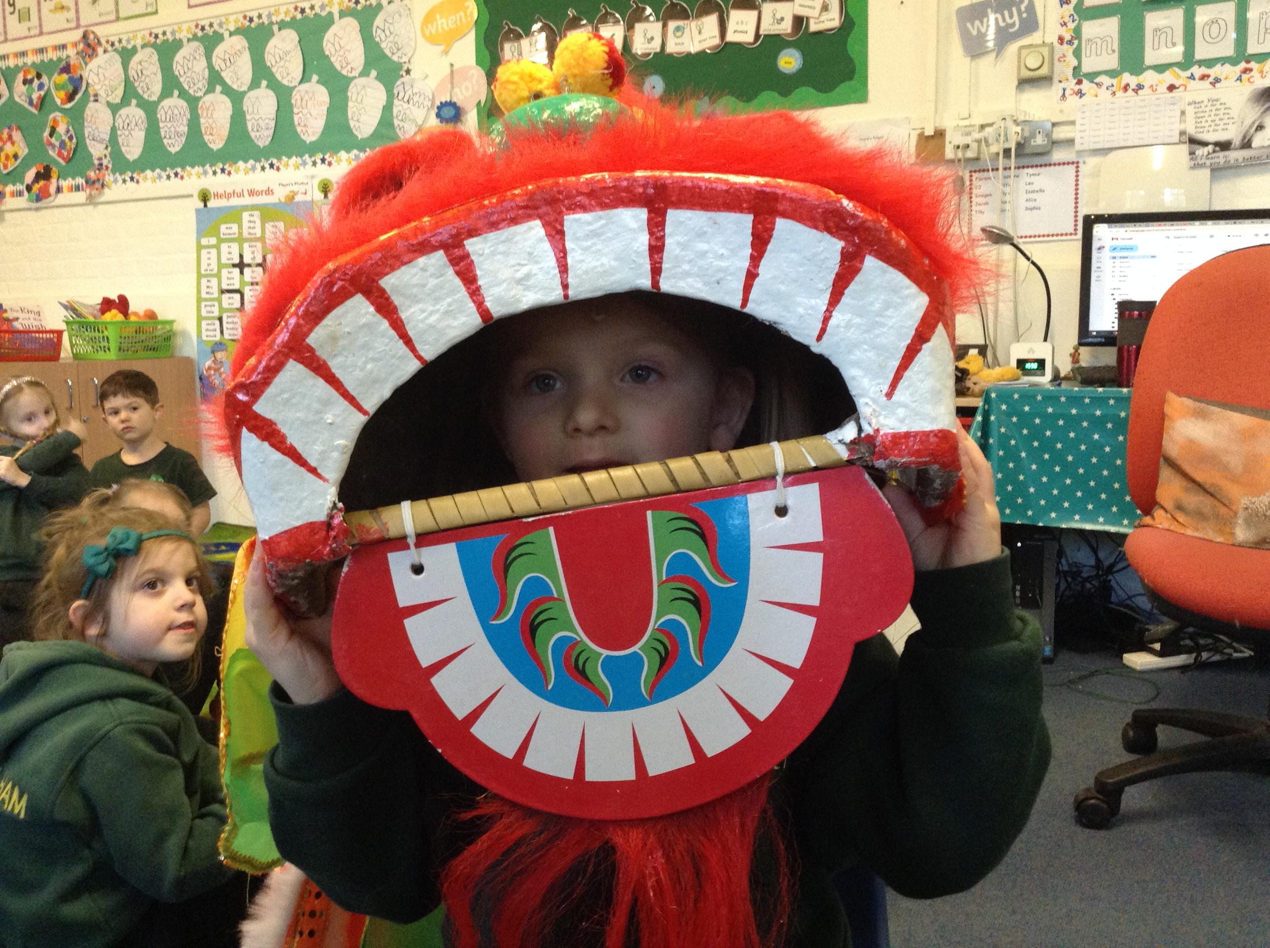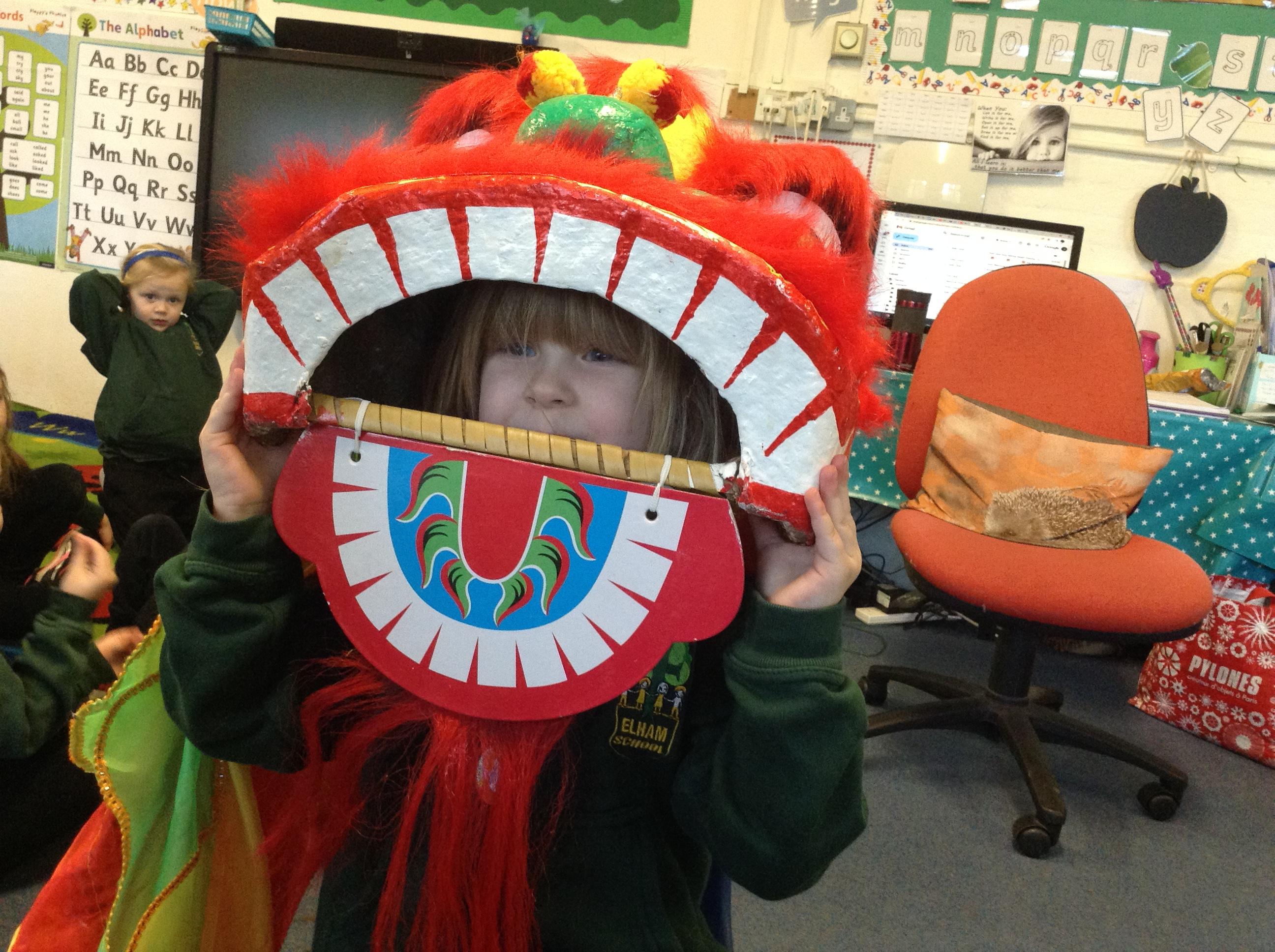 Wow! What a Friday afternoon treat. David who serves our lunches brought in a Chinese lion/dragon head for us to look at in the classroom.