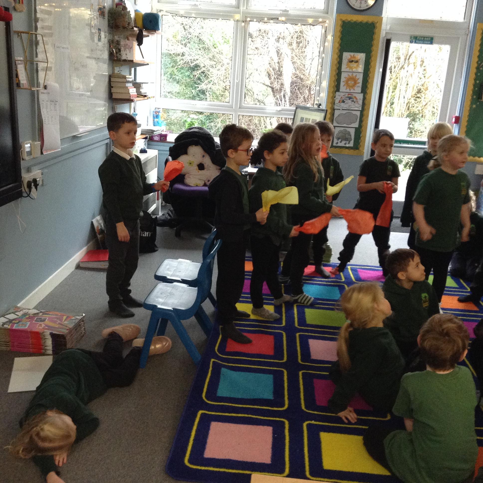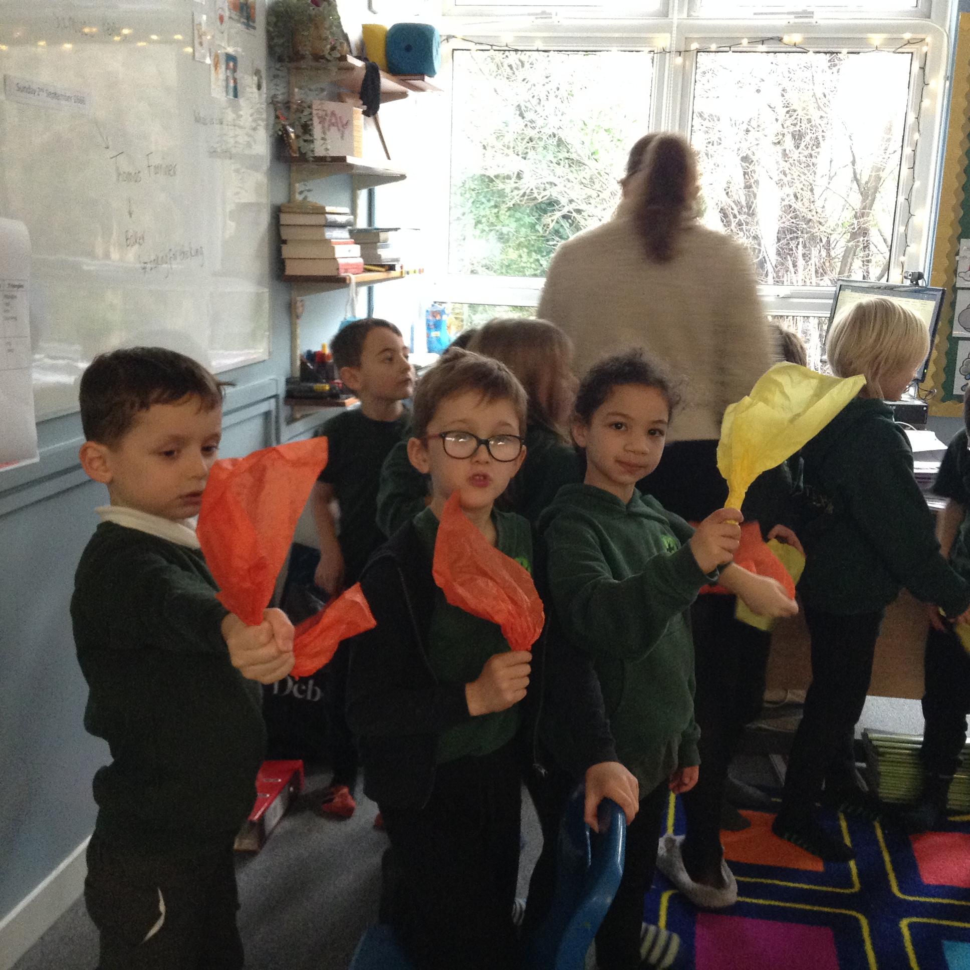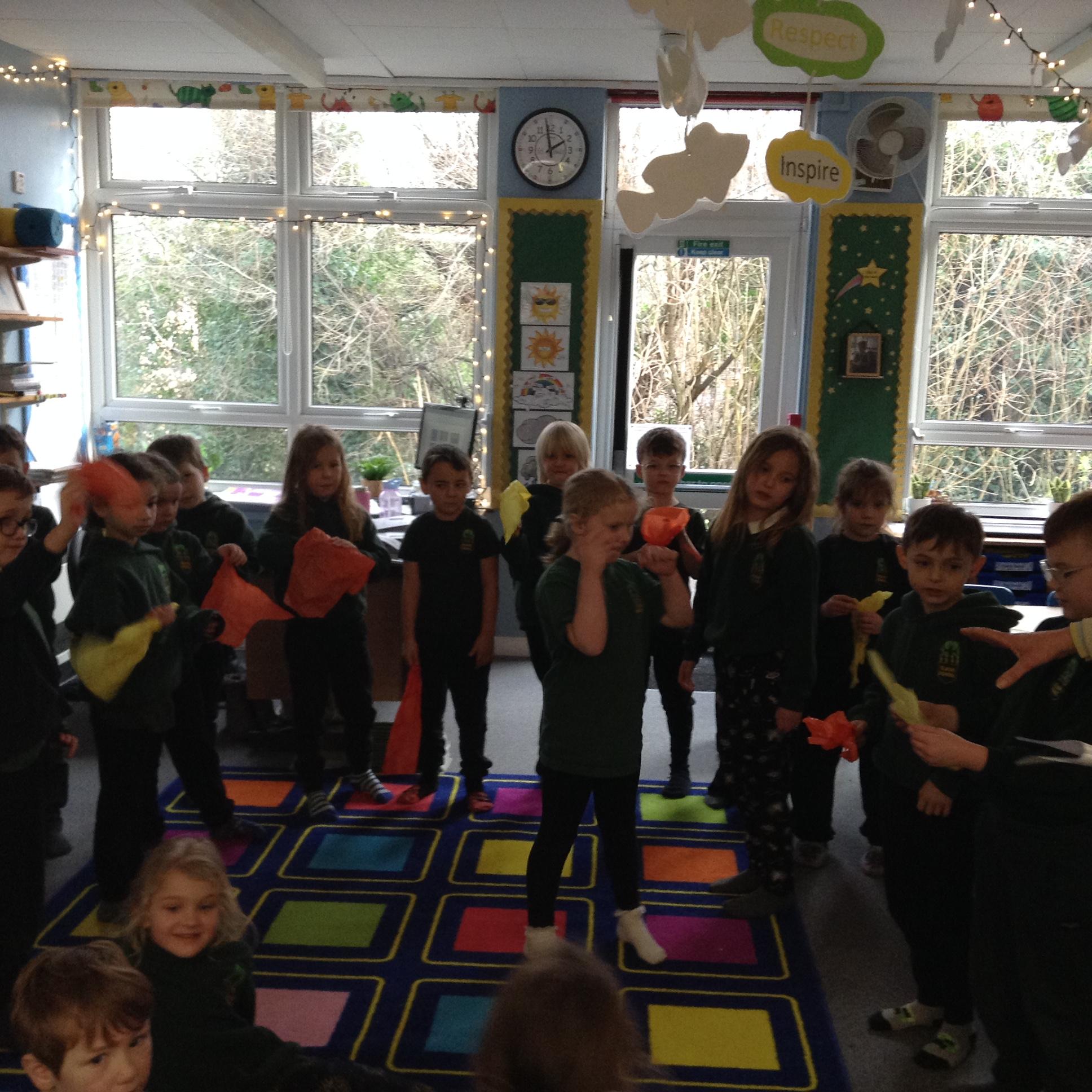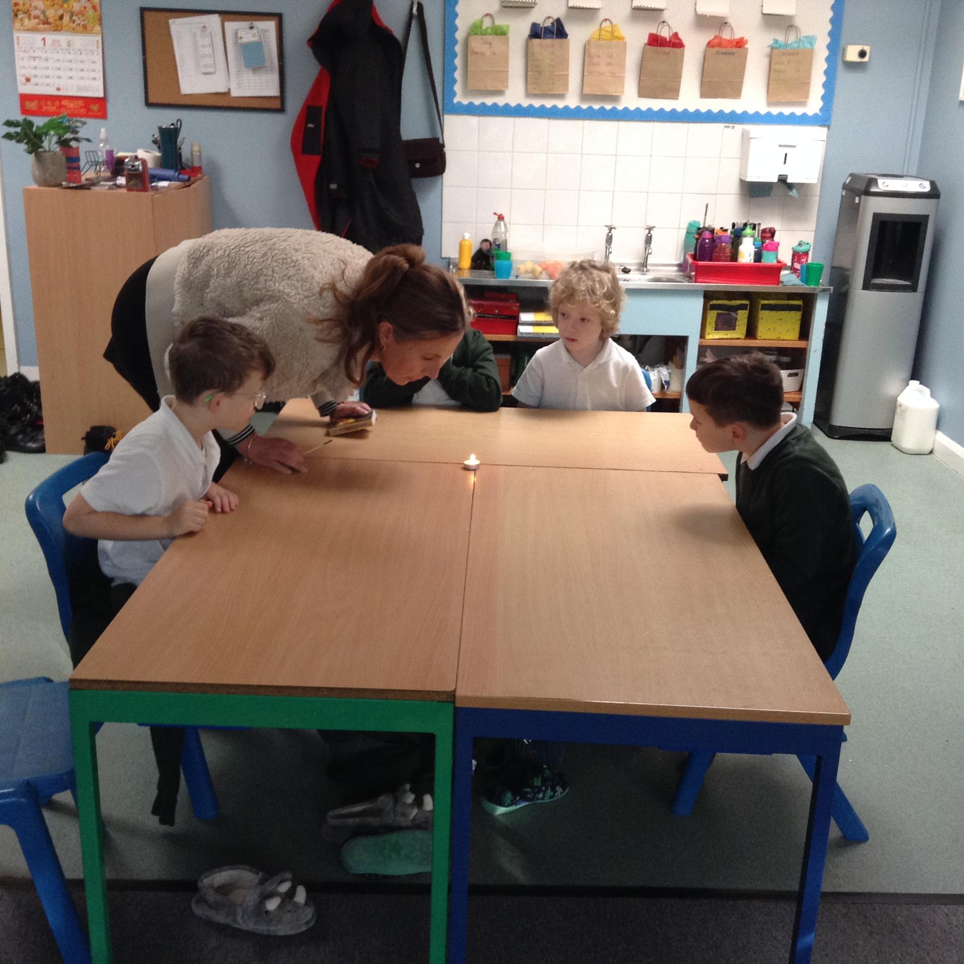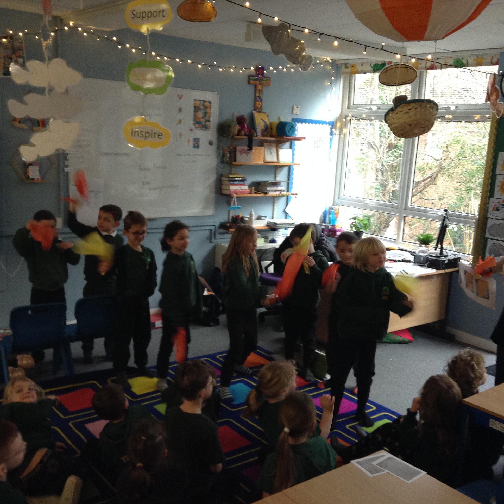 In English the children looked at a small version of fire by watching the flame on candle (we discussed how big fires are dangerous). We looked at the colour of the flame and discussed the different colours at the top and the bottom of the flame. We looked at what happens if you blow gently across the flame (without blowing it out) and we looked at what happened to the wick when the flame was blown out. The children then used a range of vocabulary to describe the fire.