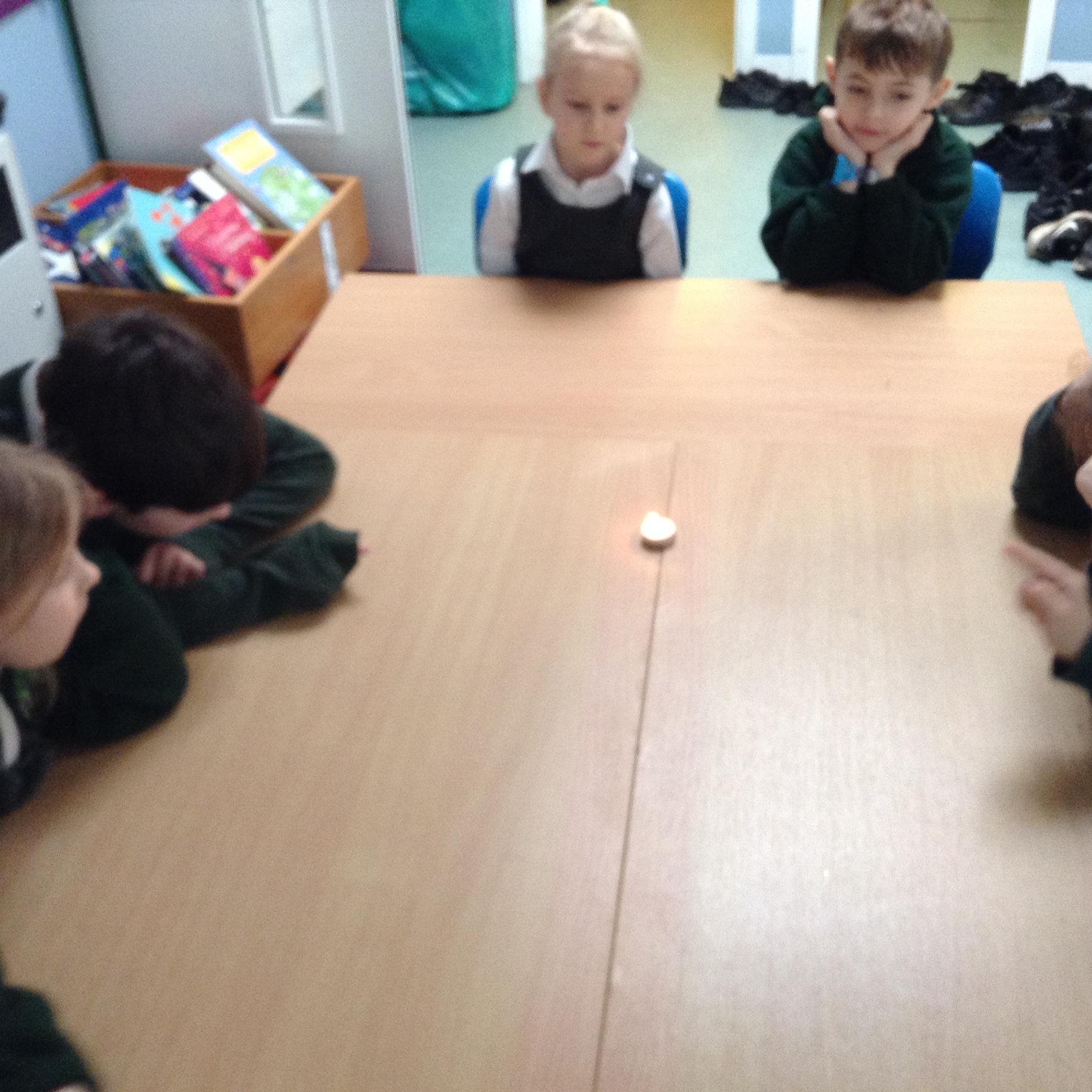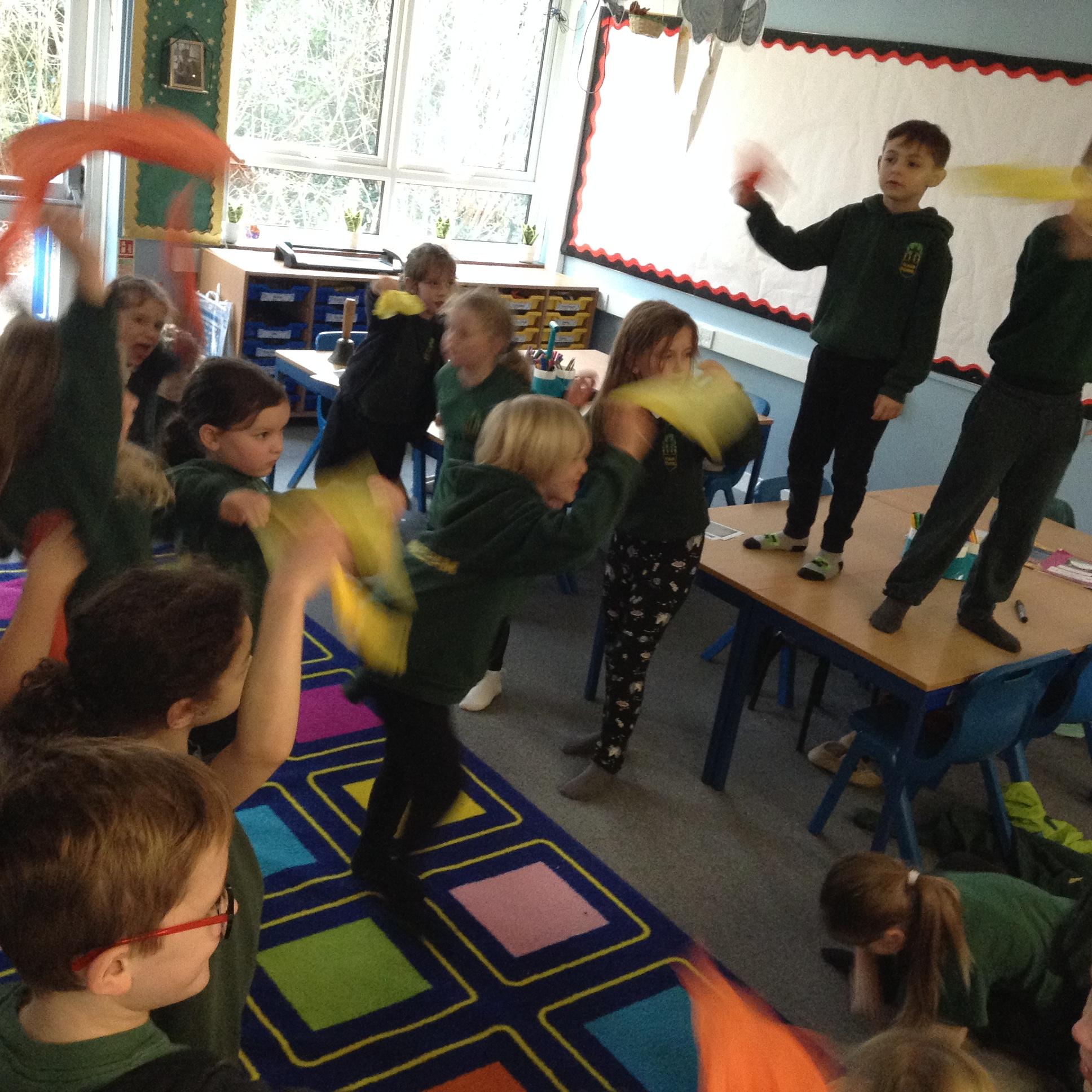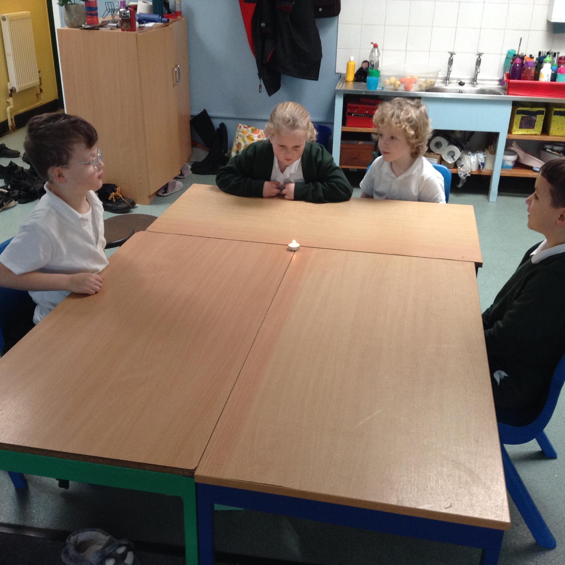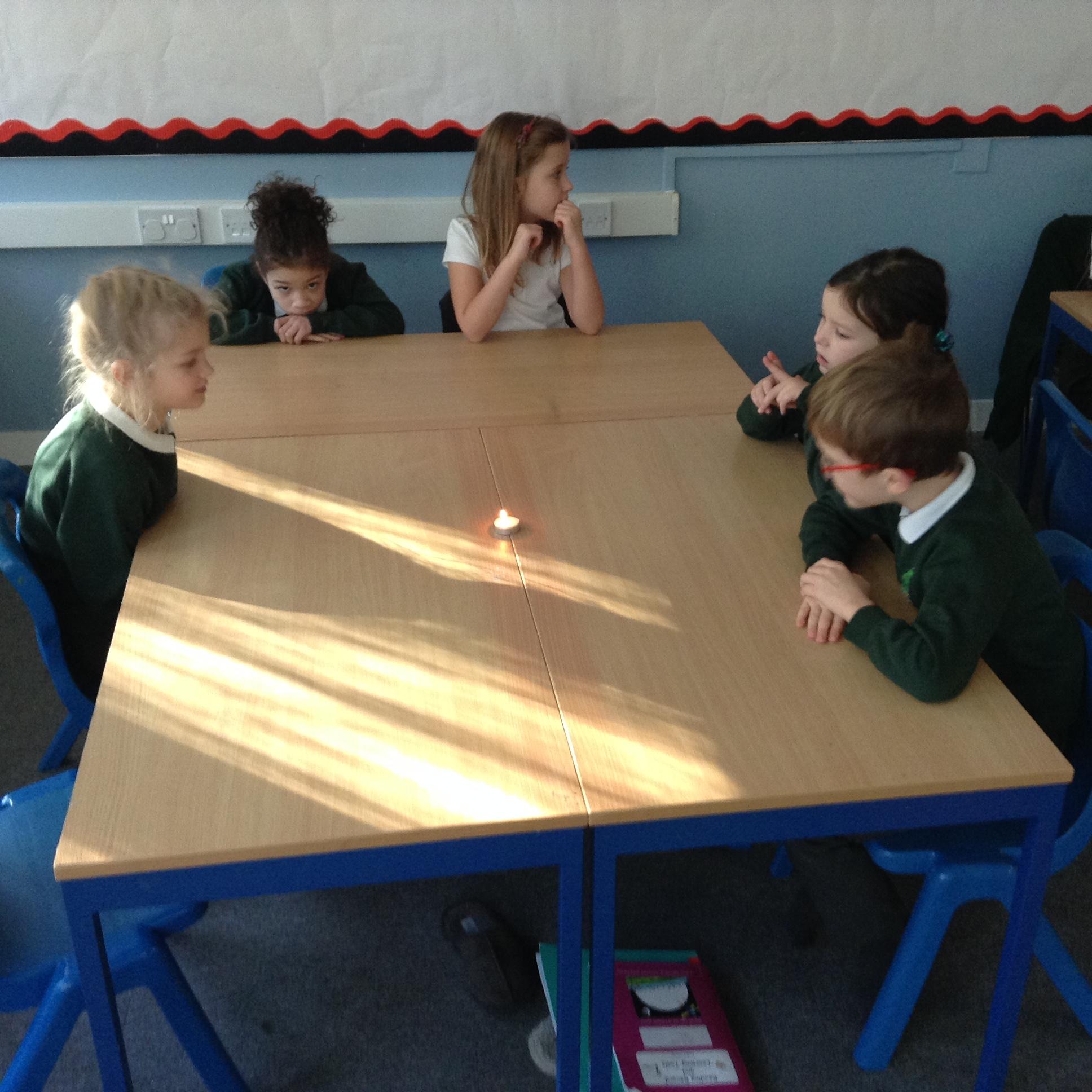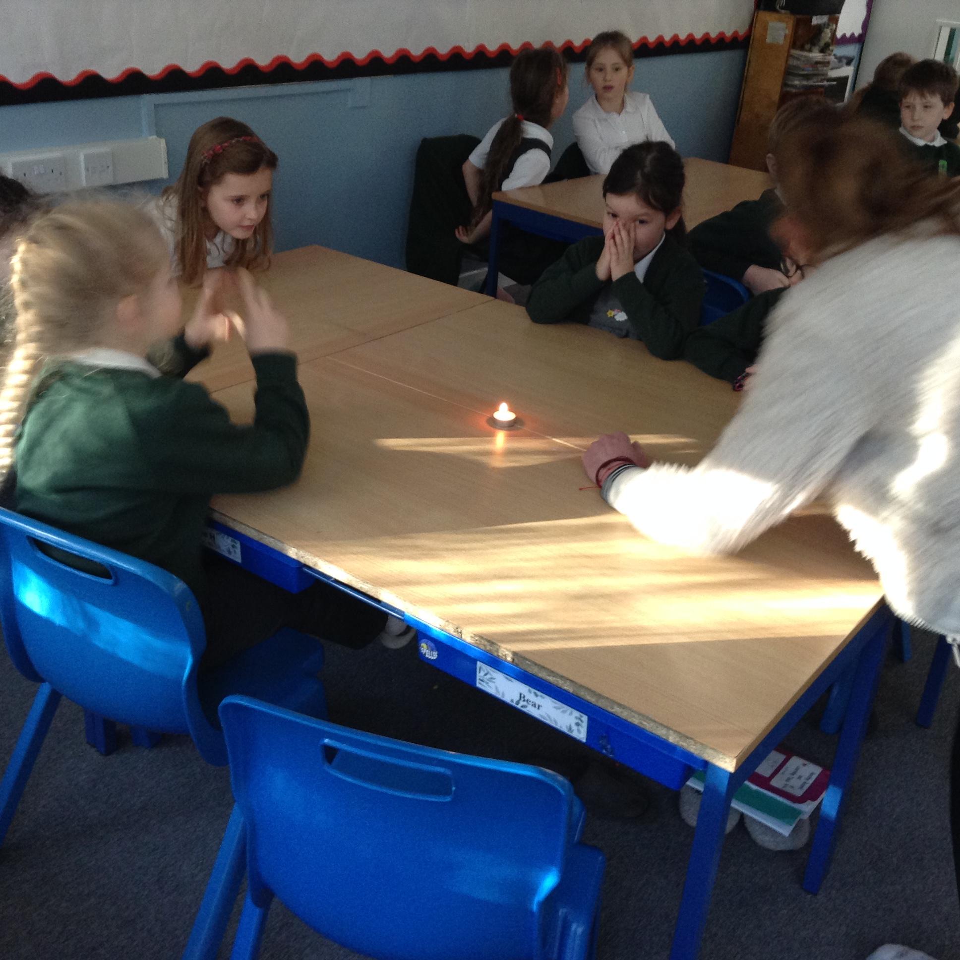 In English the children looked at a small version of fire by watching the flame on candle (we discussed how big fires are dangerous). We looked at the colour of the flame and discussed the different colours at the top and the bottom of the flame. We looked at what happens if you blow gently across the flame (without blowing it out) and we looked at what happened to the wick when the flame was blown out. The children then used a range of vocabulary to describe the fire.