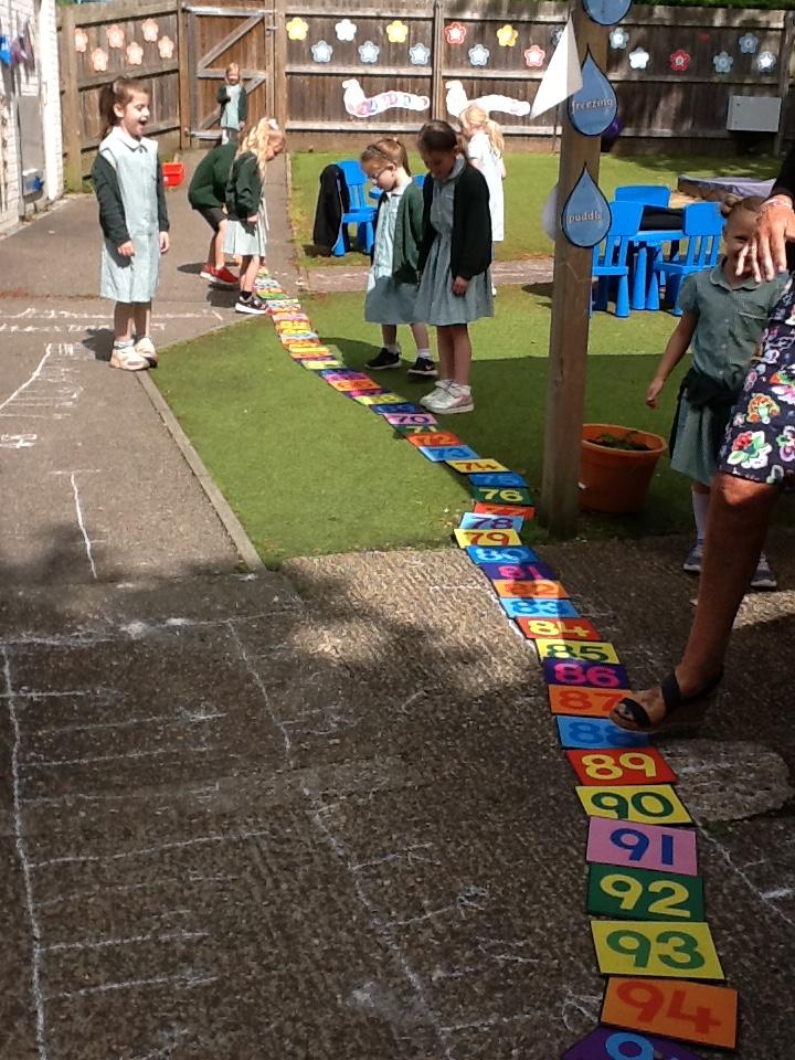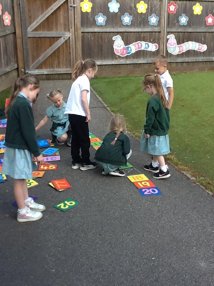 We have started the week of by looking at the number line to 100! We worked in pairs to complete number lines with a given starting number of anything between 0 - 100. They were then given the challenge of a number line going backwards which we all found a little tricky. Well done to the group of children who completed the number tile line all the way to 100, excellent team work!