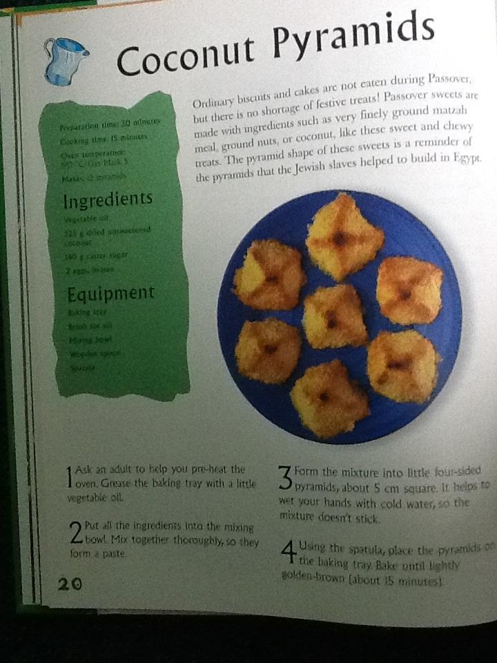 You are going to watch a video about the Jewish Celebration of Passover, the spring festival of freedom. It celebrates the Jews' escape from slavery in Egypt more than 3,000 years ago. After this you can try making Coconut Pyramids, which are a reminder of the pyramids that the Jewish slaves helped to build in Egypt.