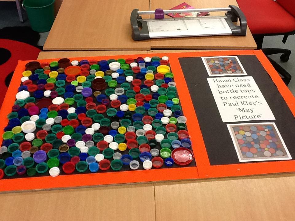 Each term the school focuses on a different artist. This term the artist is Paul Klee. Hazel class recreated one of his paintings, using bottletops.
