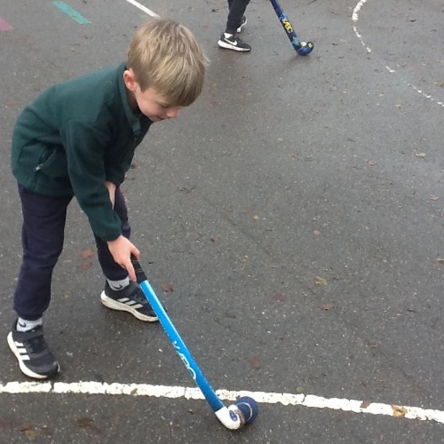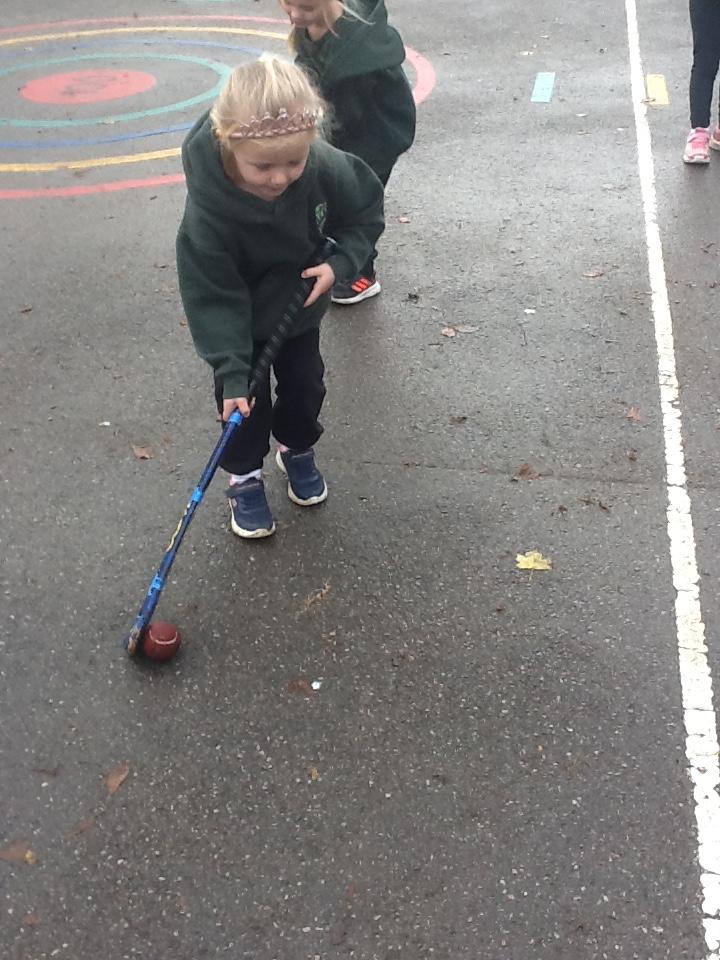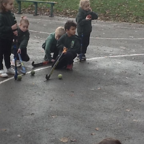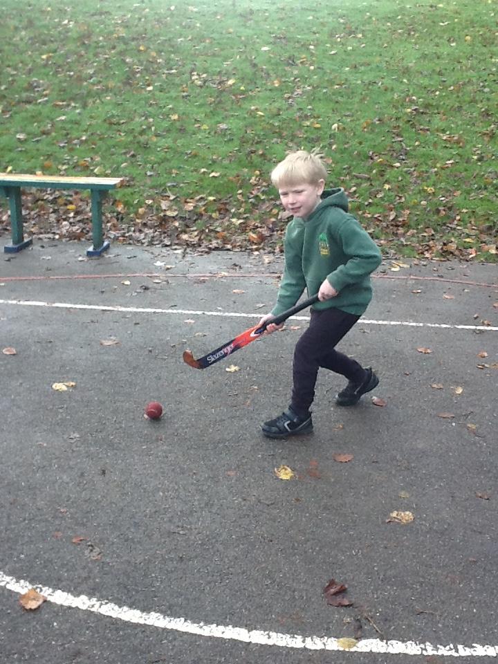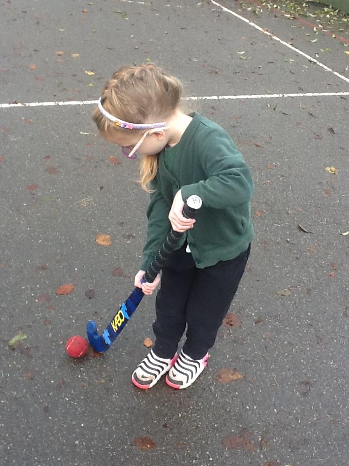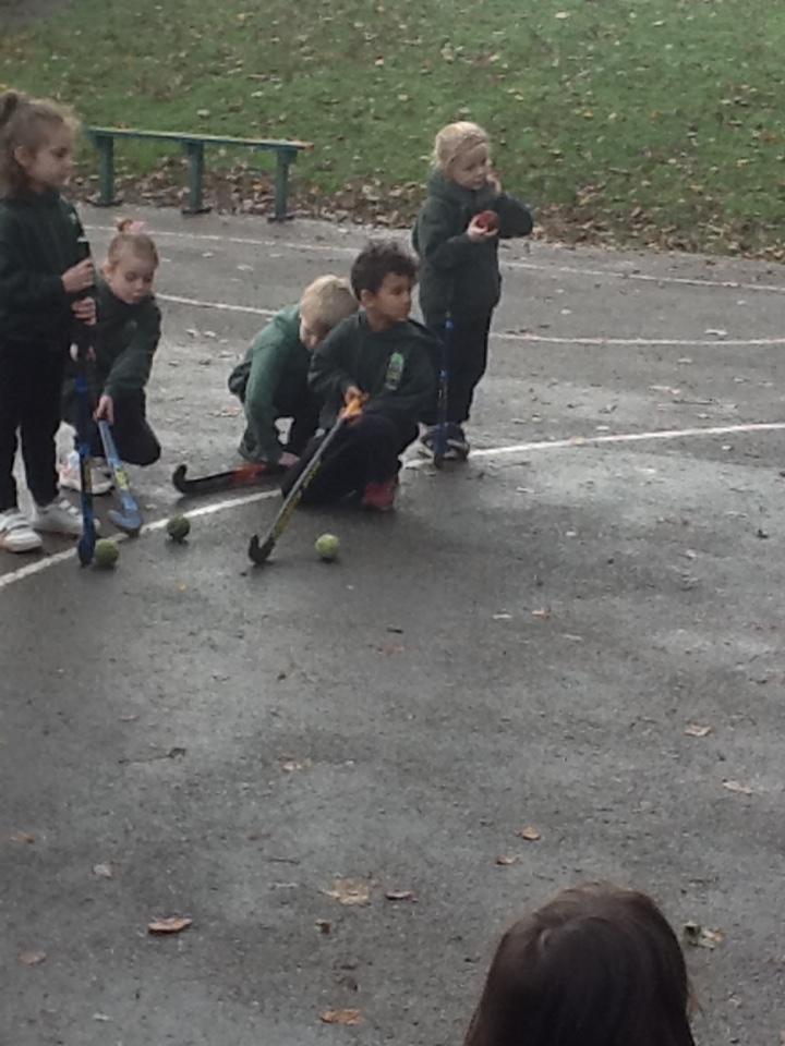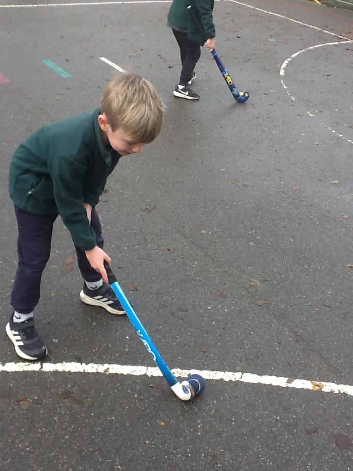 In hockey the children practised, dibbling, passing and trapping the ball with the hockey stick.