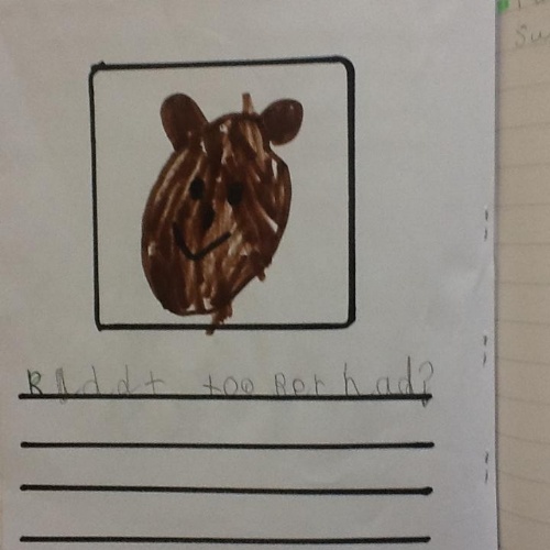 The culmination of our story 'I want my hat back' is for the children to write their own book. The children have roleplayed it and all know what they want to write