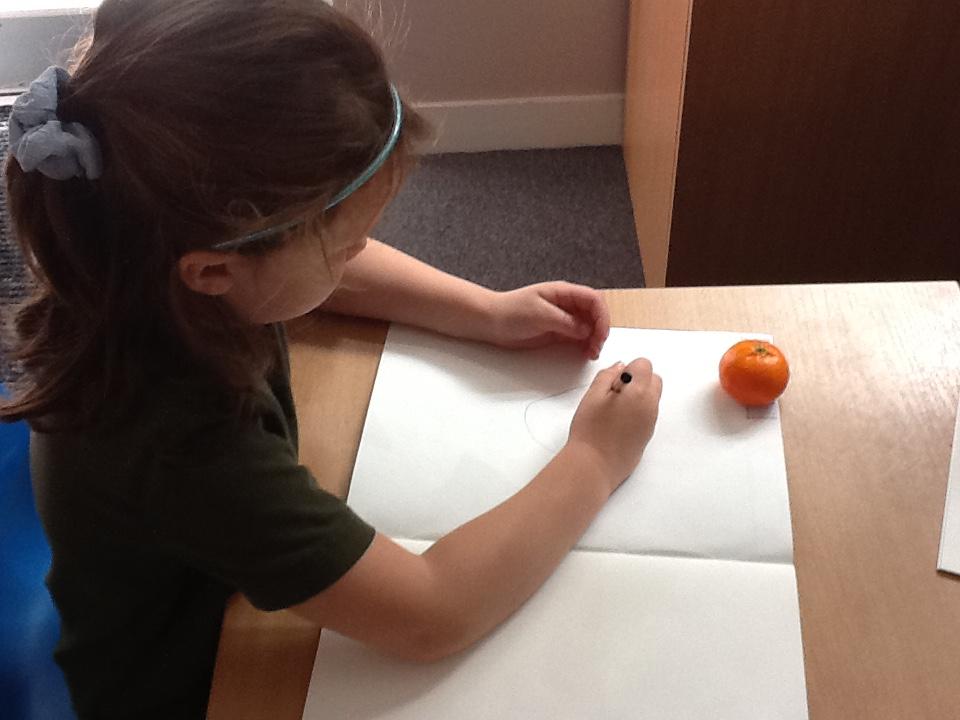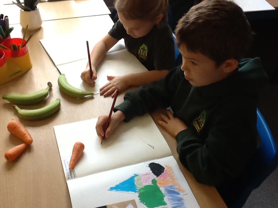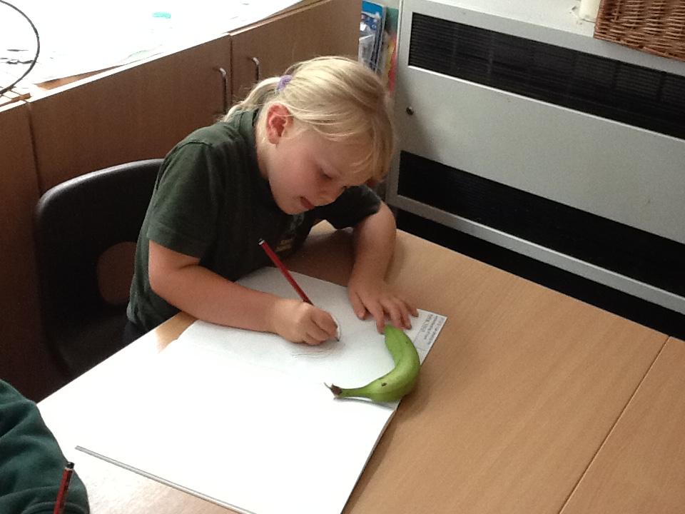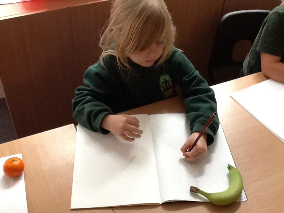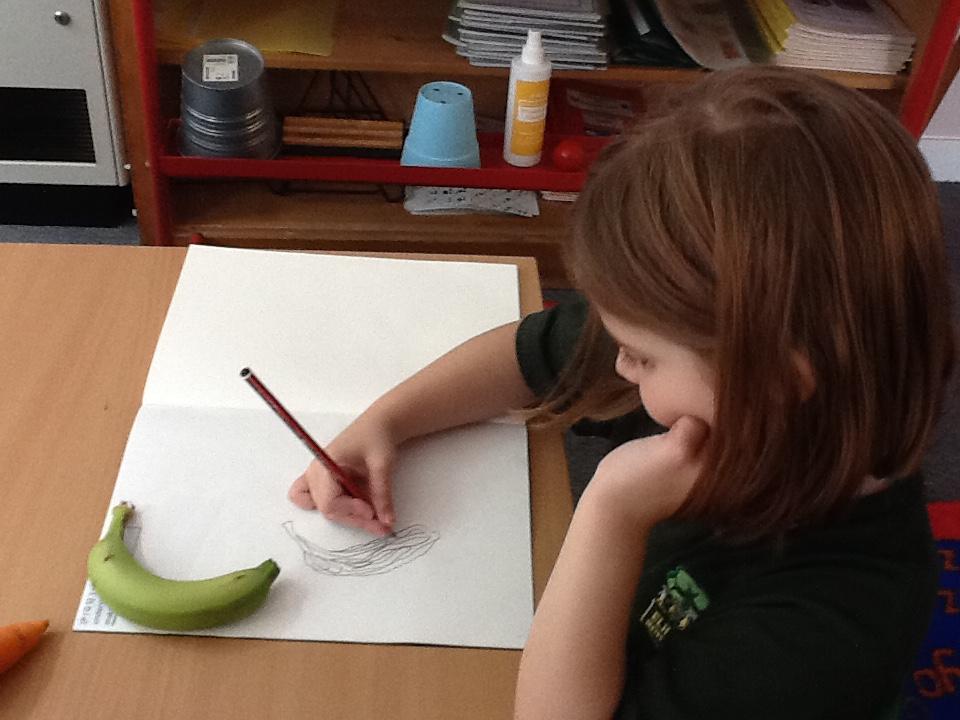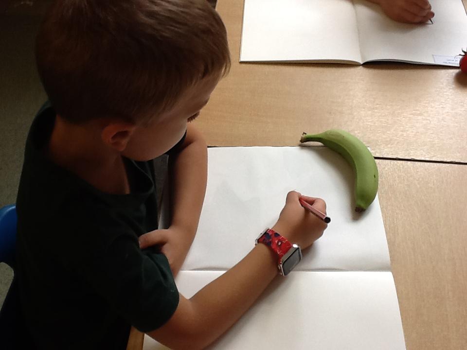 We have spent an afternoon doing observational drawing.  The children tried to draw a piece of fruit or vegetable WITHOUT taking their pencil off the paper.  Some of the children took to this like ducks to water, others really struggled with the idea that they could go back over the same line to get back to the beginning.  It was also very interesting to see that they struggle to draw what they actually see and instead draw what is in their head!  Developmentally, they are not quite ready for this...