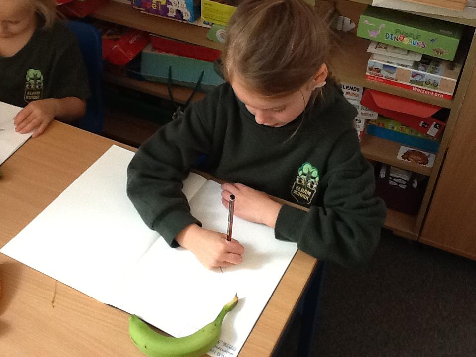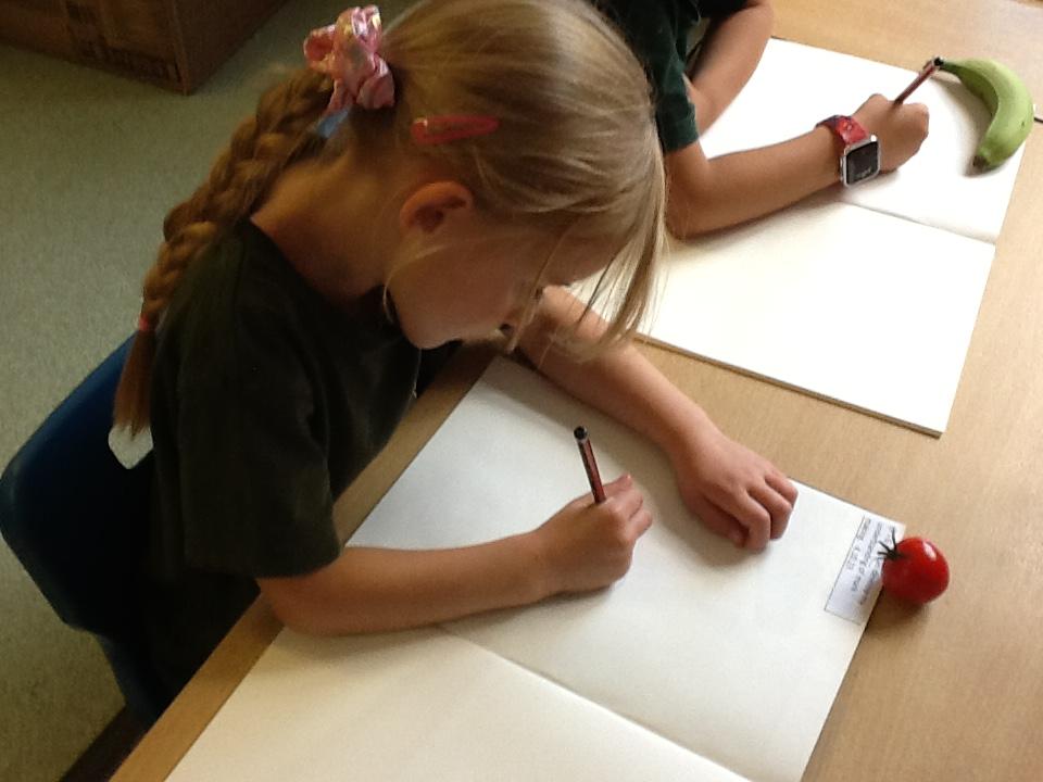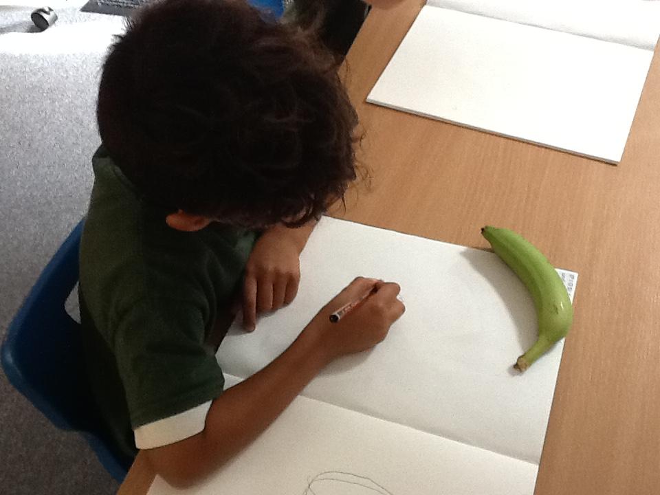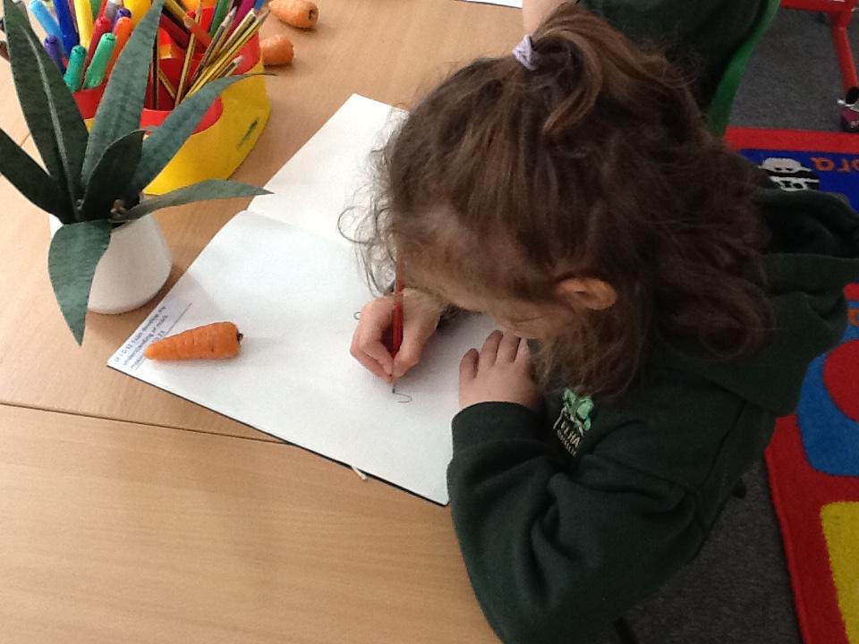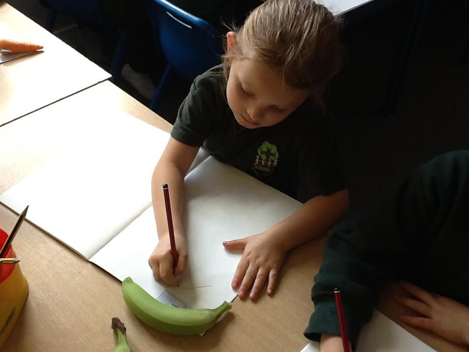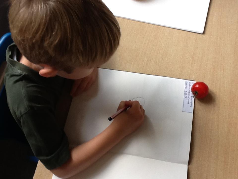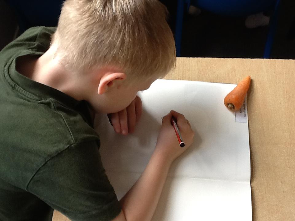 We have spent an afternoon doing observational drawing.  The children tried to draw a piece of fruit or vegetable WITHOUT taking their pencil off the paper.  Some of the children took to this like ducks to water, others really struggled with the idea that they could go back over the same line to get back to the beginning.  It was also very interesting to see that they struggle to draw what they actually see and instead draw what is in their head!  Developmentally, they are not quite ready for this...