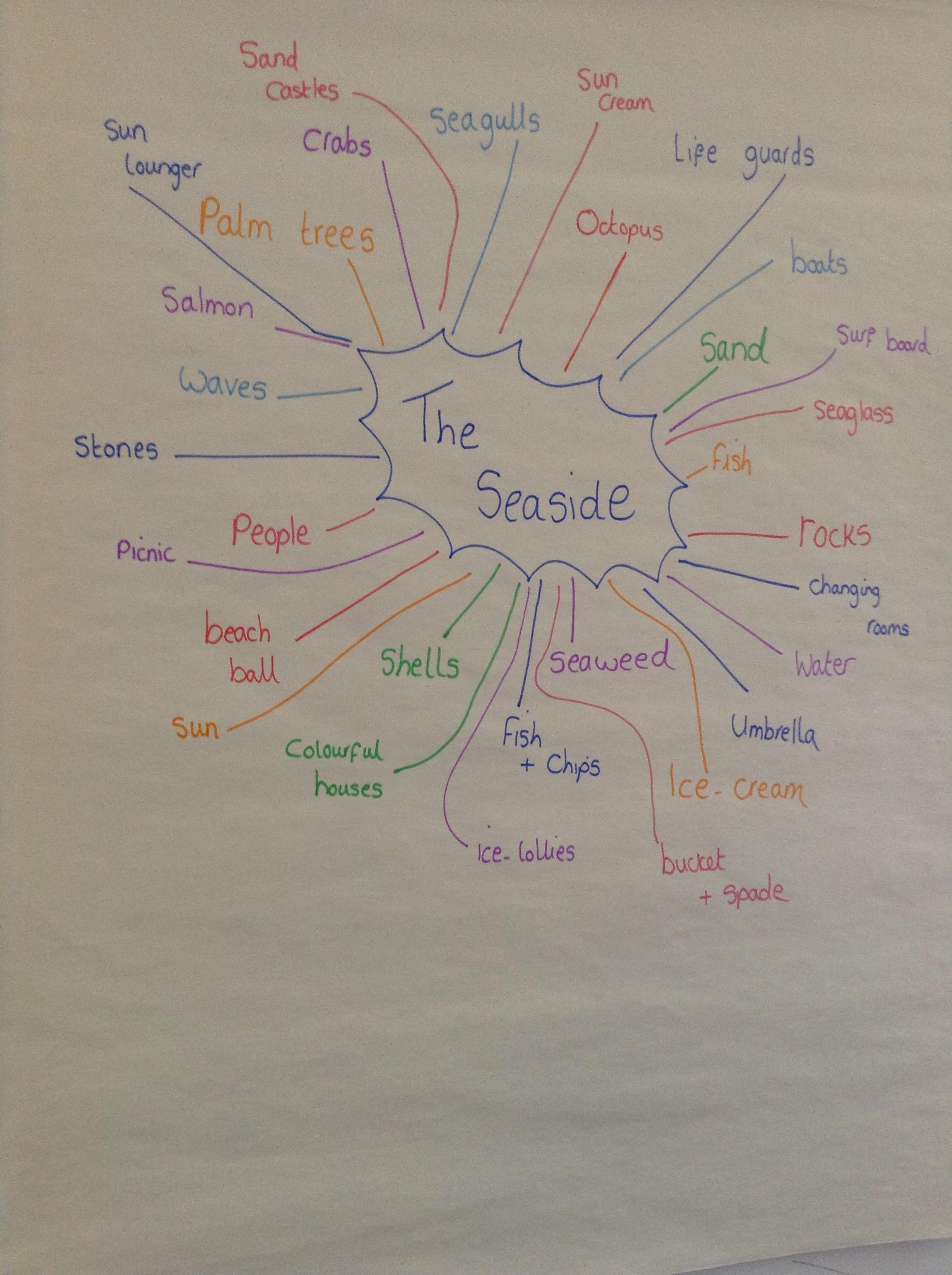 This term we will be looking at seaside holidays past and present. Today the children contributed ideas to a class mind map coming up with lots of words or activities linked to the seaside. They then wrote sentences about their favourite thing to do at the beach and illustrated them.