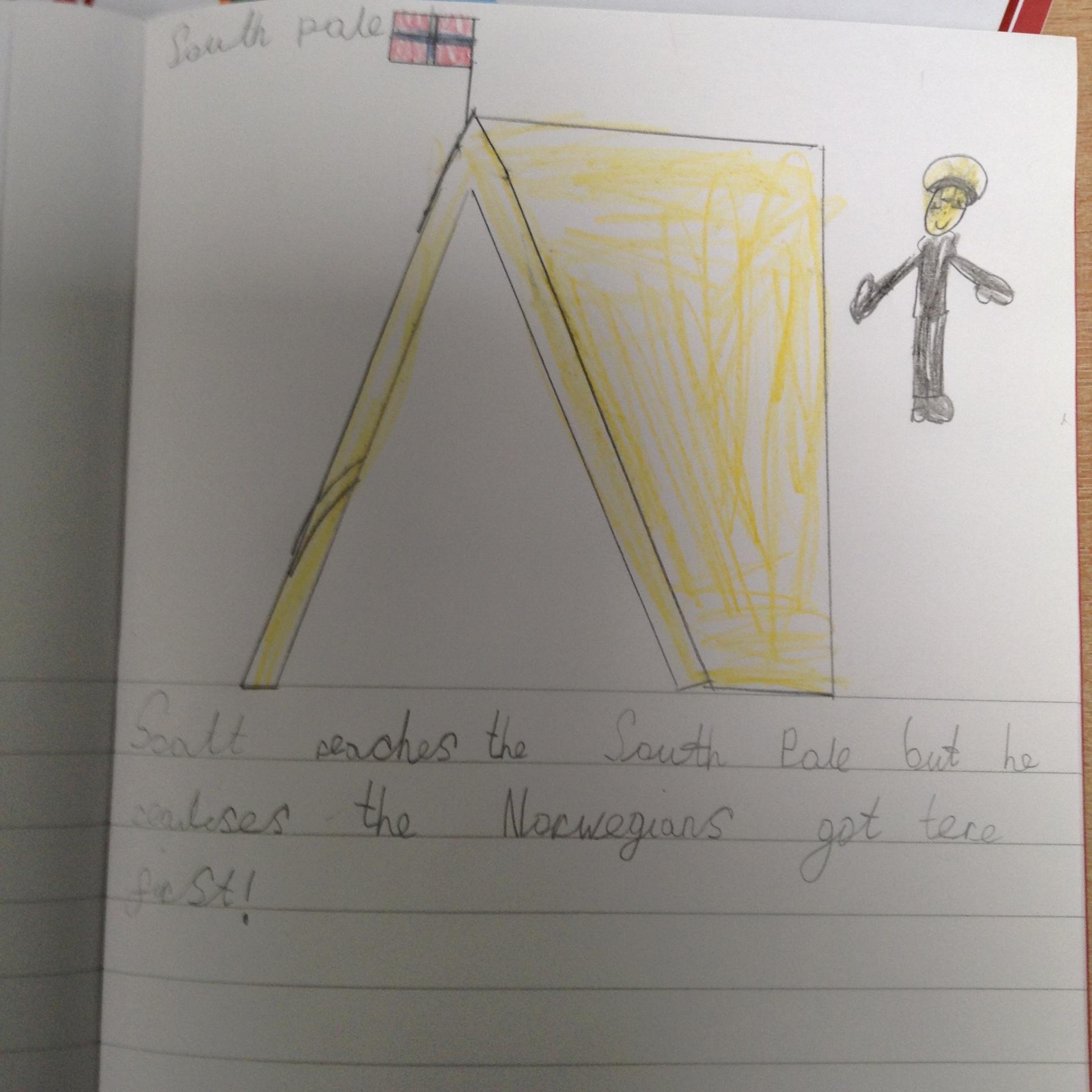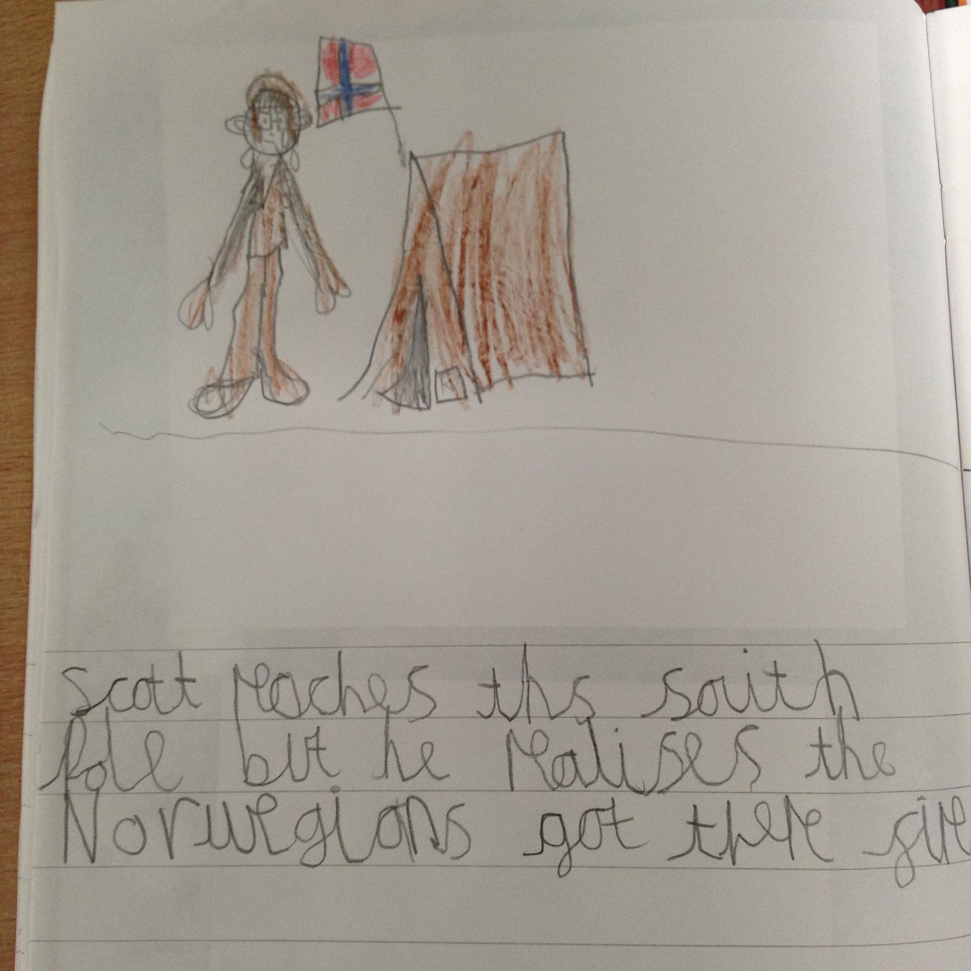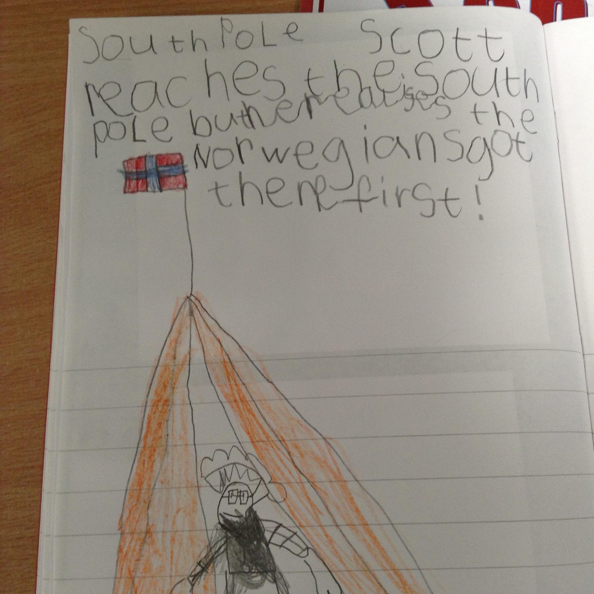 The children have been finding out how Scott managed to get to the South Pole and what happened when he go there. They used evidence sequence events and discussed the setbacks he faced. Scott made it to the South Pole but when he got there he realised the Norwegians had got there first!