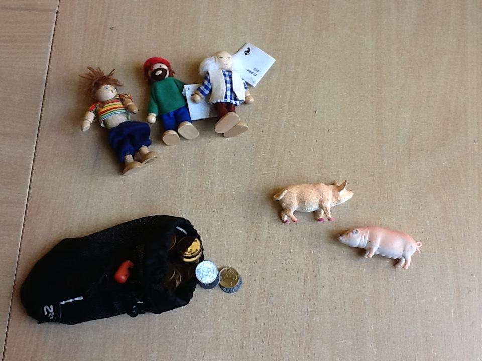The children used the props in the photo below to try to remember the Story of the Lost (Prodigal) Son, which we read briefly last week. They enacted the story and thought about what God was trying to say through the story.