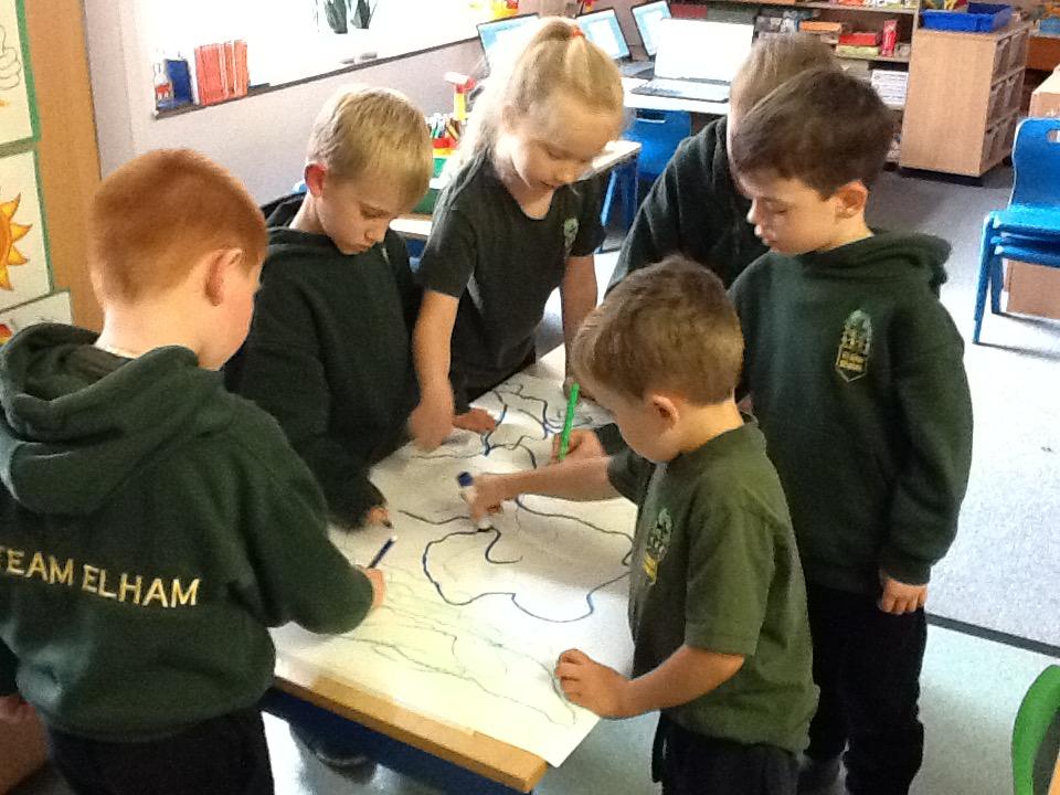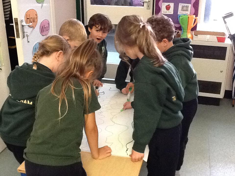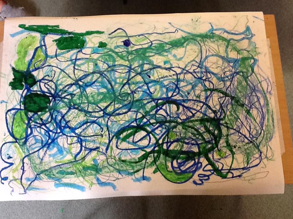 Lots of new vocabulary has been learned in art. We are looking at line making and the children have been using: horizontal, vertical, diagonal, wavy, broken and crosshatch. The ones they find hardest are vertical and crosshatch (they understand crosshatch but keep saying crosspatch!). Today the children worked co-operatively to produce a sea scene, taking inspiration from professional paintings and music.This is where they have got so far, but they will be adding sea-life to their art.