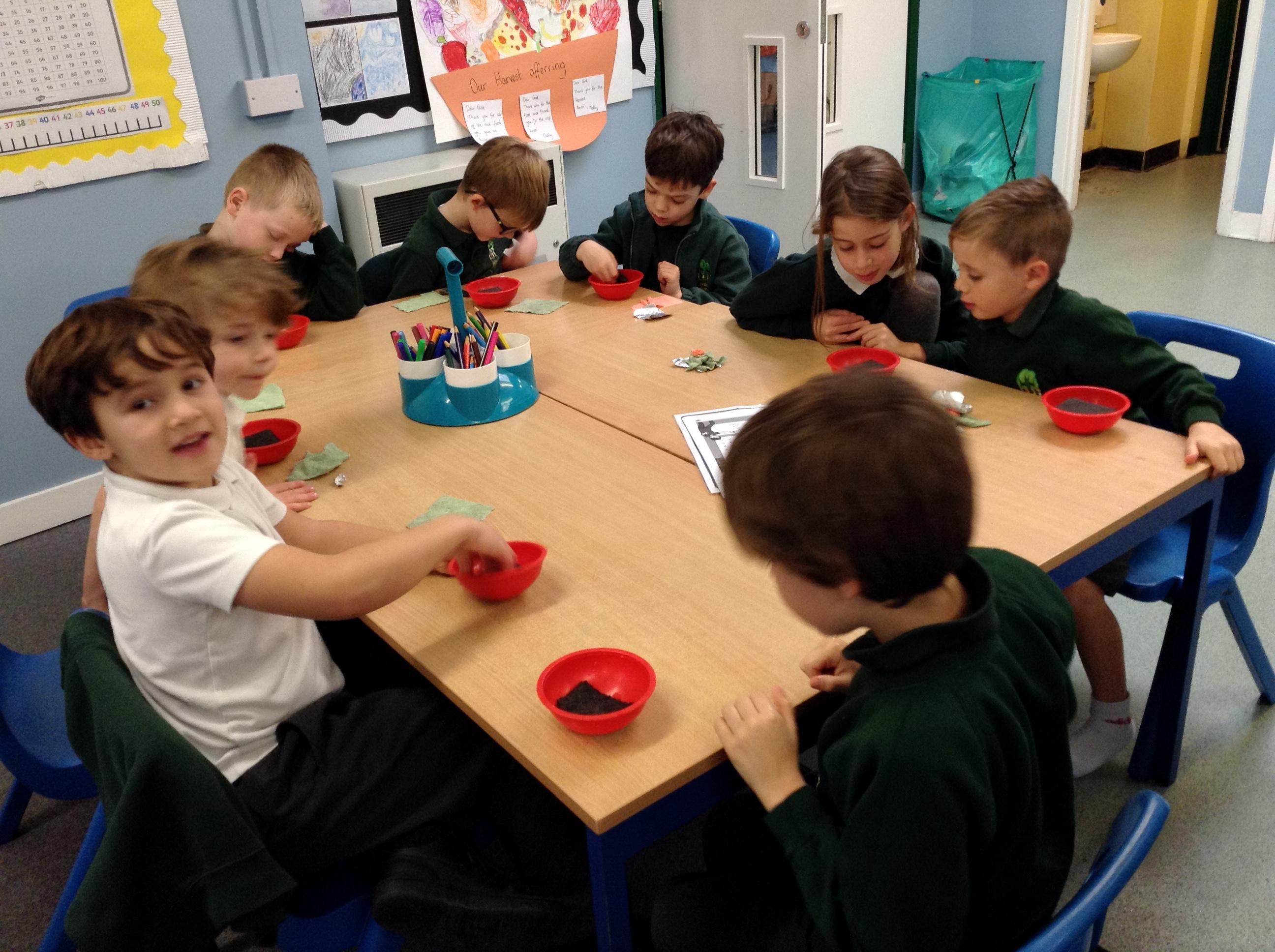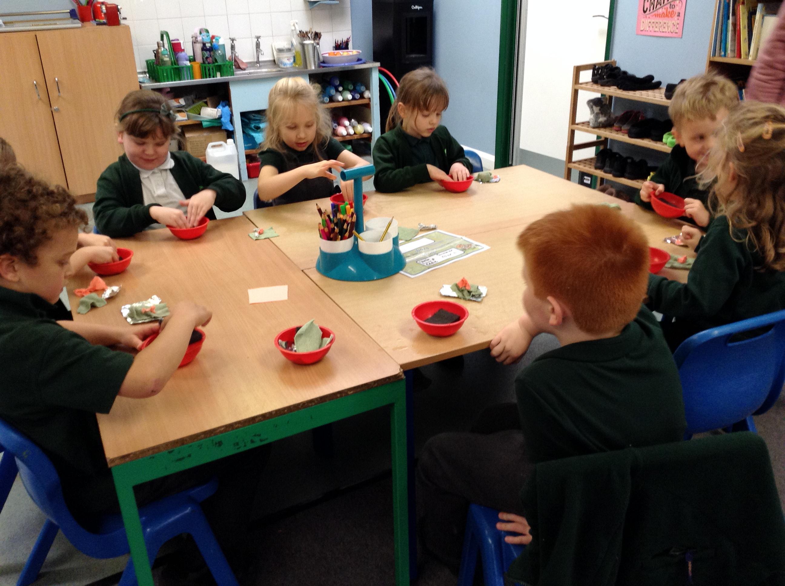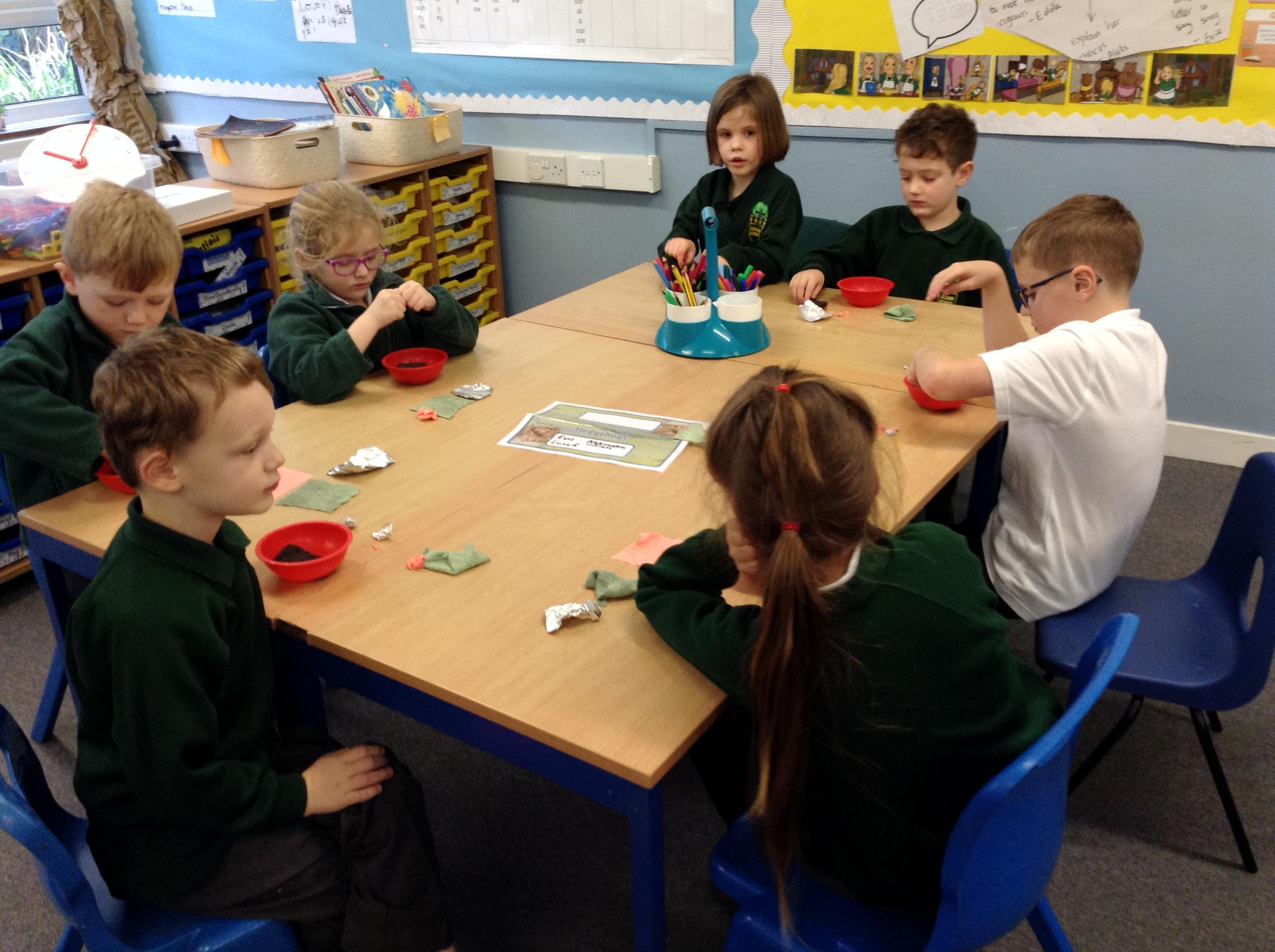 The Grumpy Wizard sent a message to us today, he had spilt a potion all over the floor and could we advise him on what material would be best to use to clear it up. The children spent the afternoon testing a range of different materials to see which were absorbent and non-absorbent. We decided the cloth and the sponge were the best materials for the job!