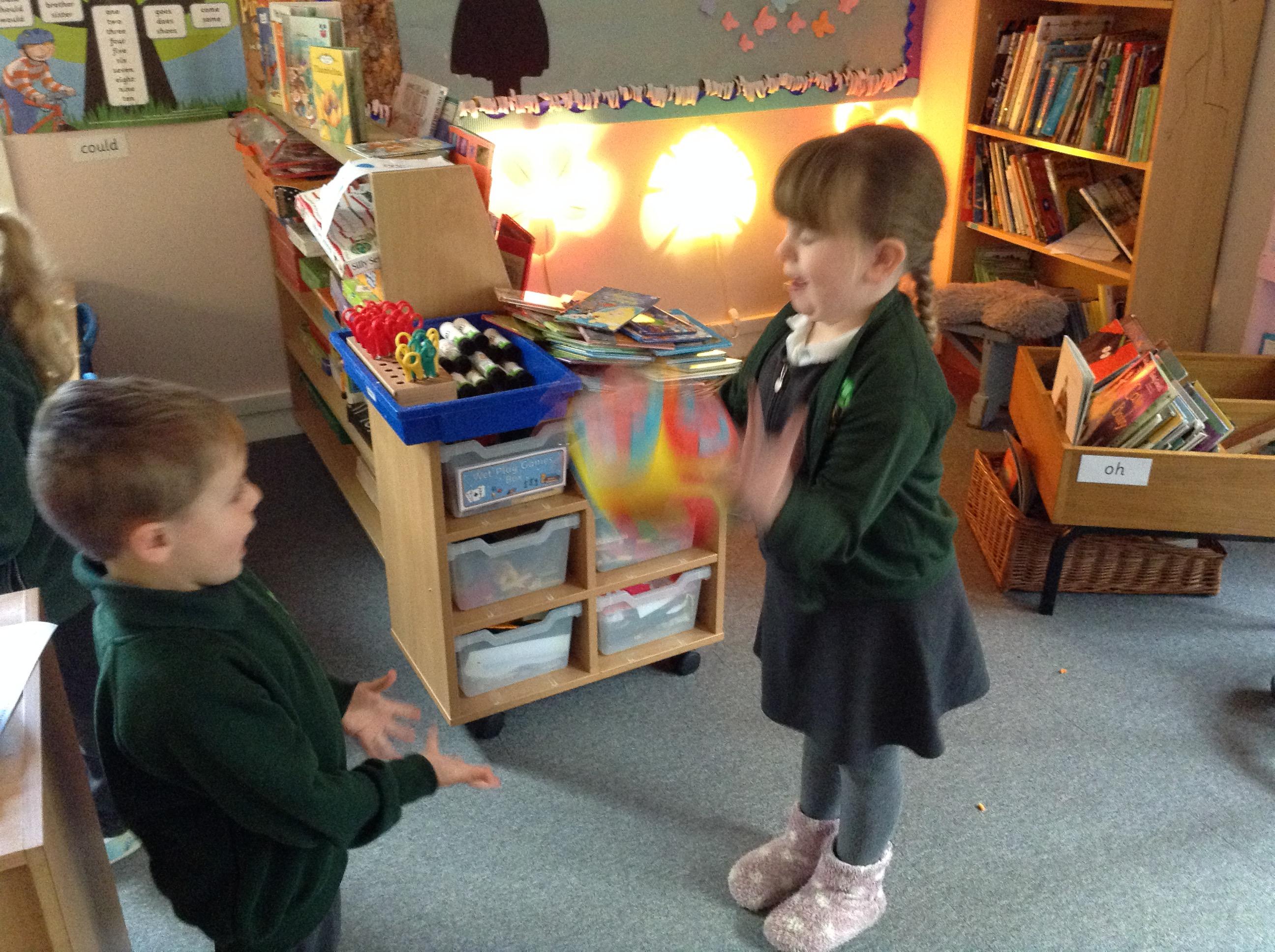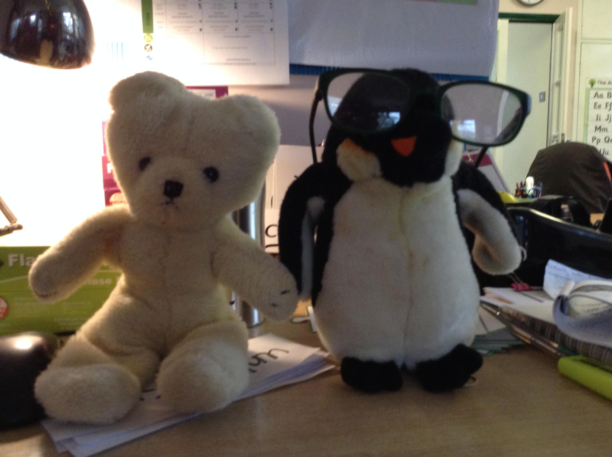 In English we are reading a new book about a penguin. He is rather naughty and has stolen William's glasses.