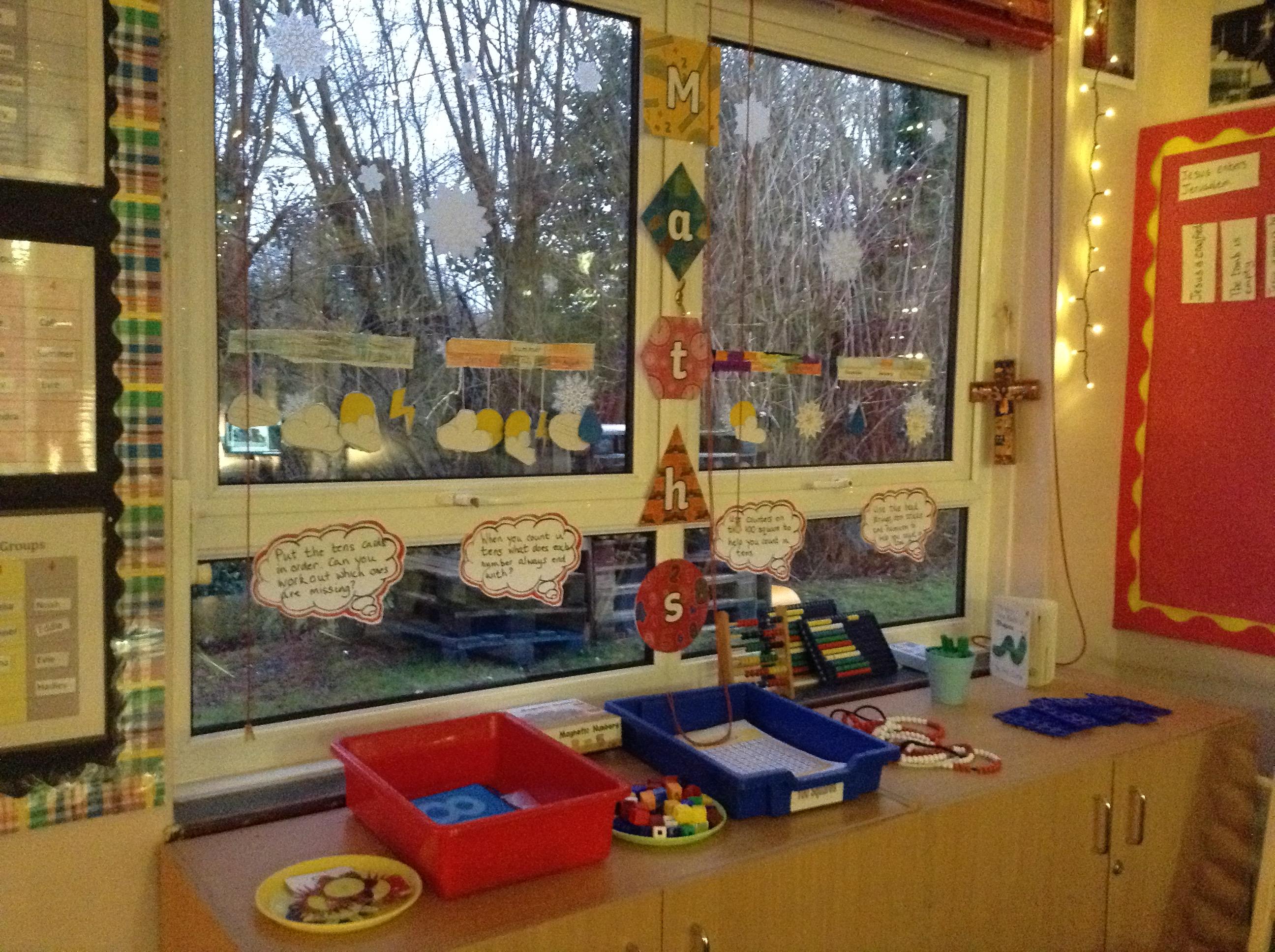 We have started off with big numbers and are now counting all the way up to 50 and learning how to count in tens. Our Maths learning area is an area we can go to during Early Morning Work to practise this. You can also see that we have been learning about the seasons and months of the year. We are learning about this in Science, but as this also comes under the topic of Maths we have put the childrens' mobiles up there too.