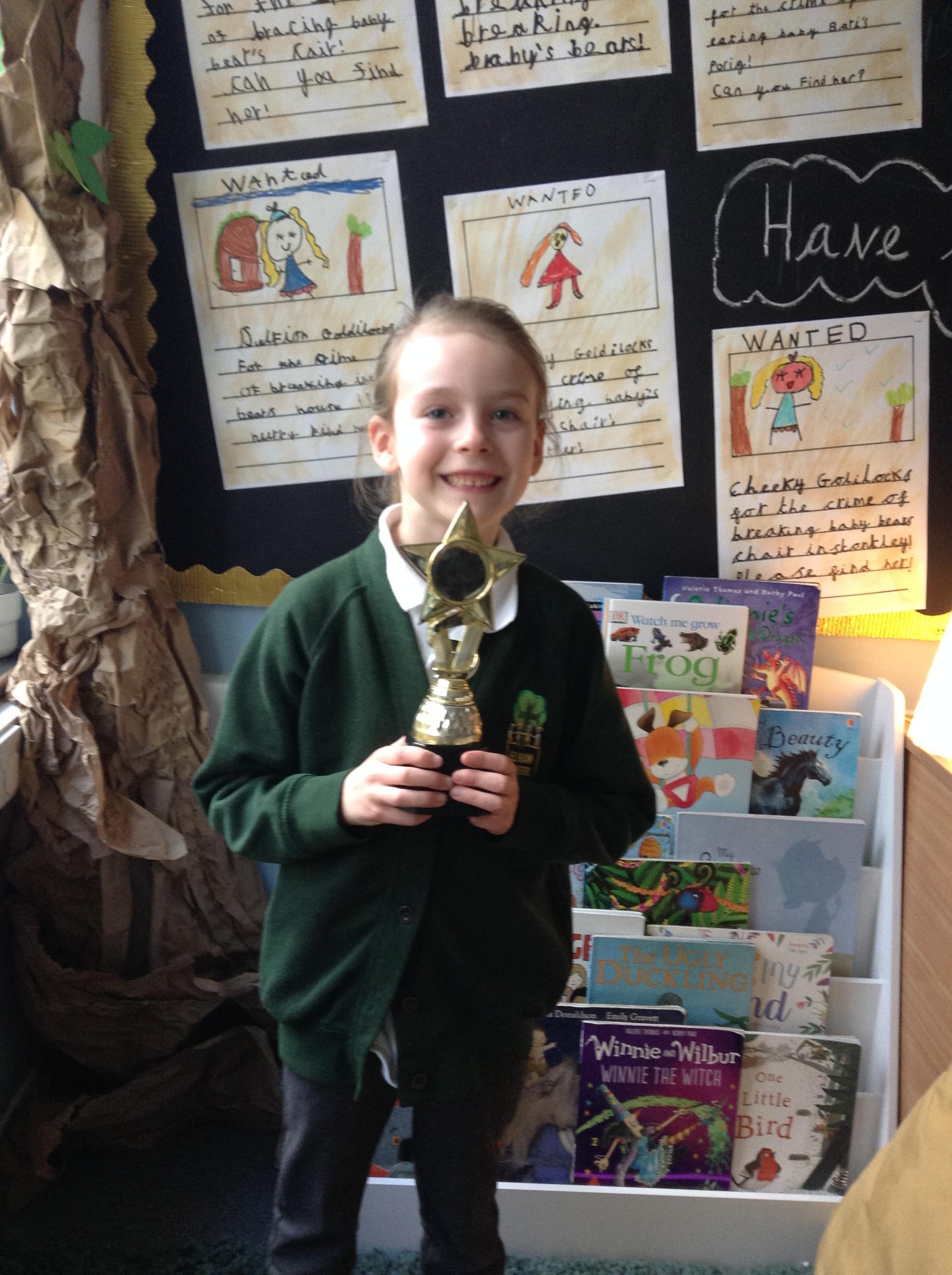 Jasmine is this weeks Star of the Week. I have been so impressed this week Jasmine as you have been so focussed. Your writing and spelling is really improving and I loved your wanted poster! In science you enjoyed sharing your knowledge about plants and you have worked hard in maths comparing and odering lengths and heights. You should feel super proud of yourself. Very well done!