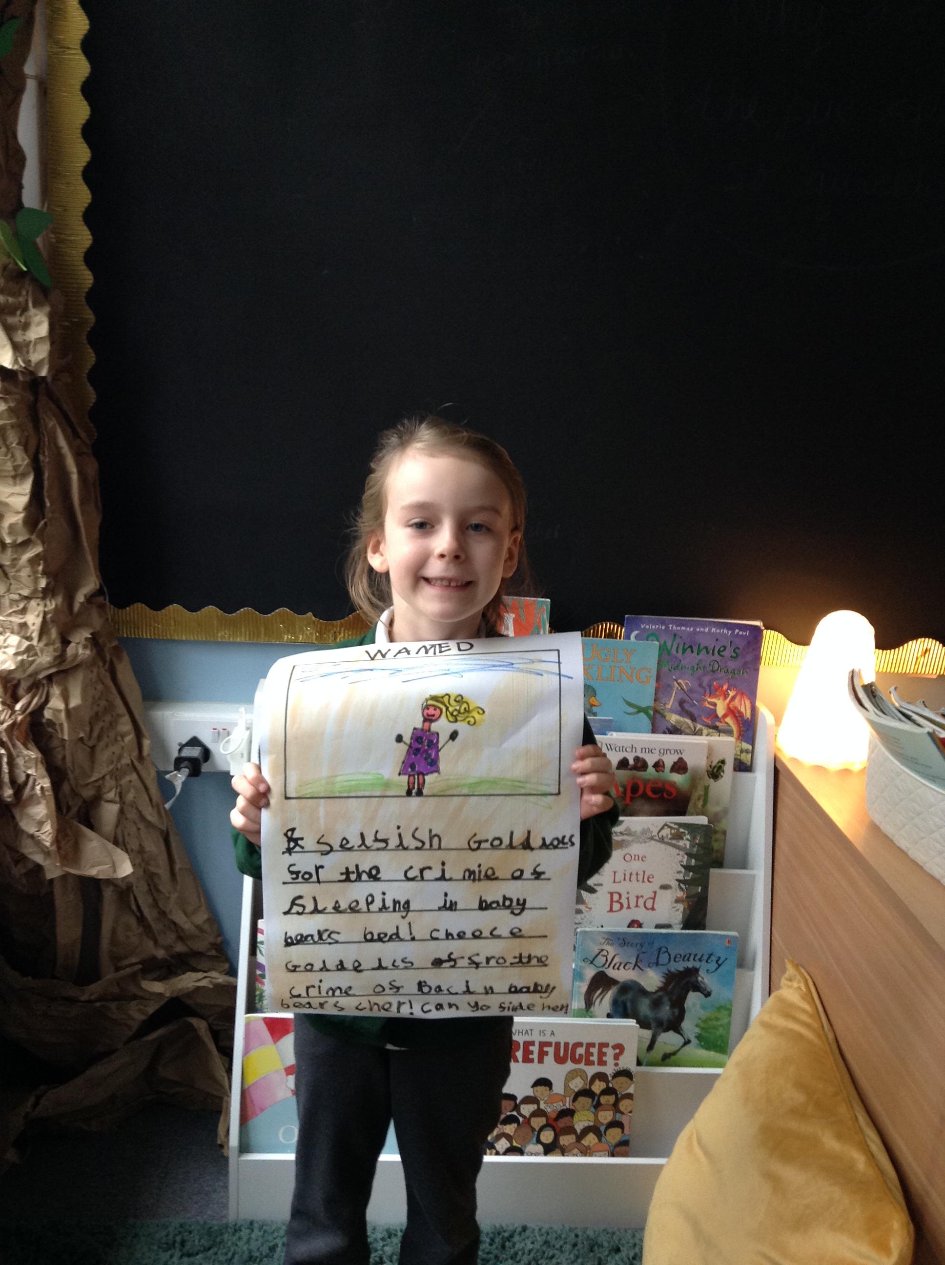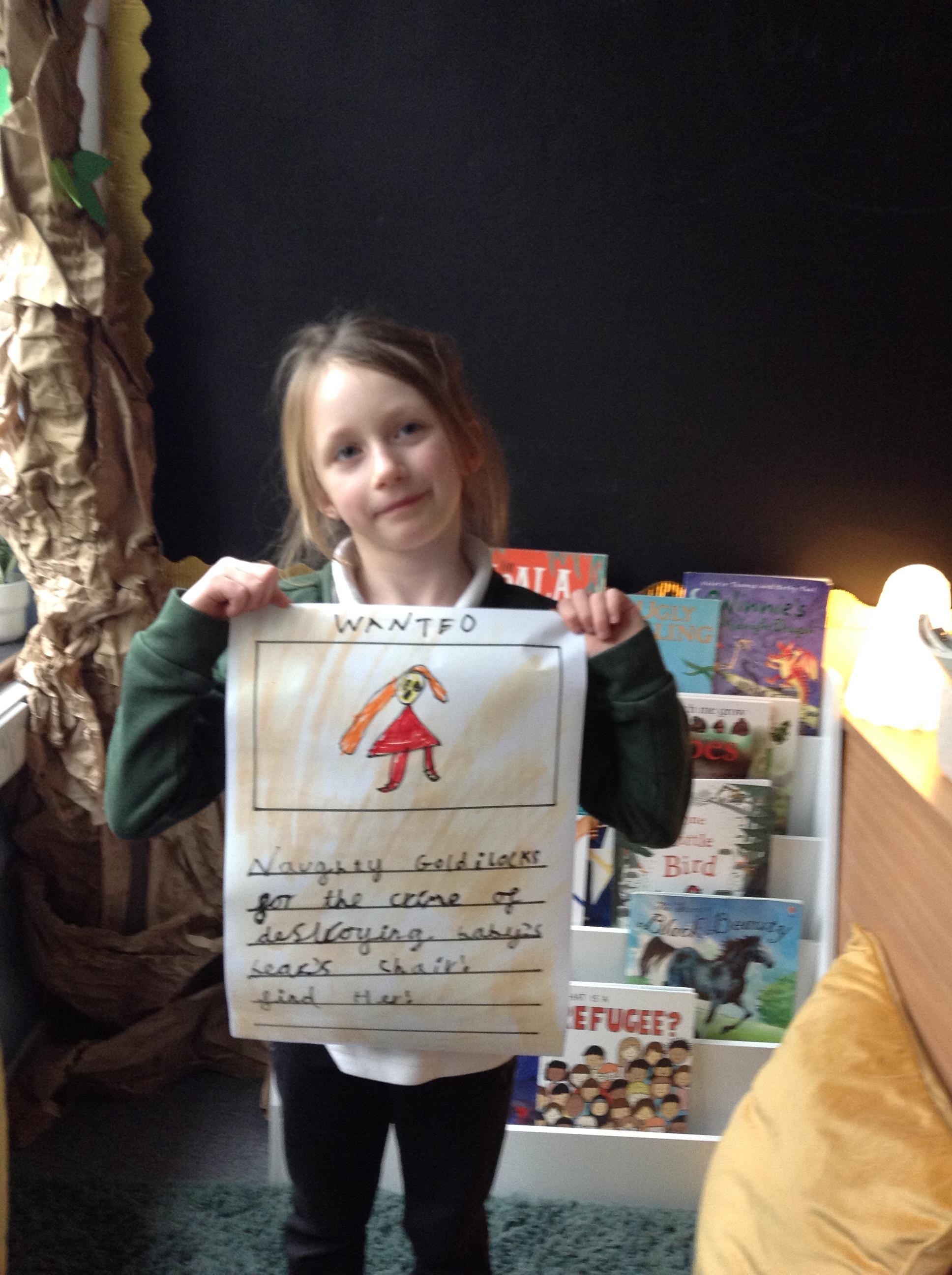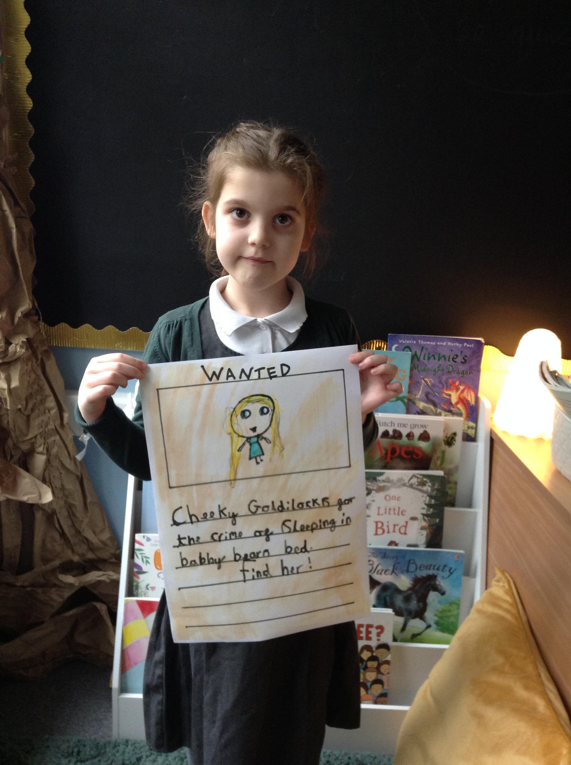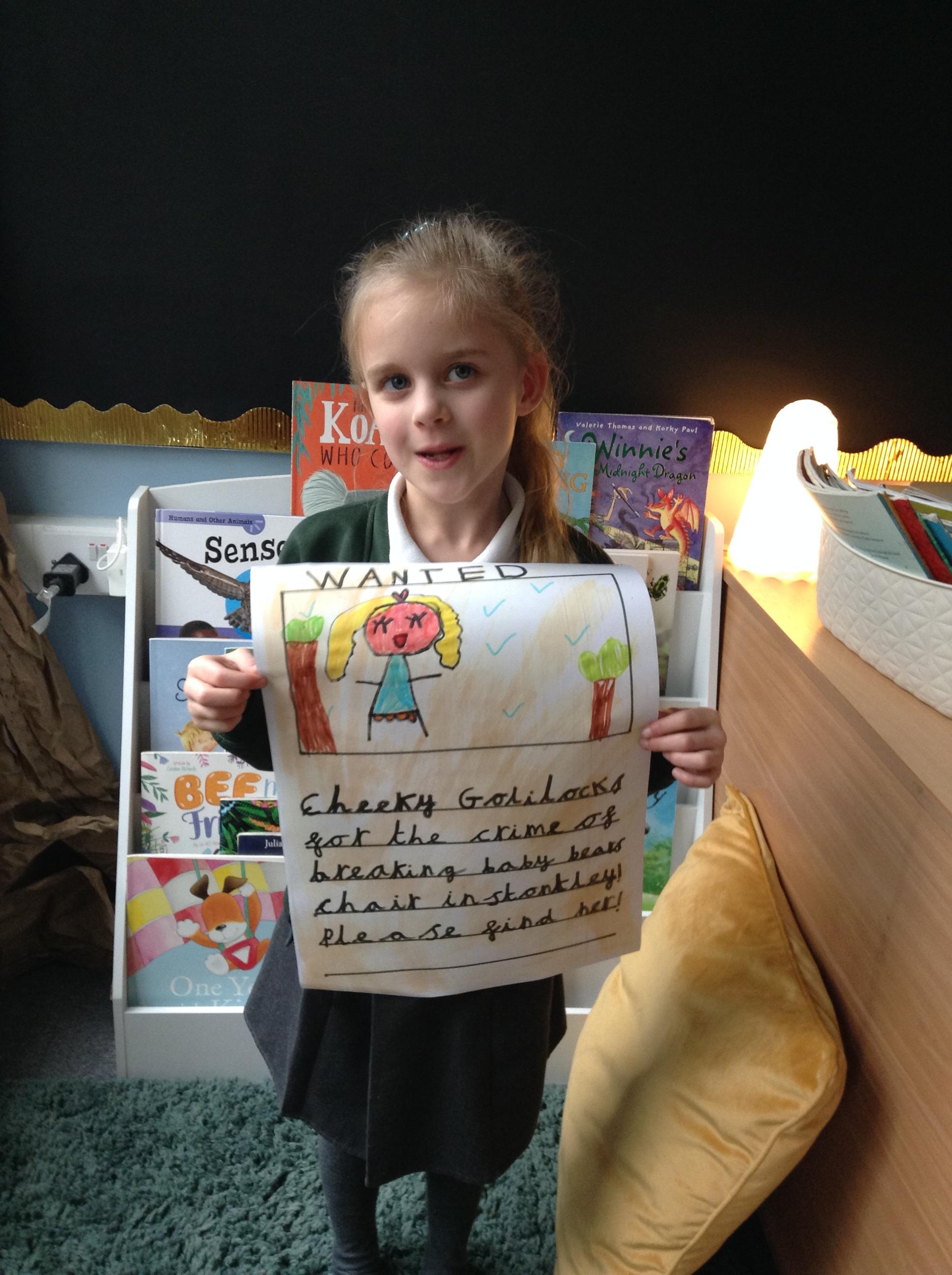 We have been reading Goldilocks and the Three Bears by Lauren Child. The children have used adjectives to describe her character and we are not happy that she ate the bears porridge and broke baby bears chair! We want to find Goldilocks and ask her why she decided to do these things. The children have created wanted posters using an adjective and then linked this to an action which describes Goldilocks.