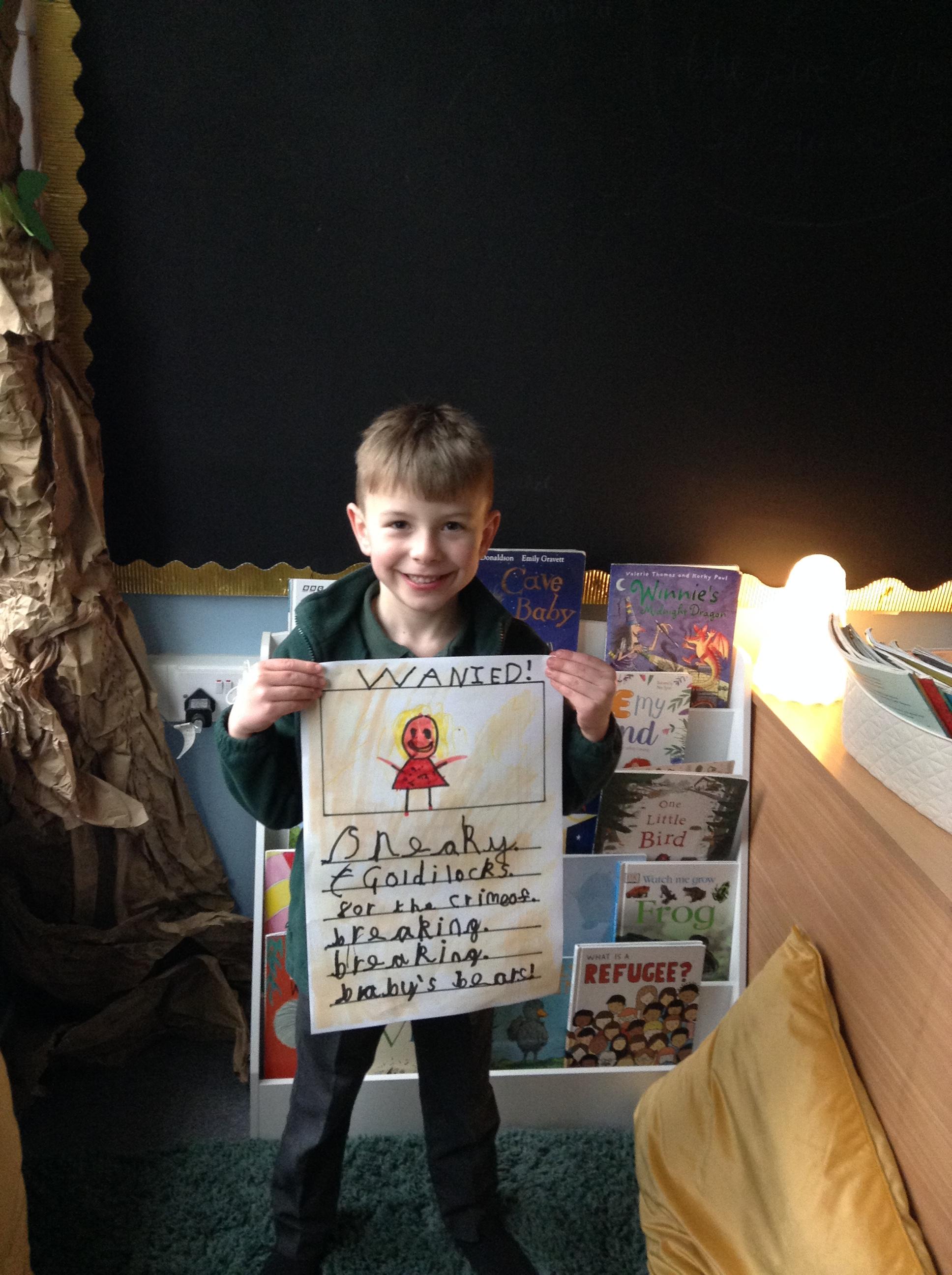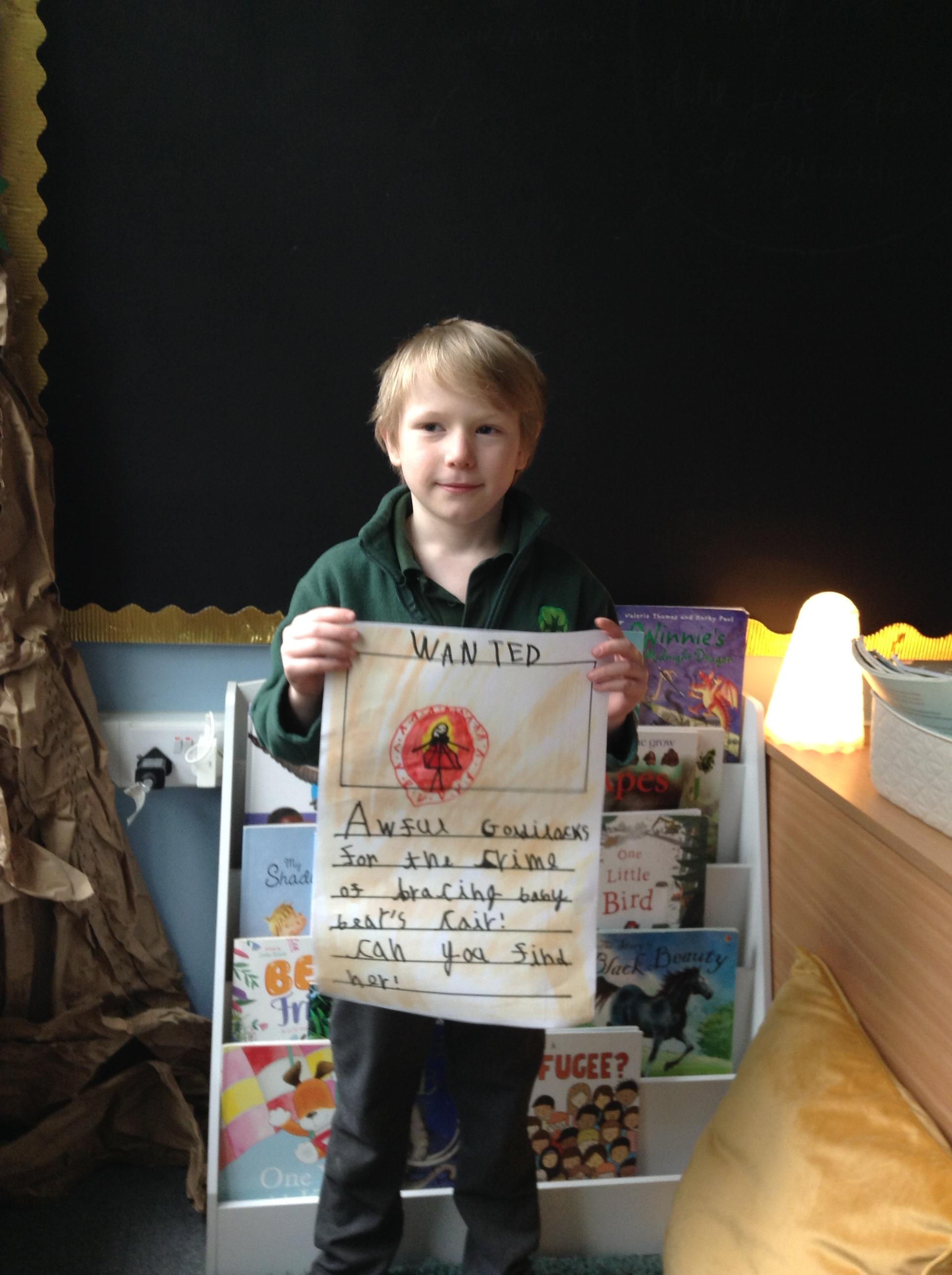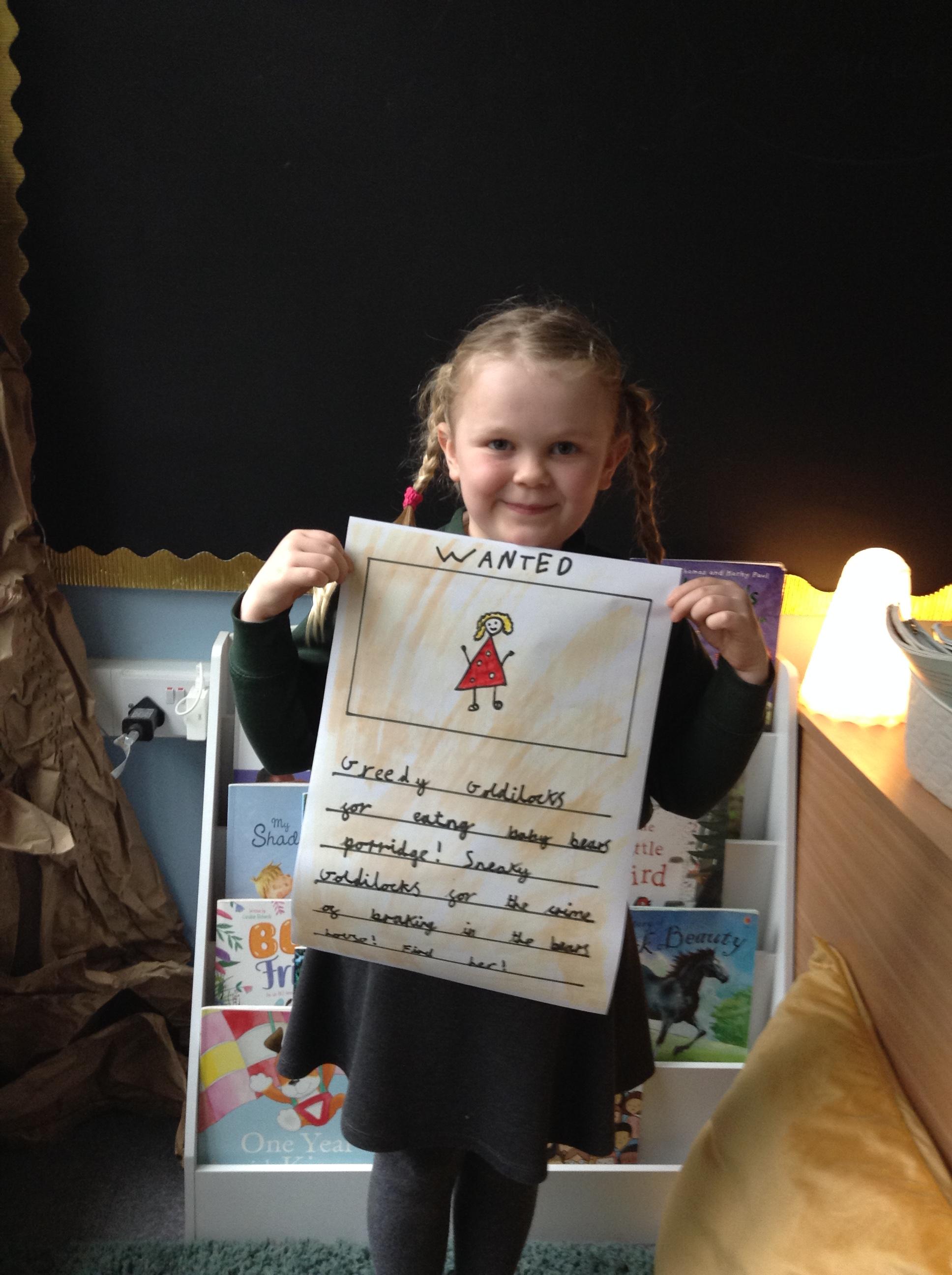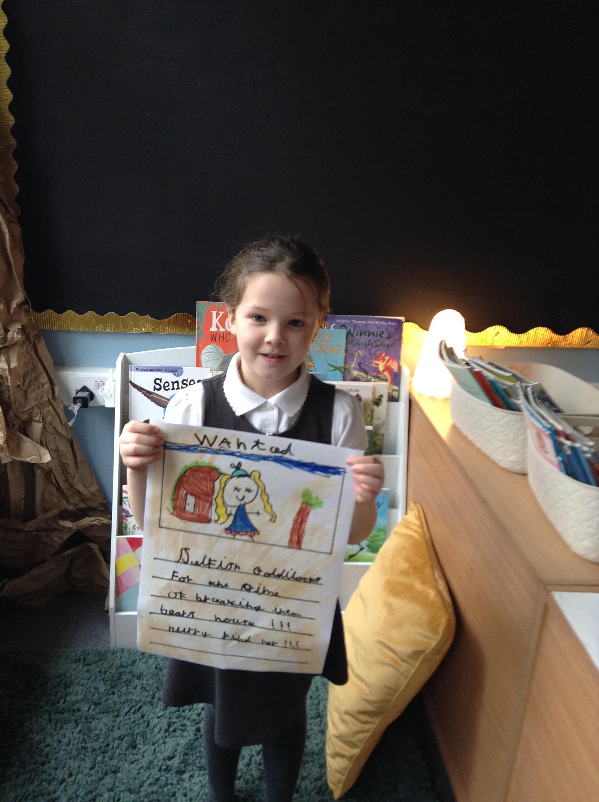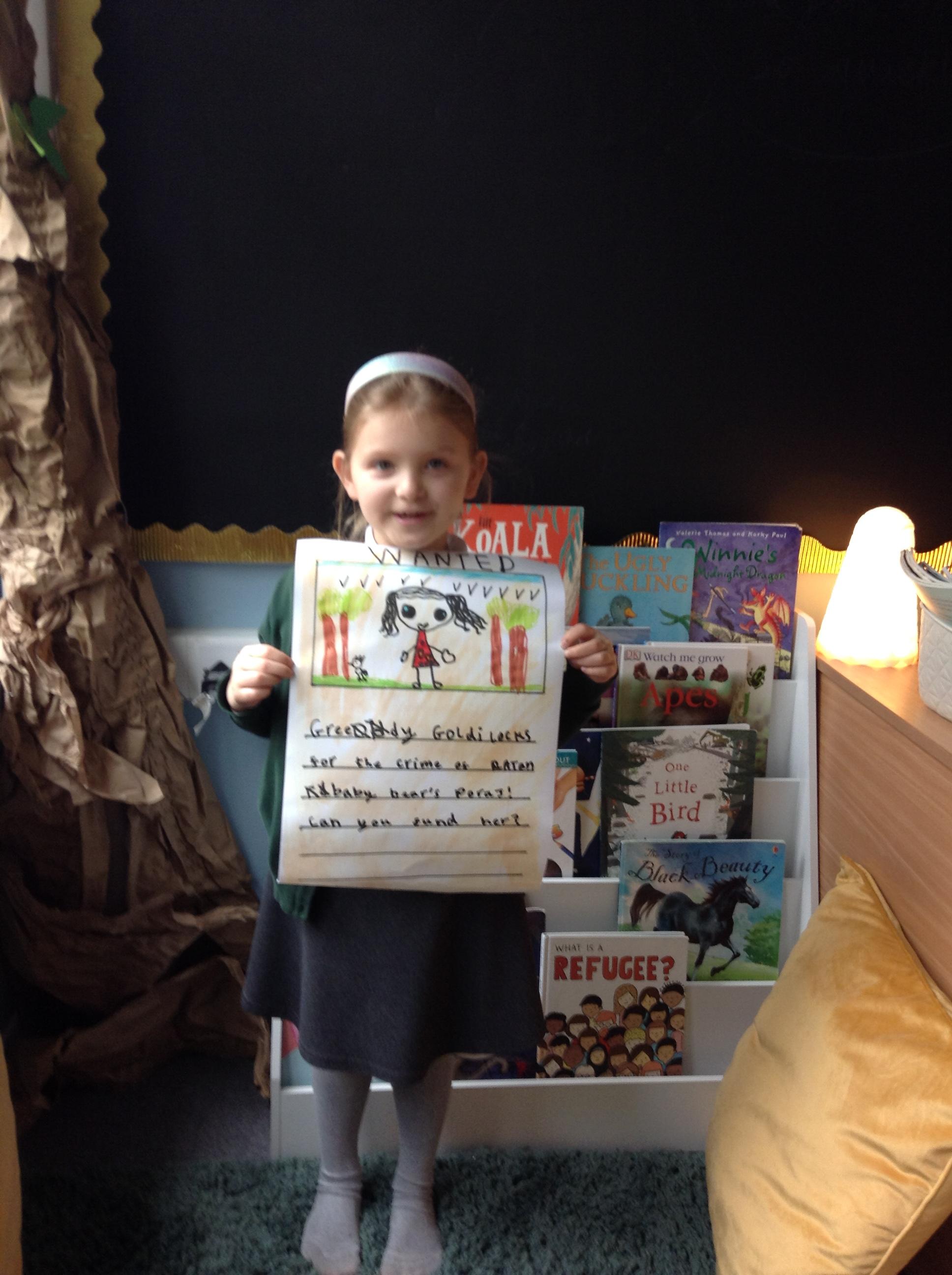 We have been reading Goldilocks and the Three Bears by Lauren Child. The children have used adjectives to describe her character and we are not happy that she ate the bears porridge and broke baby bears chair! We want to find Goldilocks and ask her why she decided to do these things. The children have created wanted posters using an adjective and then linked this to an action which describes Goldilocks.