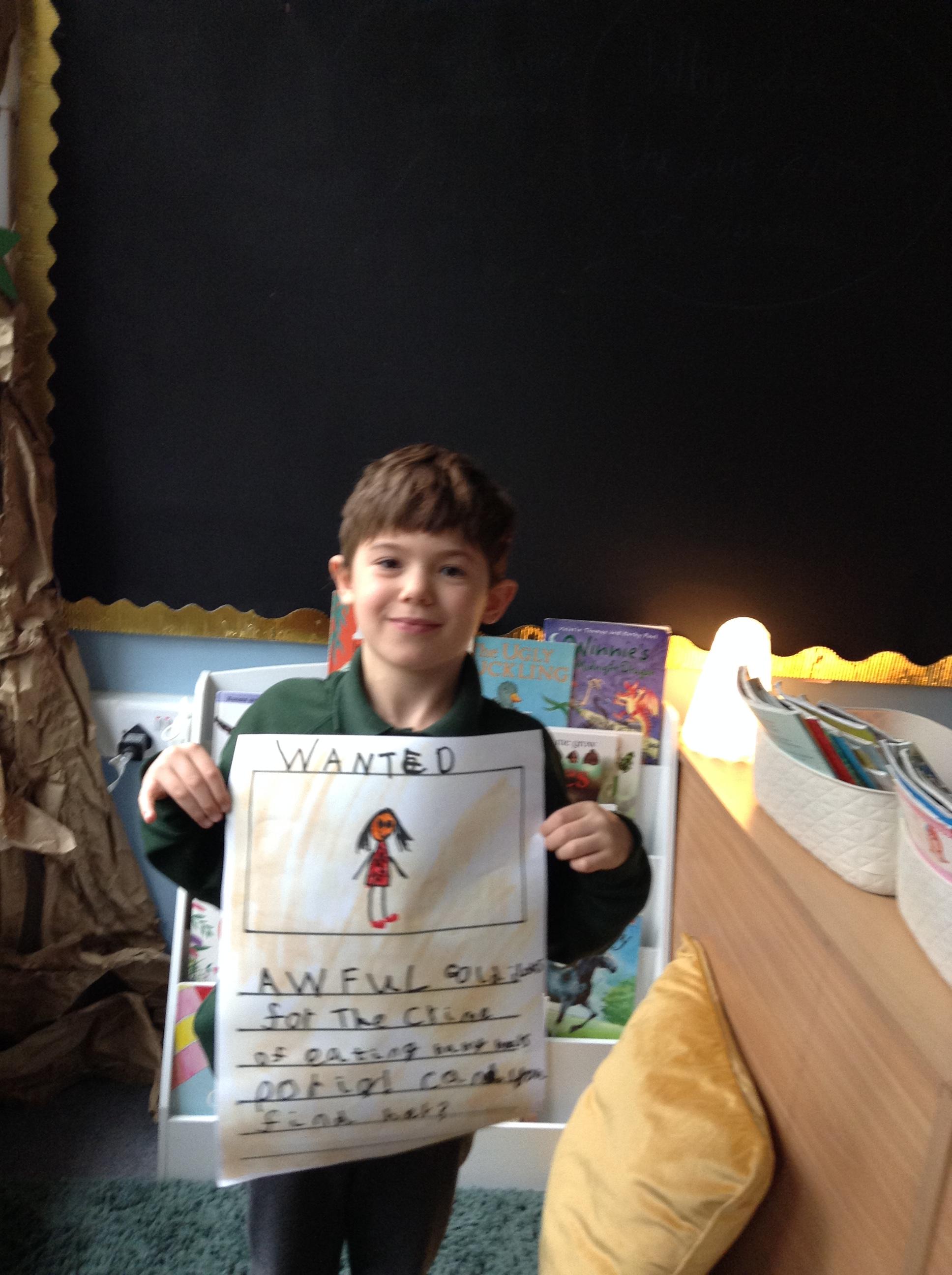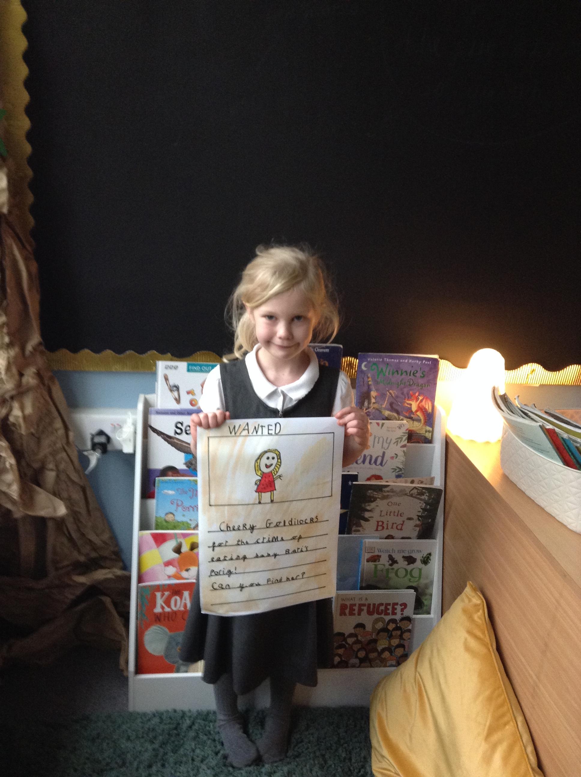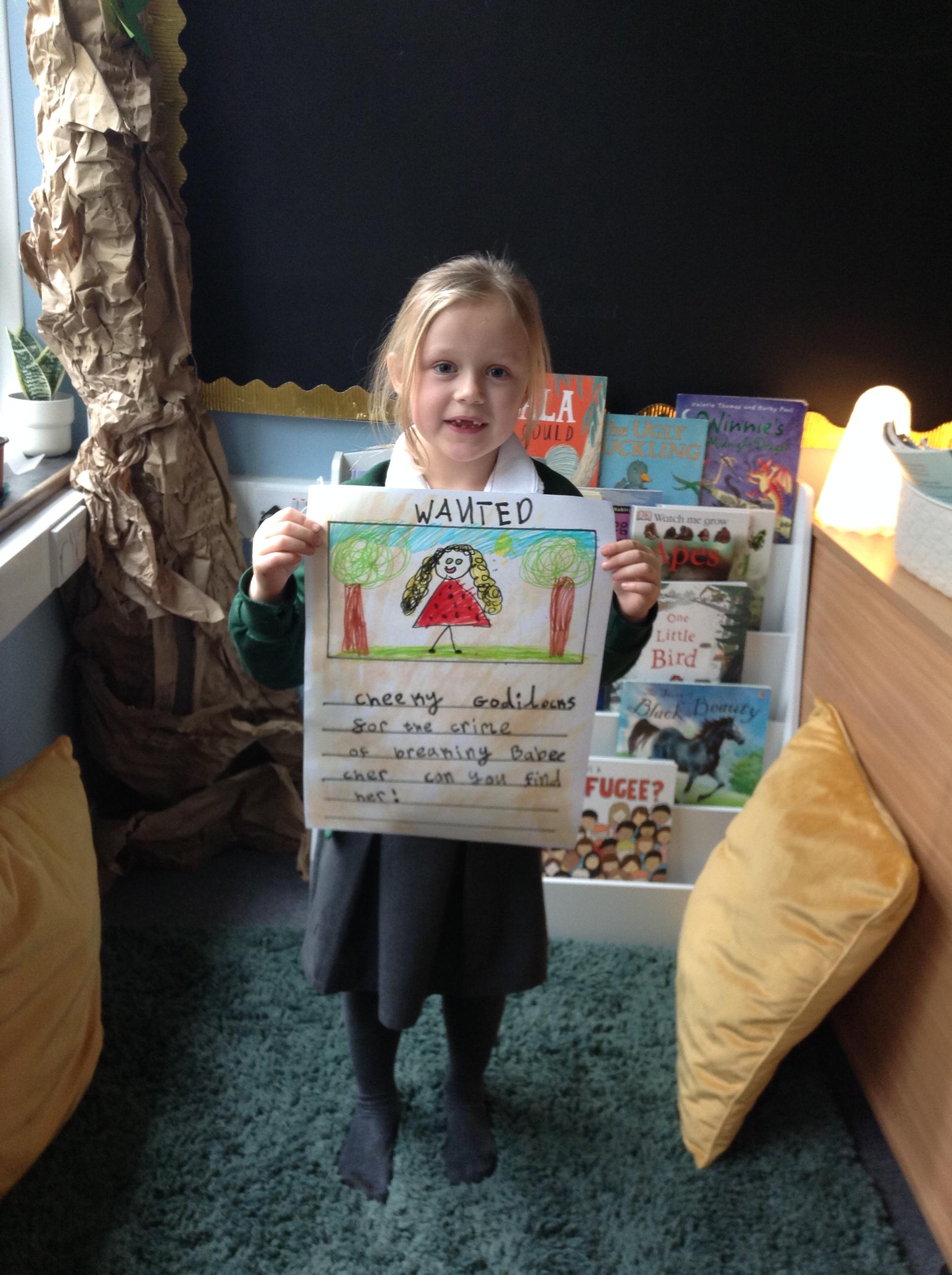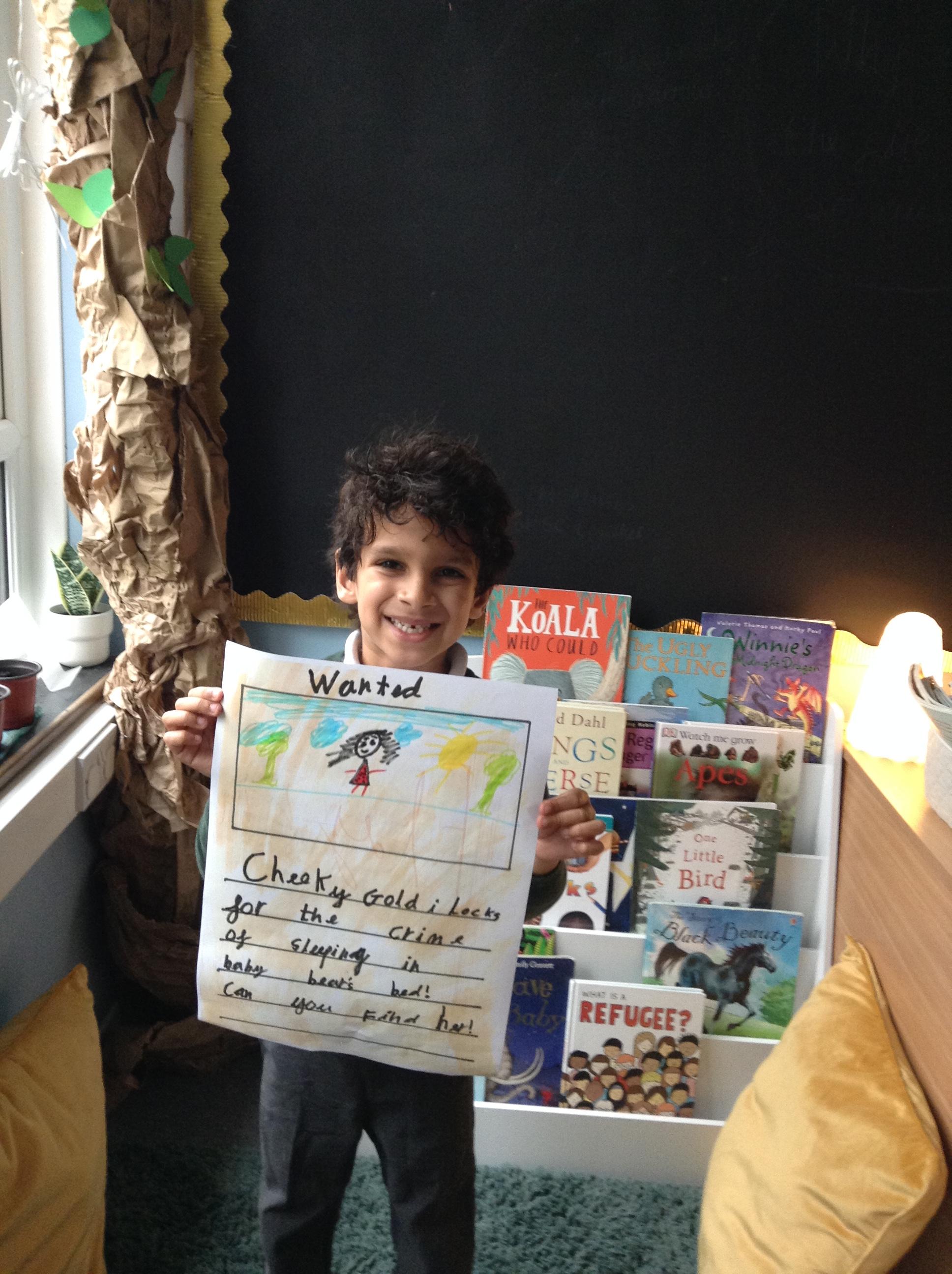 We have been reading Goldilocks and the Three Bears by Lauren Child. The children have used adjectives to describe her character and we are not happy that she ate the bears porridge and broke baby bears chair! We want to find Goldilocks and ask her why she decided to do these things. The children have created wanted posters using an adjective and then linked this to an action which describes Goldilocks.