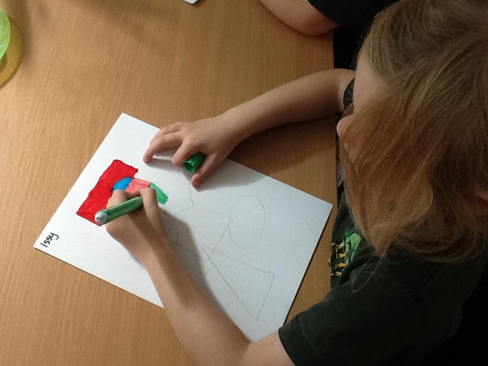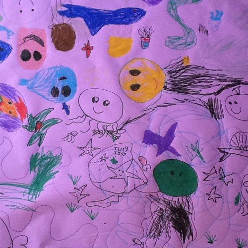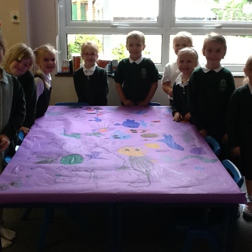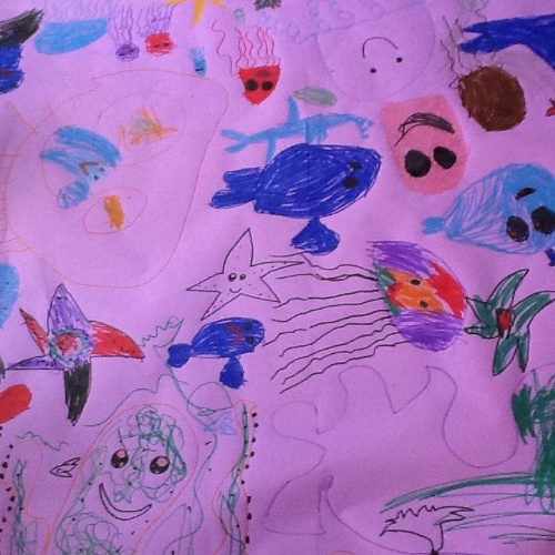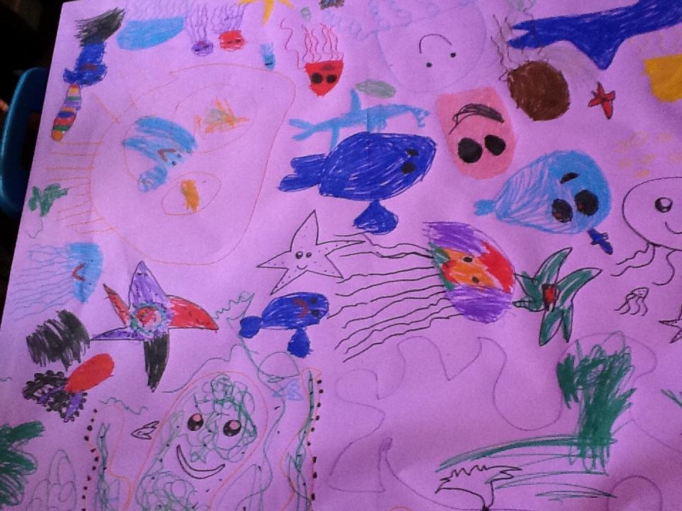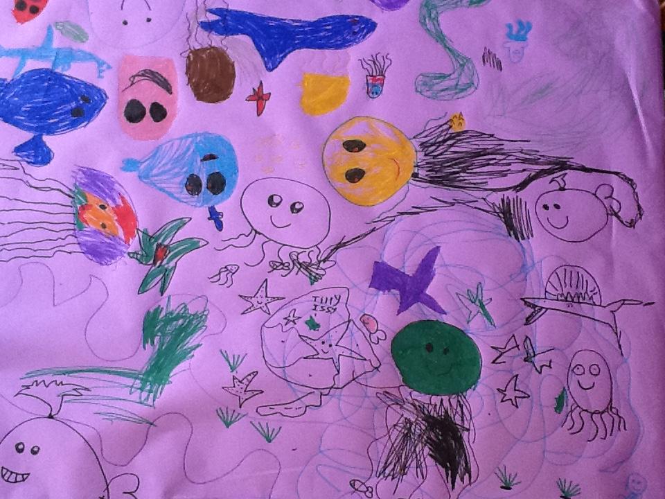 We layed out a large sheet of paper for the children to create whatever they liked on it. It soon turned into a wonderful underwater scene where the children began telling stories as they each drew a creature. It was lovely to listen to their wonderful imaginations.