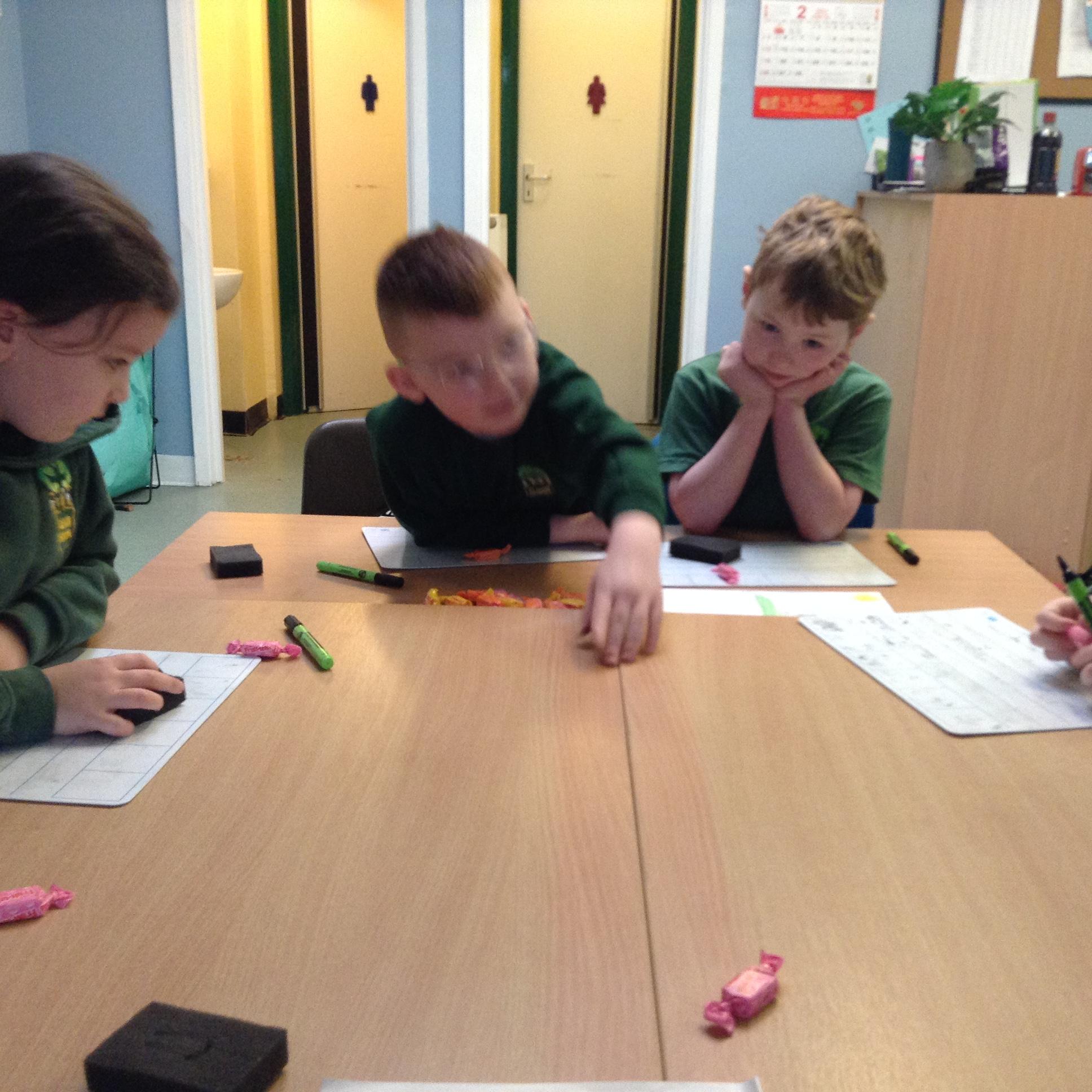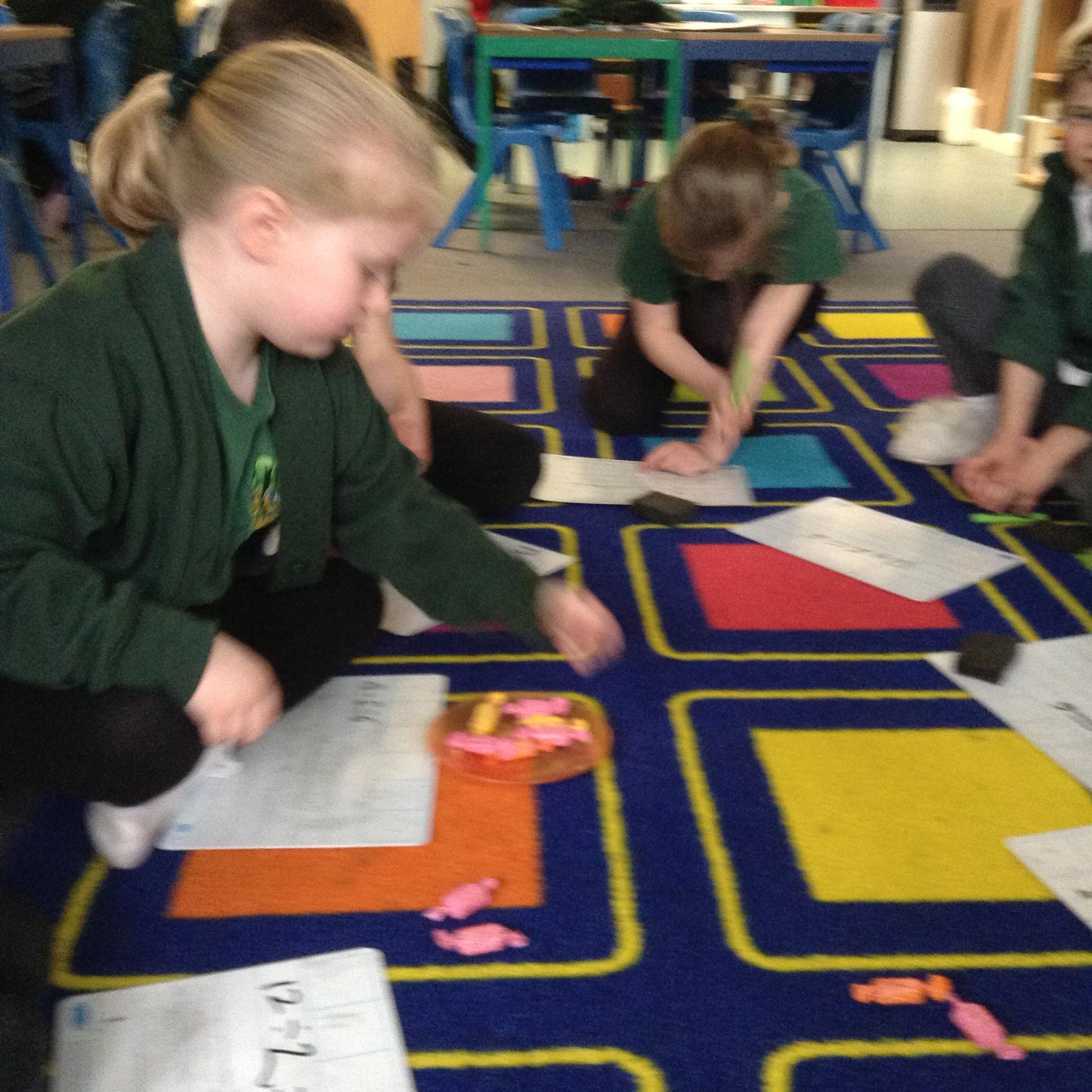 In Maths this week we have been dividing. We decided to use sweets to share equally and then write the division number sentence.
