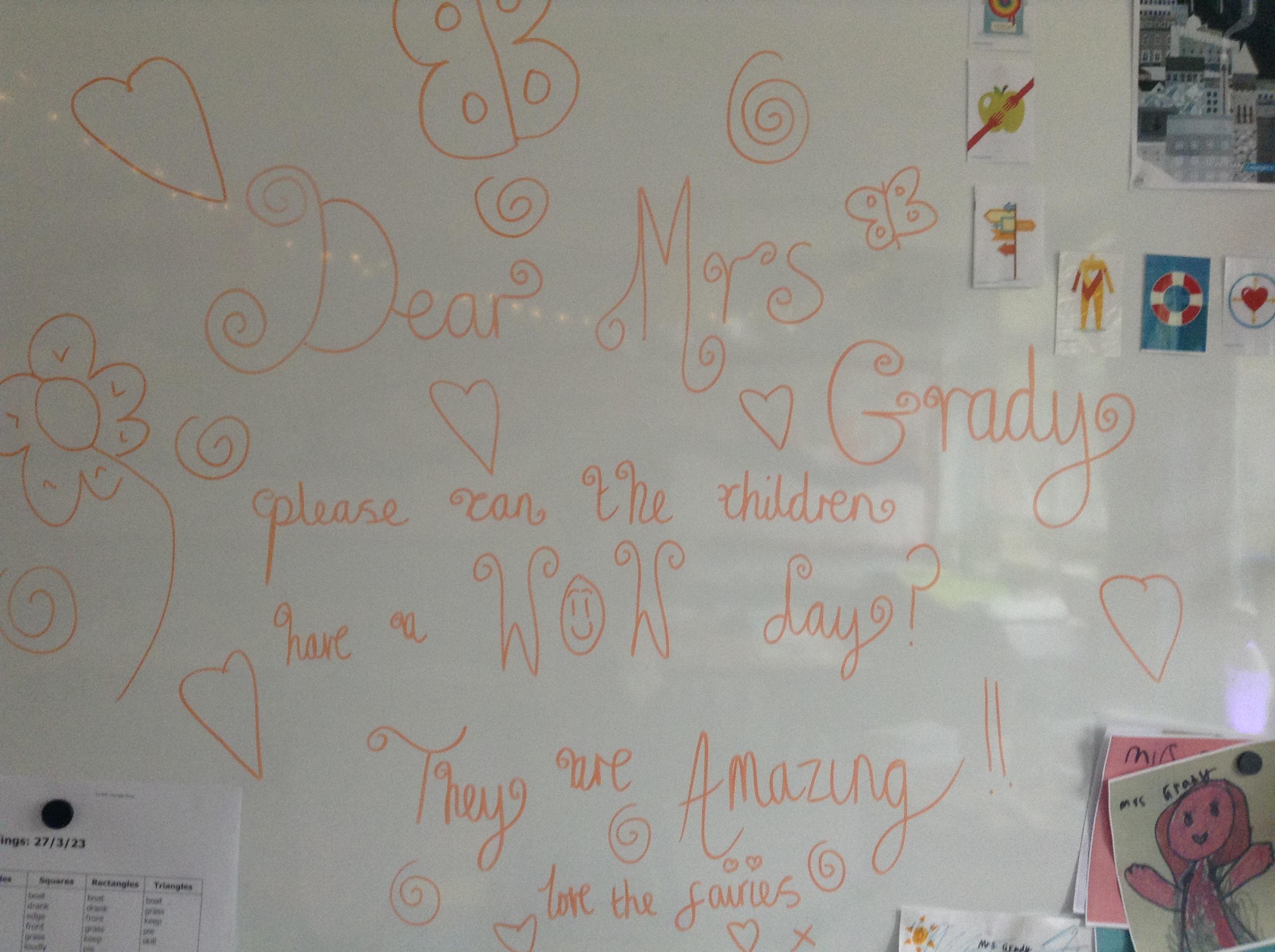The children came in to class this morning to find a surprise from the fairies (I was surprised too!). The fairies had asked if the children could have a WOW day. Overnight 20 marbles had appeared in the marble jar too so we just had to have a WOW day!