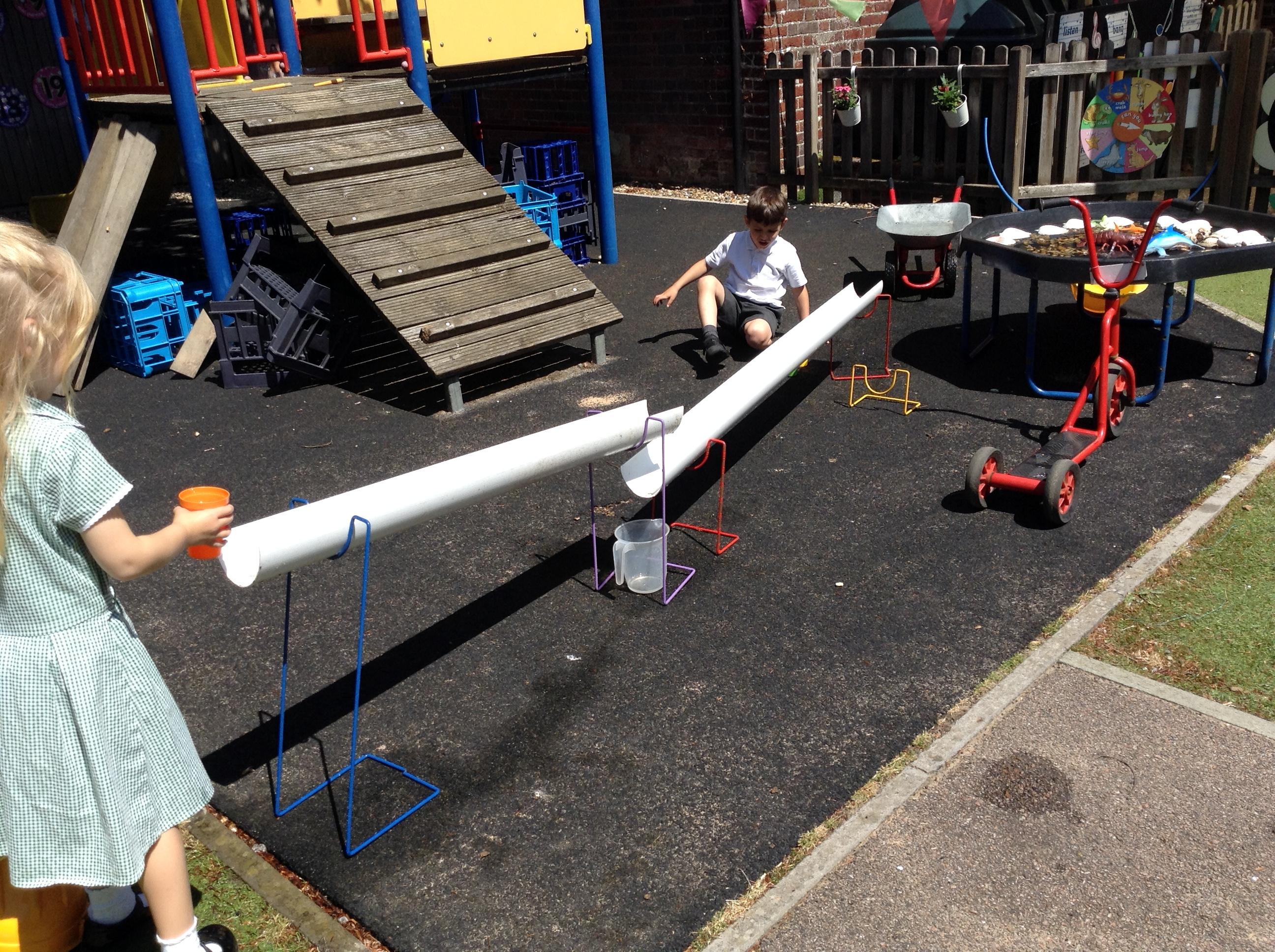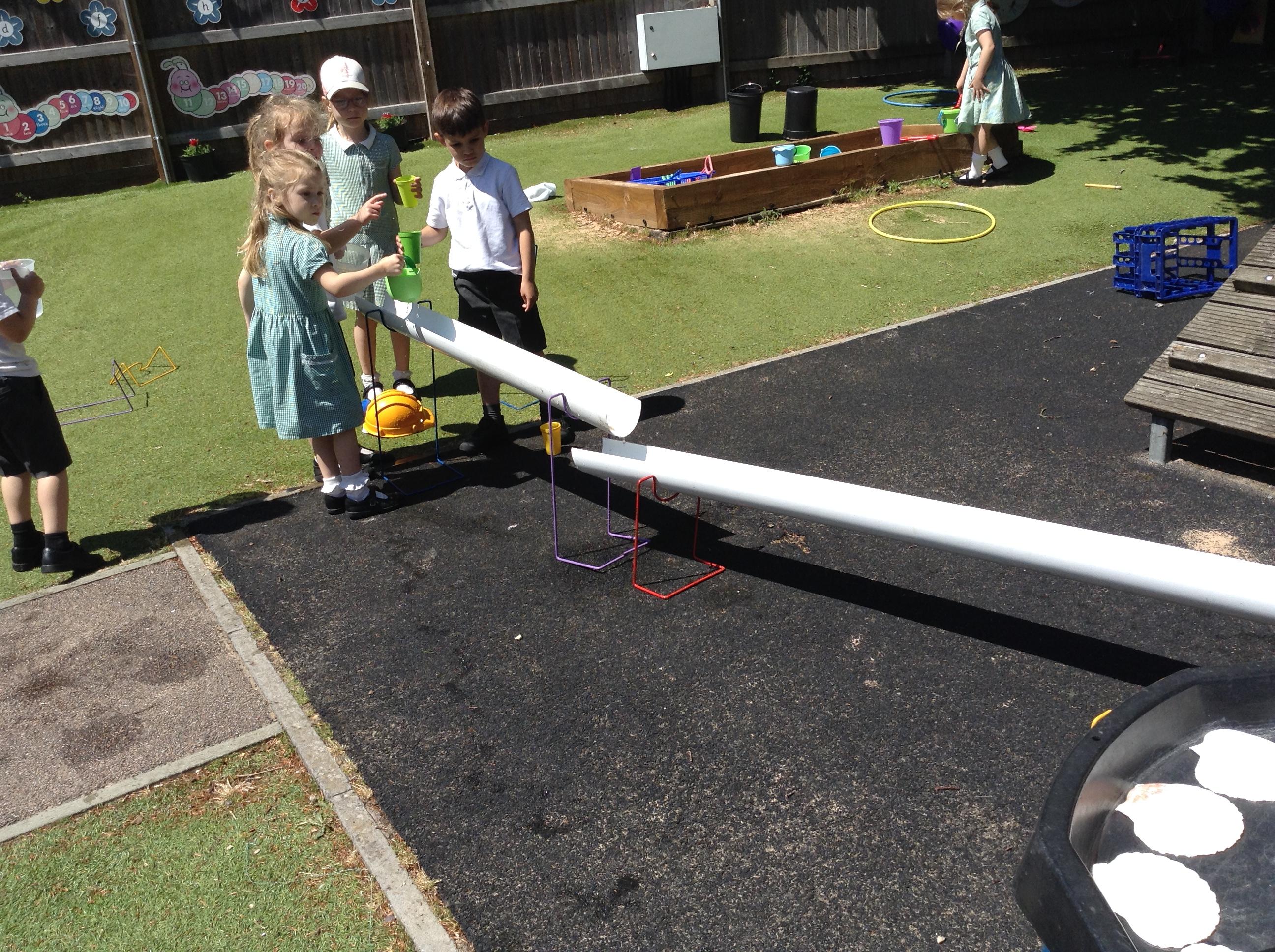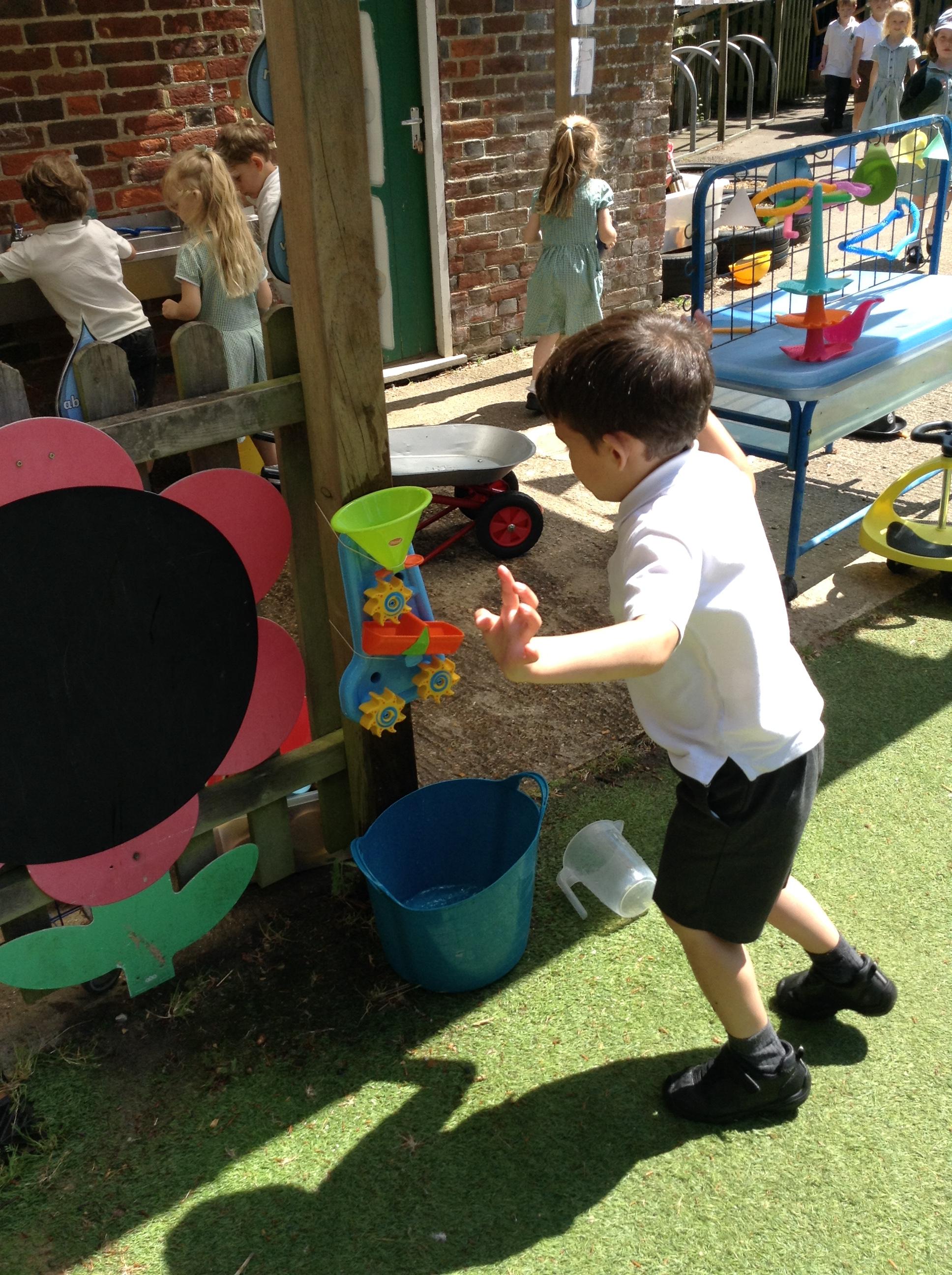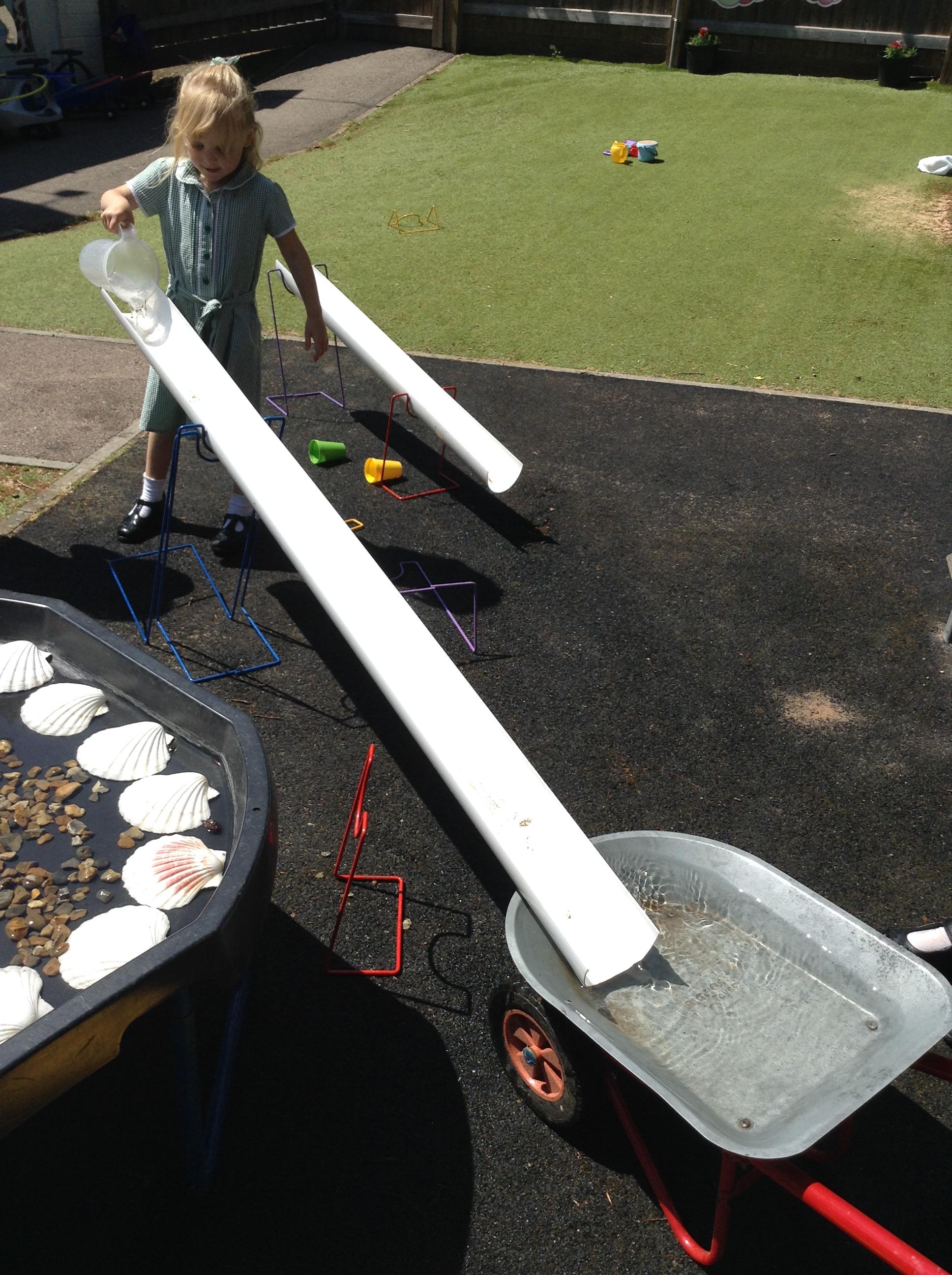 We have had lots of fun this week with our learning about water. The children experimented with the pipes and tubes outside and enjoyed watching how the water made the wheels spin and move.