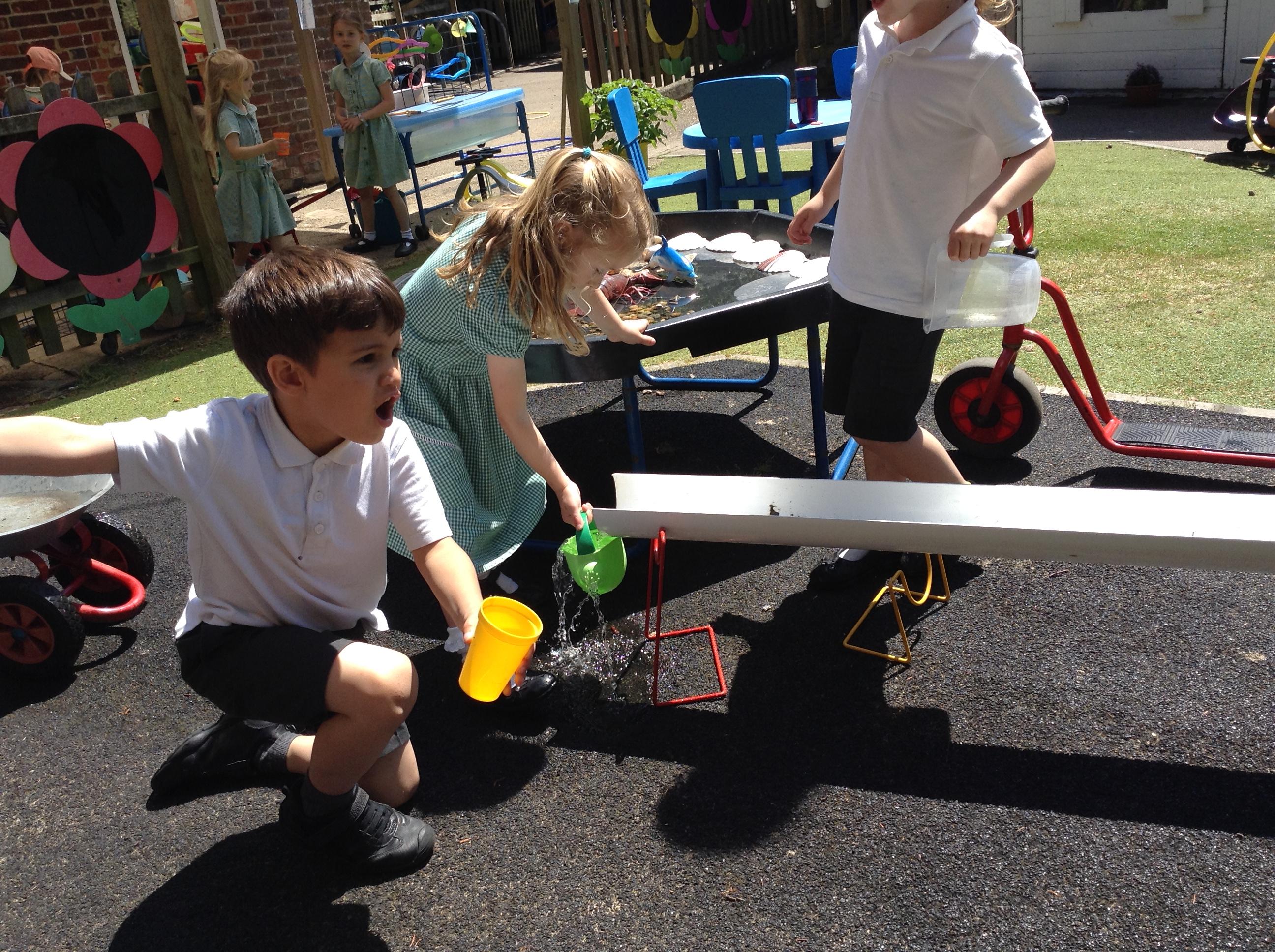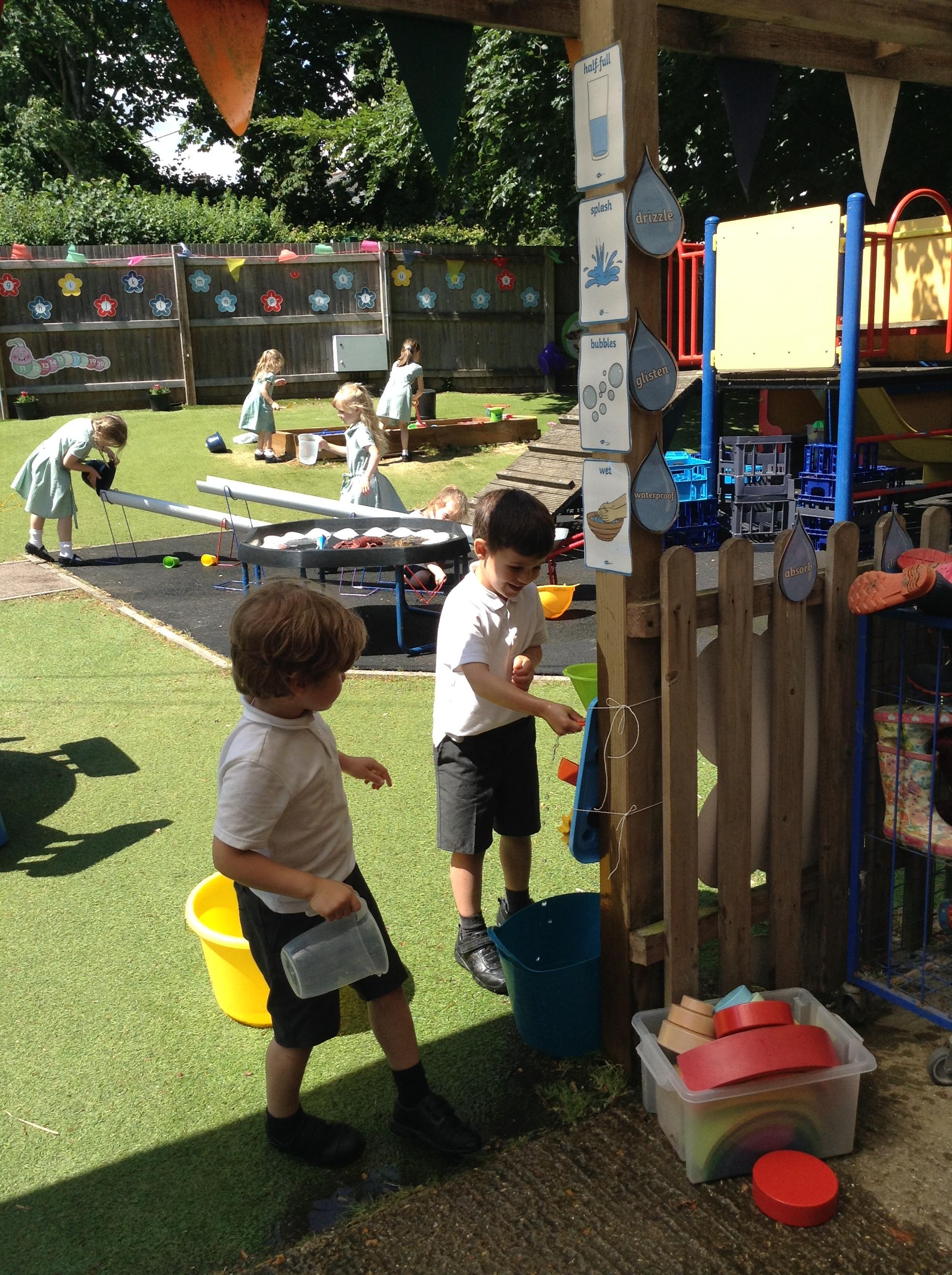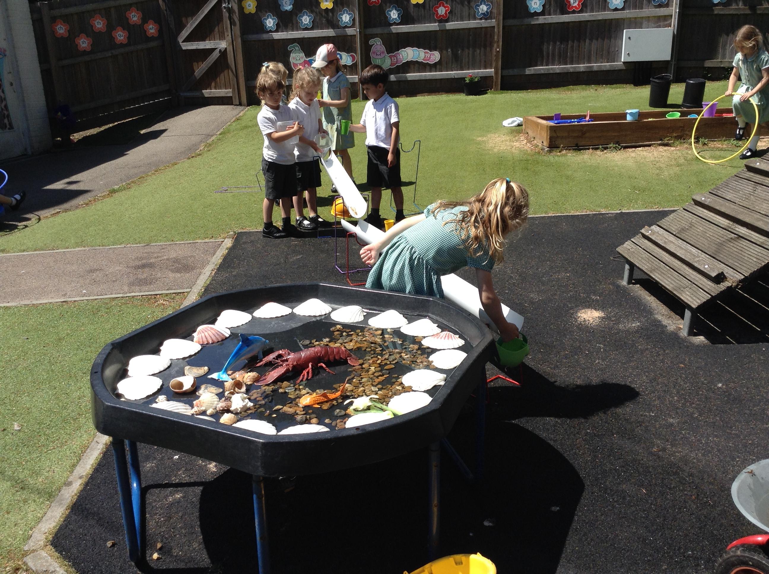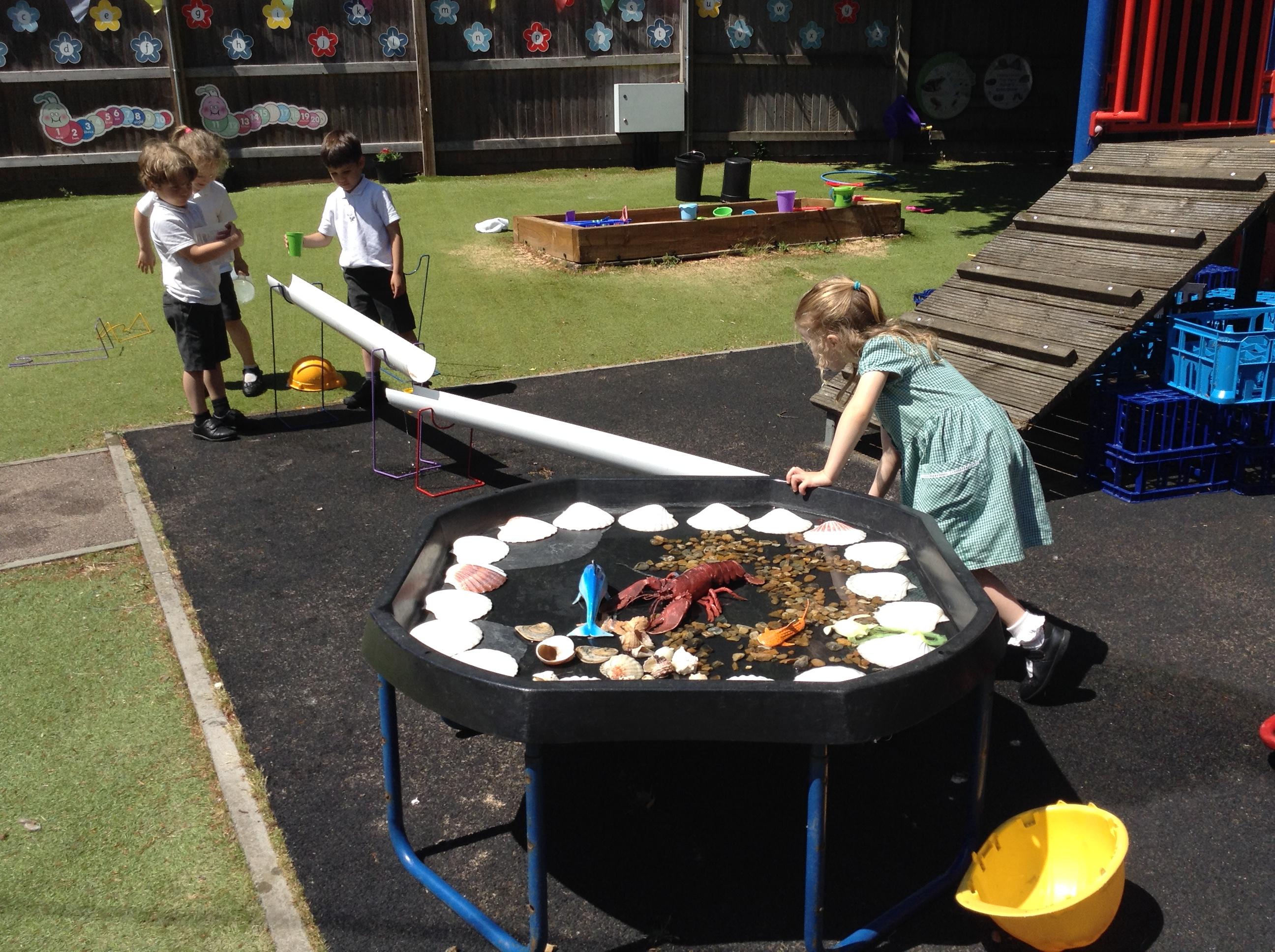 We have had lots of fun this week with our learning about water. The children experimented with the pipes and tubes outside and enjoyed watching how the water made the wheels spin and move.