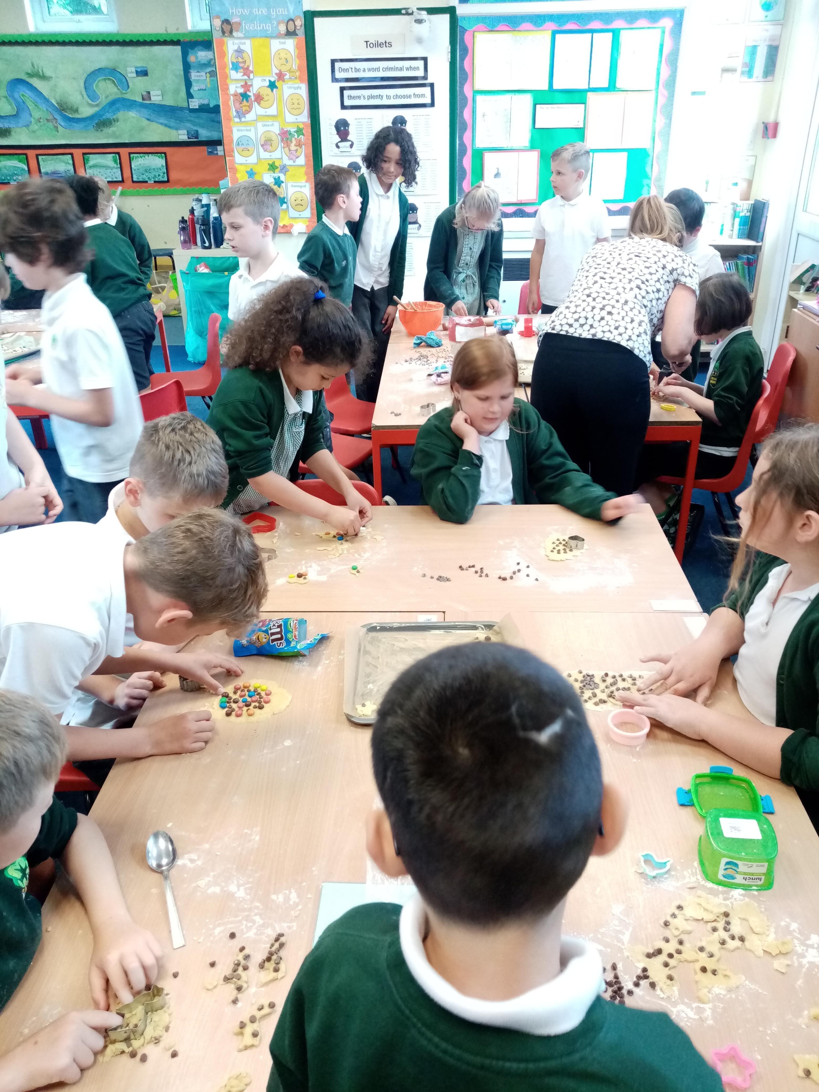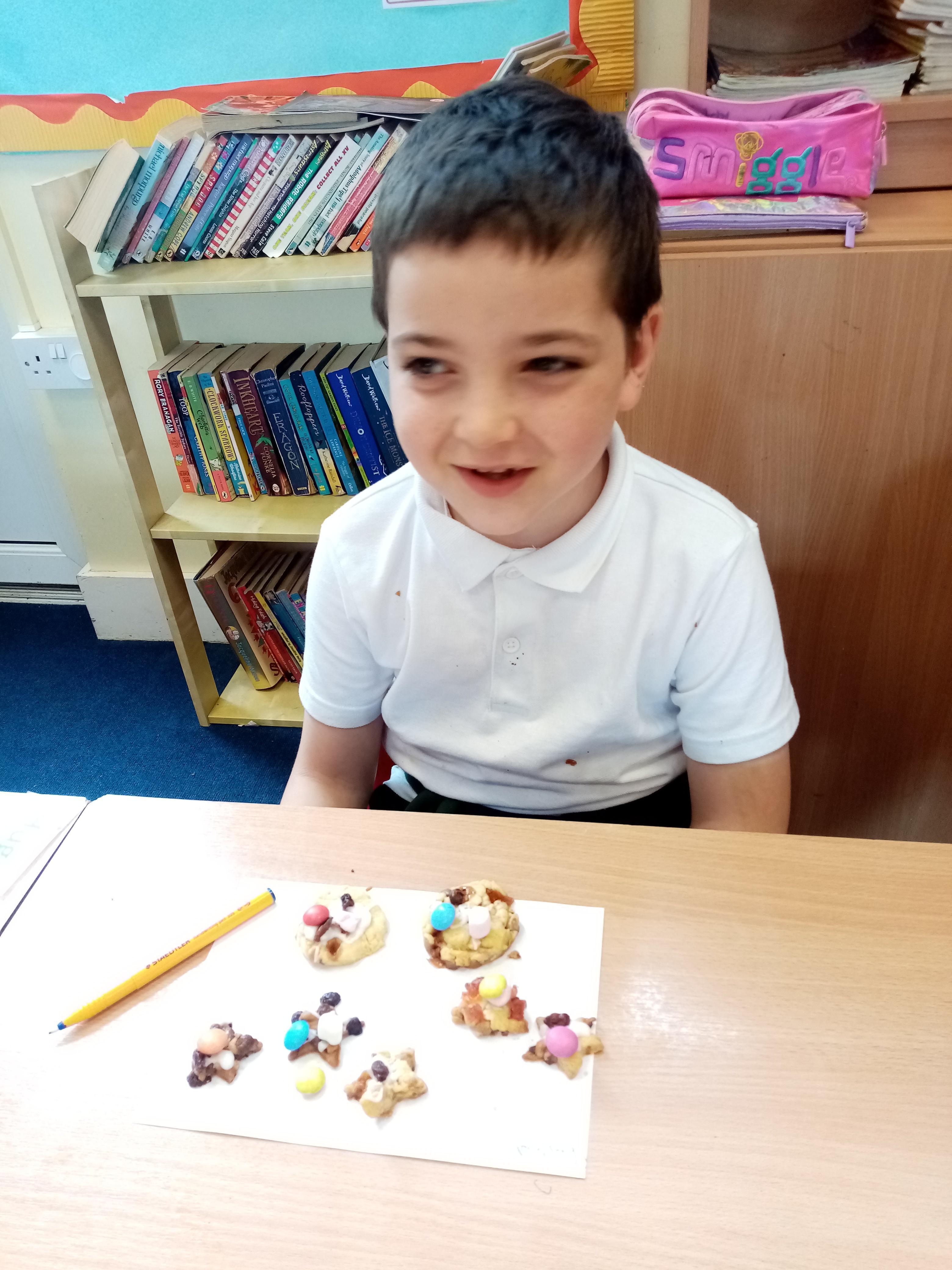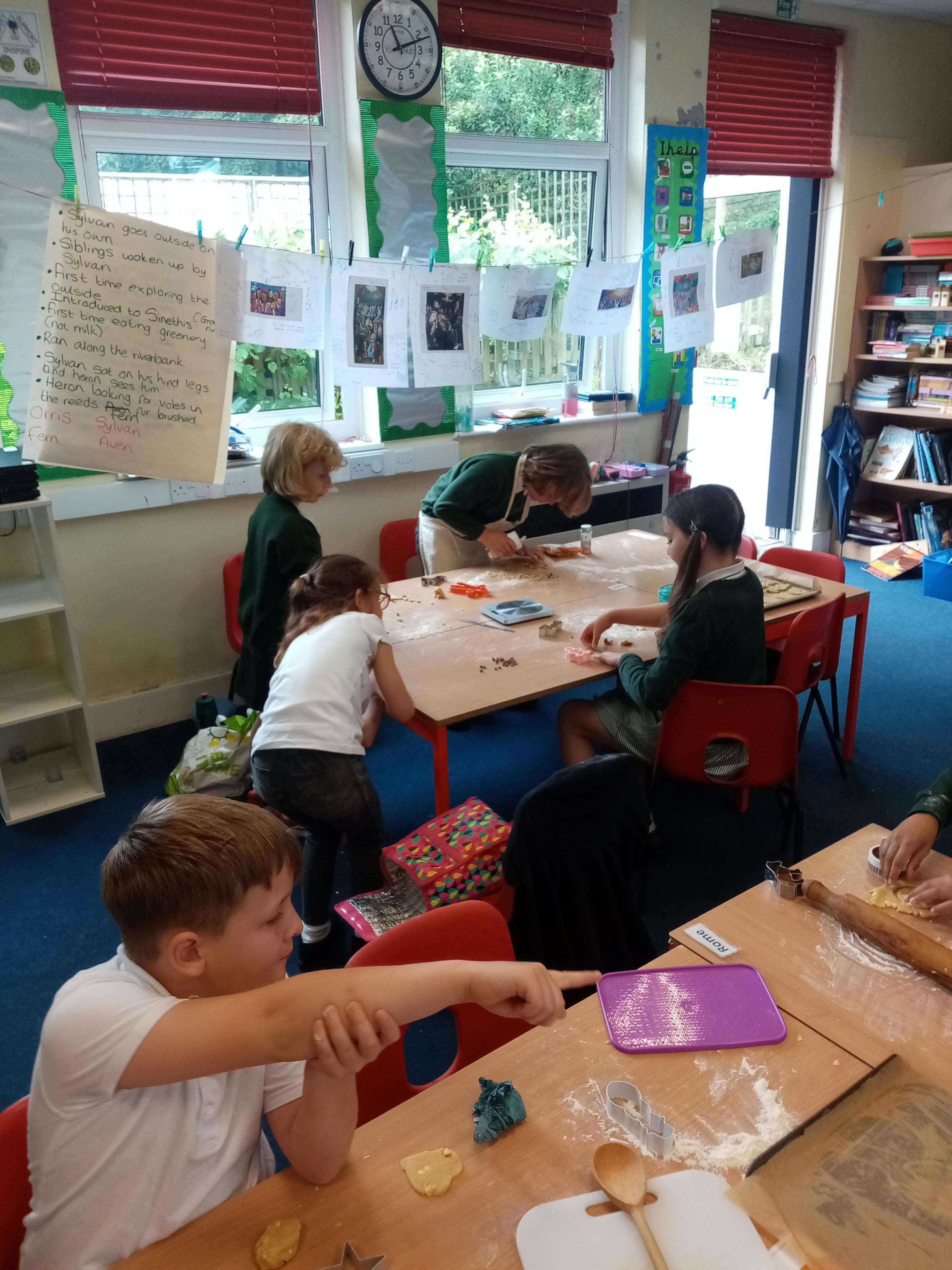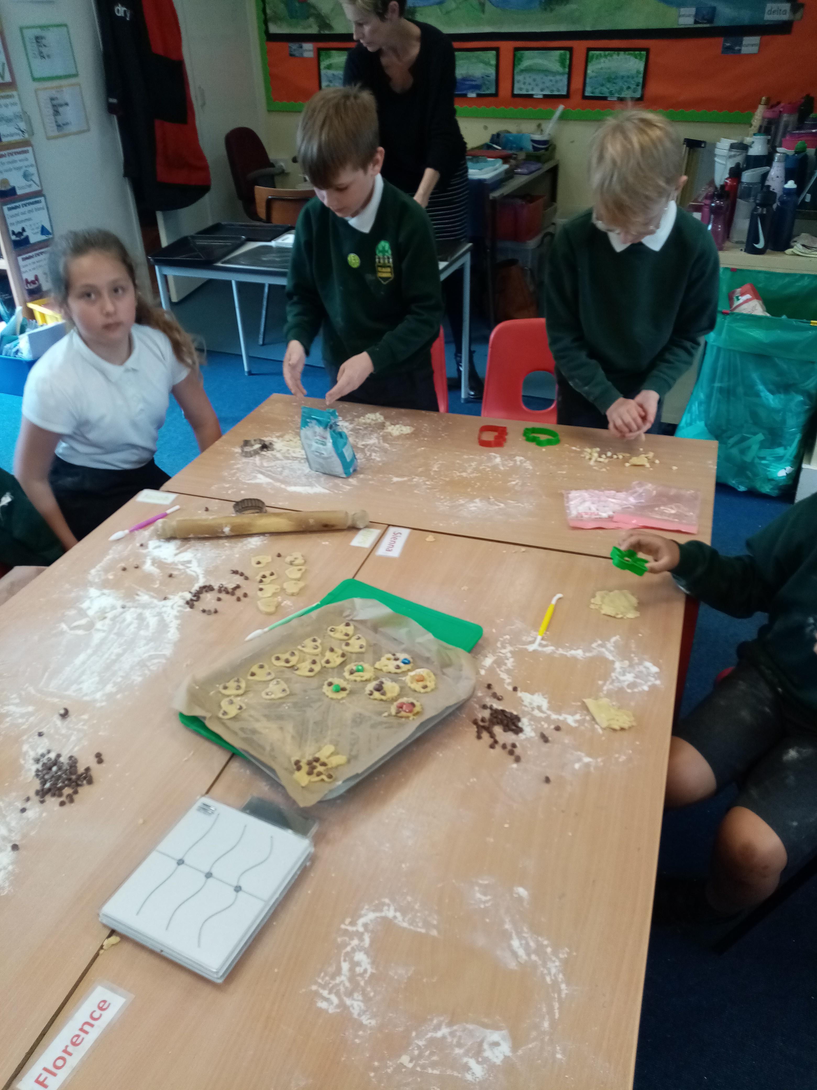 In groups, we started with a basic biscuit recipe, and used scales to measure out the ingredients.  We formed the mixture into a dough and then shared this out between us.  Each of us then innovated the recipe using our own ideas of what ingredients to use.  We rolled out the dough and used cutters to create our biscuits ready to be baked.  We were all very helpful at cleaning the classroom up afterwards as we all seemed to be covered in flour!