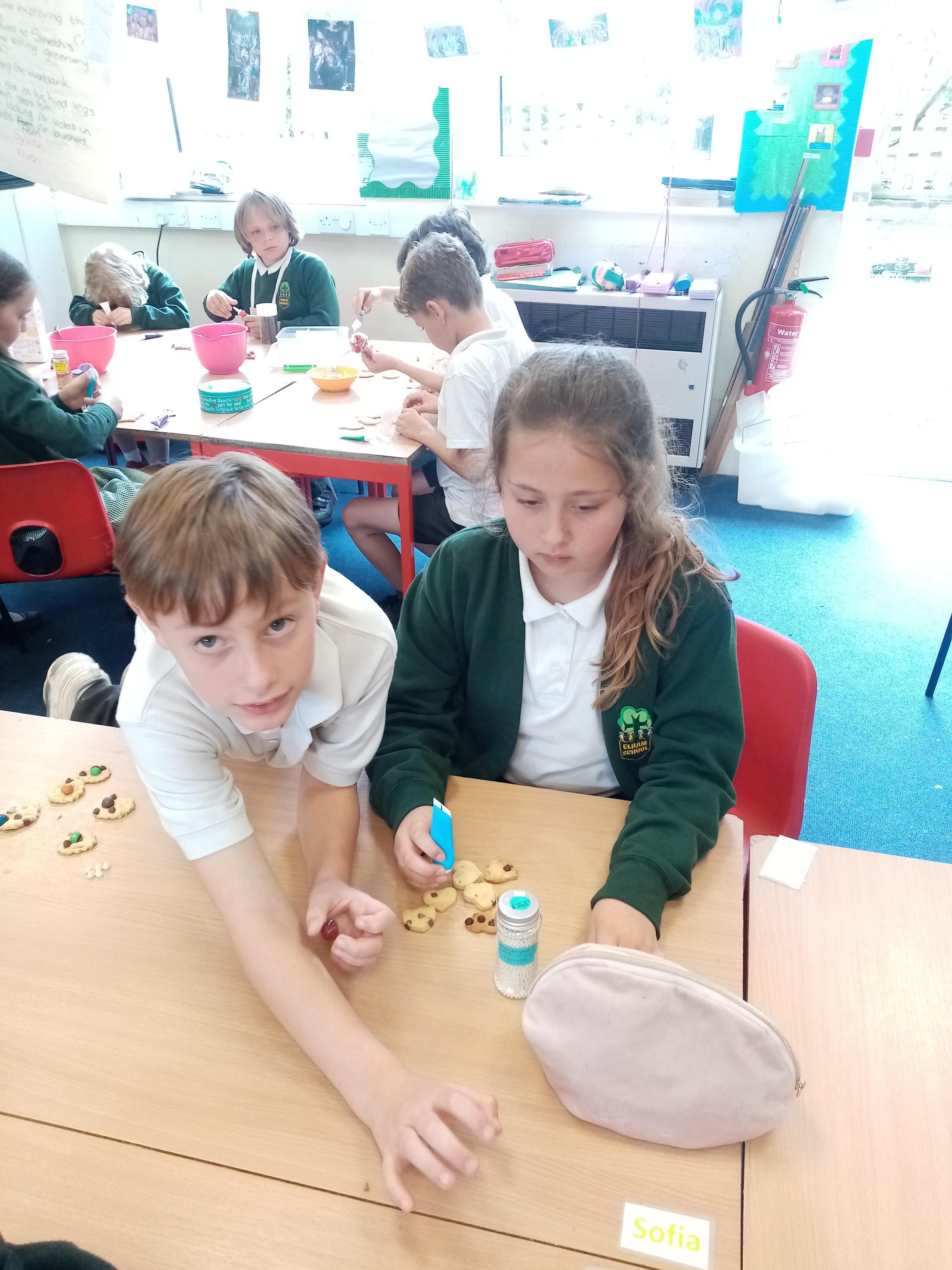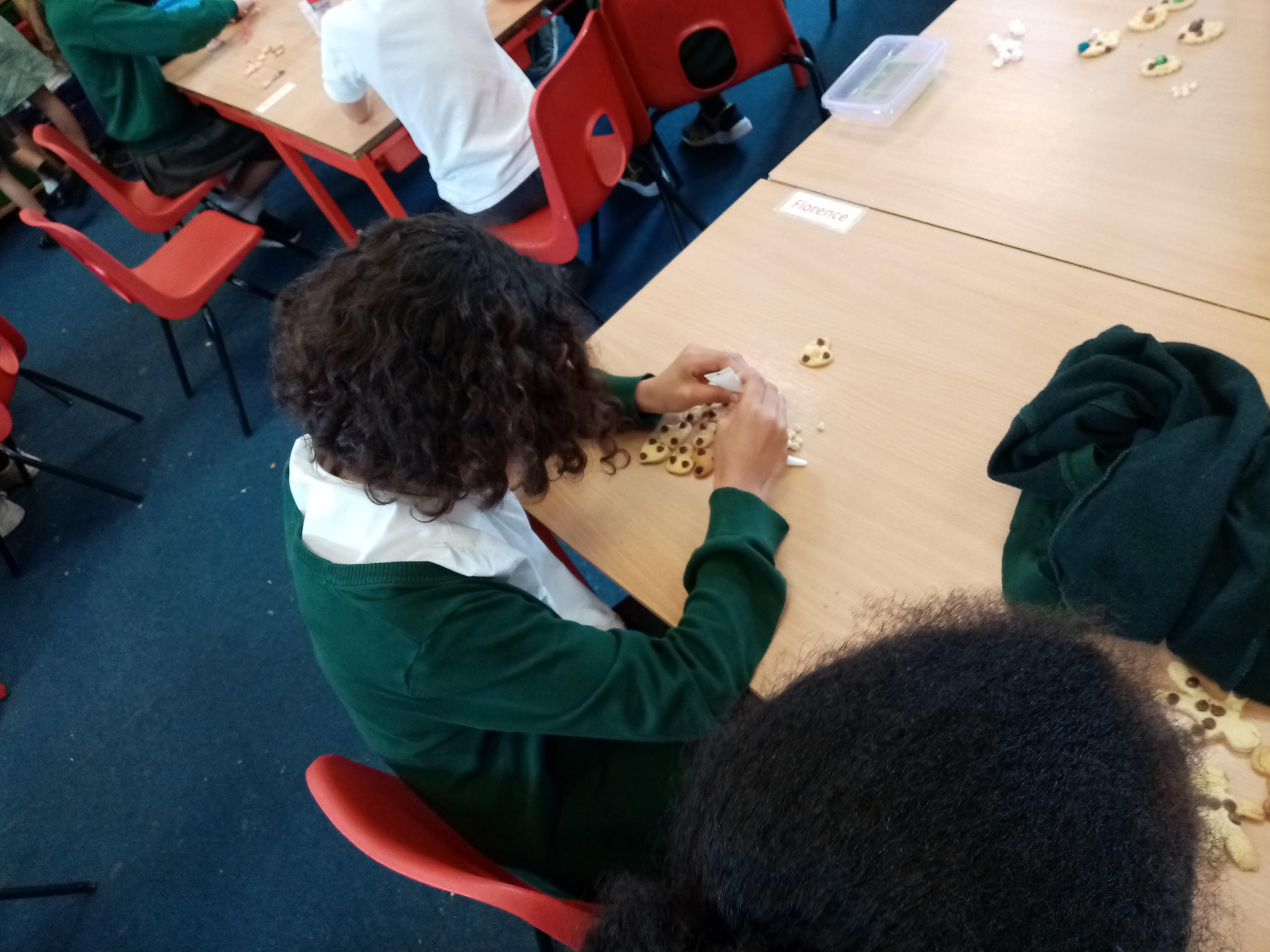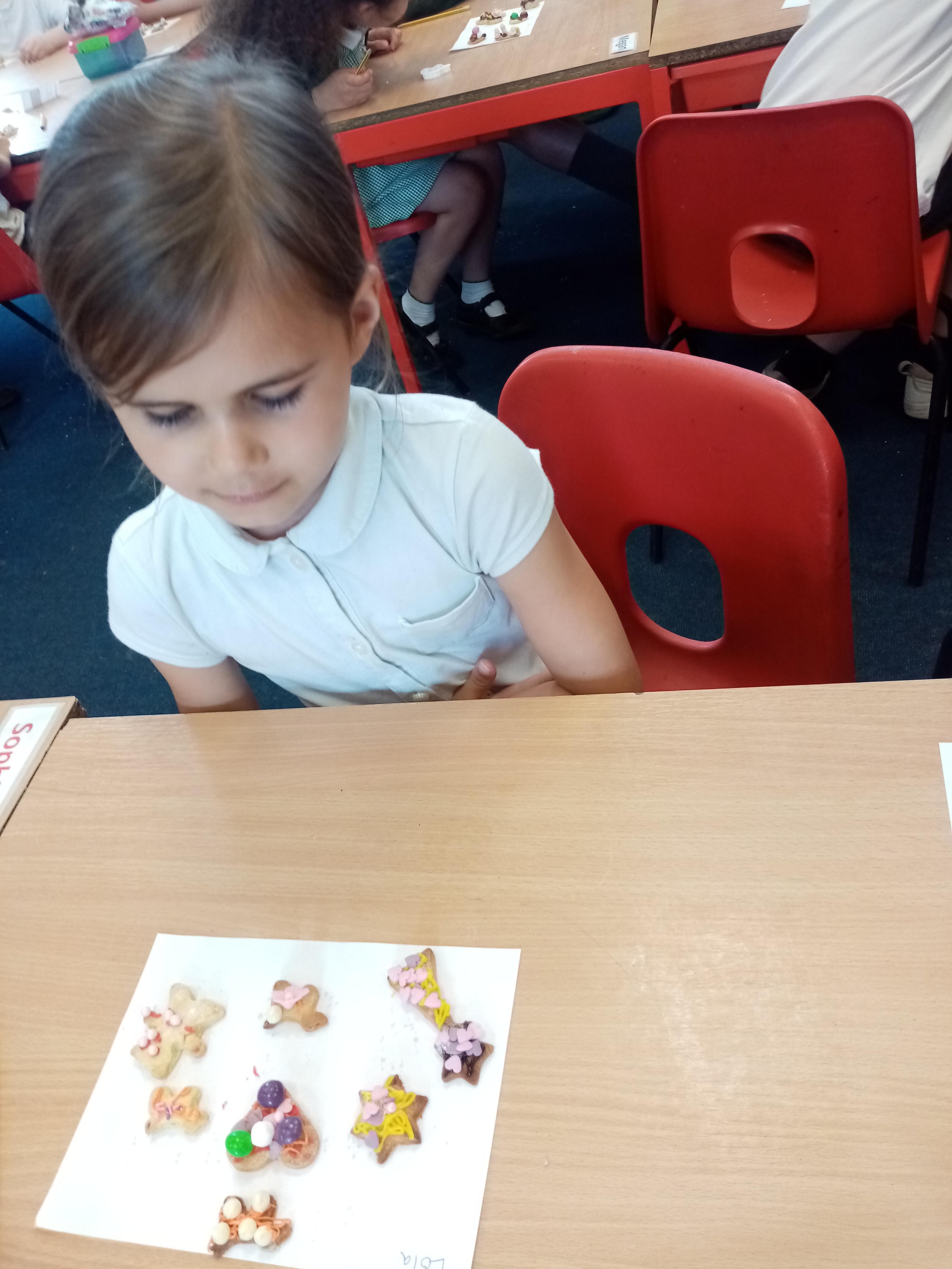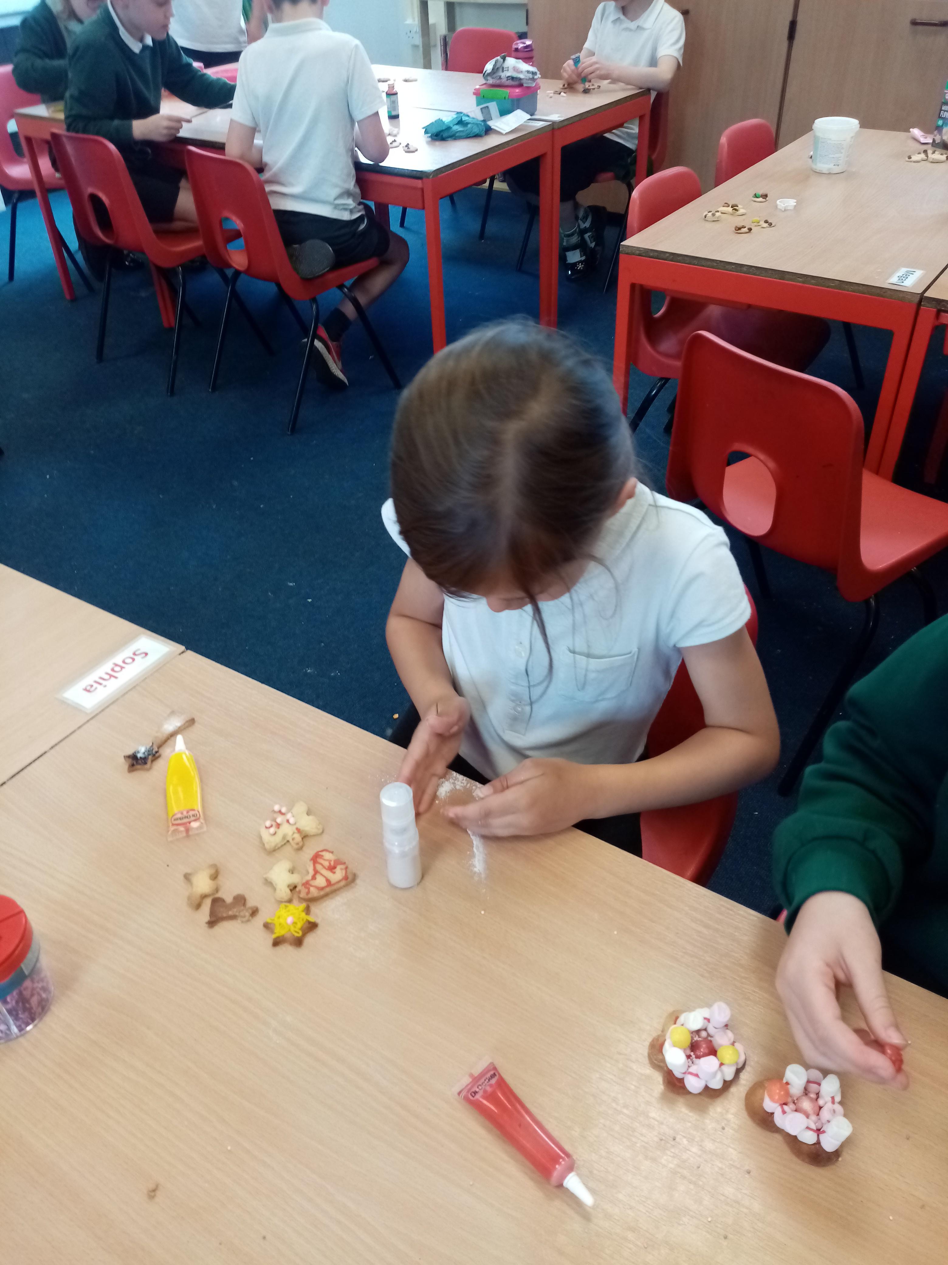 After lunch we then decorated our biscuits.  Some of us had never seen icing sugar before!  We used dyes to create different coloured  icing, and used many tasty toppings such as marshmallows and fudge!  Once we had completed our biscuits we evaluated their appearance, taste and the overall production process.  We then got to taste 2 other people's biscuits and commented on our opinions of them.  There were some great designs, including cats, lamas, penguins and Pokeballs!  Many of the biscuits were very lavish; covered in bright colours and textures.