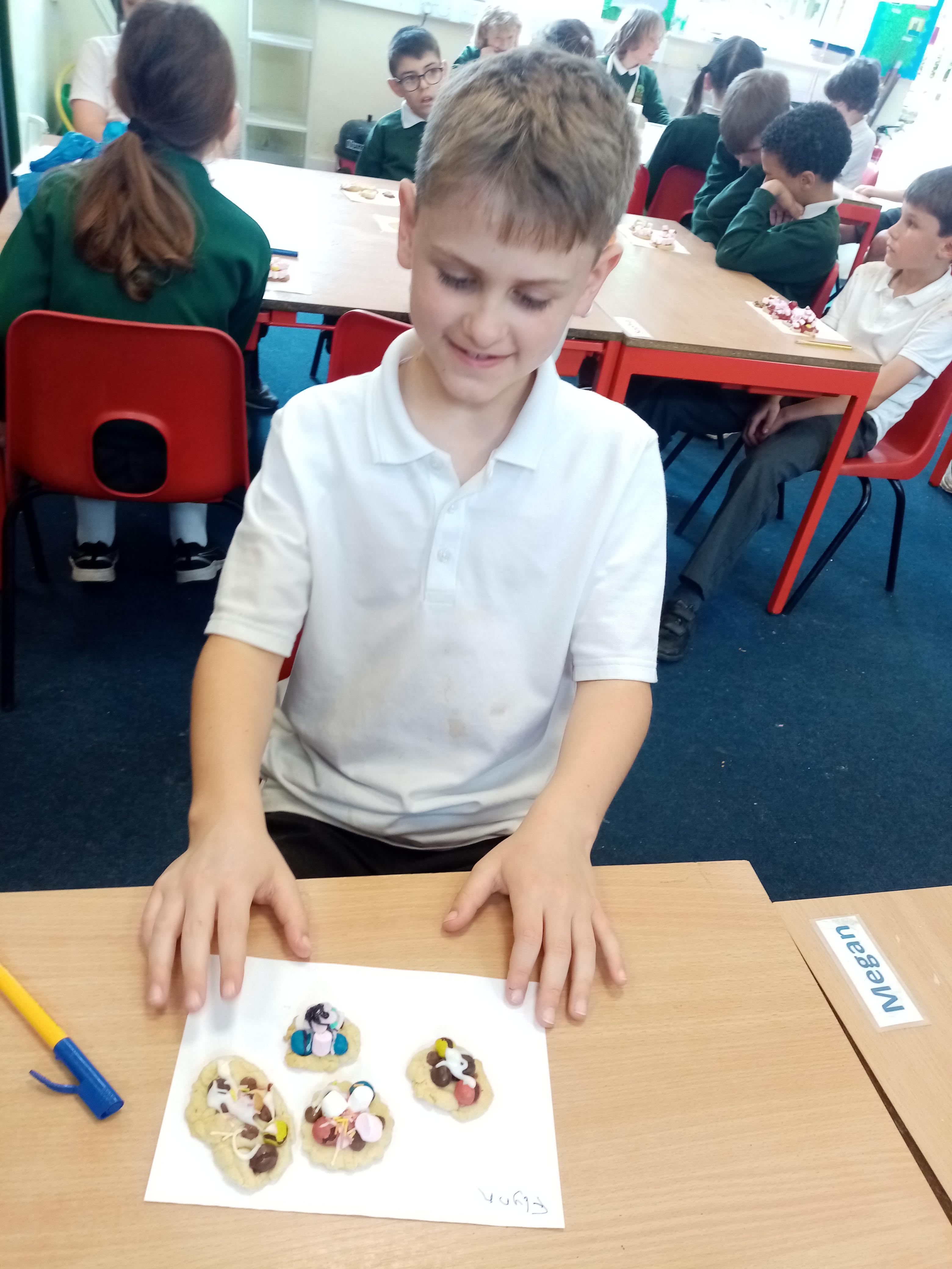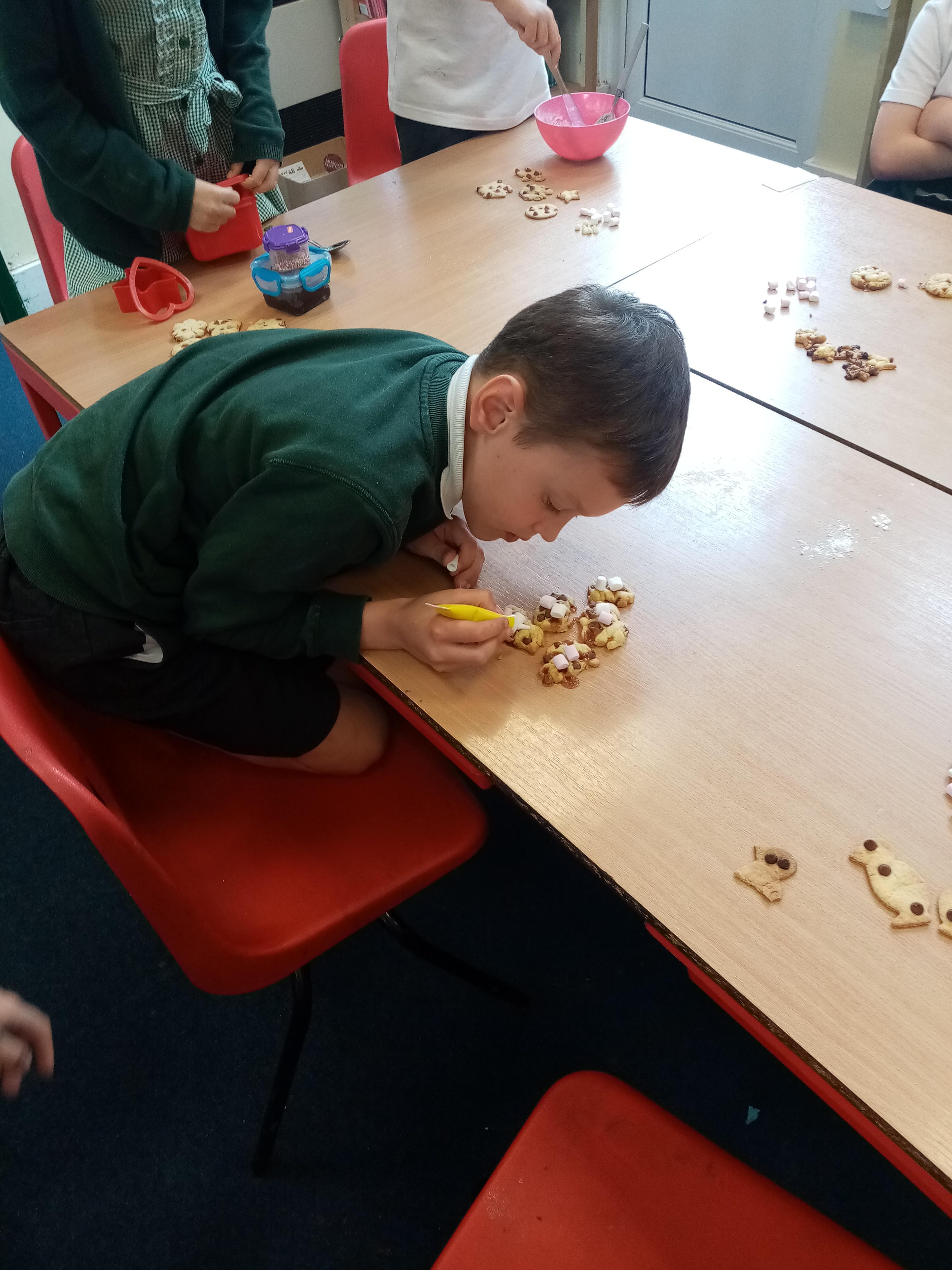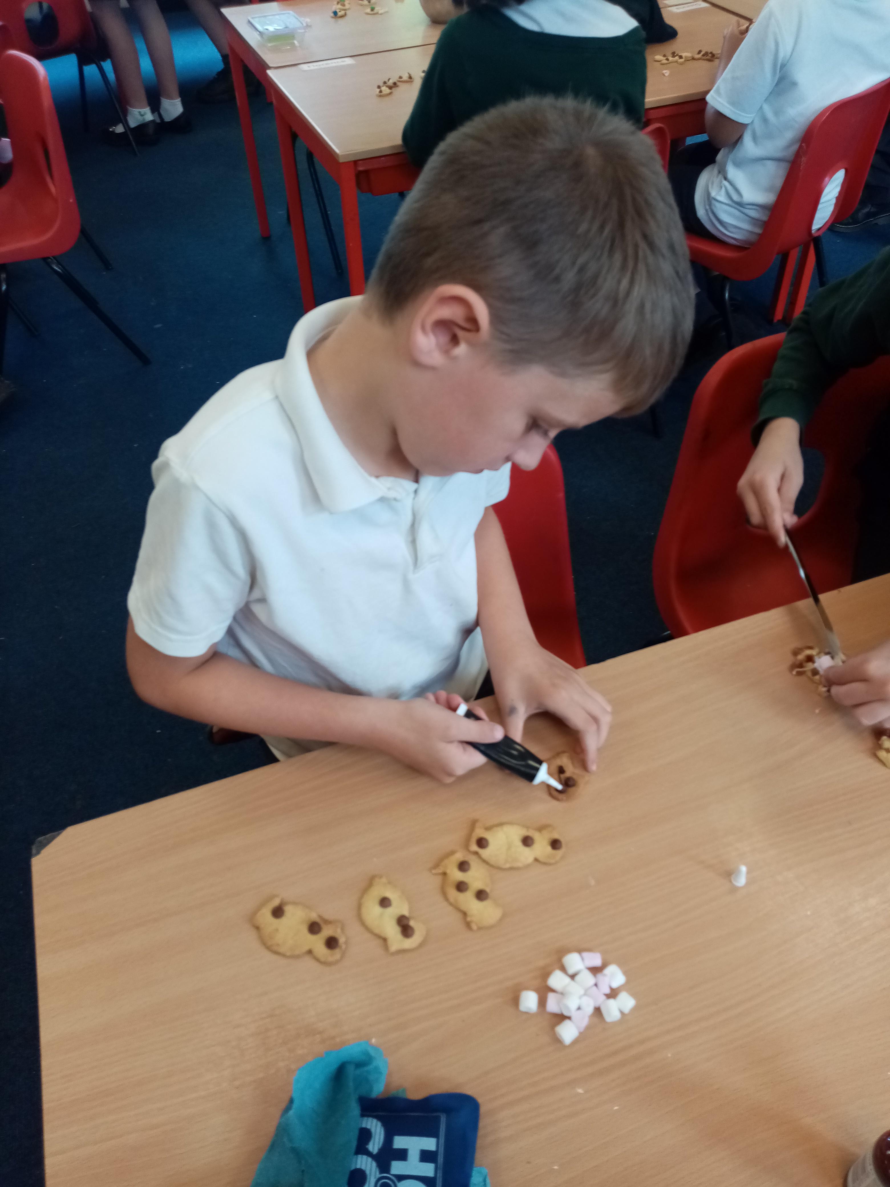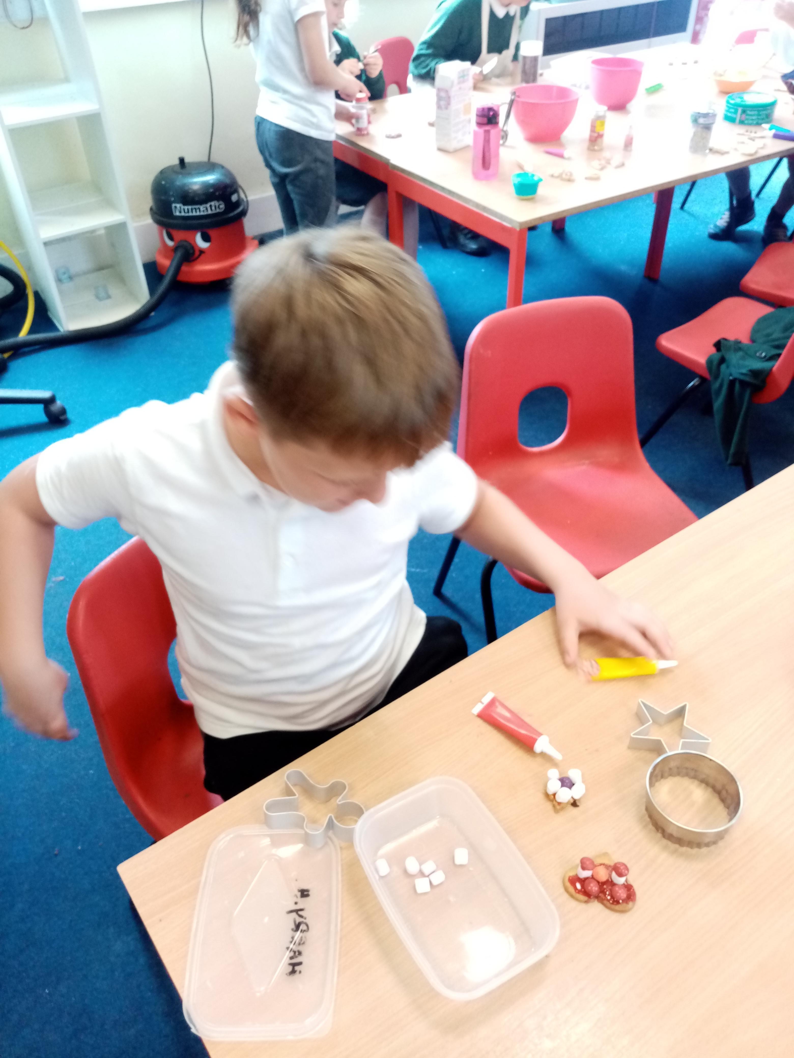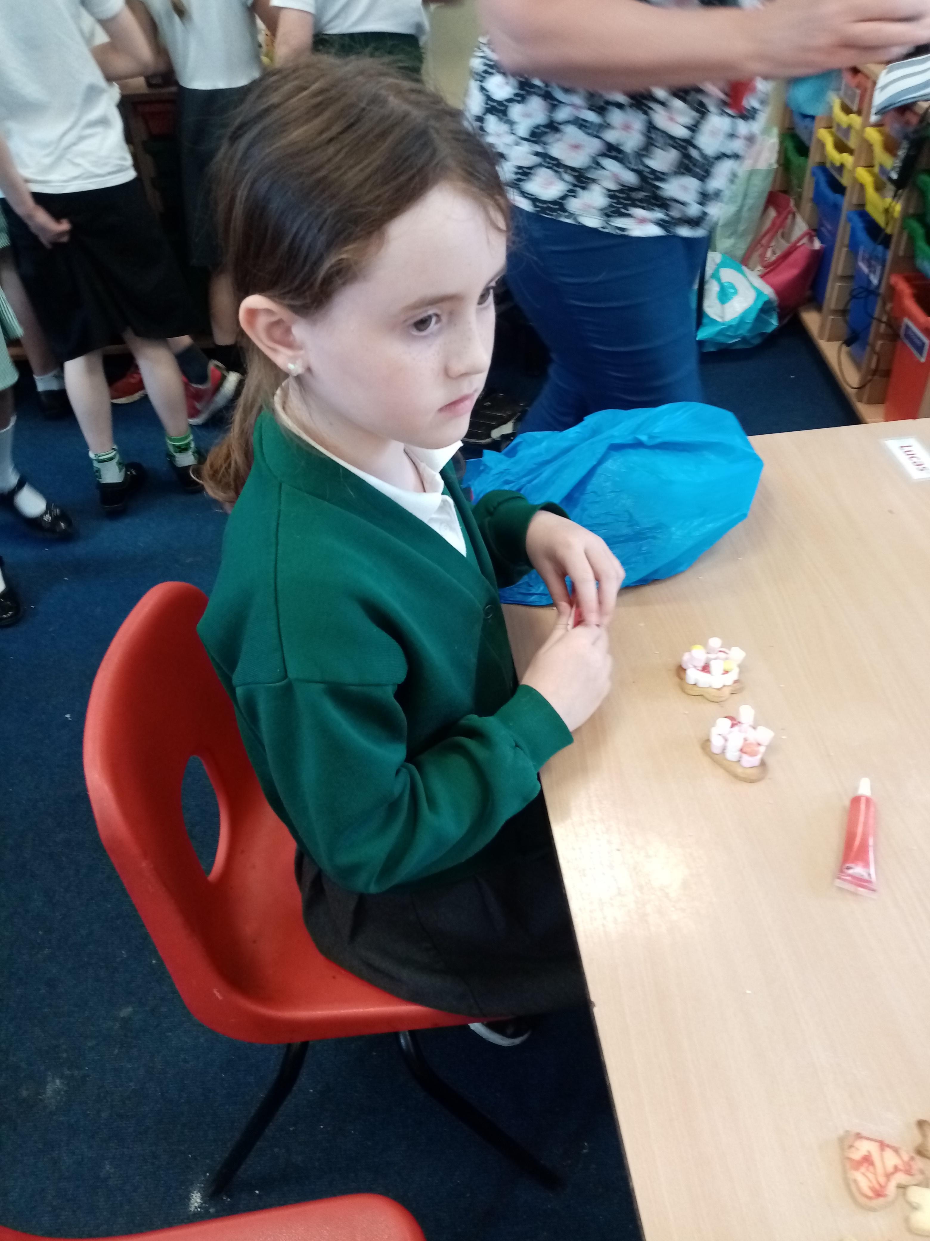 After lunch we then decorated our biscuits.  Some of us had never seen icing sugar before!  We used dyes to create different coloured  icing, and used many tasty toppings such as marshmallows and fudge!  Once we had completed our biscuits we evaluated their appearance, taste and the overall production process.  We then got to taste 2 other people's biscuits and commented on our opinions of them.  There were some great designs, including cats, lamas, penguins and Pokeballs!  Many of the biscuits were very lavish; covered in bright colours and textures.